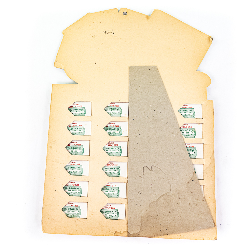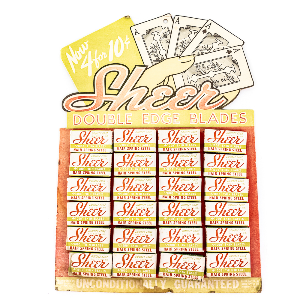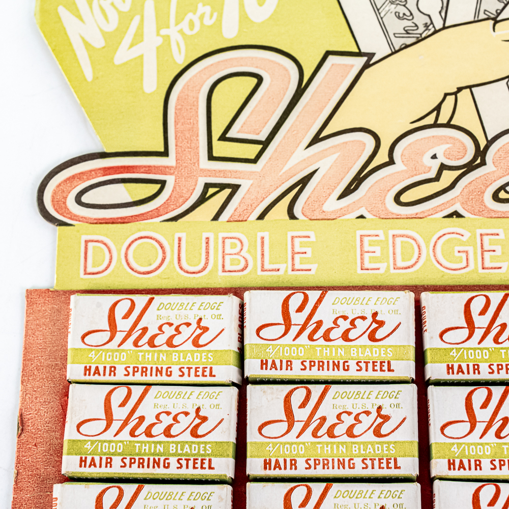 Vintage Sheer Razor Blade Display, comes with 24 blade boxes, shows minor wear, corner bent at top, see photos, 10″ x 14″