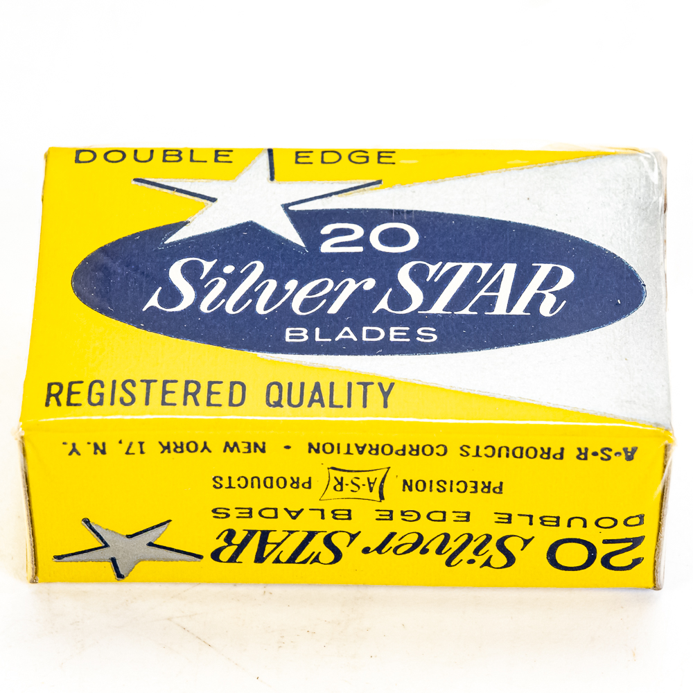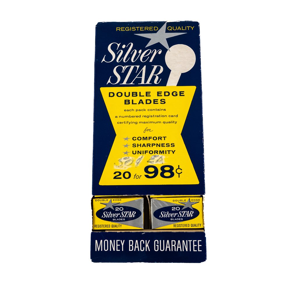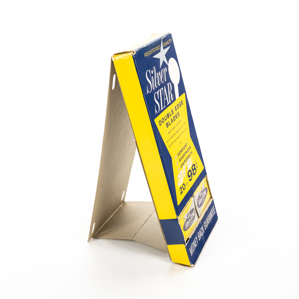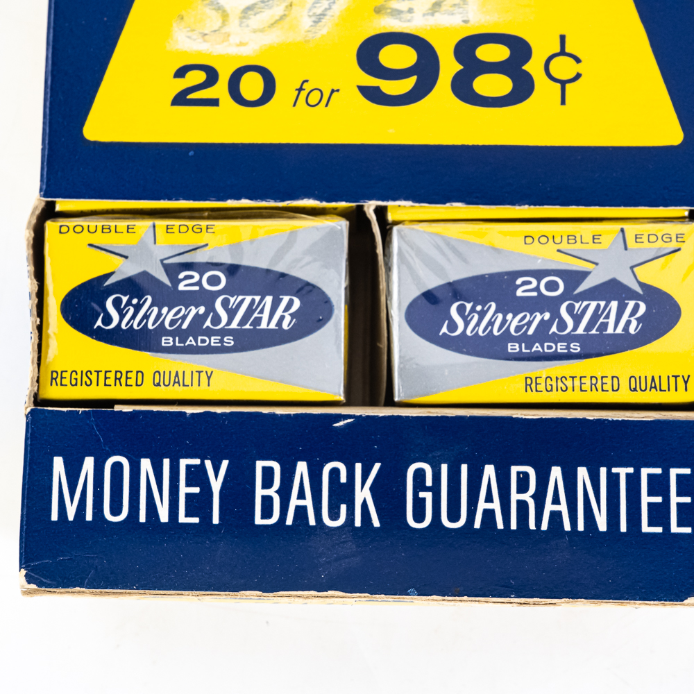 Vintage Silver Star Razor Blade Display, comes with 20 blade boxes, good condition, see photos, 11″ x 5″