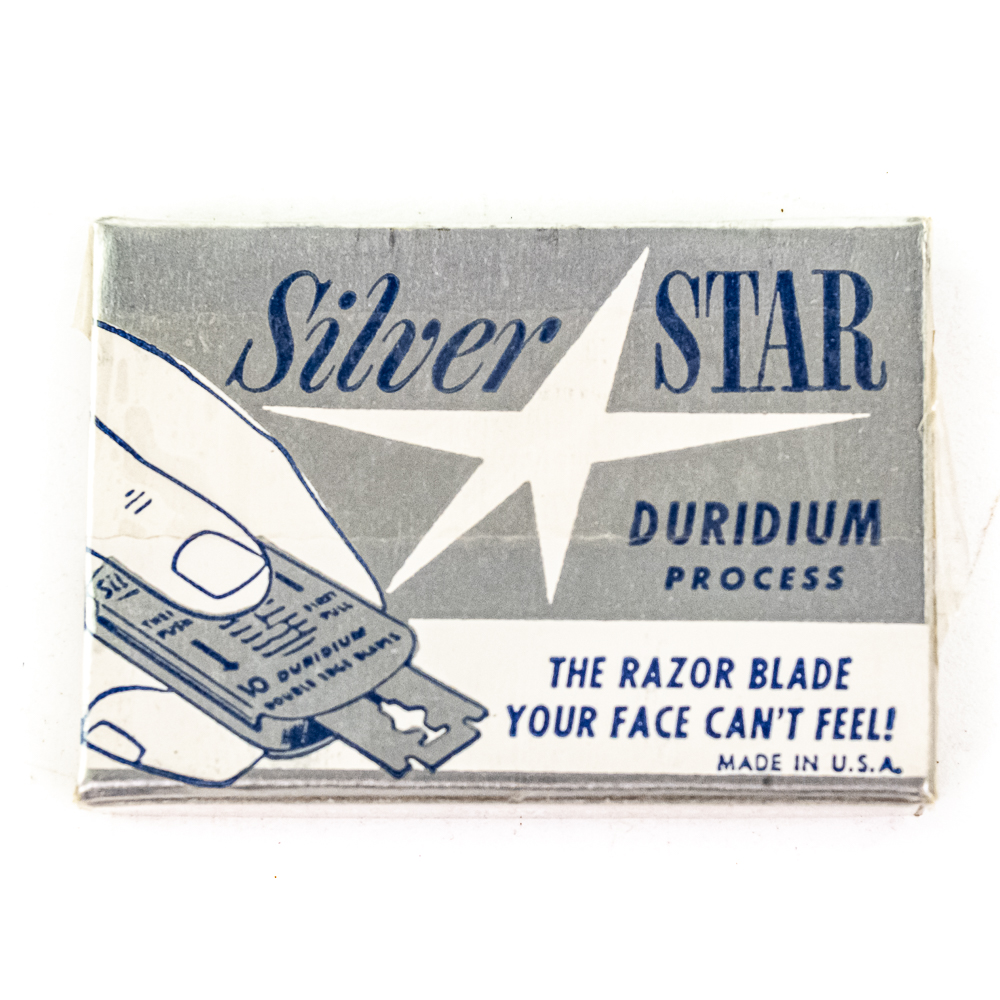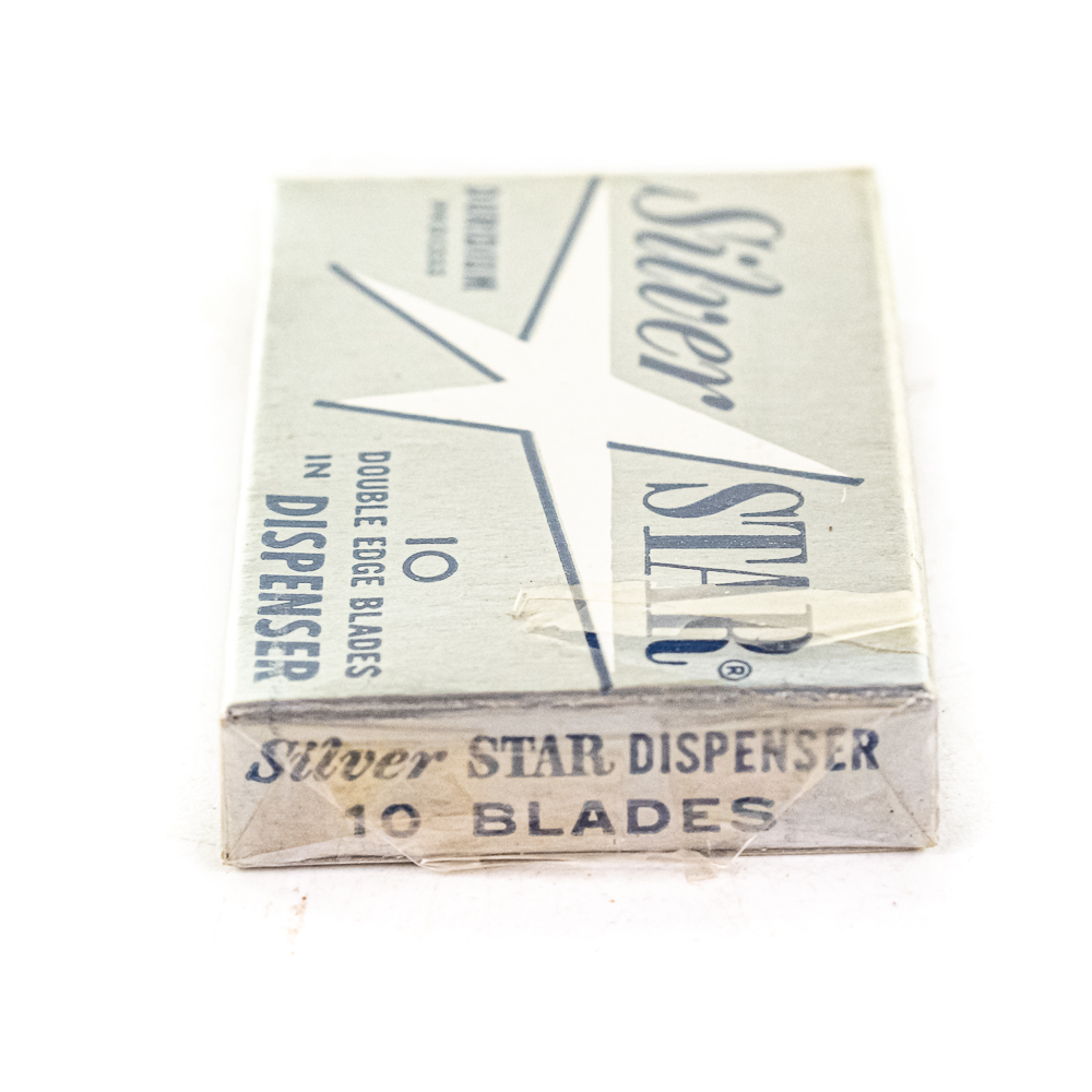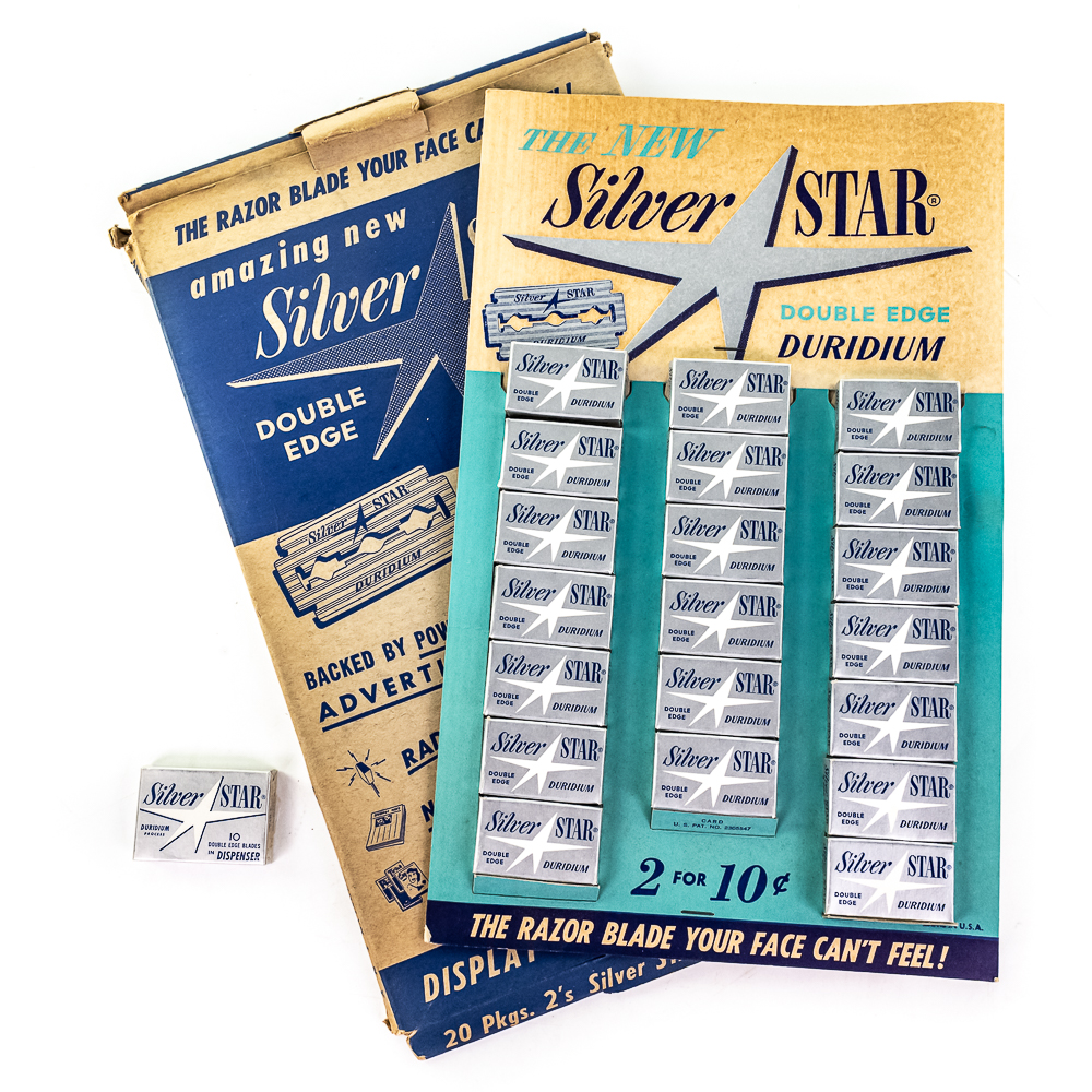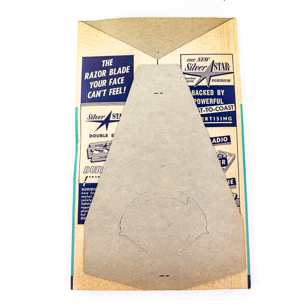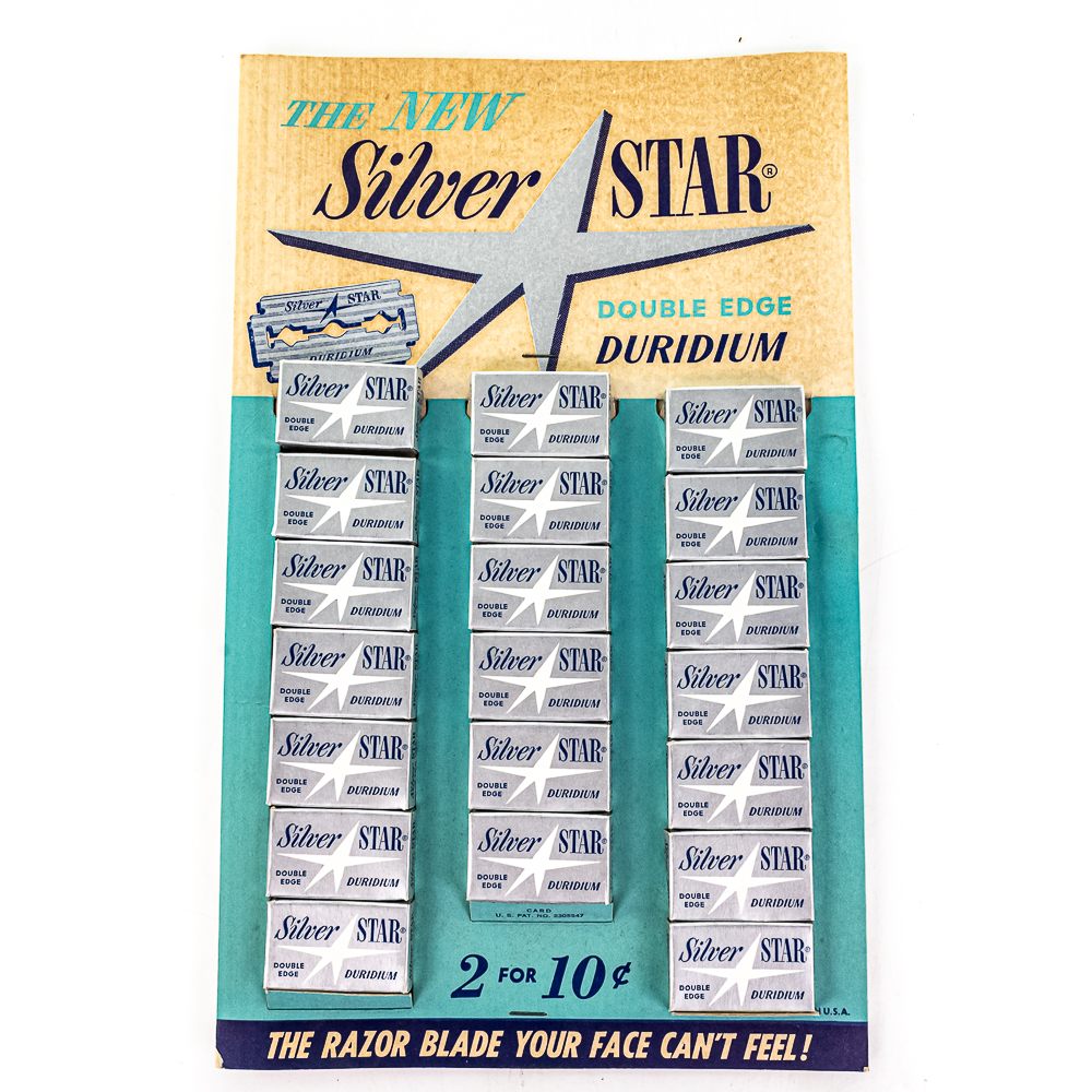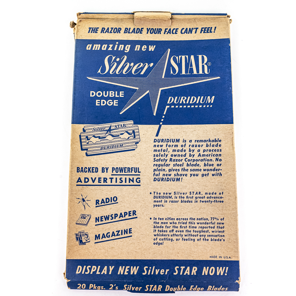 Vintage Silver Star Razor Blade Display, comes with 20 blade boxes, good condition, includes a unopened box of Silver Star blades in dispenser, includes original box, see photos 8 1/2″ 13 1/2″