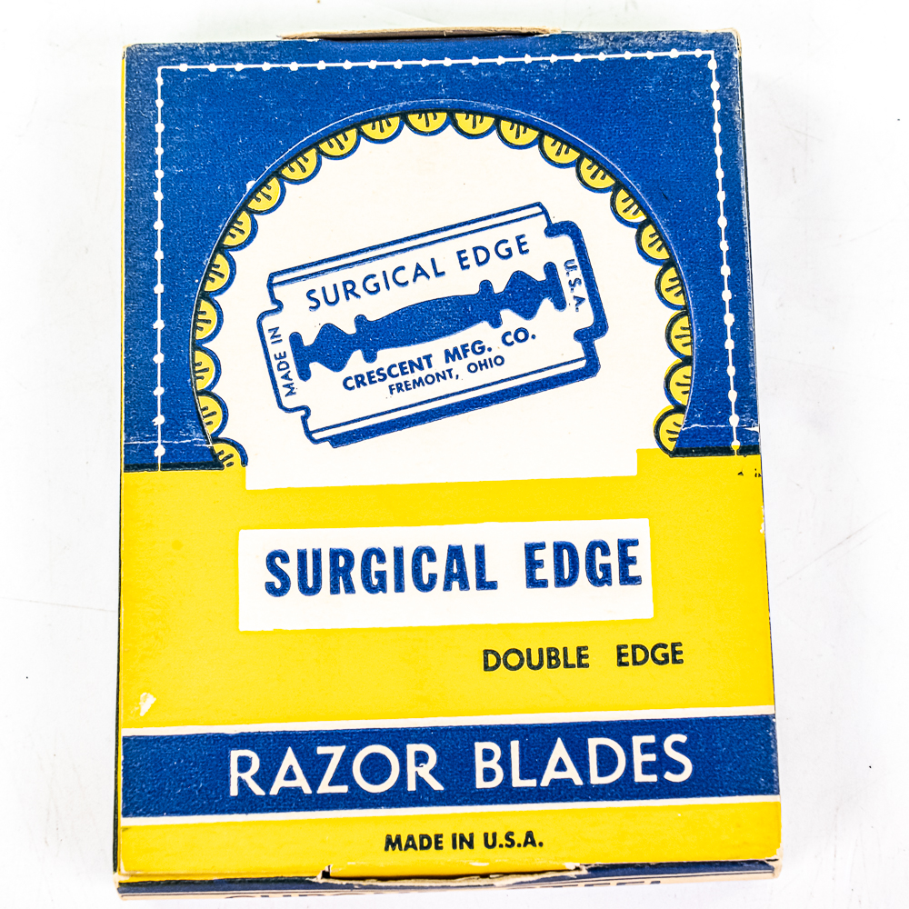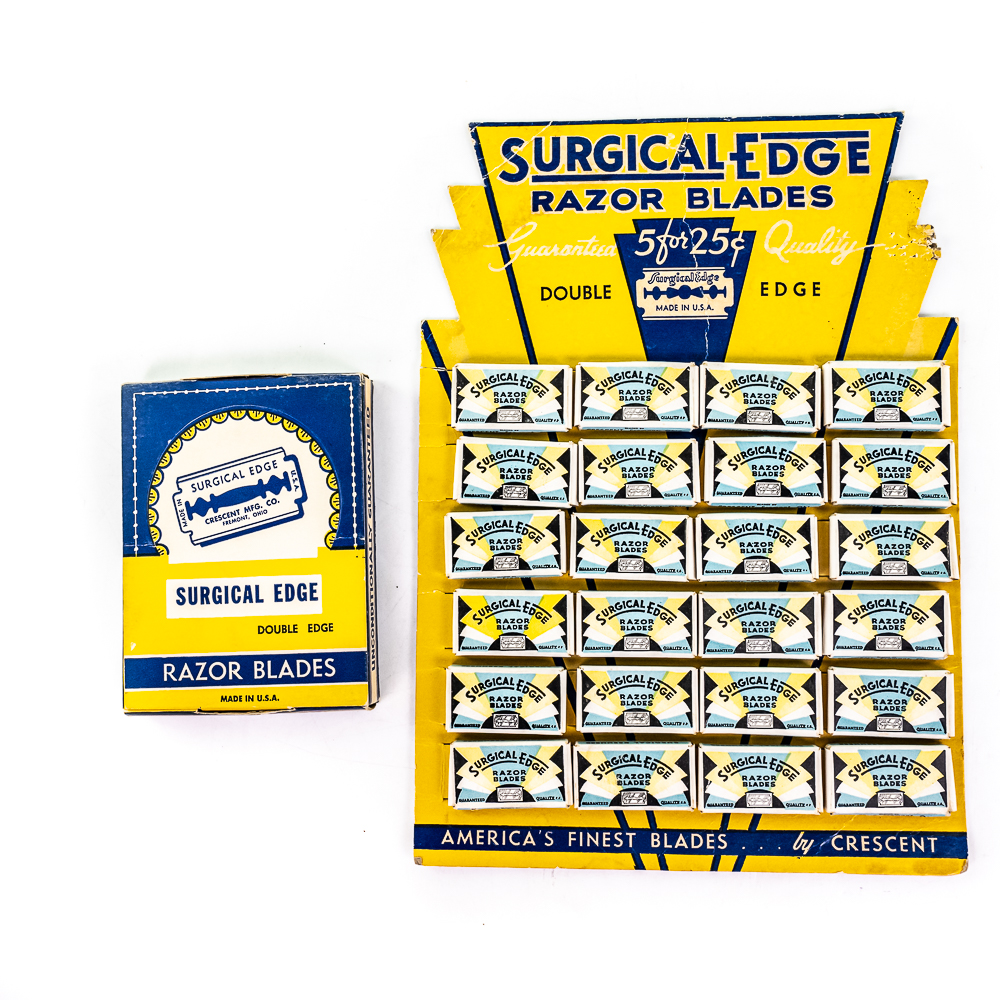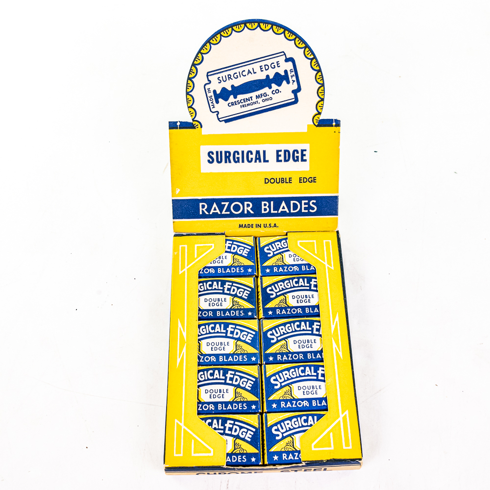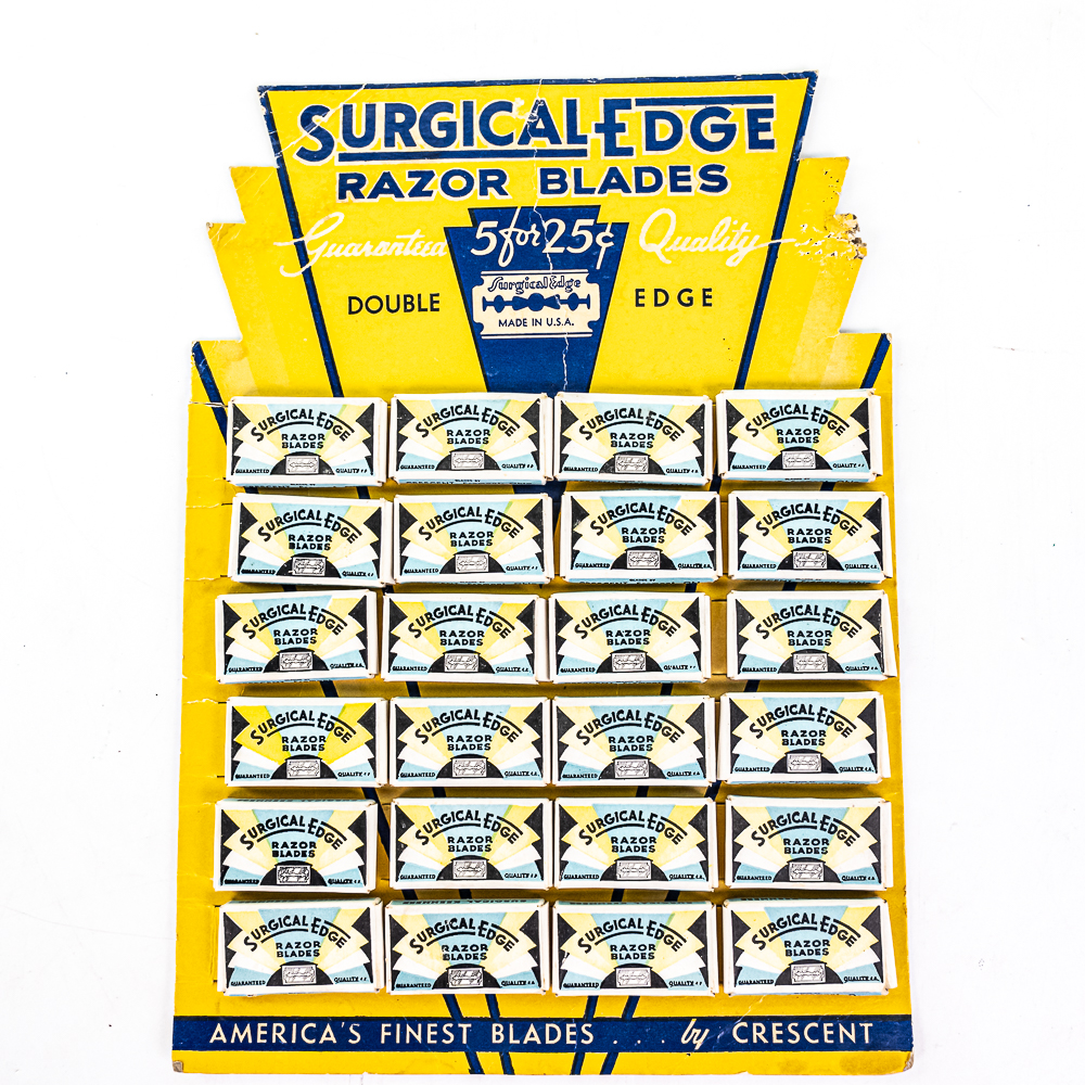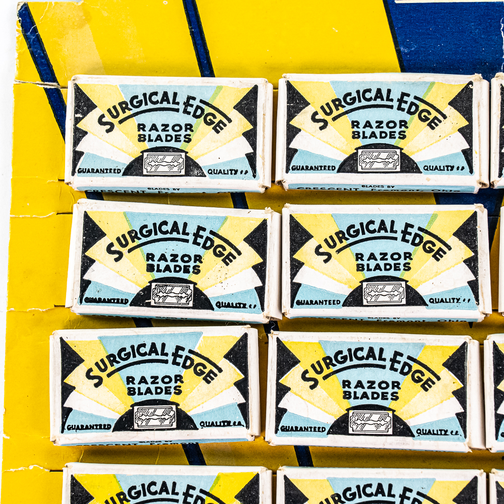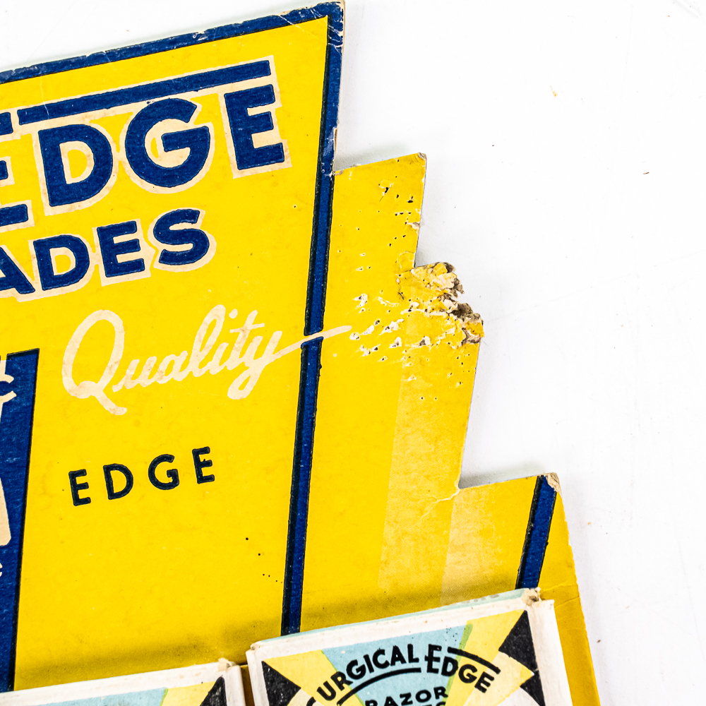 Vintage Surgical Edge Razor Blade Display, comes with 24 blade boxes, damaged corner on top right, see photos, included a box of Surgical Edge Double Edge blades, 20 packages inside, 9 1/2″ x 13″