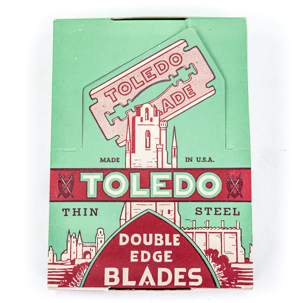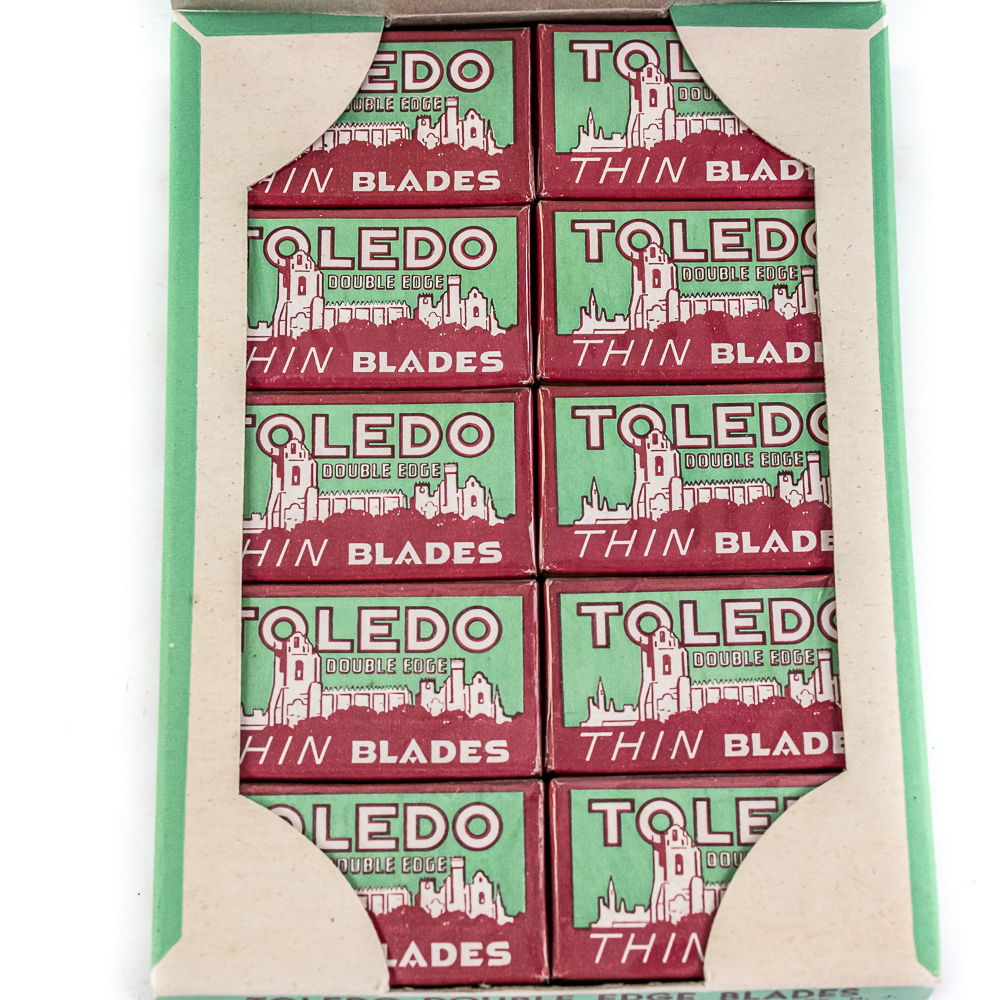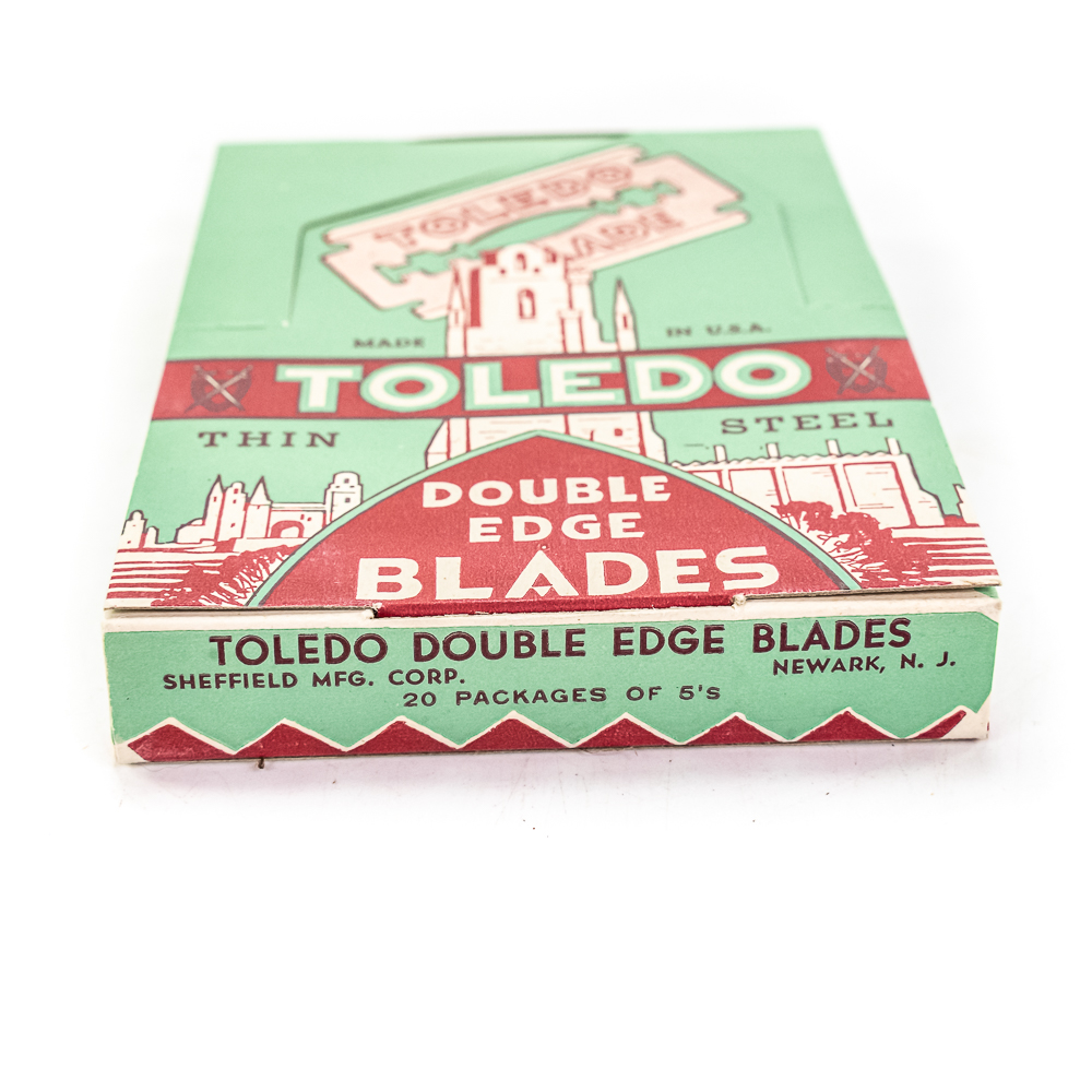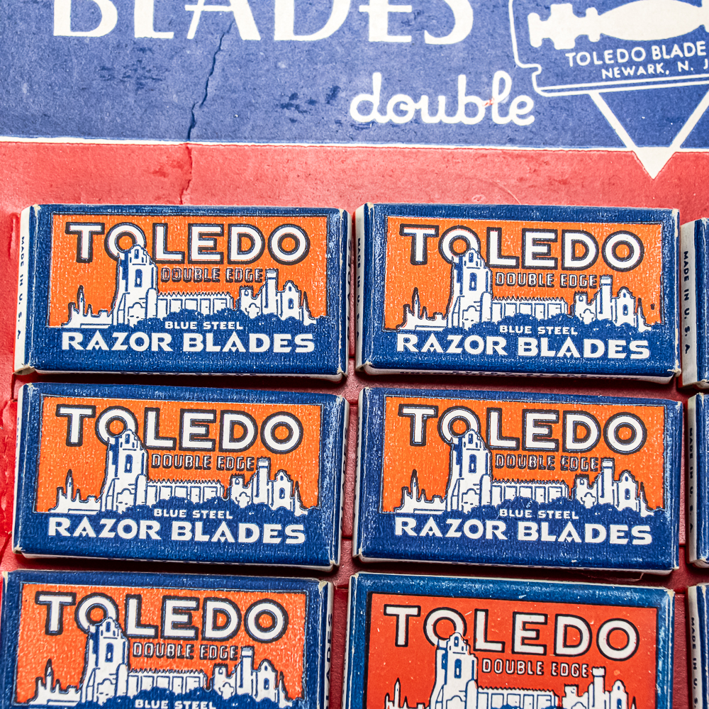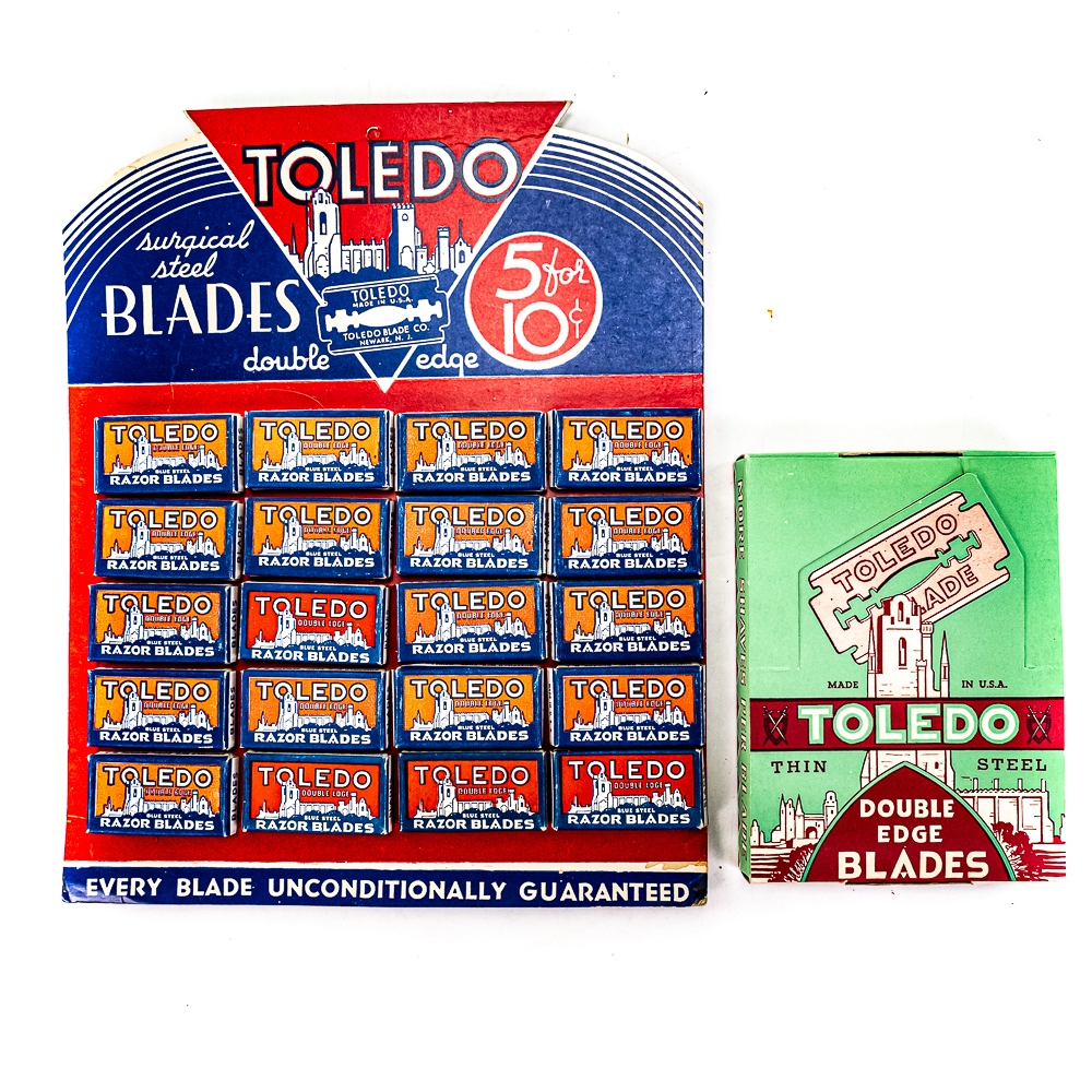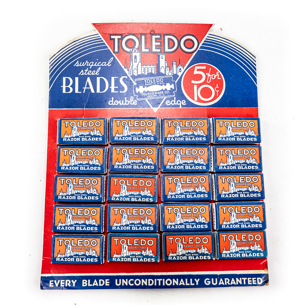 Vintage Toledo Razor Blade Display, Neward, NJ, comes with 20 blade boxes, shows minor wear along edges, includes one box of Toledo Double Edge Blades, ten boxes inside, see photos, 9″ x 11 1/2″