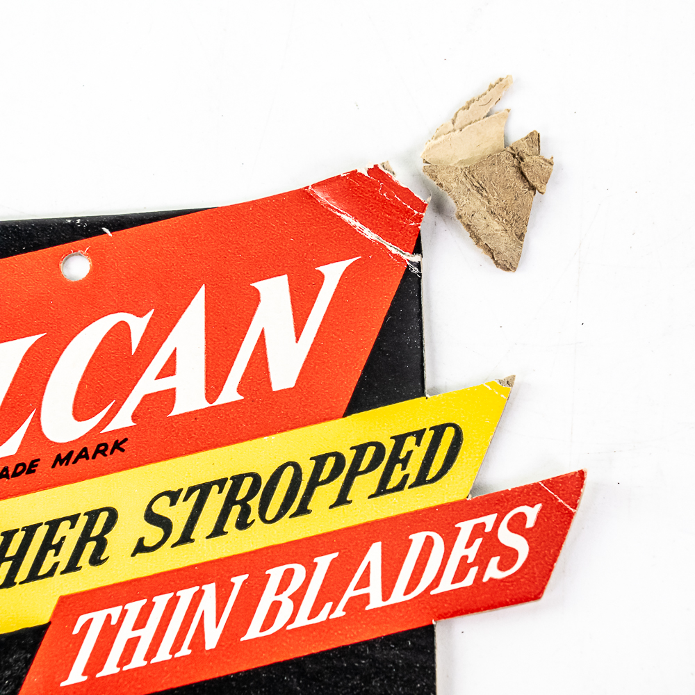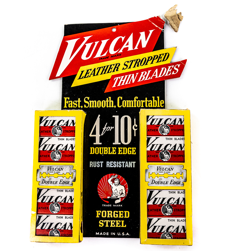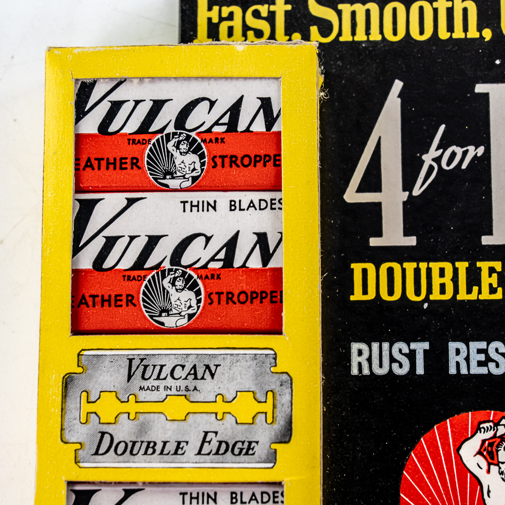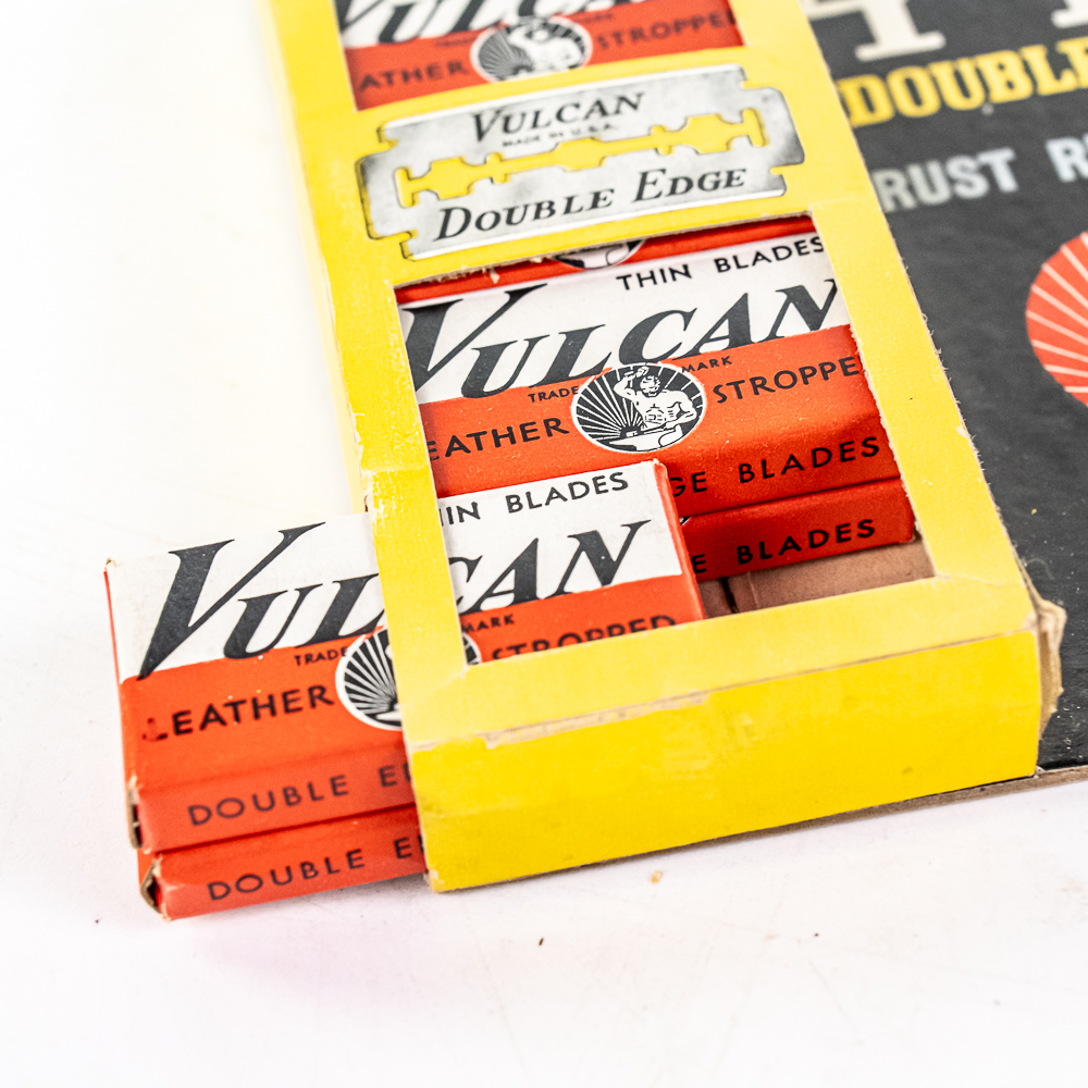 Vintage Vulcan Razor Blade Display, Maplewood, NJ, comes with 10 blade boxes, tip is missing from top and bends in other two tips at top of display, see photos, 7″ x 10″