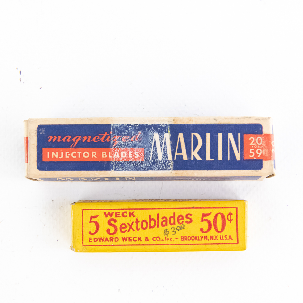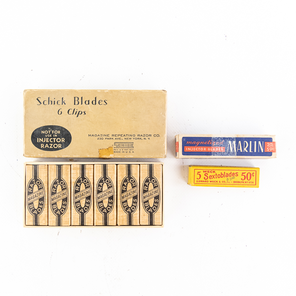 (3) Lot of Razor and Injector Items, includes one box of Schick Blades, 6 packages inside, one Marlin box of injectors and one box of 5 Sextoblades, see photos.