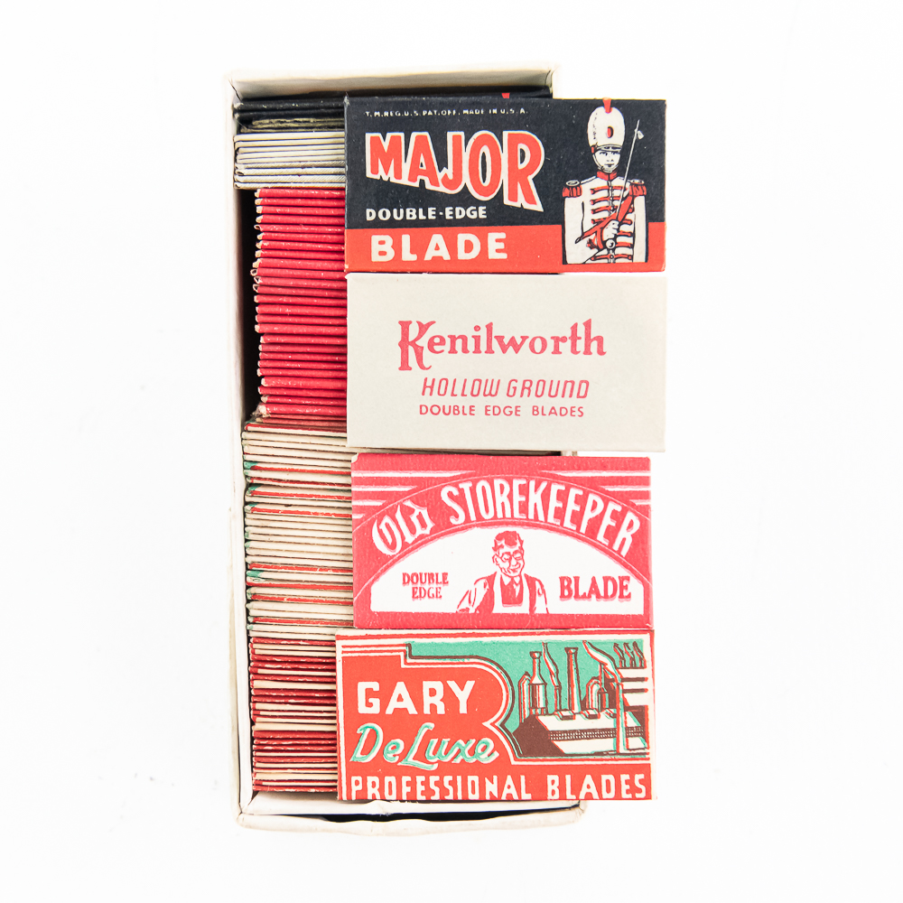 (2) Boxes of Various Razor Blades, includes box of Ludlow blades, unopened and one box of various brands of loose blades (American Red Cross, Kenilworth, Old Storekeeper, etc.), see photos.