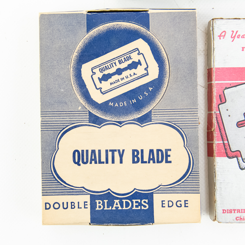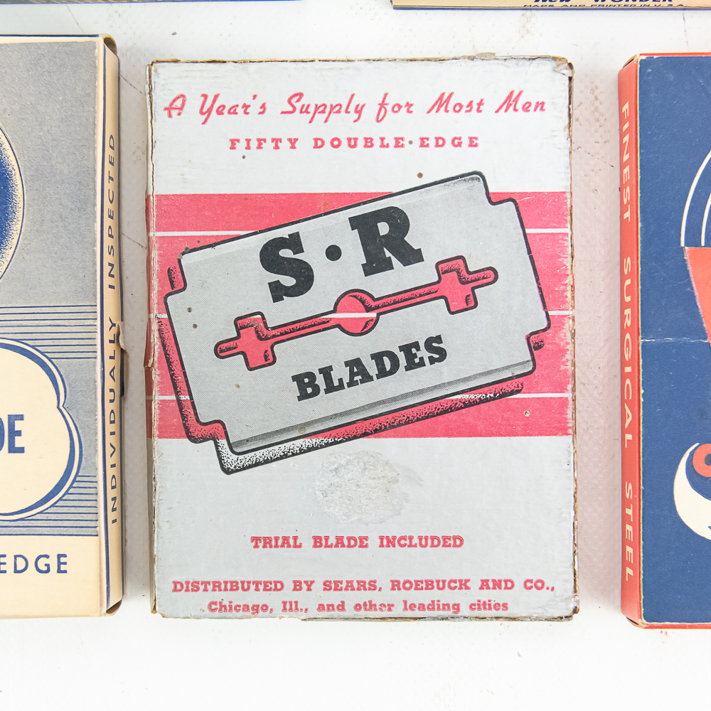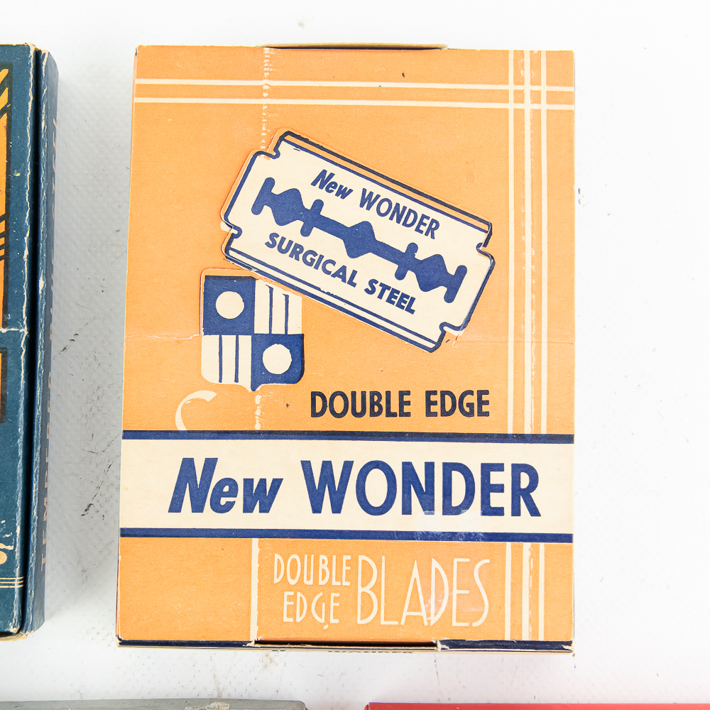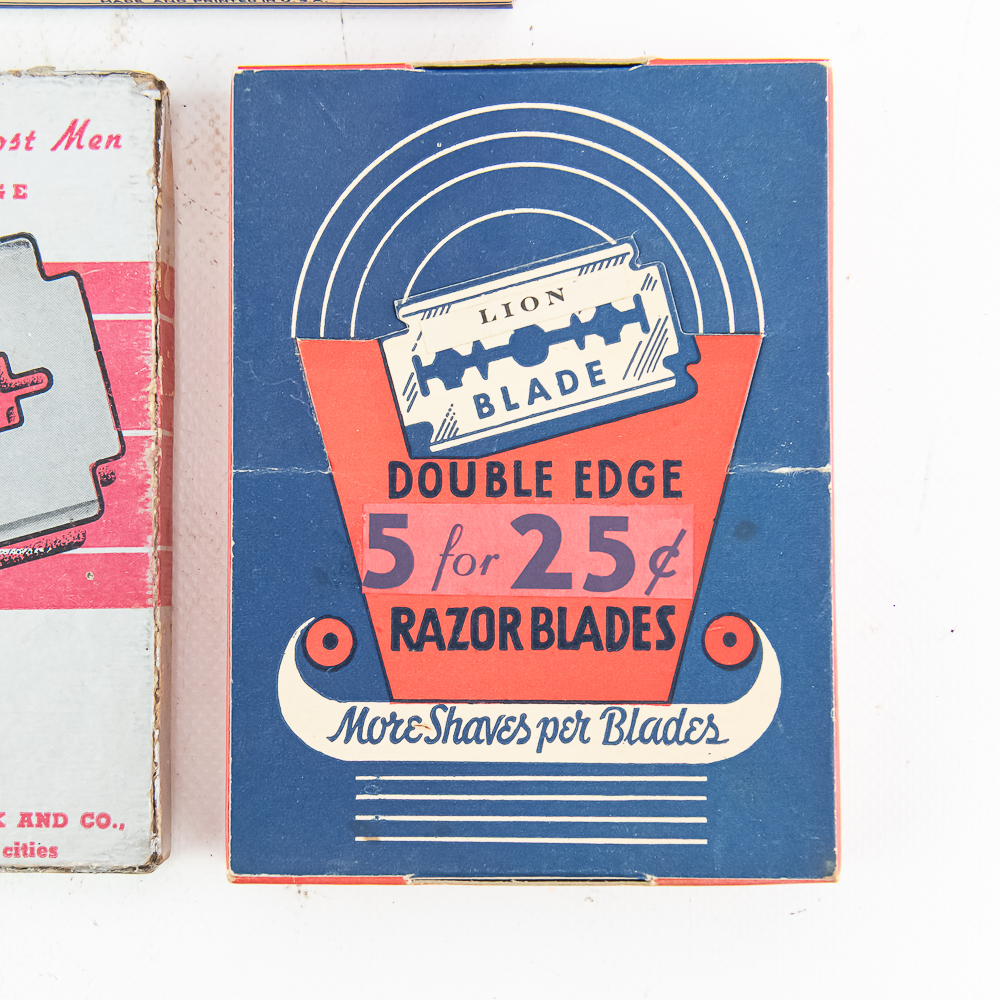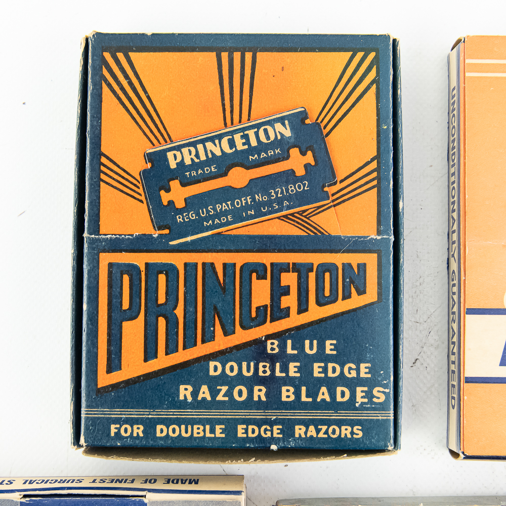 (5) Lot of Large Razor Blade Boxes includes Princeton, 20 pkgs, Lion, 20 pkgs, New Wonder, 20 pkgs, Quality, 20 pkgs, and S-R, 10 pkgs inside, see photos for condition.
