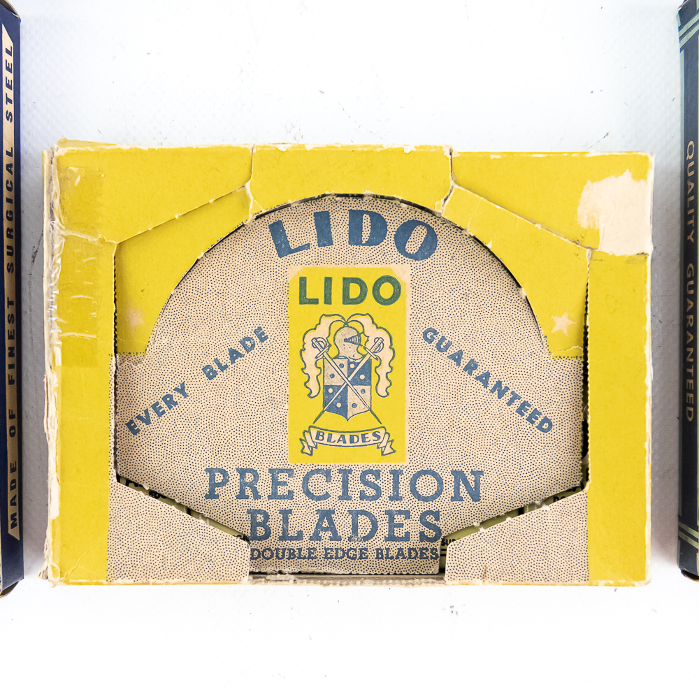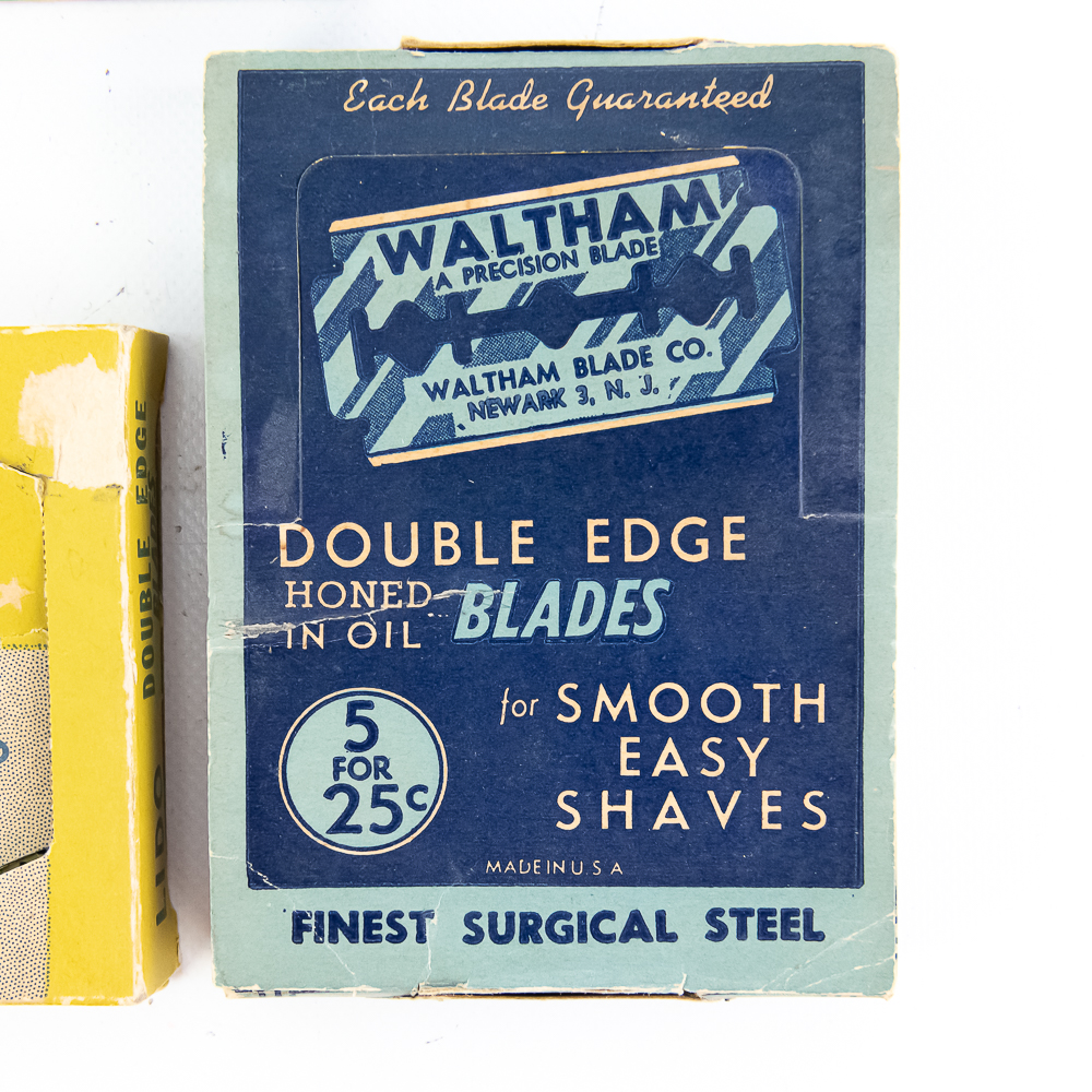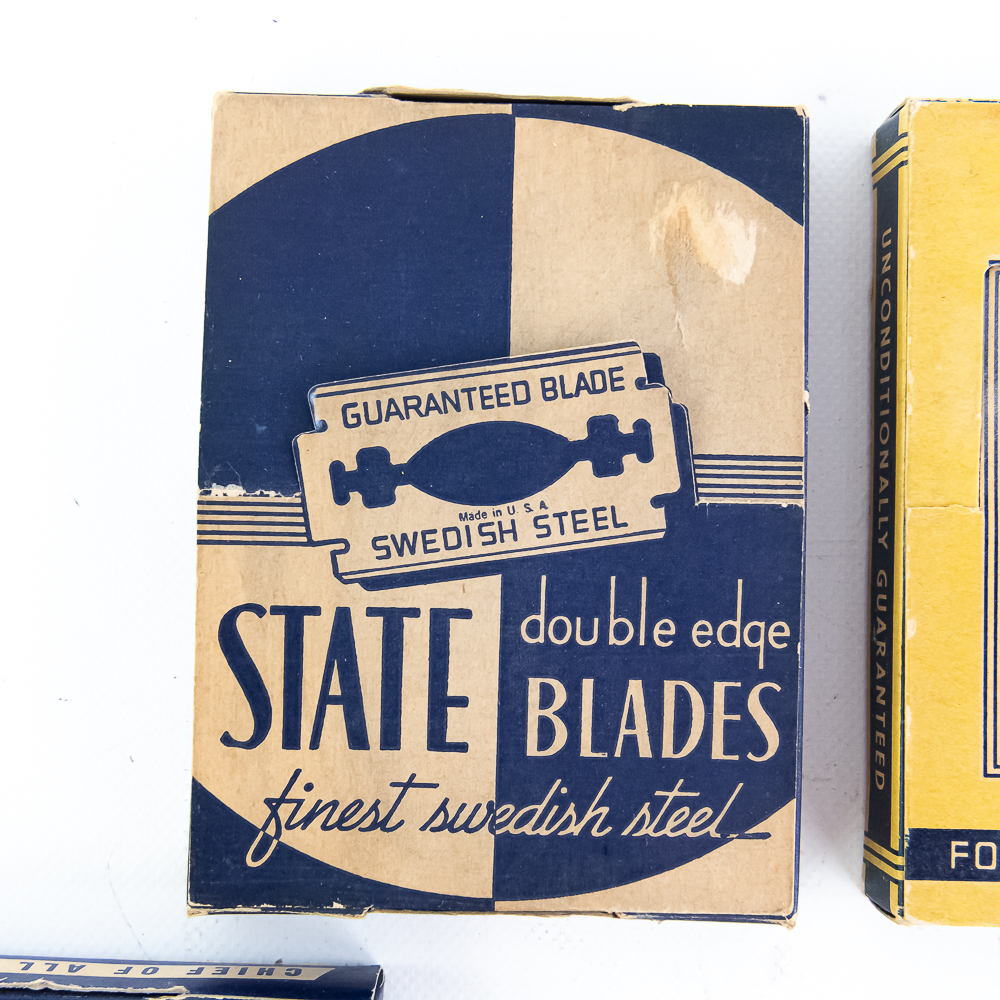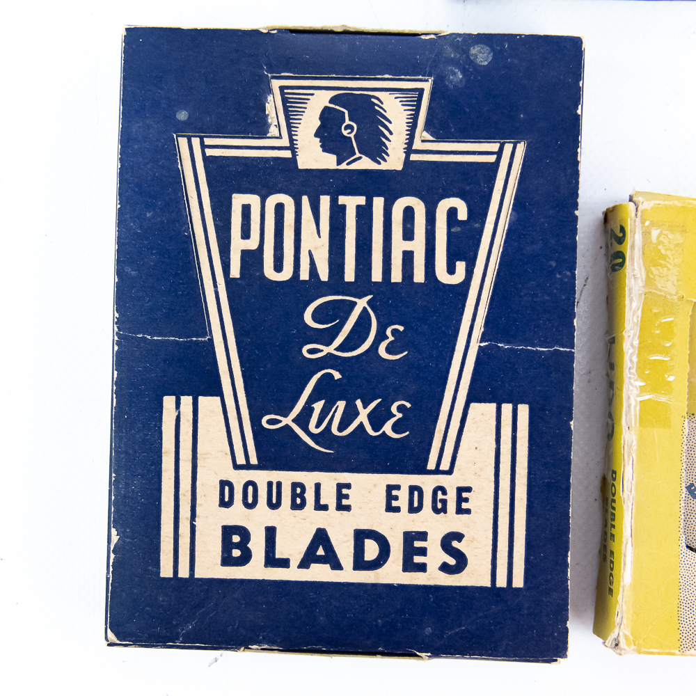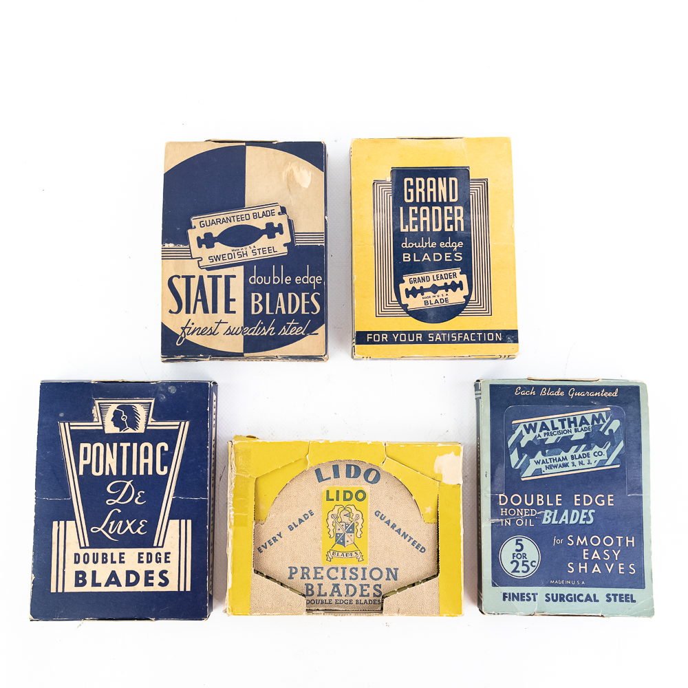 (5) Lot of Large Razor Blade Boxes includes Lid0, 9 pkgs, lid is torn, State, 20 pkgs, Pontiac, 20 pkgs, Grand Leader, 16 pkgs, and Waltham, 20 pkgs inside, see photos for condition.