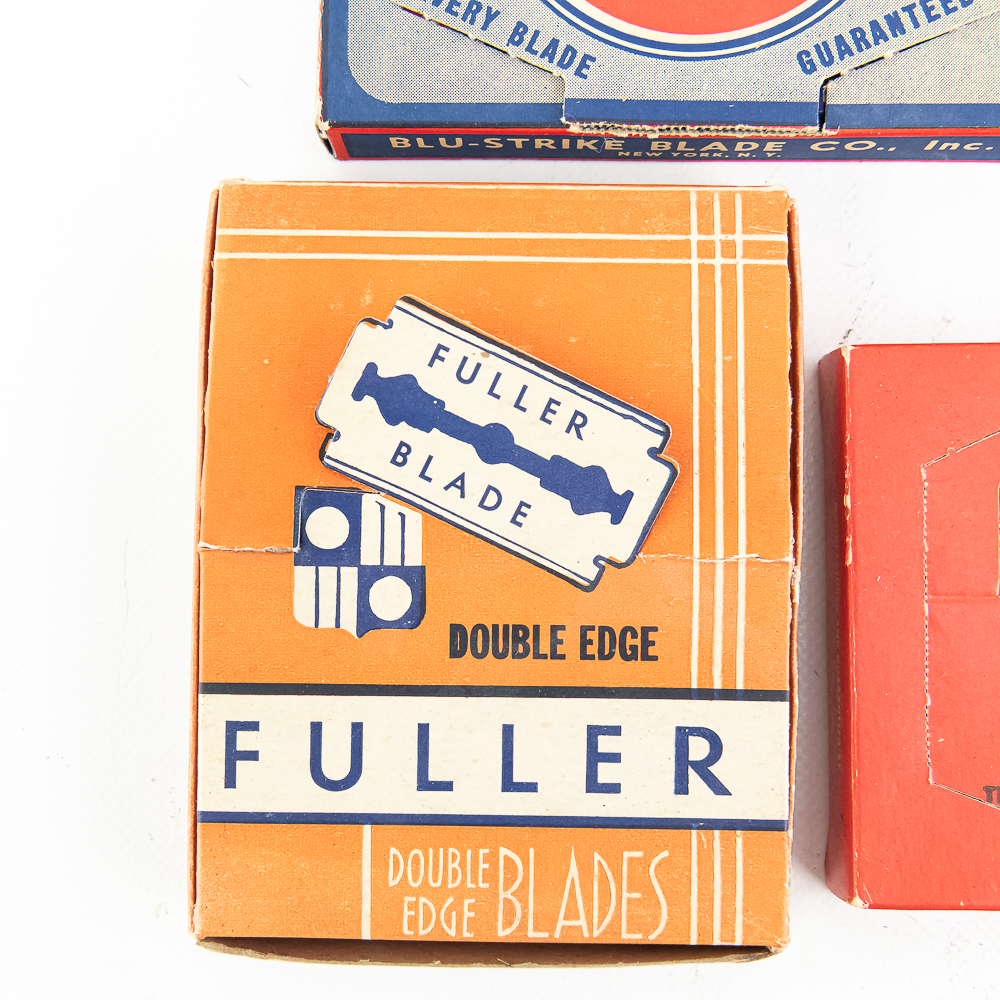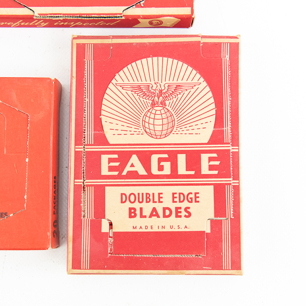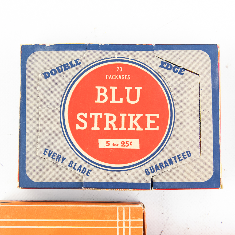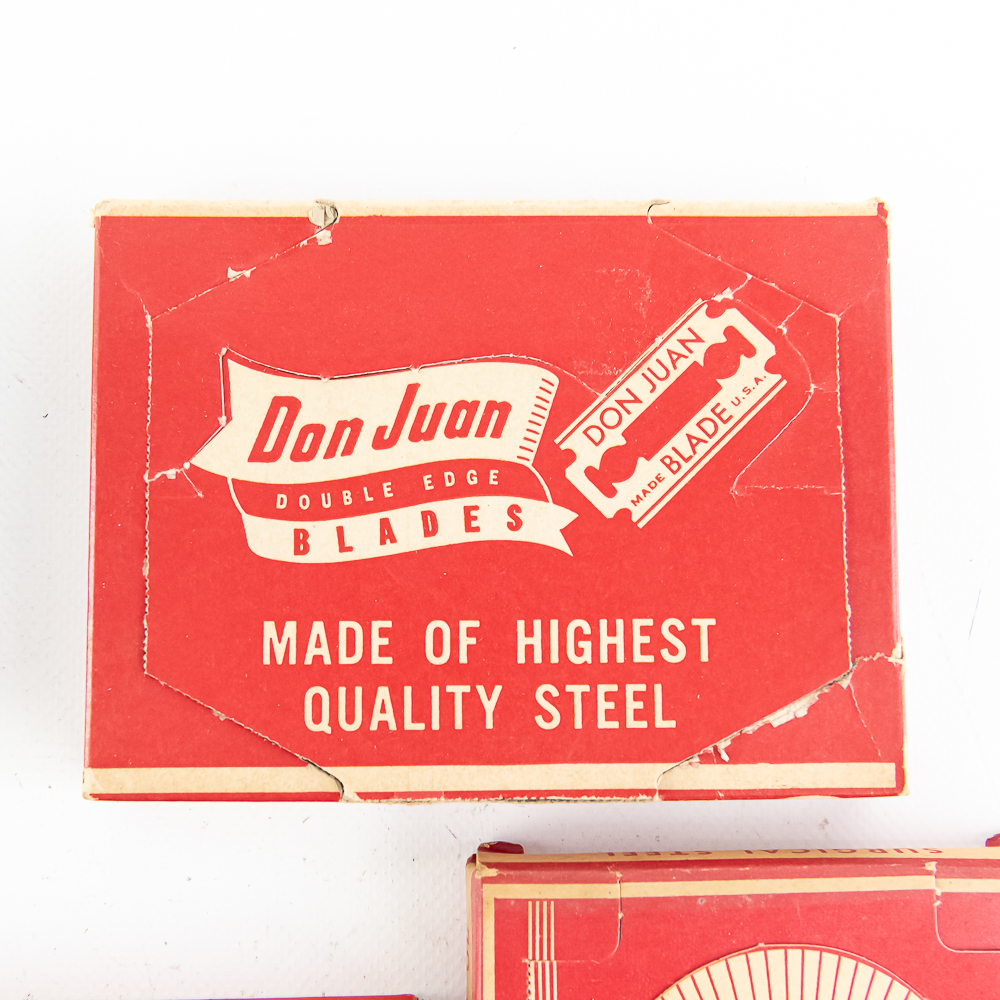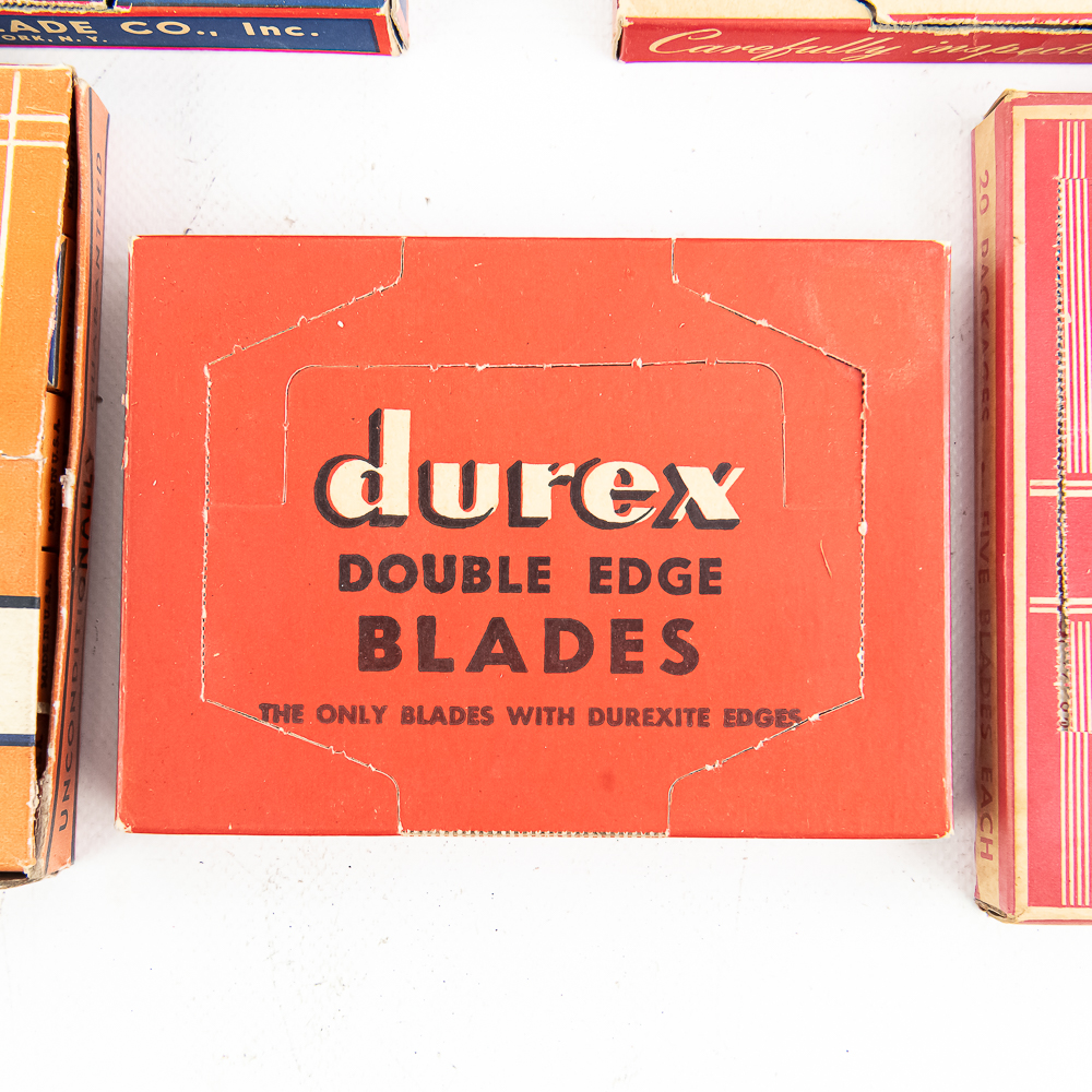 (5) Random Boxes of Vintage Razor Blades, includes Blu Strike, 20 pkgs, Fuller, 20 pkgs, Durex, unopened, Eagle, 20 pkgs, and Don Juan, 20 pkgs inside, see photos for condition.