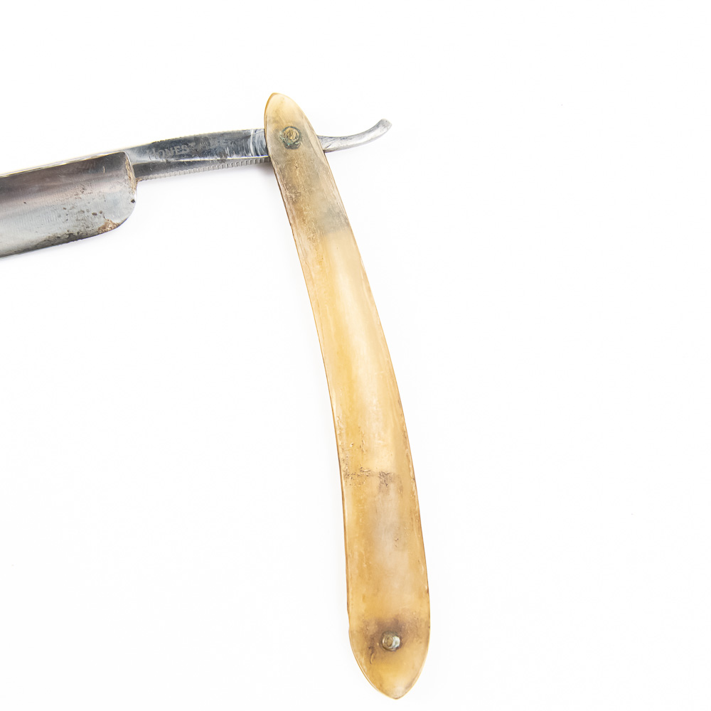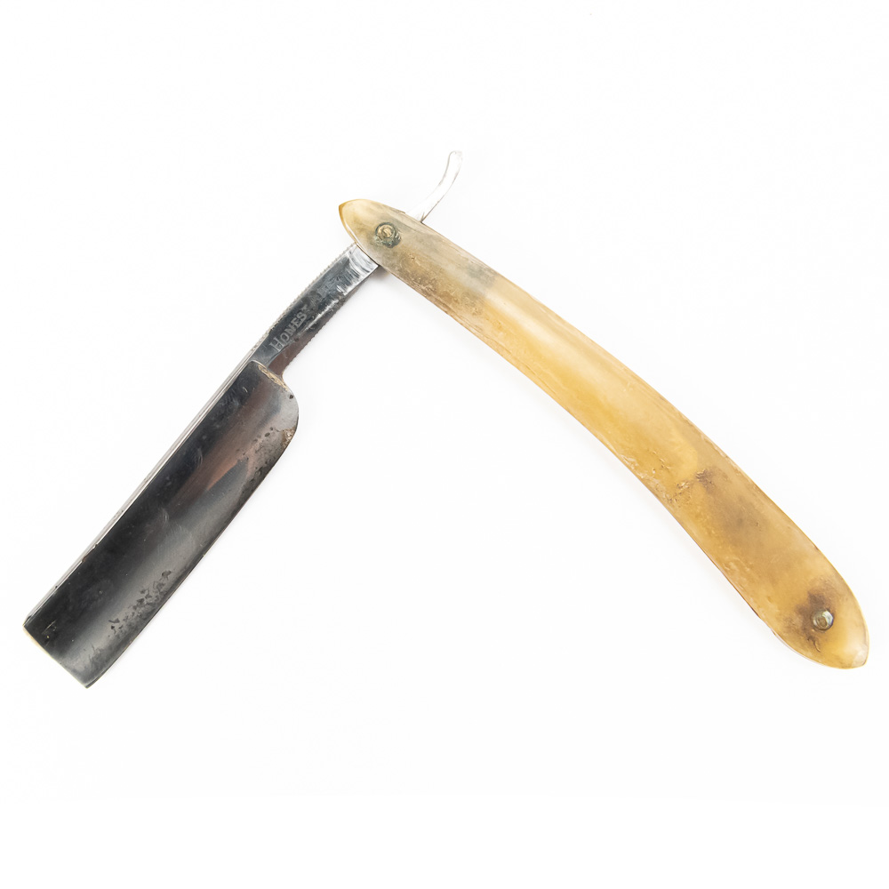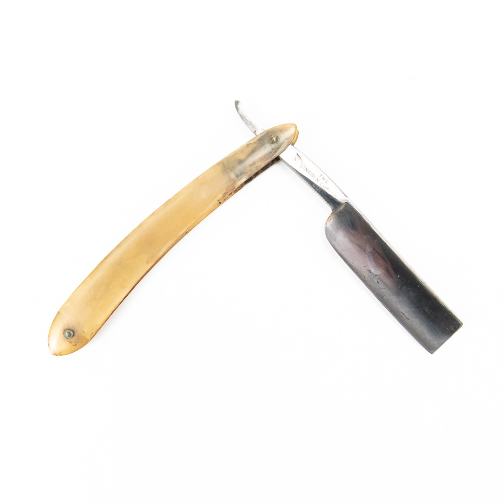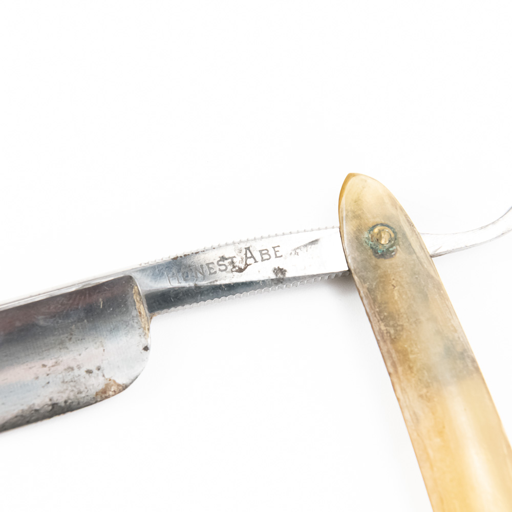 “Honest Abe” by the Lincoln Cutlery Co. with clear celluloid scales with discoloration. The shank reads “Honest Abe”, and reverse states ” Lincoln Cutlery Co. Blade & shank (5.5″l: 3/4″w) is in overall good condition, with some tarnish noted. Please use photos to judge condition and bid accordingly.