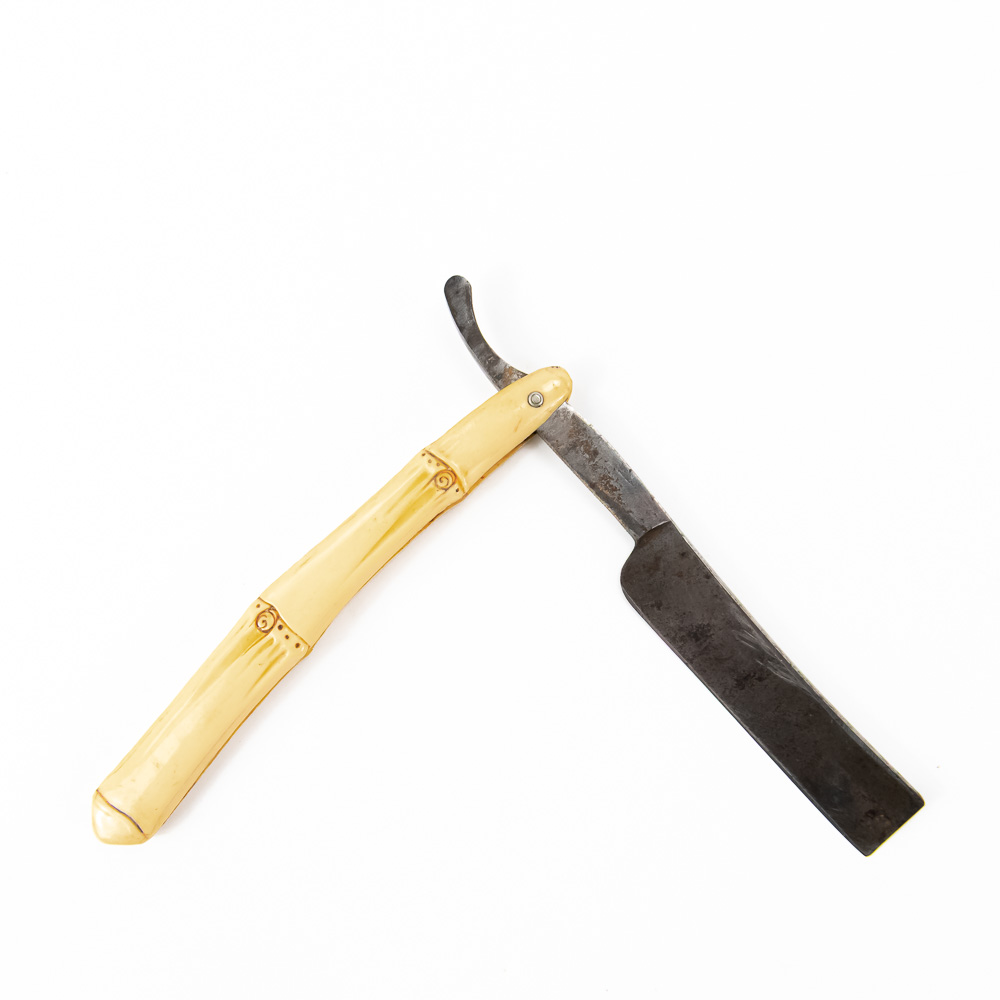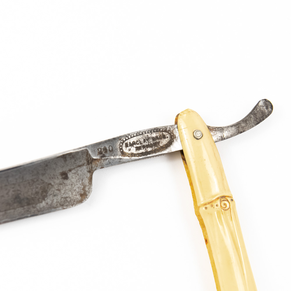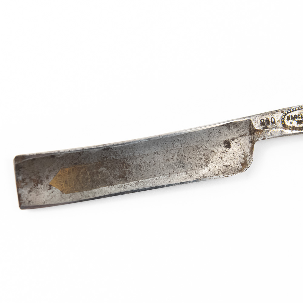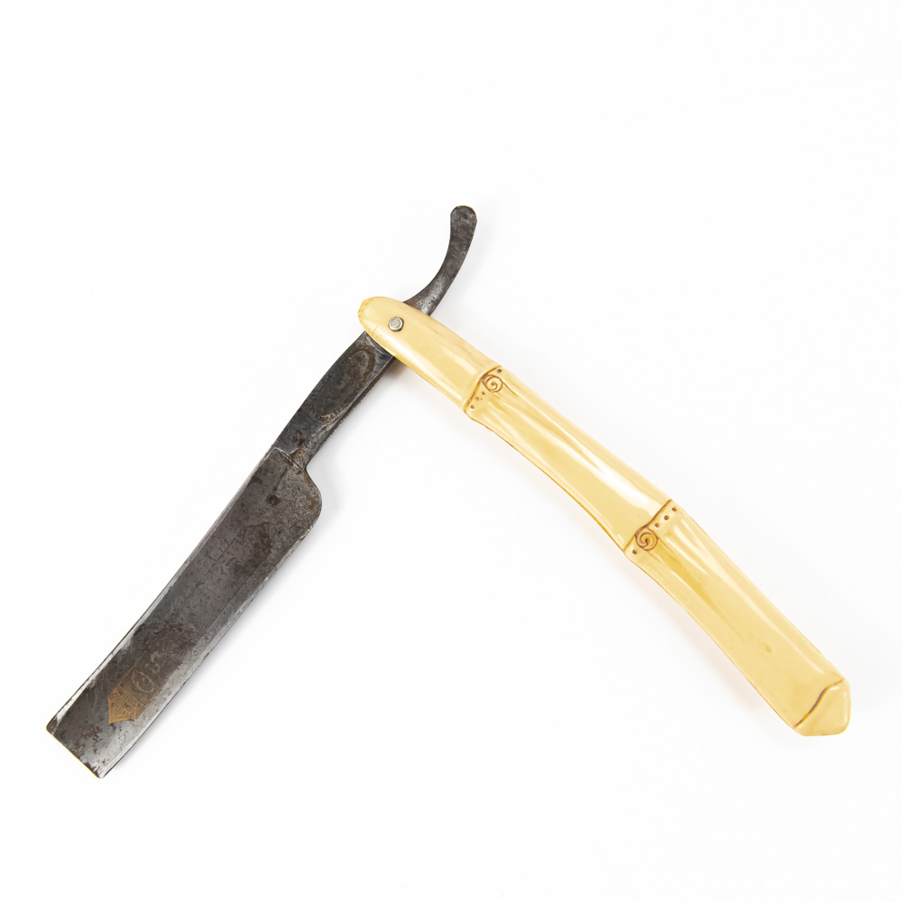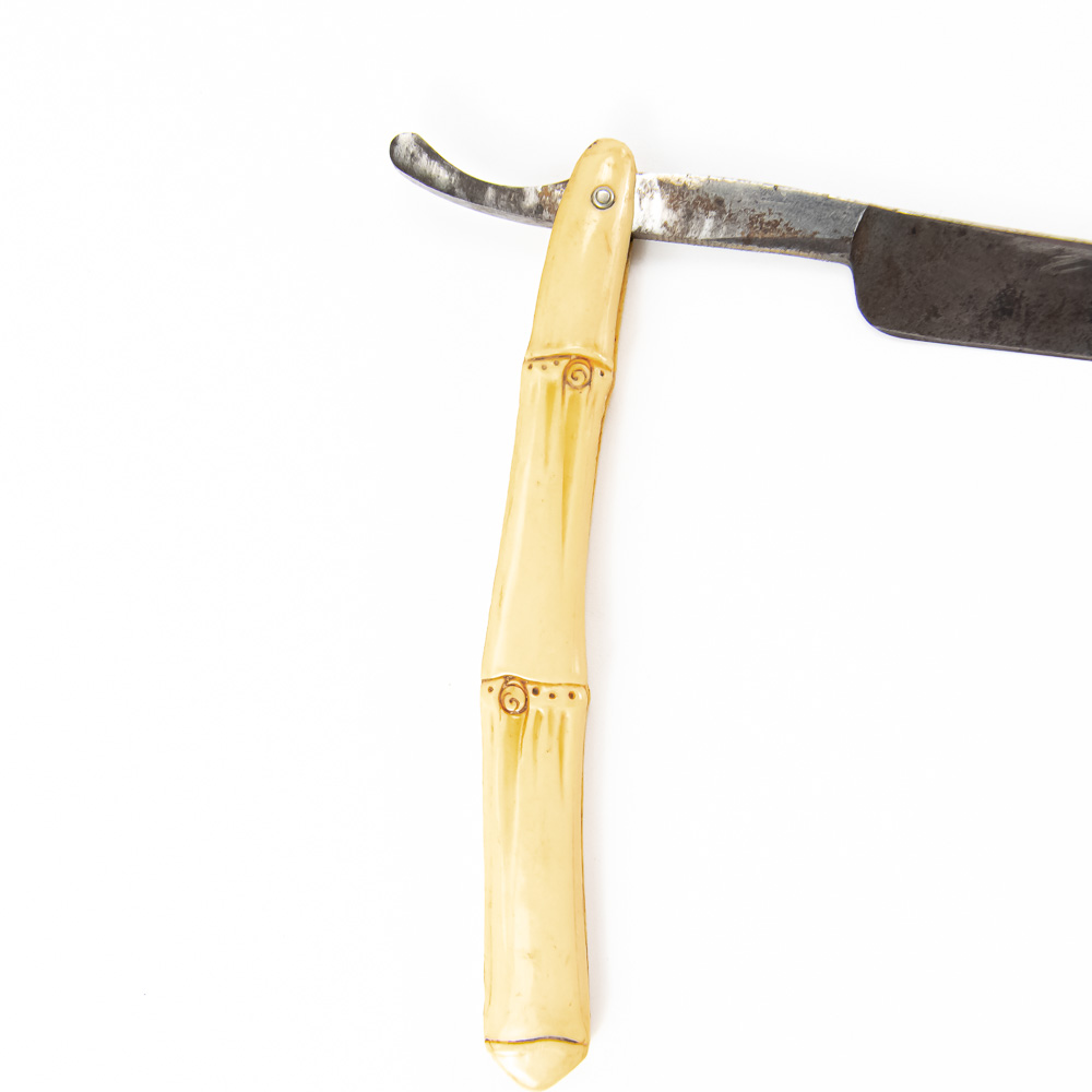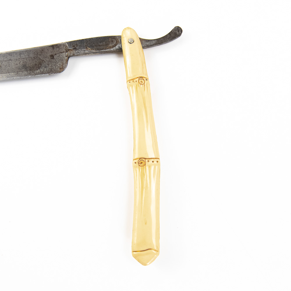 “Barclay Brothers #260” ornate German straight razor perfectly accented with bamboo inspired celluloid scales. The blade face reads “Our Steel”, the shank reads Barclay Brothers Germany 260; reverse is blank. The blade & shank (5 3/4″l: 3/4″w) is in overall very good condition, with moderate tarnish noted. Please use photos to judge condition and bid accordingly.