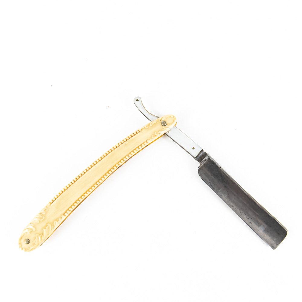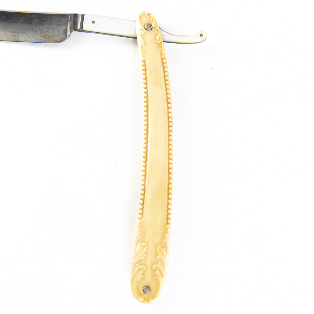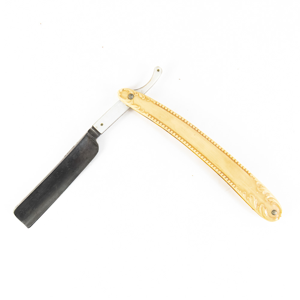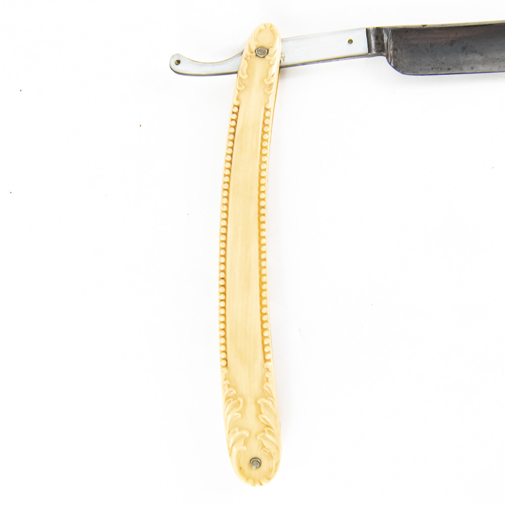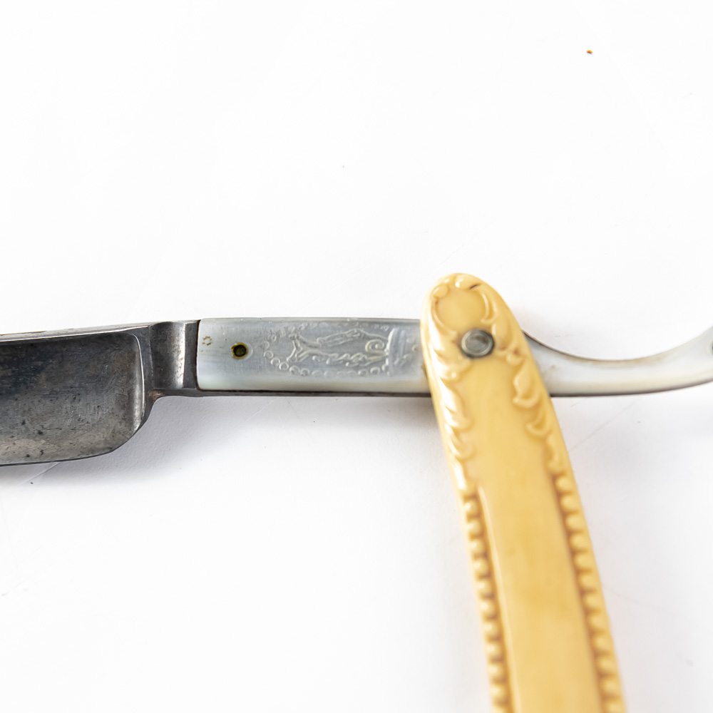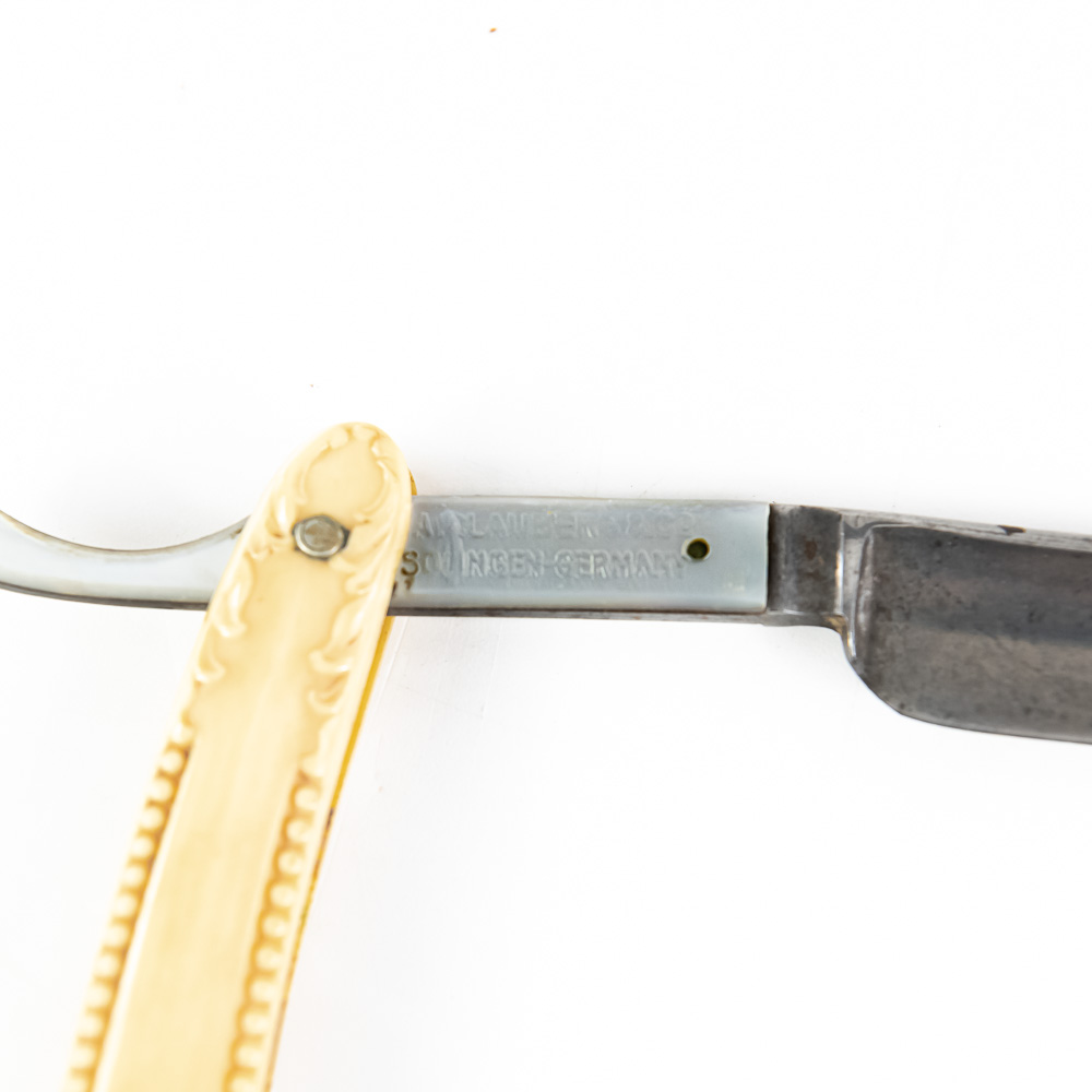 F.A. Clauberg vintage straight razor with ornate high relief off white celluloid scales. The MOP inlaid shank reads “F.A. Clauberg, Solingen Germany”, the reverse of the shank shows a fishlike design, the blade face is blank. The blade (5.5″l: 3/4″w) is in overall very good condition, with light tarnish noted. Please use photos to judge condition and bid accordingly.