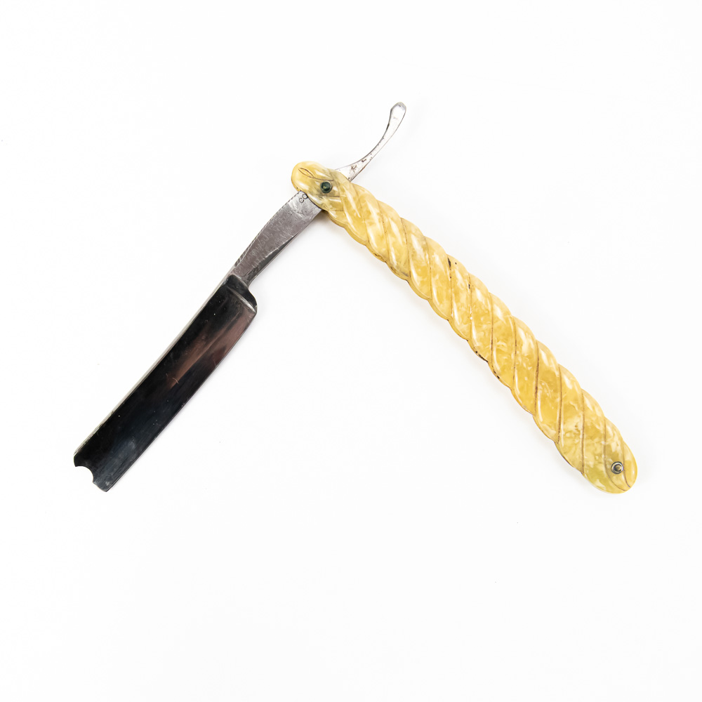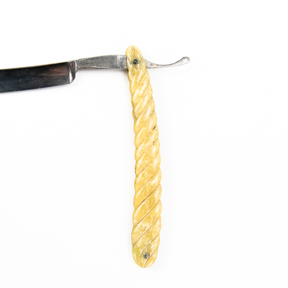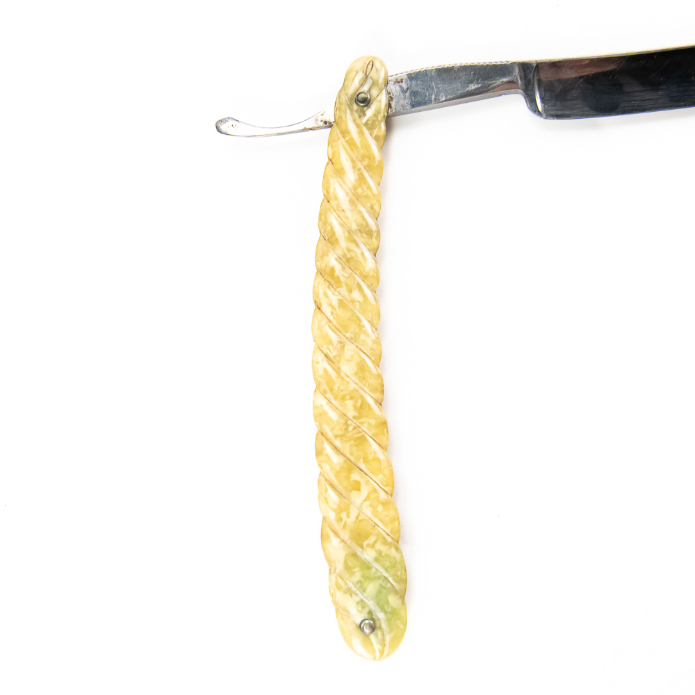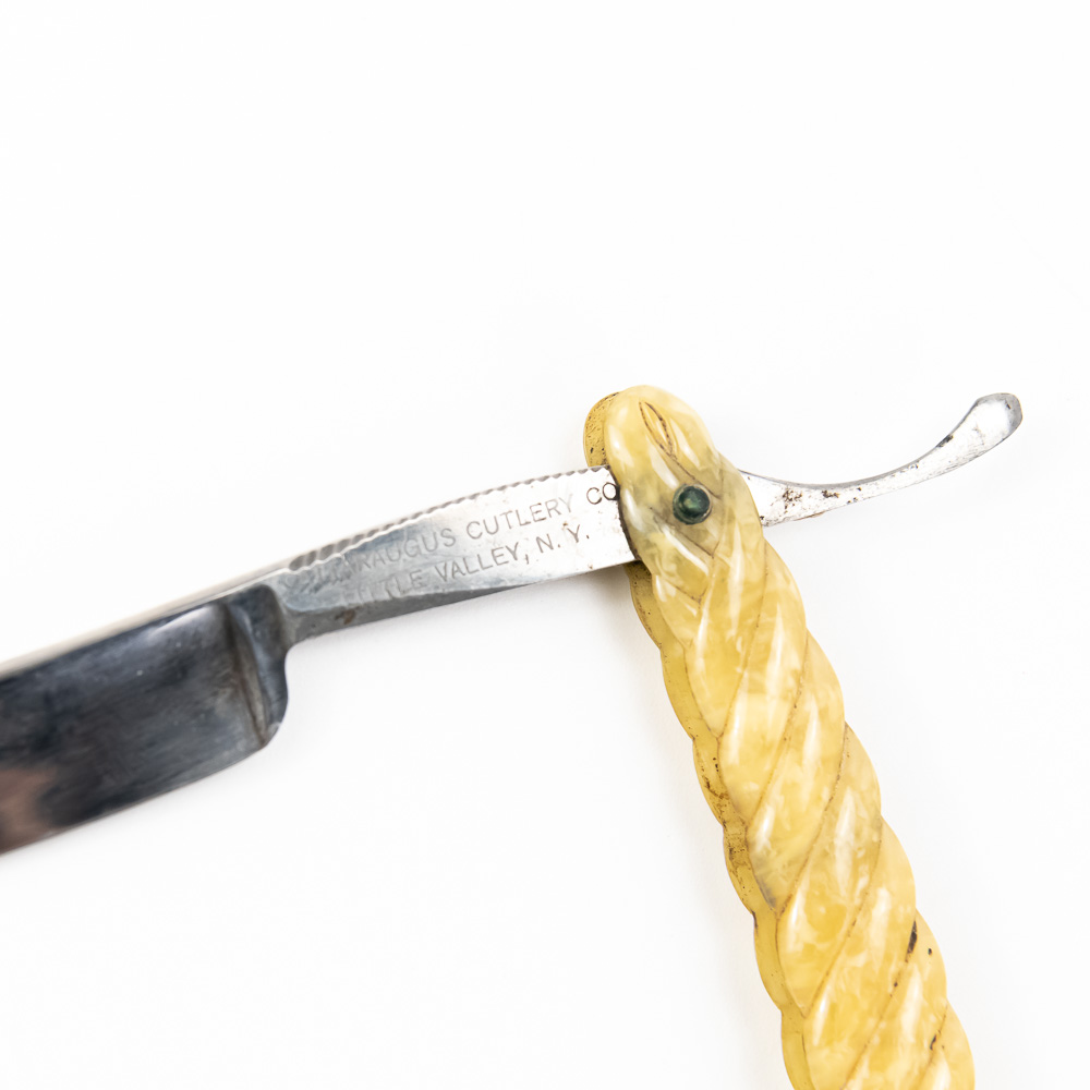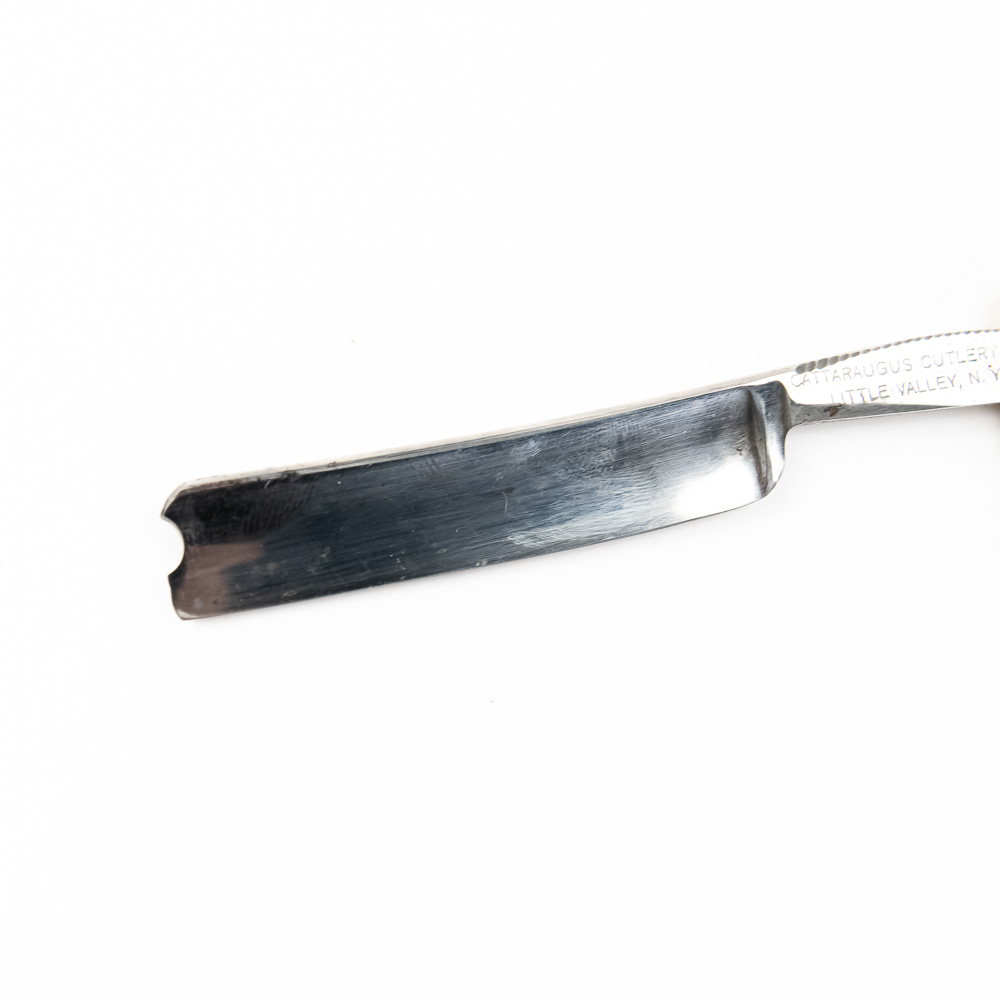 Antique Cattaraugus Cutlery straight razor blade with twisted celluloid scales. The shank reads “Cattarugus Cutlery Co. Little Valley NY”, the reverse is blank. The blade & shank (5.5″l: 3/4″w) is in overall very good condition, with minor tarnish noted. Please use photos to judge condition and bid accordingly.