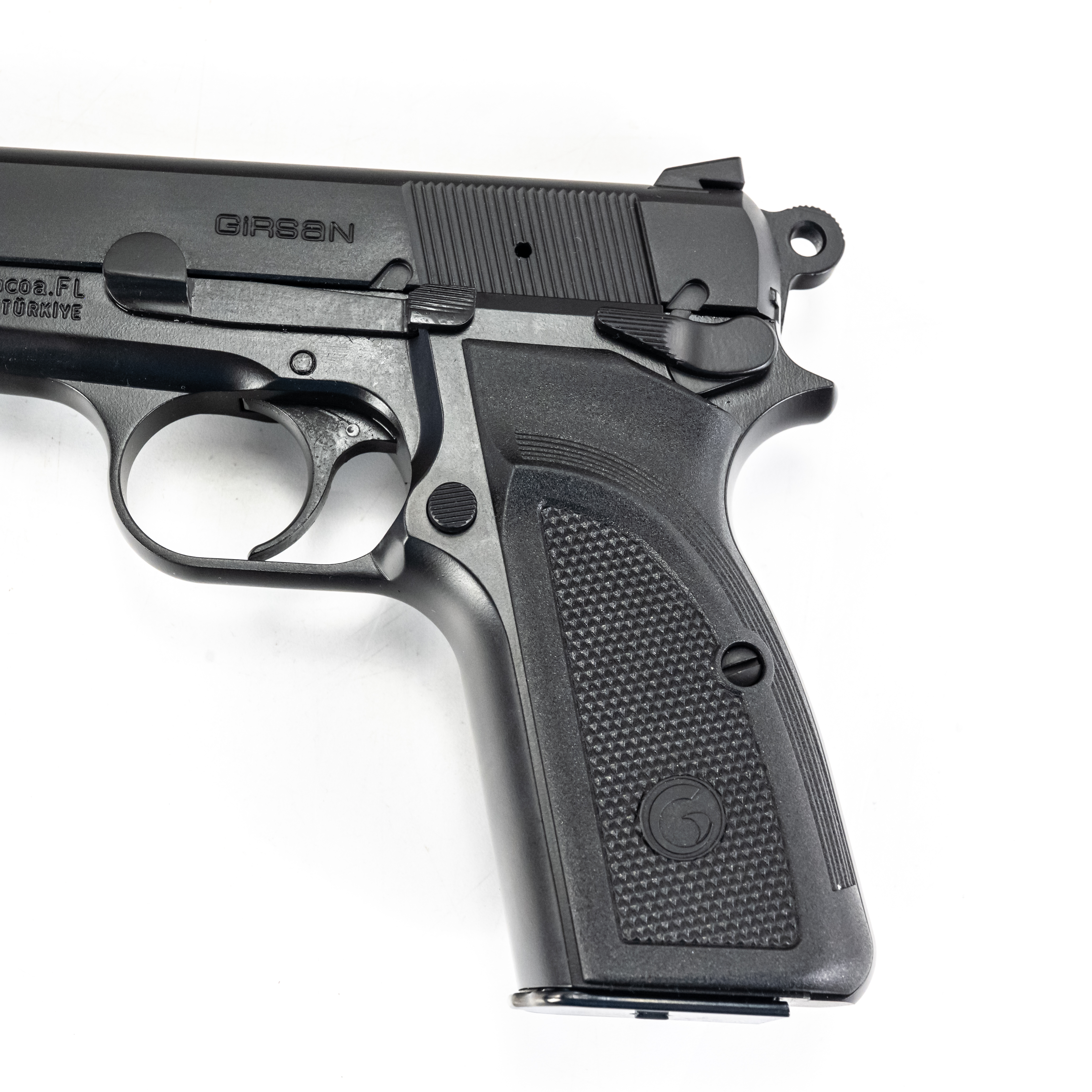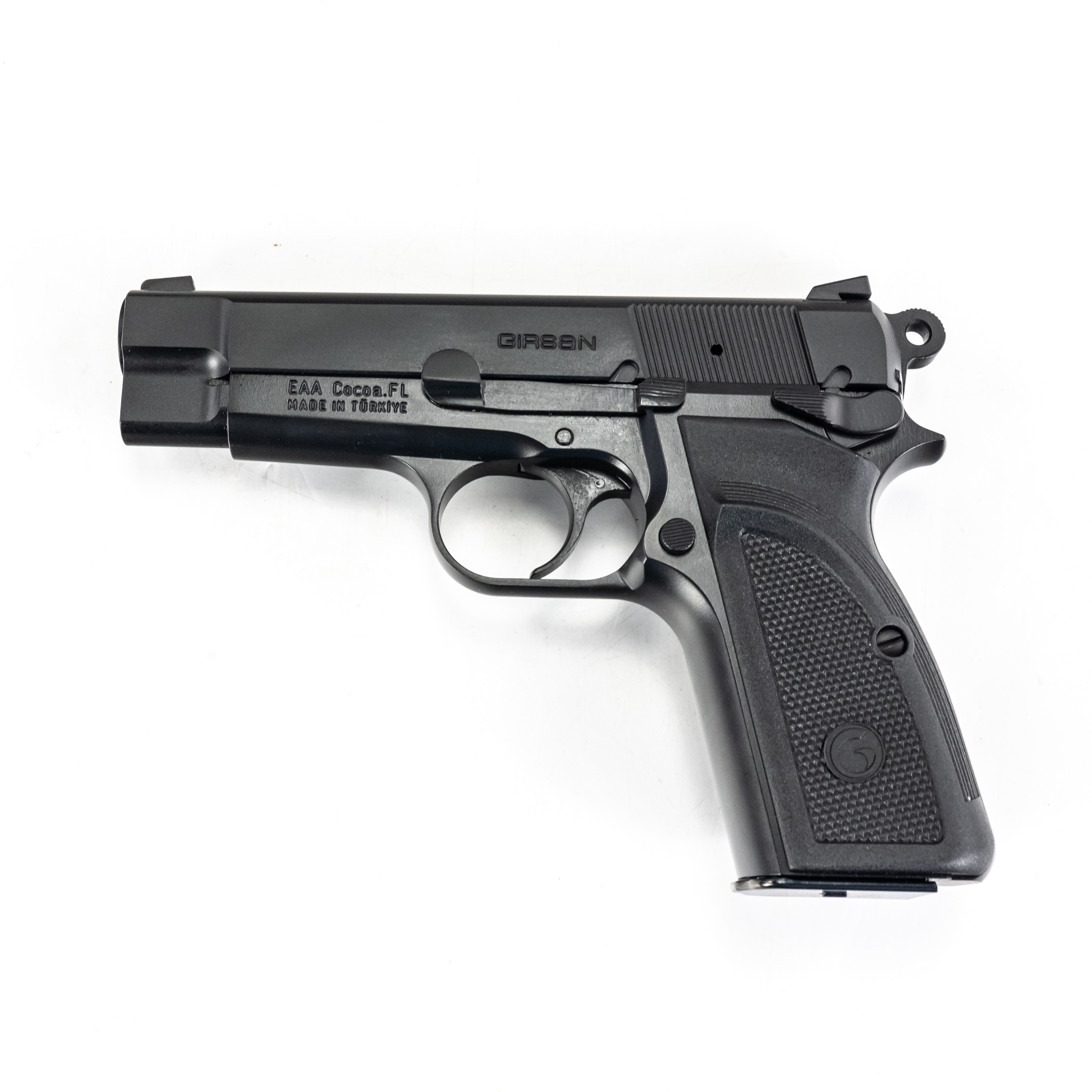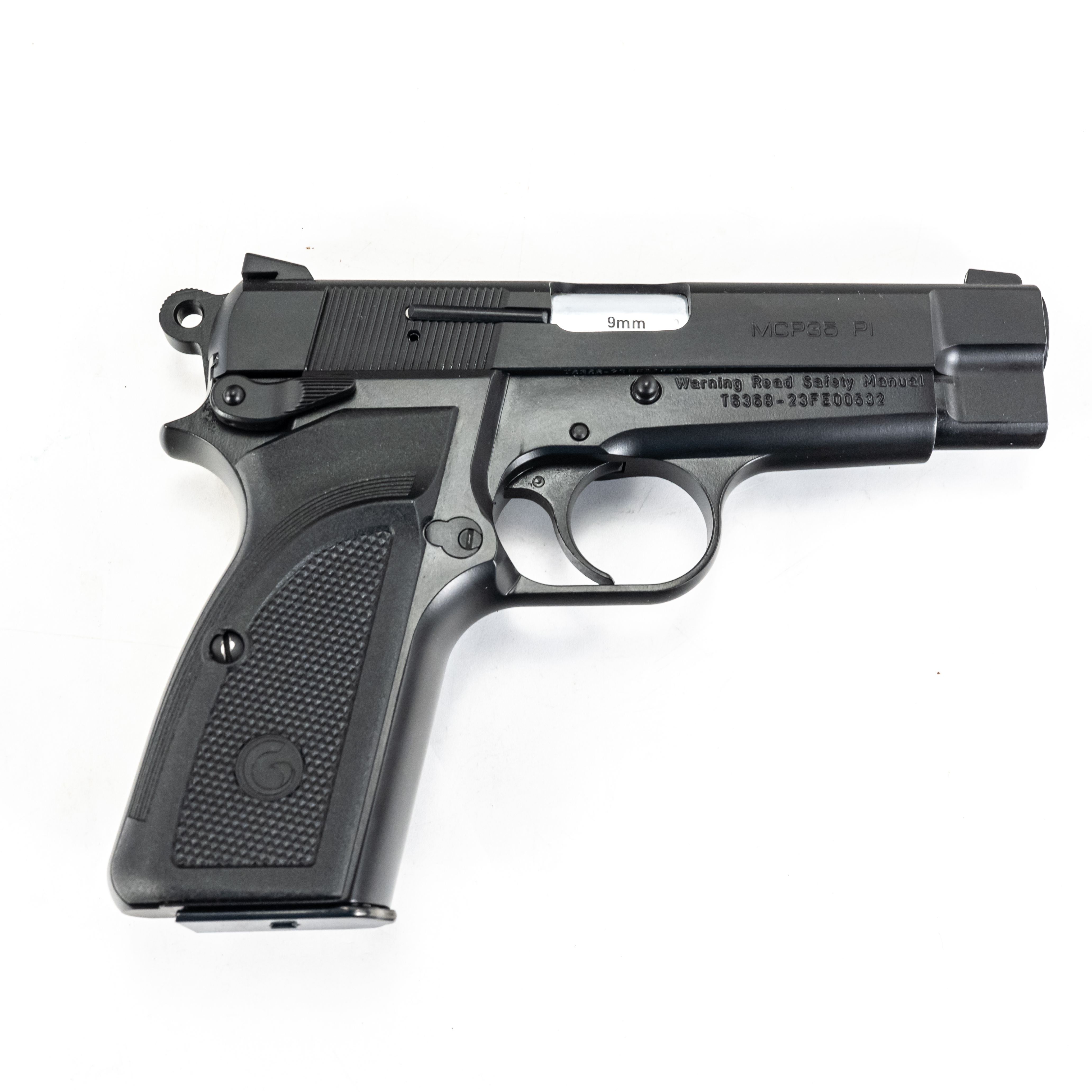 Girsan MCP35 PI pistol. Caliber 9mm Luger. Mid size copy of Browning Hi-Power design. Turkish made all steel pistol is like new in box and appears unfired. Smaller dimensions make pistol perfect for concealed carry. See photos.