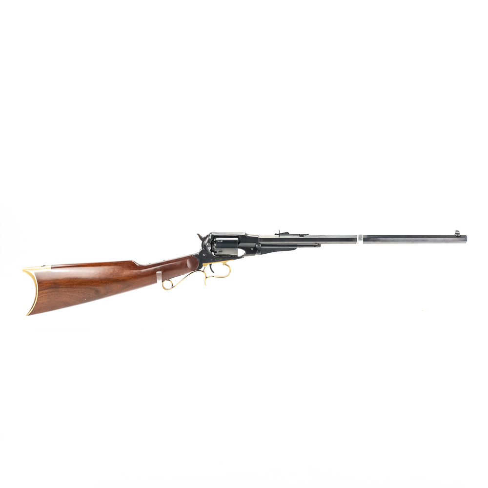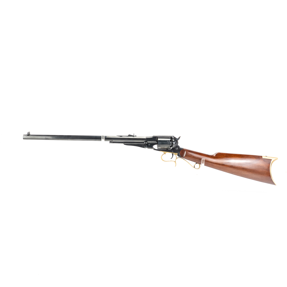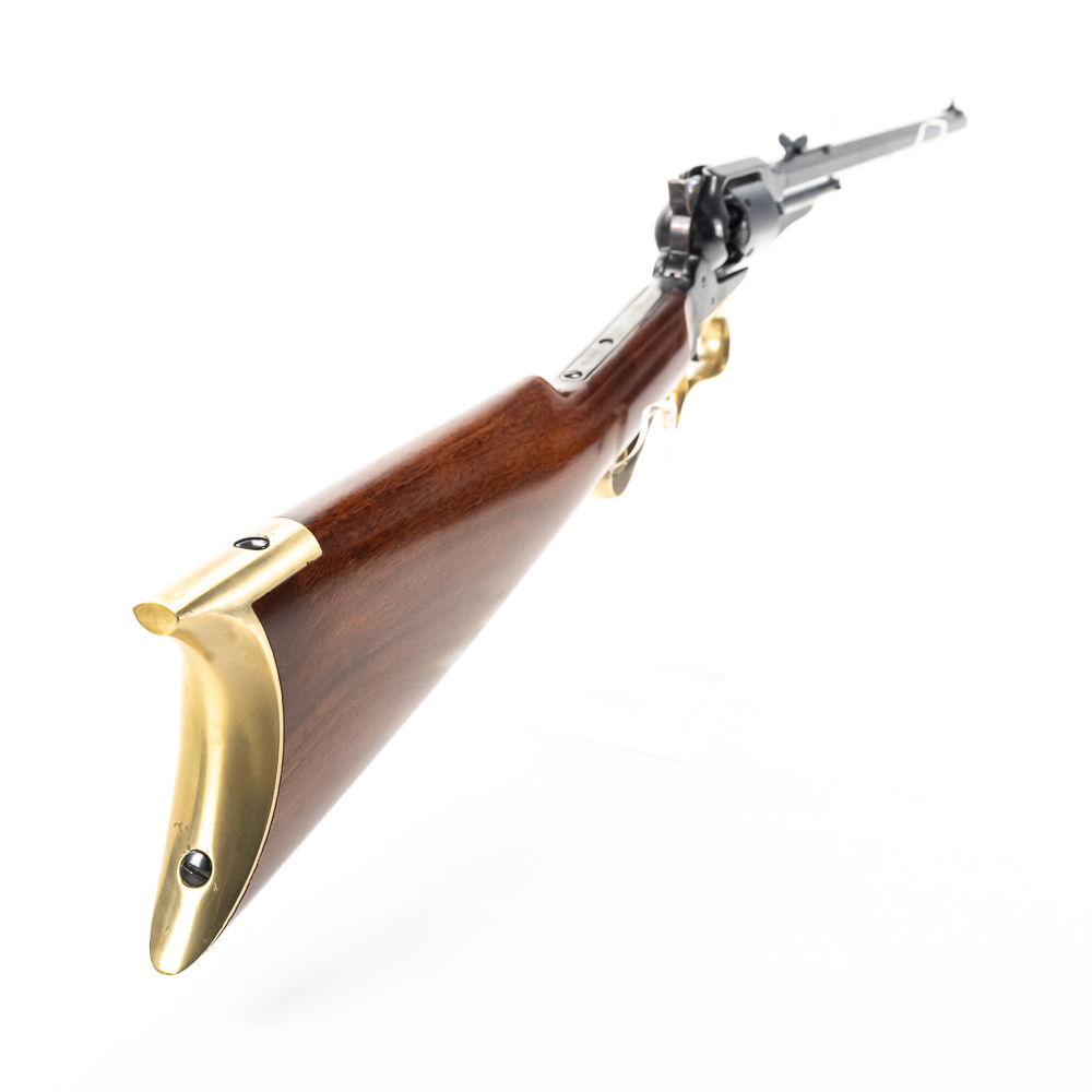 Uberti 1858 New Army Revolving Carbine. Caliber .44 Black Powder. Fine Italian made replica of 1858 Remington New Army Revolving Carbine Model. Rifle is like new in box and appears to be unfired with only a minor cylinder ring from handling. Very neat display or collector firearm for Clint Eastwood fans. See photos.