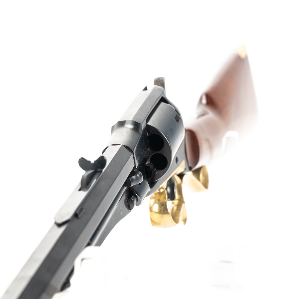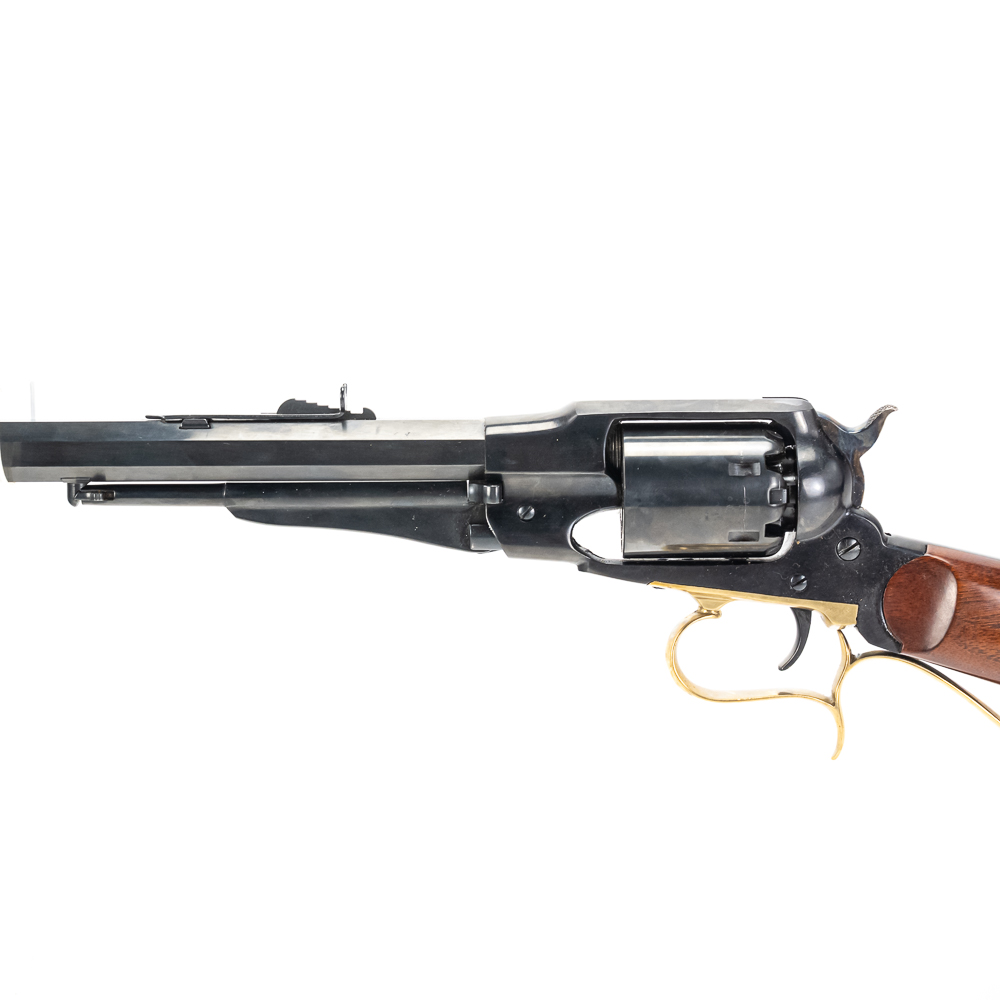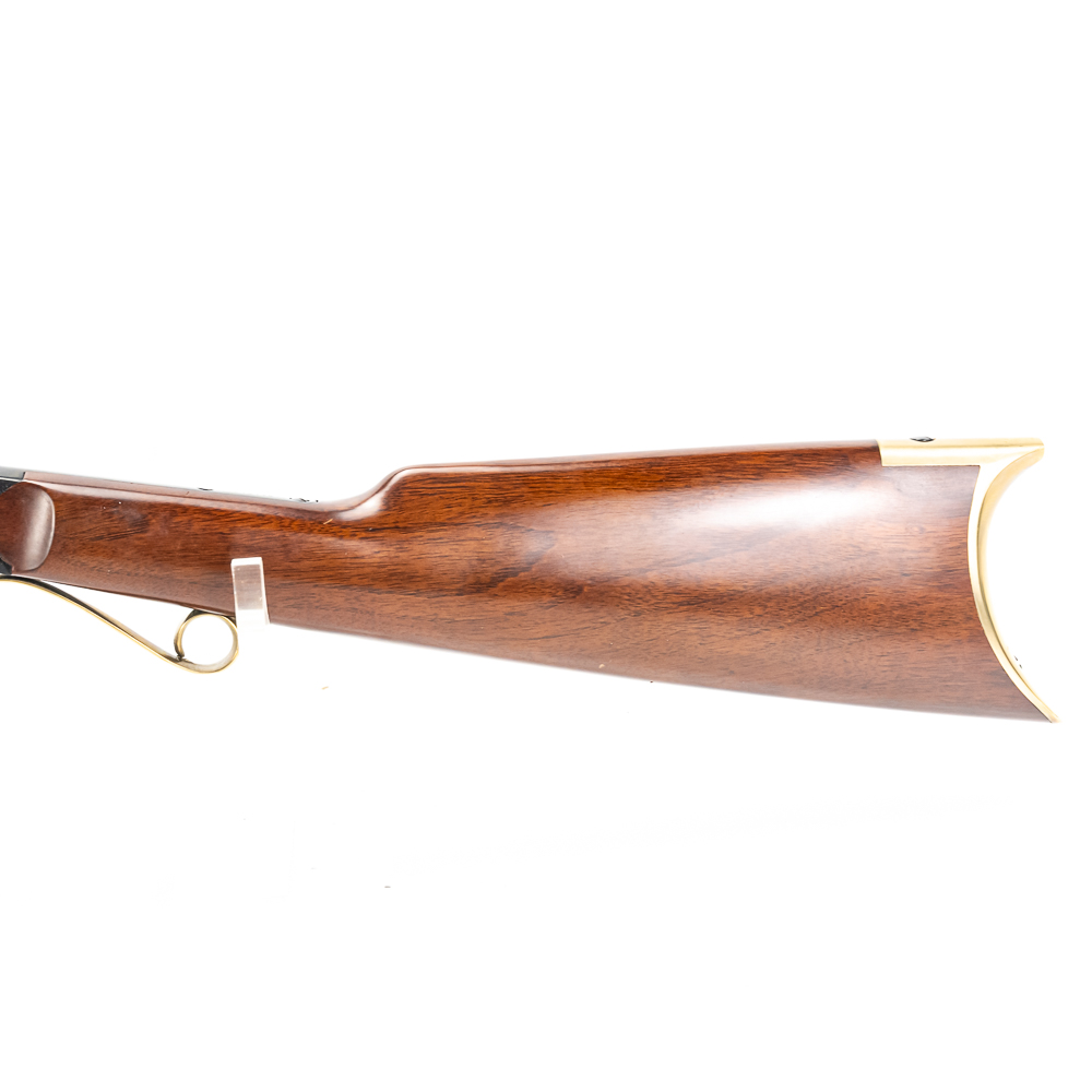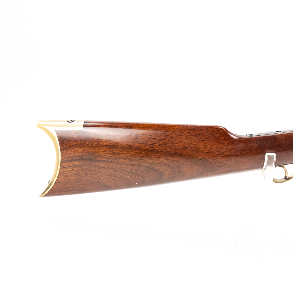 Uberti 1858 New Army Revolving Carbine. Caliber .44 Black Powder. Fine Italian made replica of 1858 Remington New Army Revolving Carbine Model. Rifle is like new in box and appears to be unfired with only a minor cylinder ring from handling. Very neat display or collector firearm for Clint Eastwood fans. See photos.
