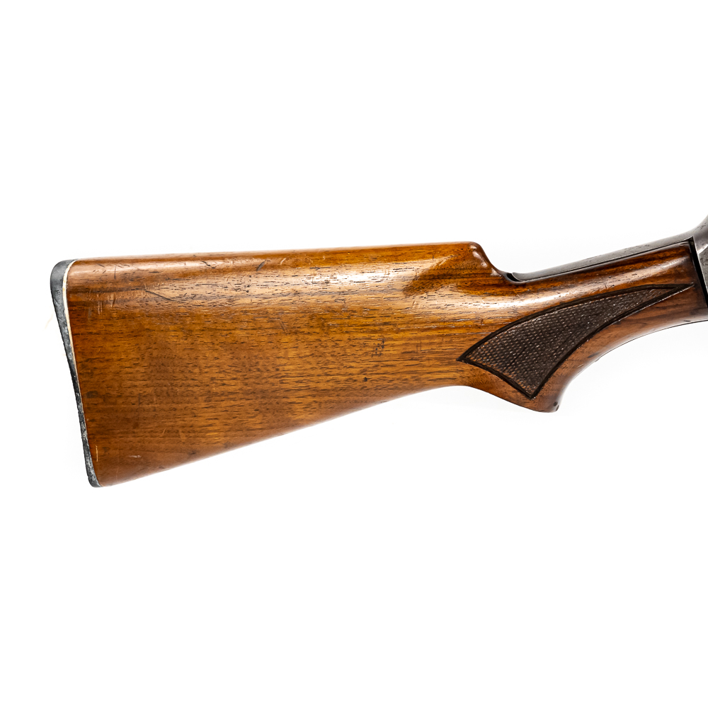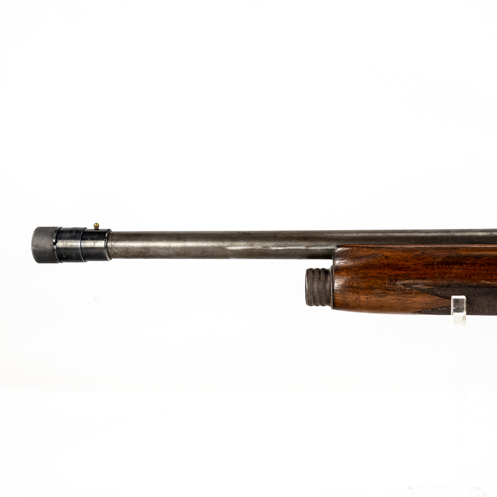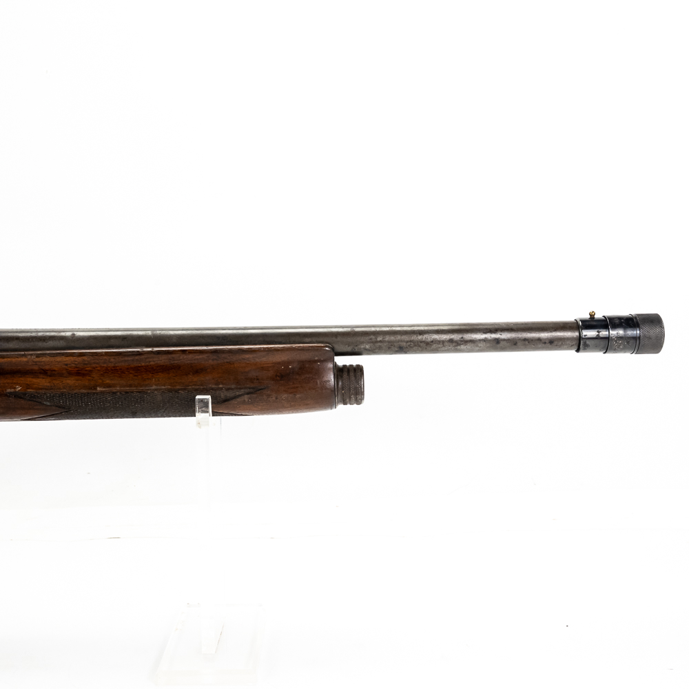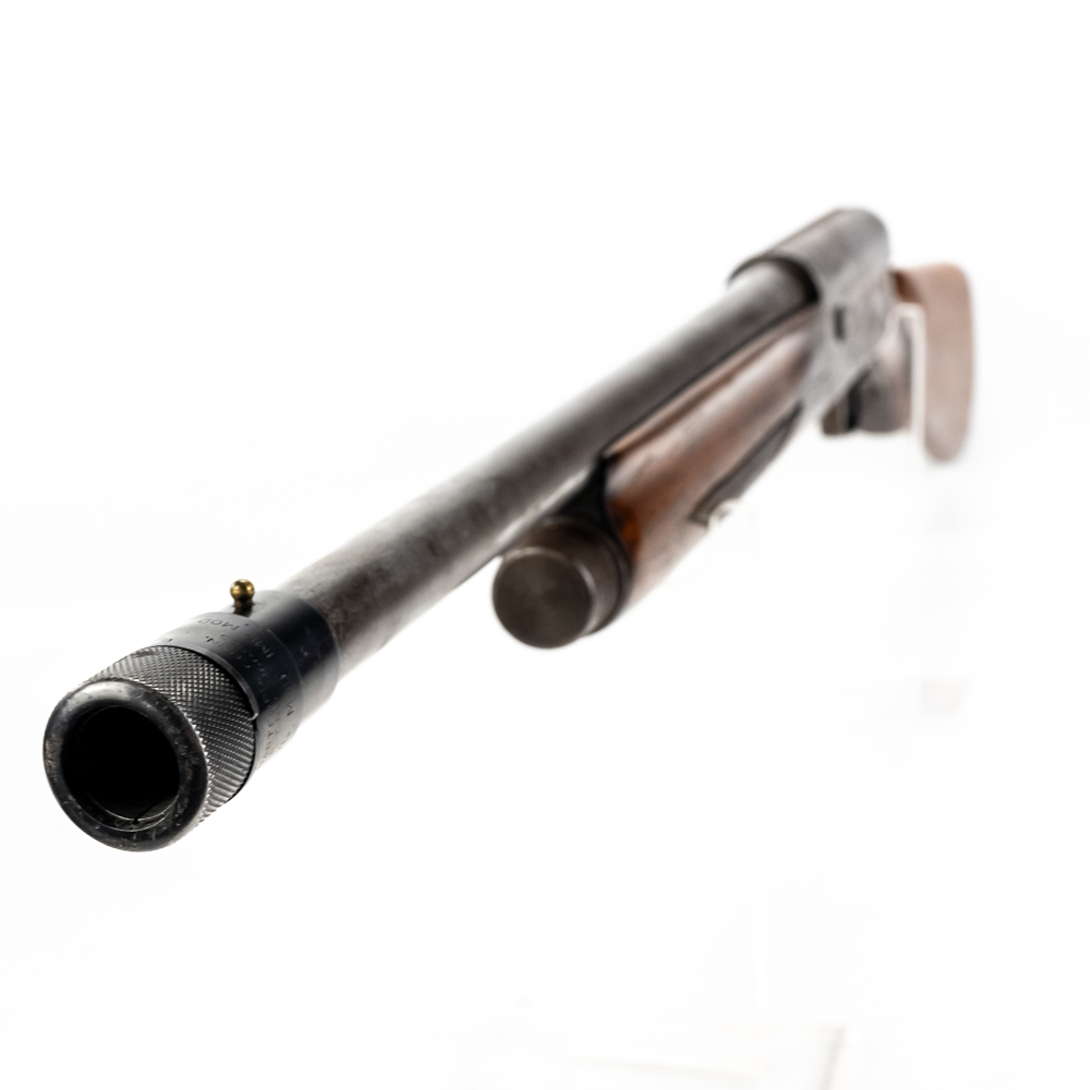 US military proof marked Remington M11 Factory Riot shotgun. Caliber 12ga. Factory cylinder bore marked barrel and receiver both have US Flaming bomb inspection marks. Wood is presumed to be original but may be replacement due to being rolled checkering style. Shotgun has been modified post war by having a PolyChoke added to end of barrel for hunting use. Still very nice representative of WW2 Issued shotgun that was given another life as a hunting gun. Gun’s finish is well worn with frosting and pitting from years of use. Wood is cracked on forend as is common, and stock has shrank from drying out and has replacement buttplate. Good start to a military collection. See photos.