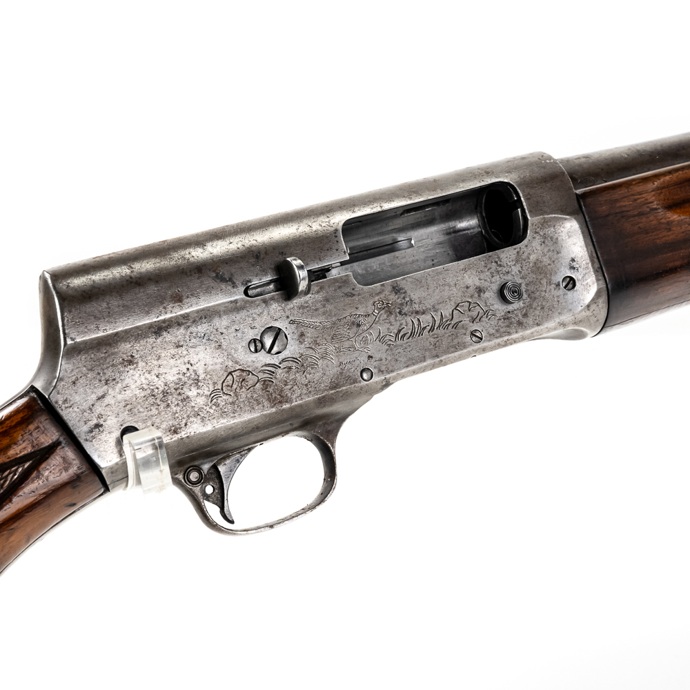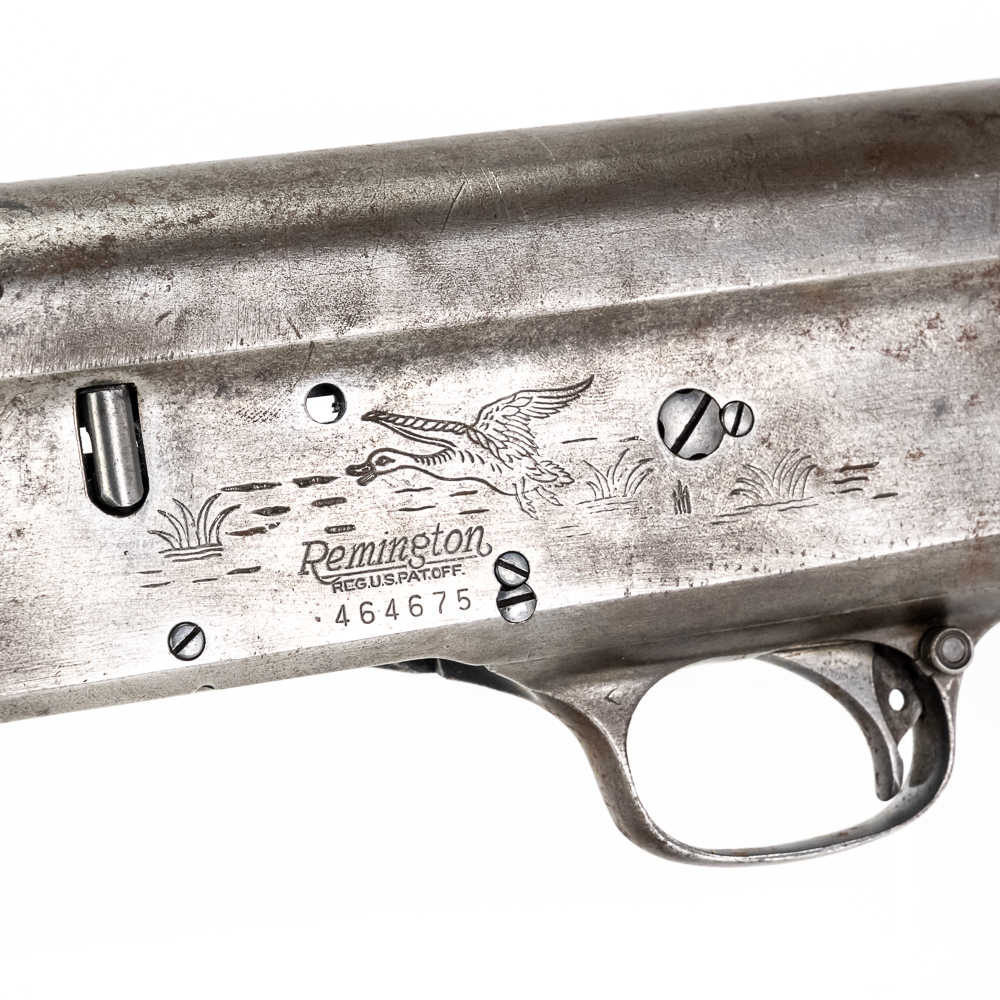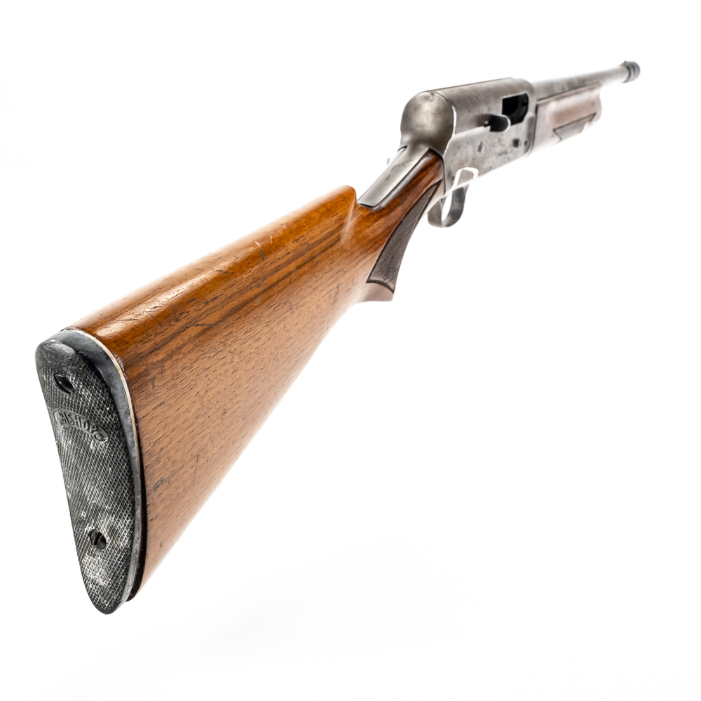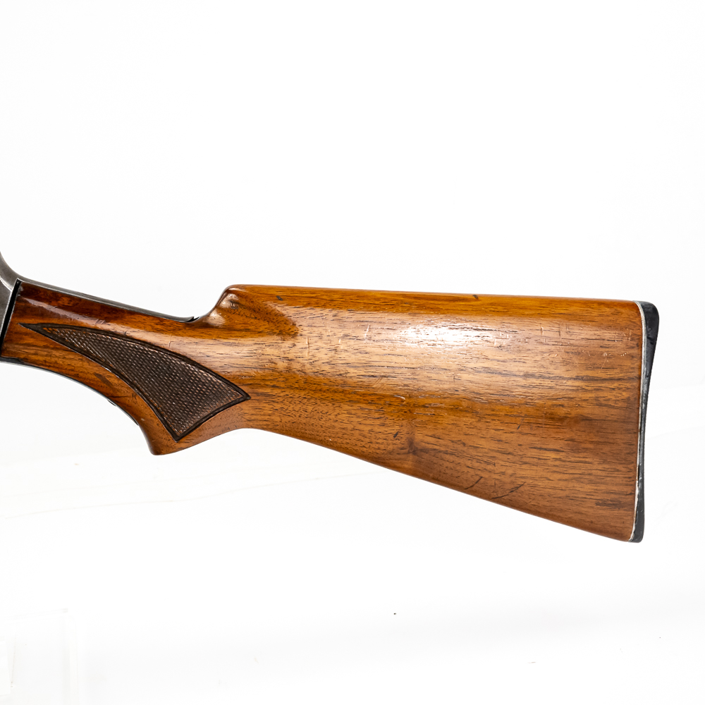 US military proof marked Remington M11 Factory Riot shotgun. Caliber 12ga. Factory cylinder bore marked barrel and receiver both have US Flaming bomb inspection marks. Wood is presumed to be original but may be replacement due to being rolled checkering style. Shotgun has been modified post war by having a PolyChoke added to end of barrel for hunting use. Still very nice representative of WW2 Issued shotgun that was given another life as a hunting gun. Gun’s finish is well worn with frosting and pitting from years of use. Wood is cracked on forend as is common, and stock has shrank from drying out and has replacement buttplate. Good start to a military collection. See photos.