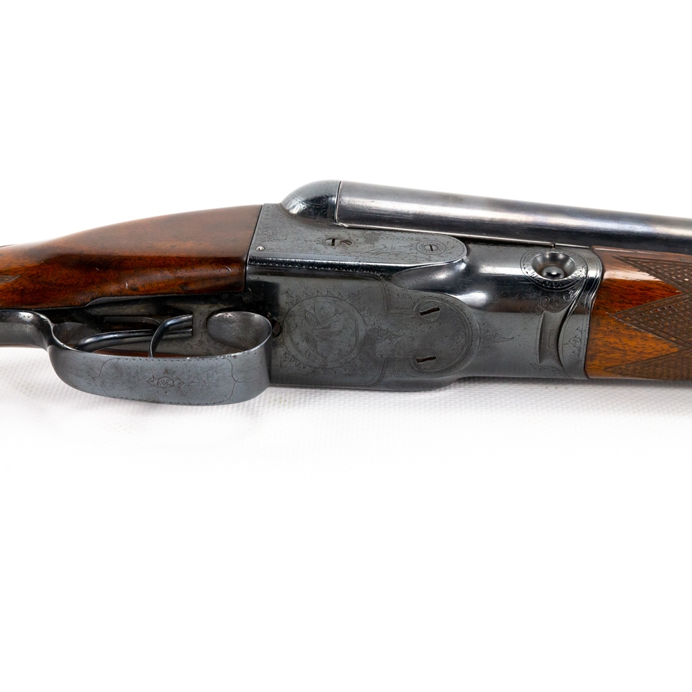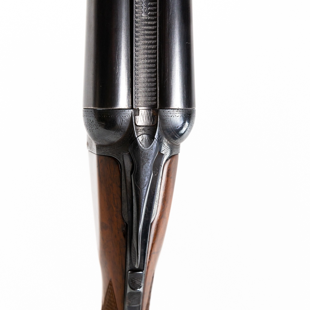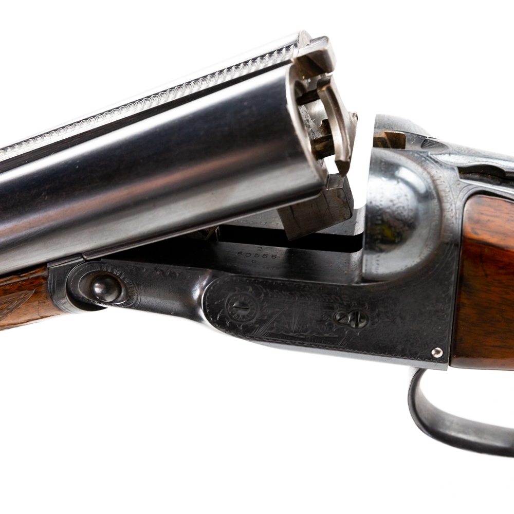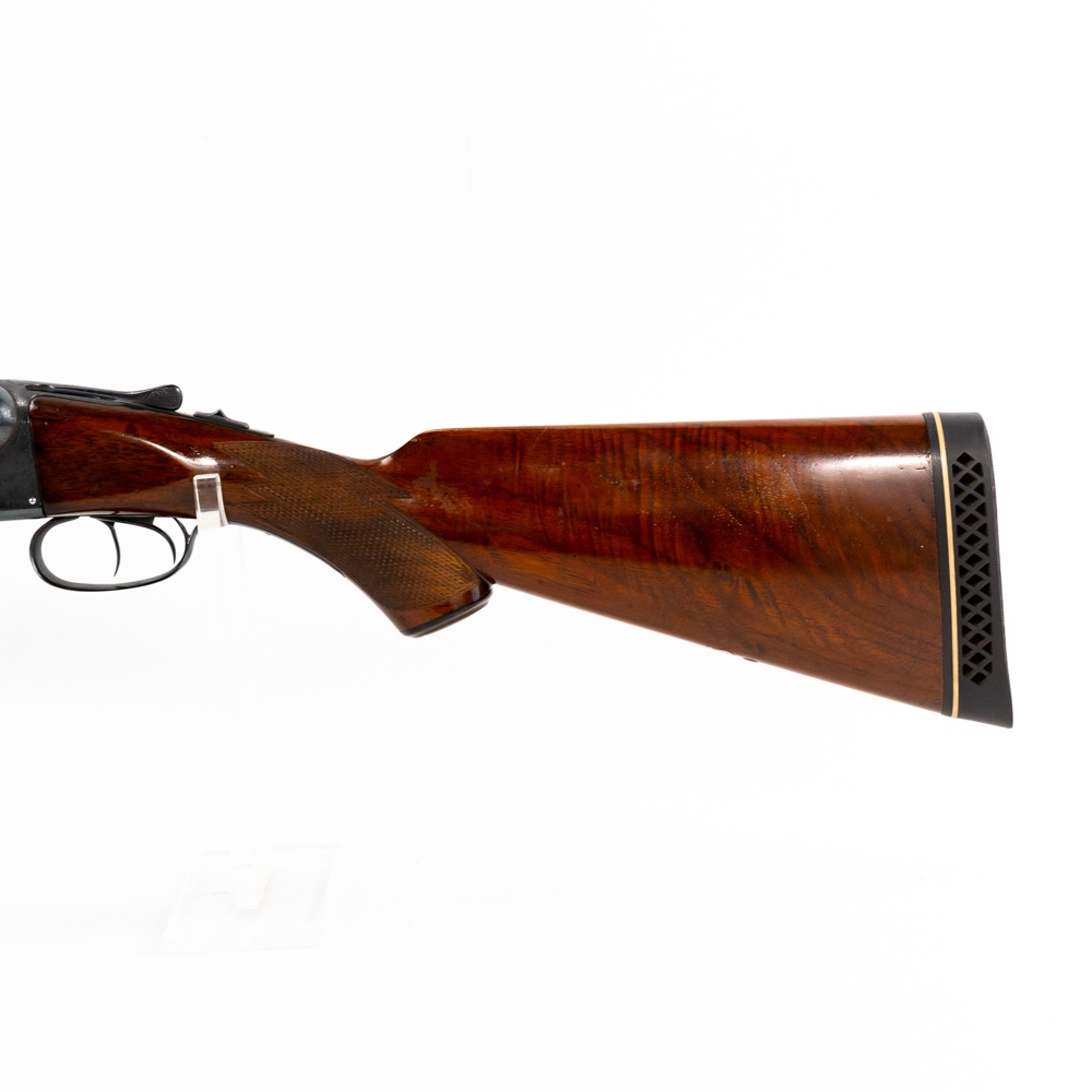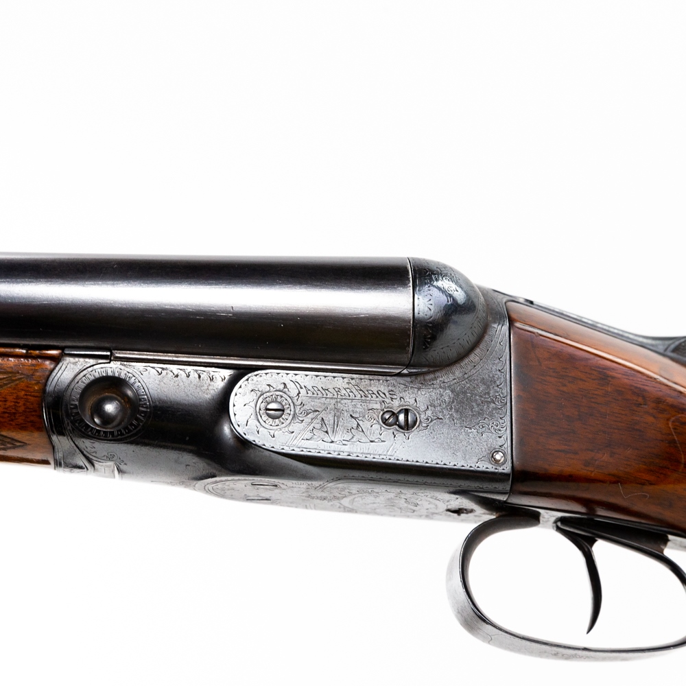 Parker GHD2 12g 27-1/4″ 14-1/2″LOP Hammerless Shotgun in good condition with some pitting, oxidation and dings. Gun was refinished and blued in the past and fitted with a Pachmayr recoil pad. Screws show some tool marks. Action is smooth and seems fully functional and the bore is shiny and smooth. Missing sling mount under barrels. Capped, pistol grip stock and double triggers.. CYL/CYL. Original barrels. MFG 1888 C&R Eligible S/N: 60556