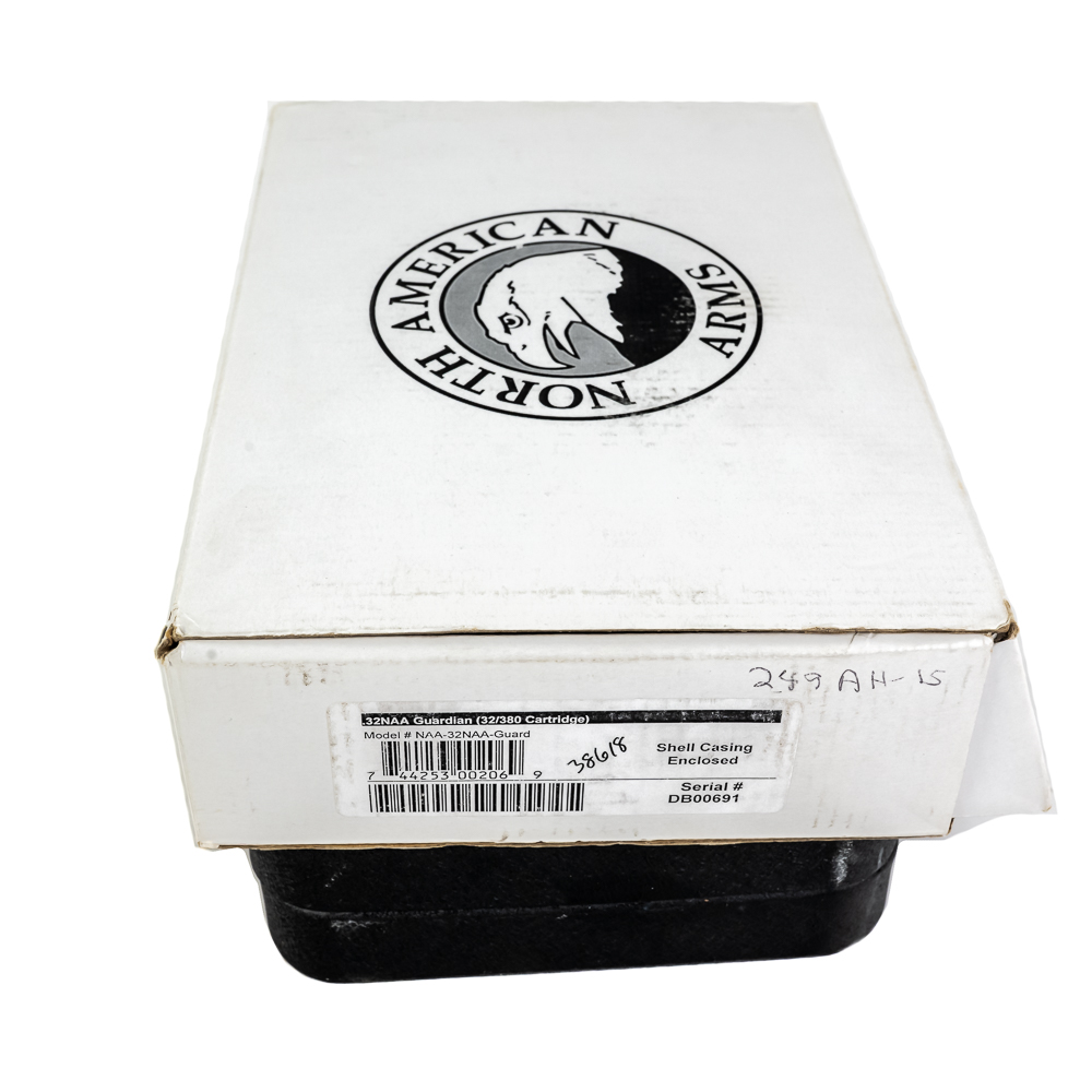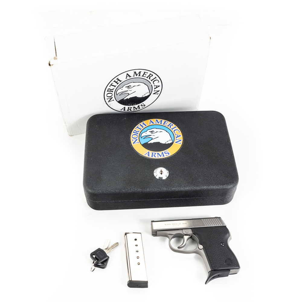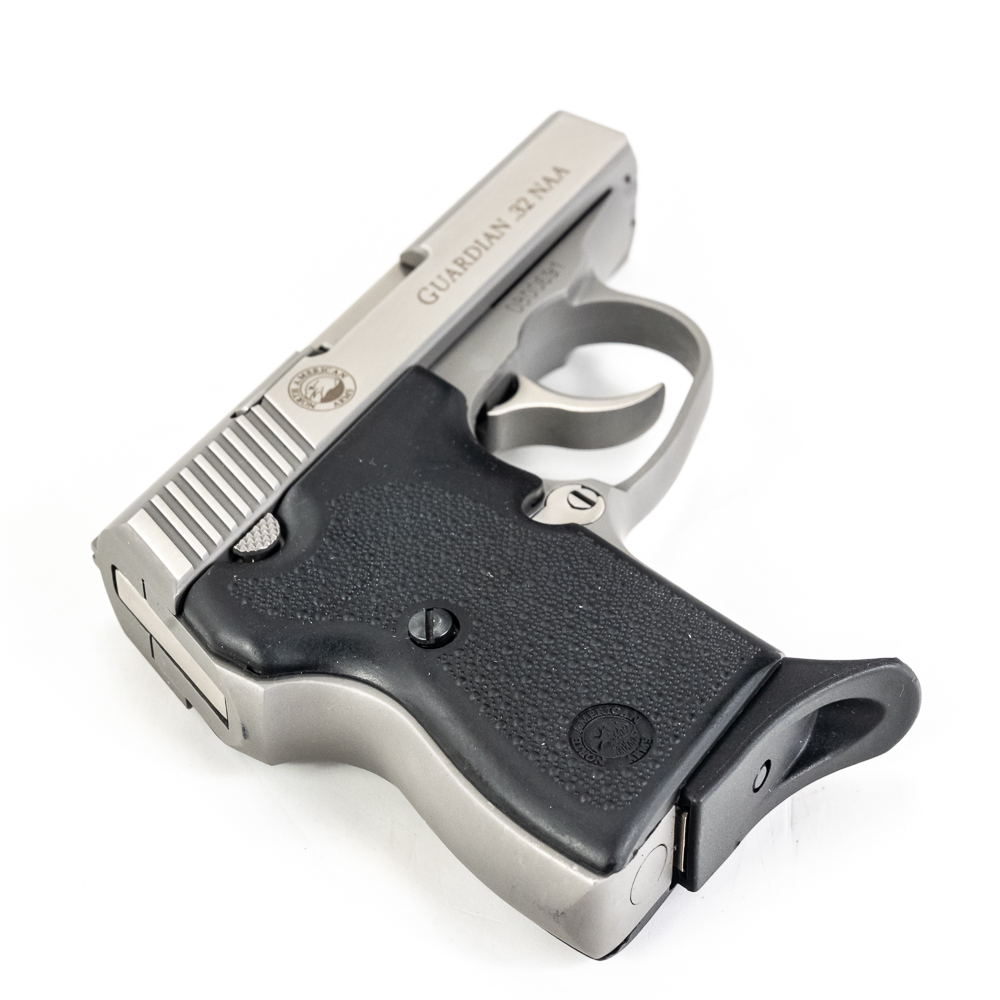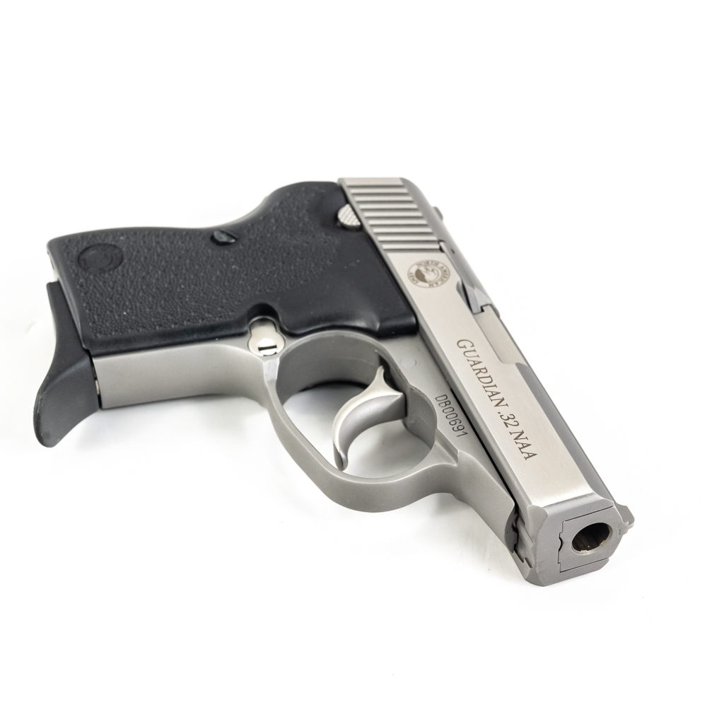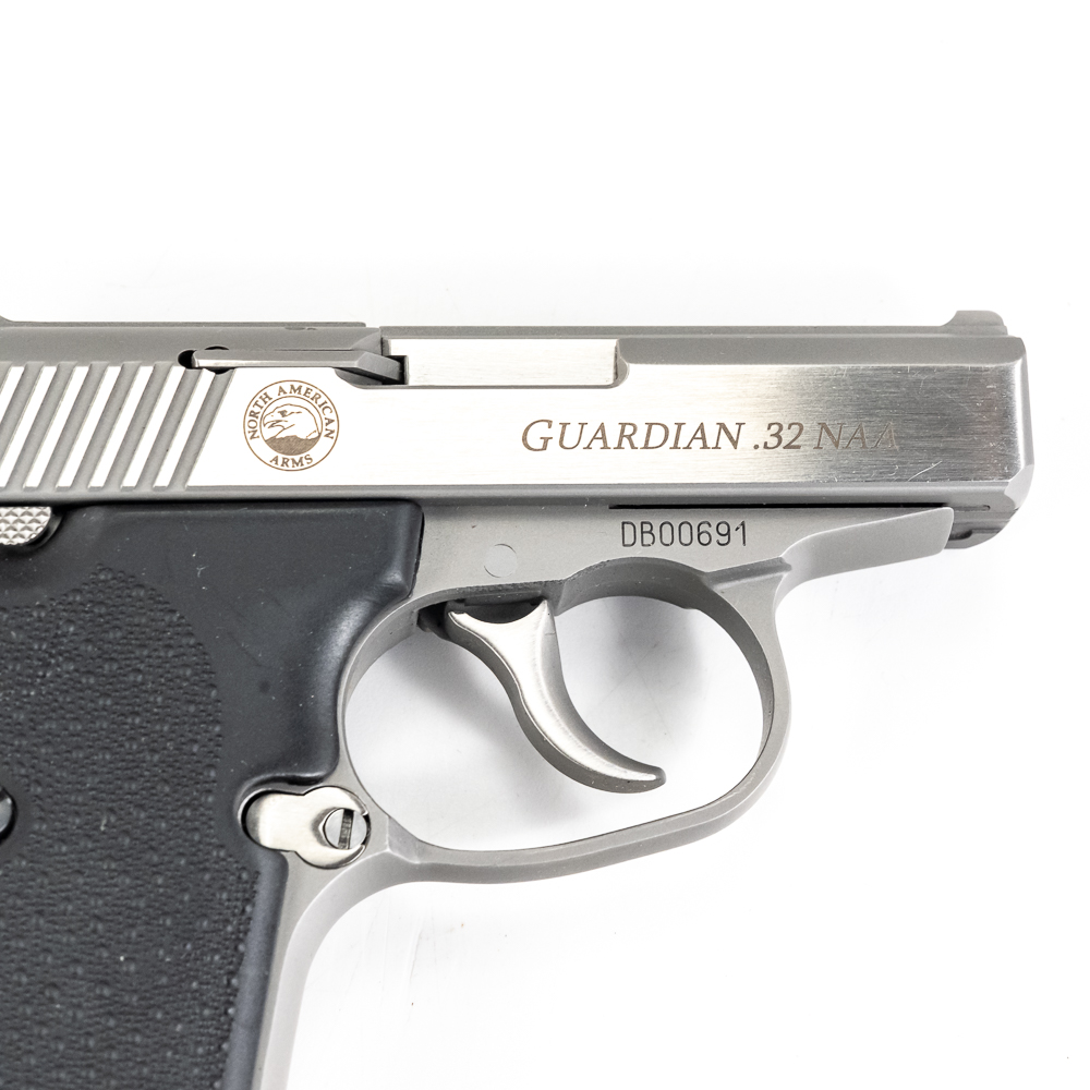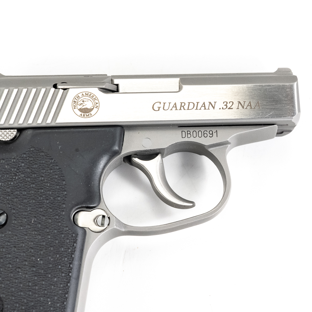 North American Arms Guardian pistol. Caliber .32NAA. Full stainless steel construction pocket pistol. Caliber is factory wildcat of .380ACP casing necked down with .32ACP bullet. Hard to find pistol was very limited production.Pistol is almost new in box with minor scratches from handling and use. Pistol comes with extra magazine and factory lockbox with keys. High quality pistol in interesting caliber. See Photos.