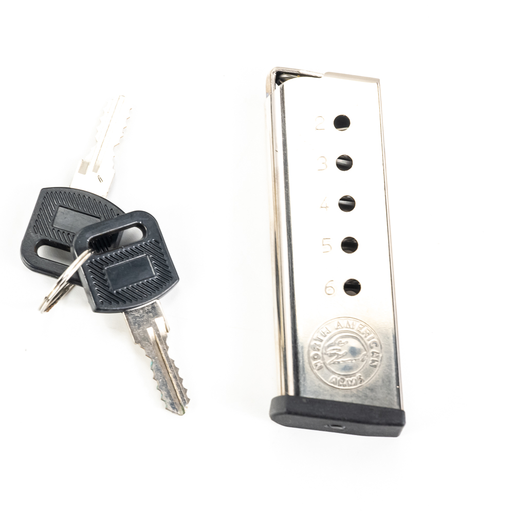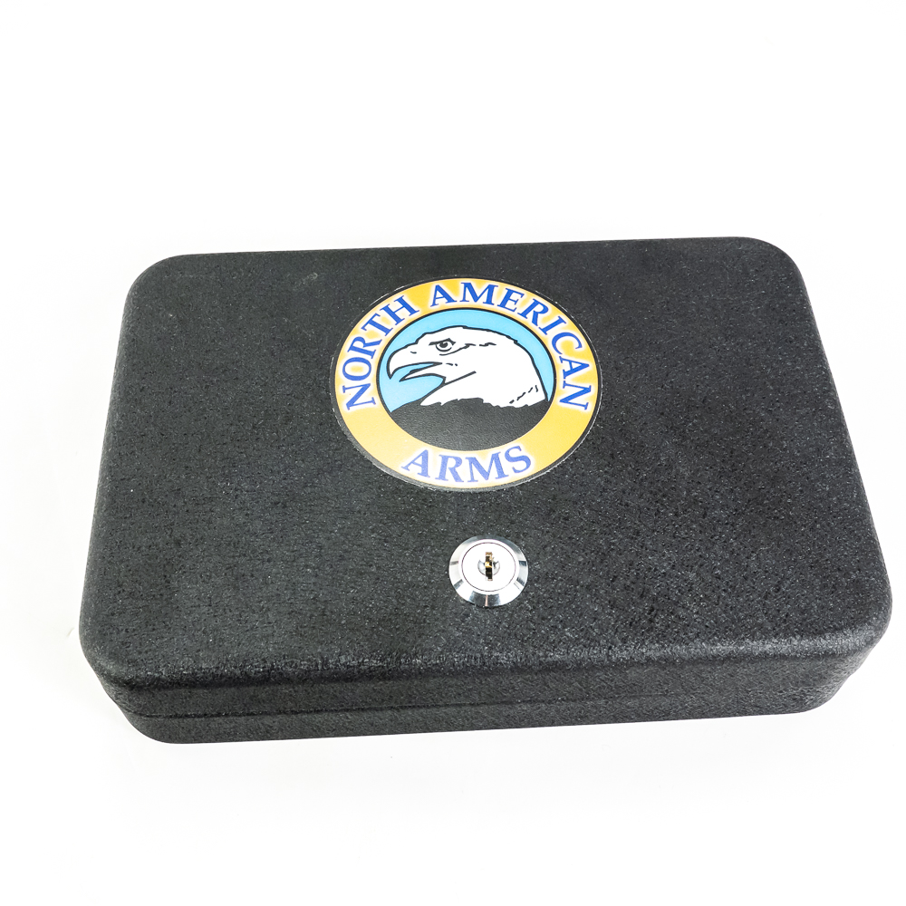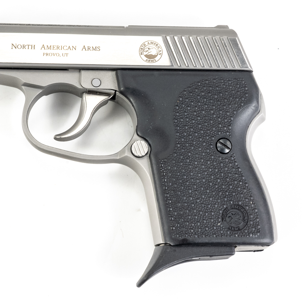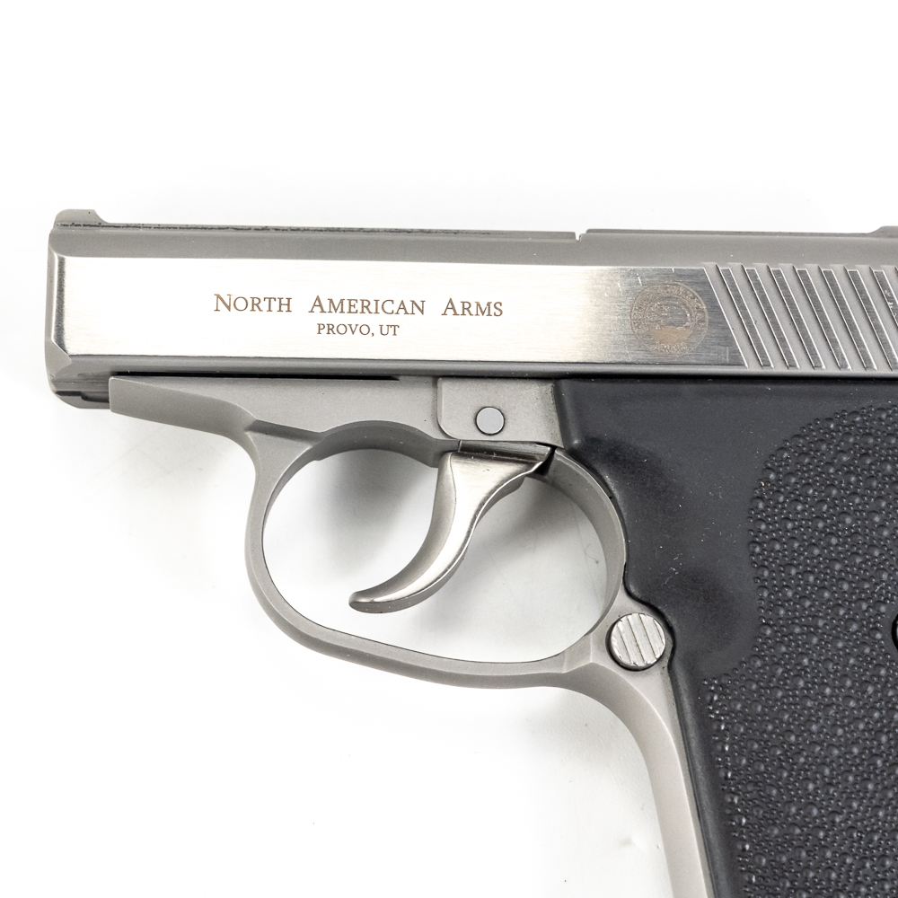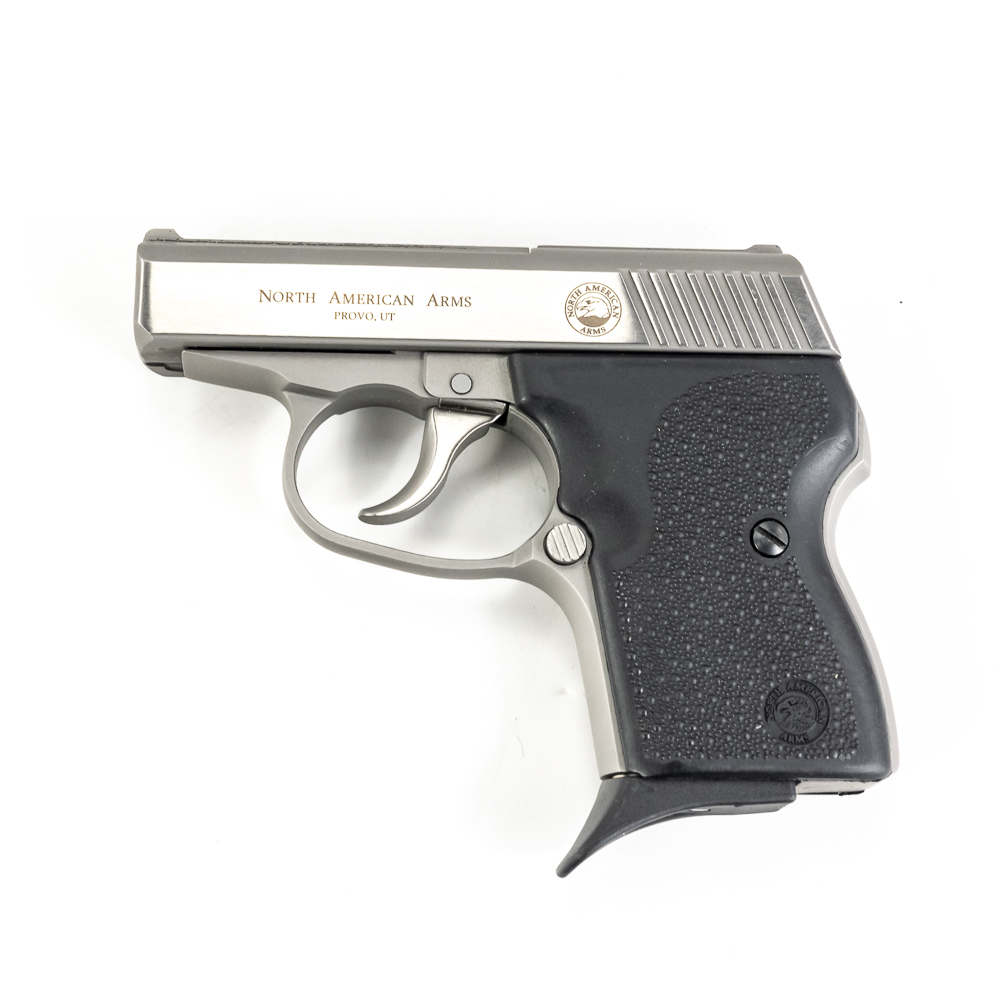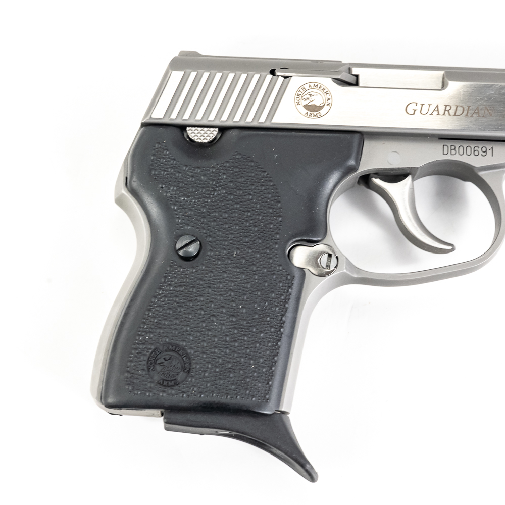 North American Arms Guardian pistol. Caliber .32NAA. Full stainless steel construction pocket pistol. Caliber is factory wildcat of .380ACP casing necked down with .32ACP bullet. Hard to find pistol was very limited production.Pistol is almost new in box with minor scratches from handling and use. Pistol comes with extra magazine and factory lockbox with keys. High quality pistol in interesting caliber. See Photos.