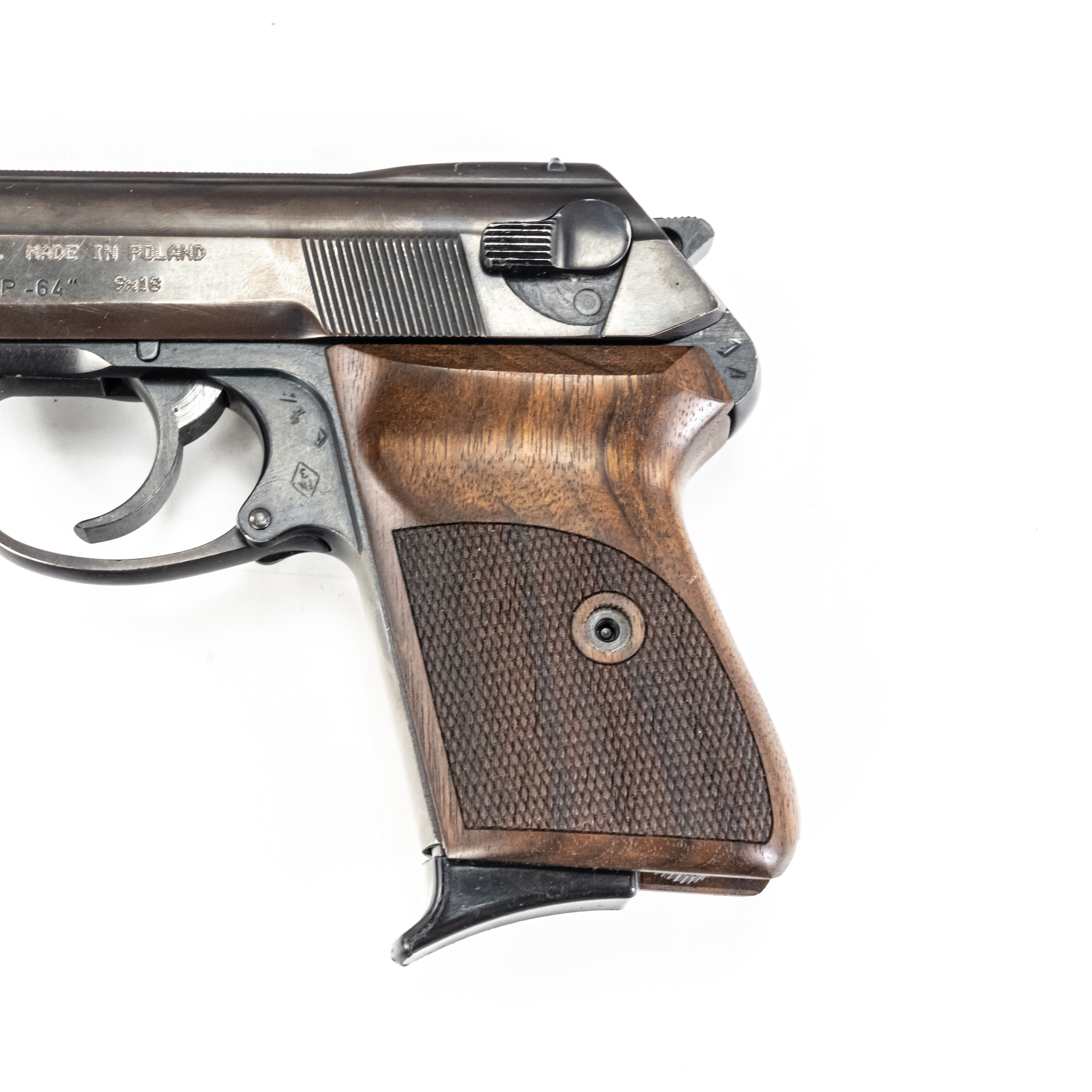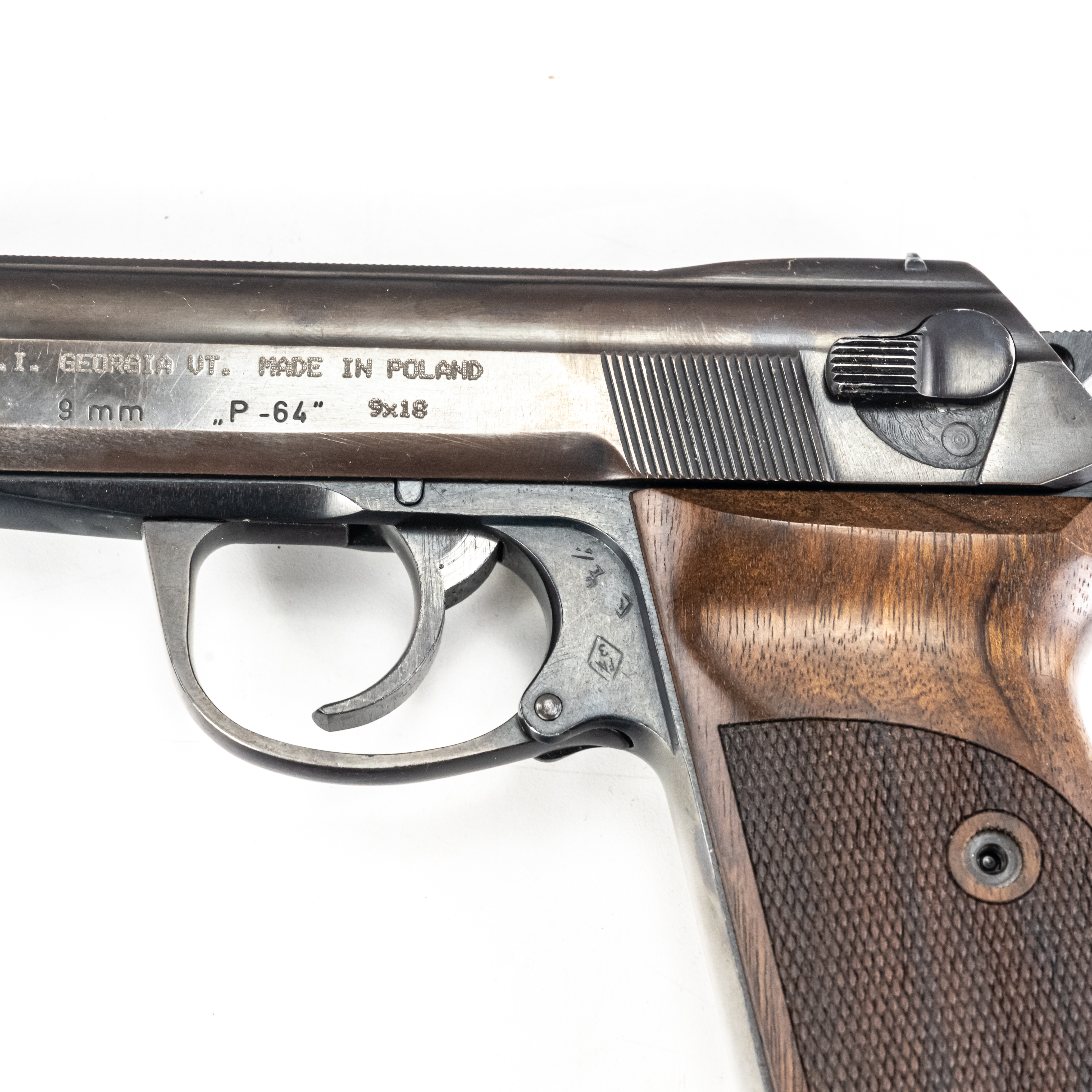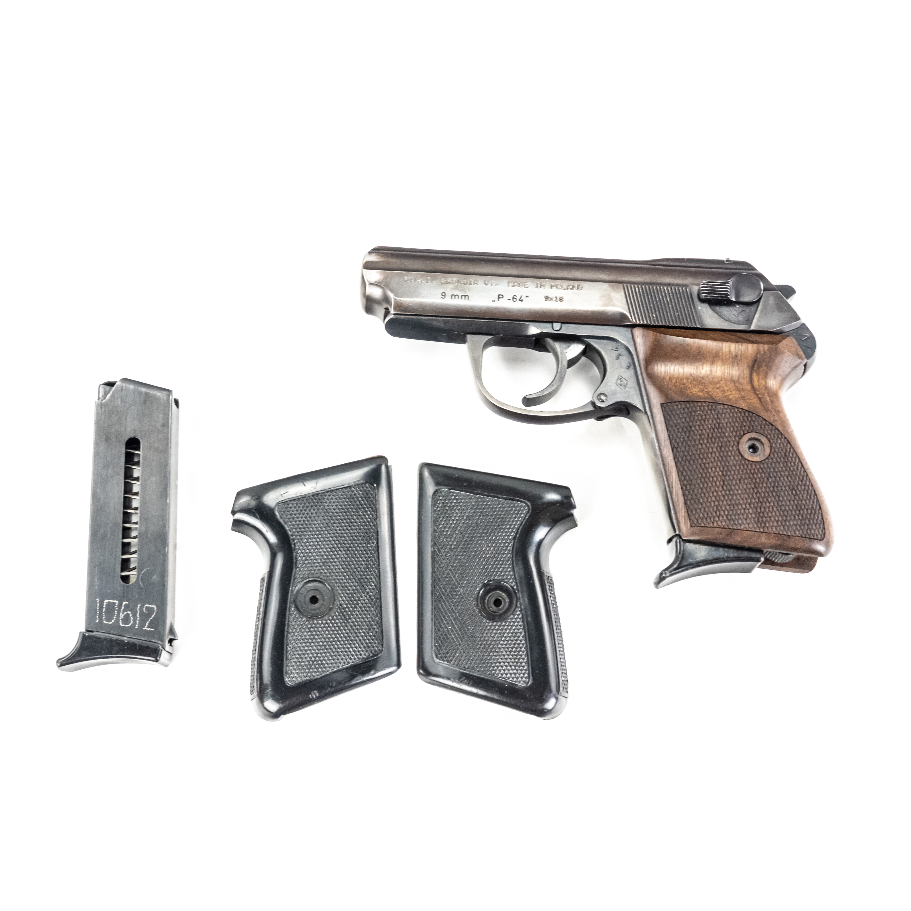 Polish P64 Pistol. Caliber 9mm Makarov. Polish military surplus pistol with Circle 11 Radom Proof. Century Arms import pistol is in very good surplus condition with some finish wear. Pistol comes with extra magazine and wood and plastic grips. Nice affordable cold war gun. See photos.
