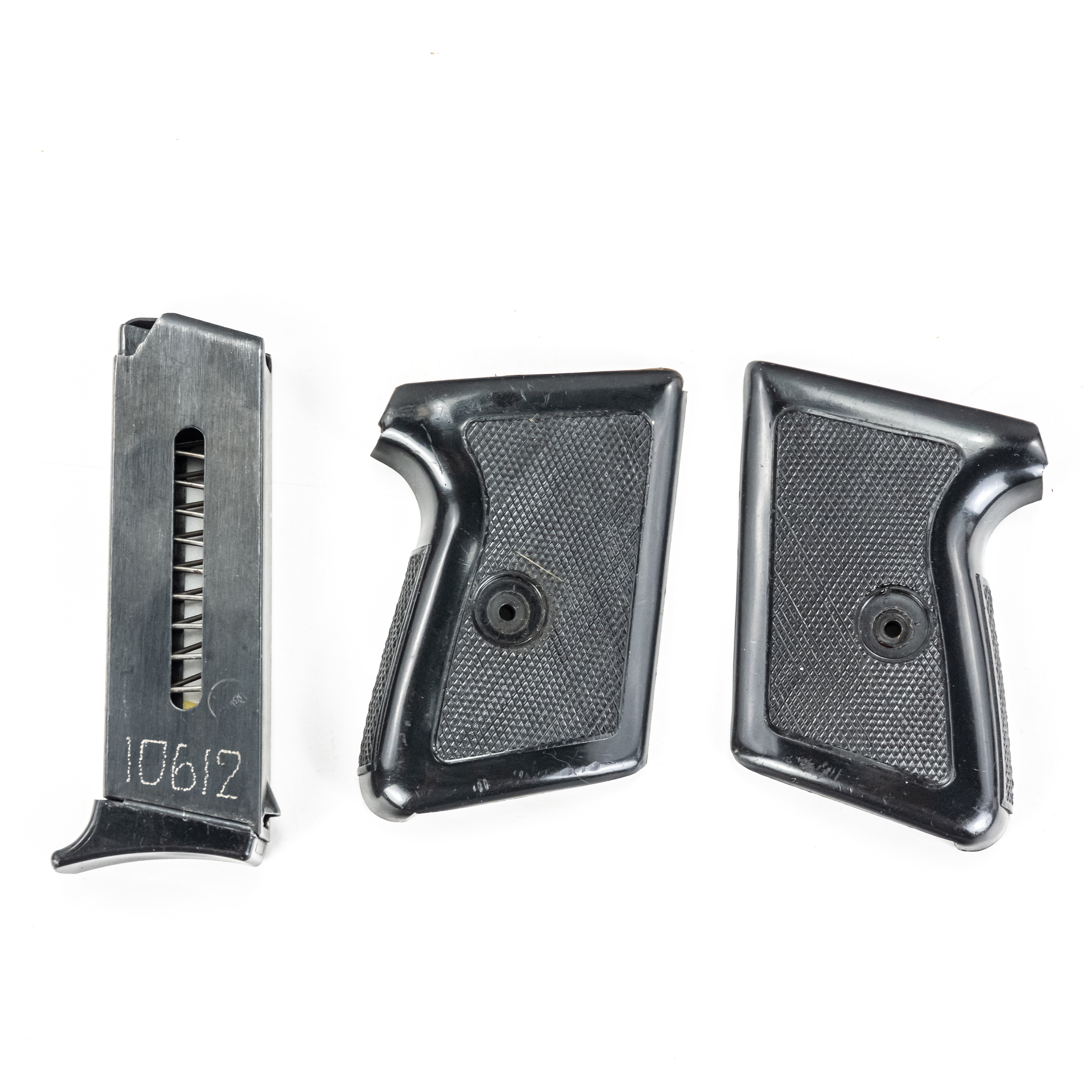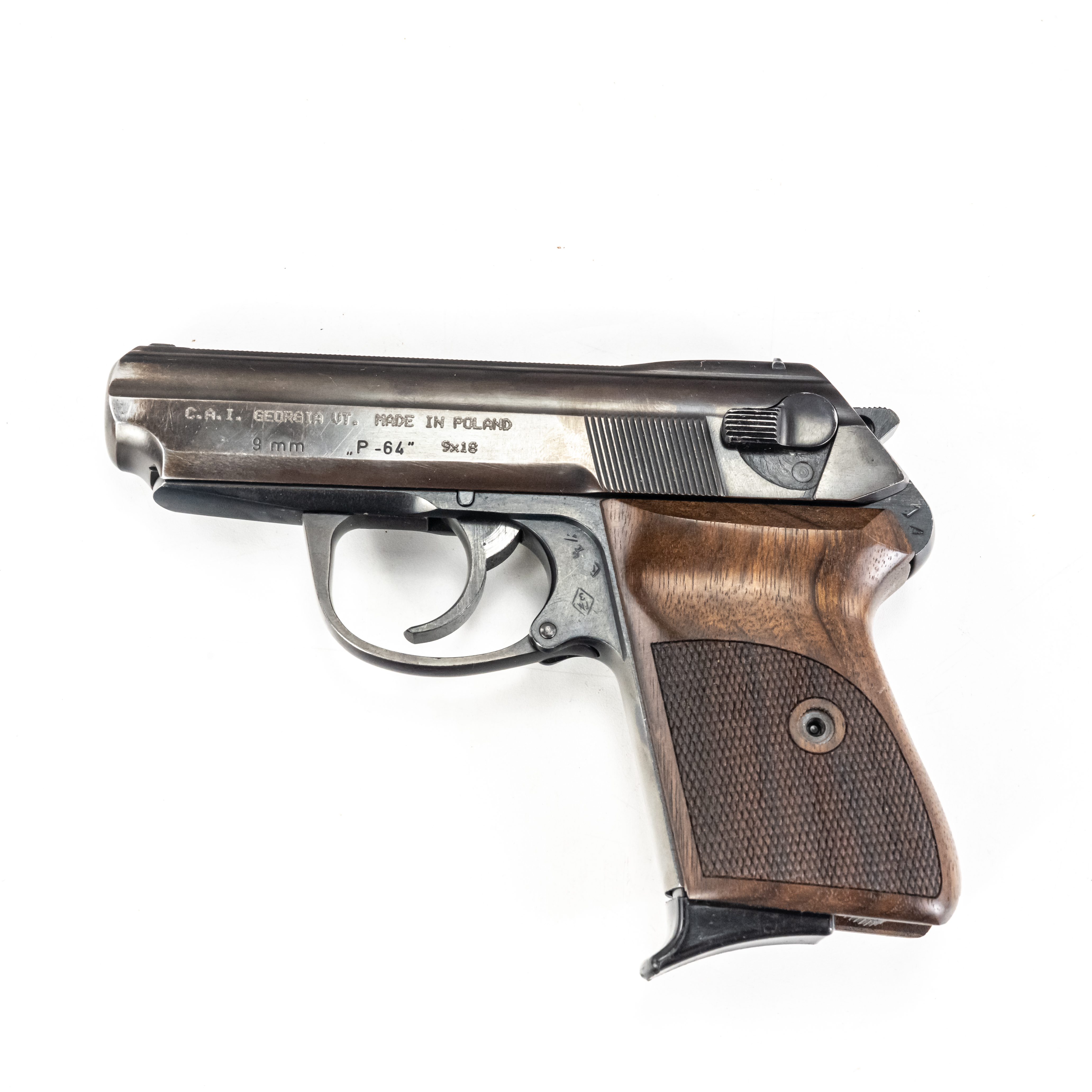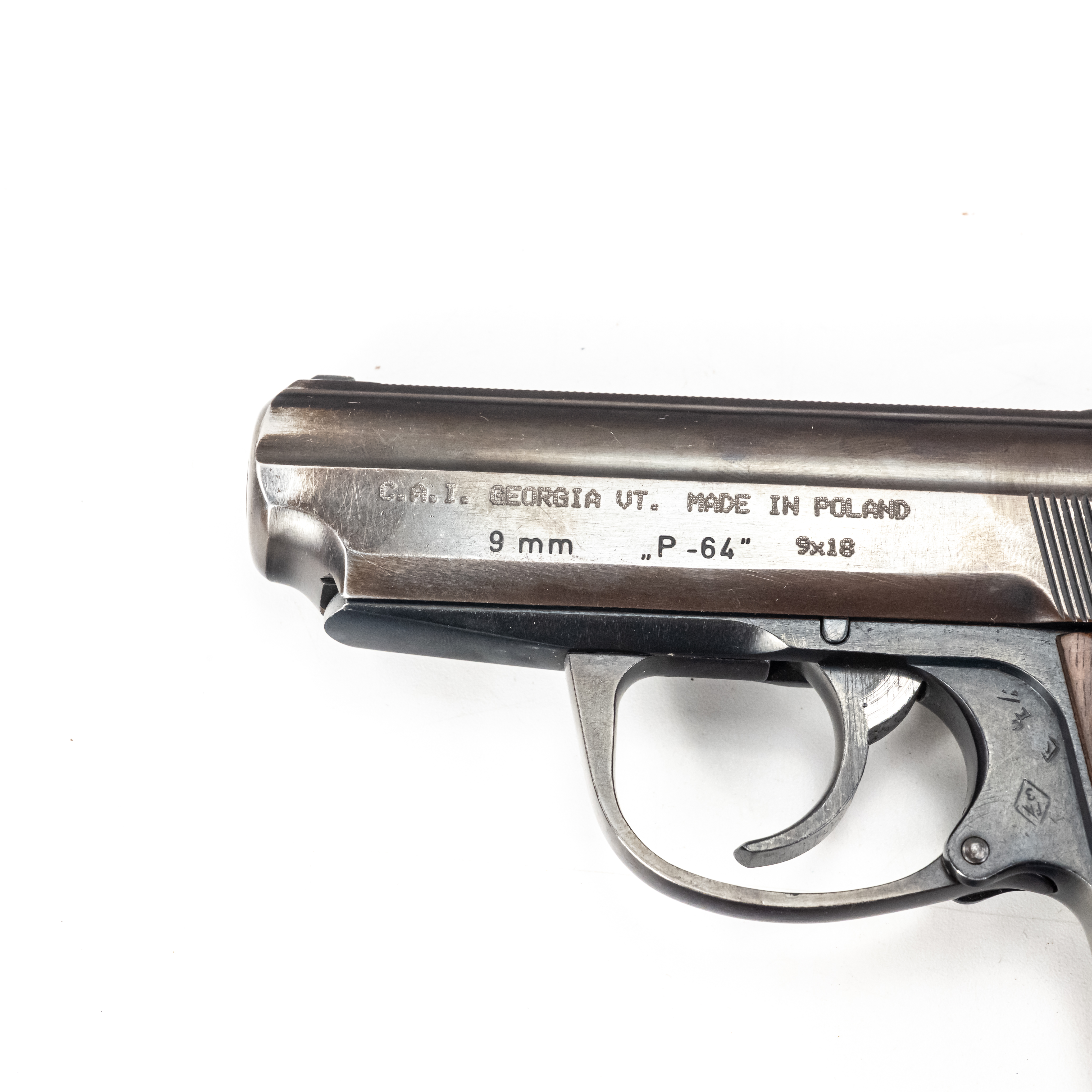 Polish P64 Pistol. Caliber 9mm Makarov. Polish military surplus pistol with Circle 11 Radom Proof. Century Arms import pistol is in very good surplus condition with some finish wear. Pistol comes with extra magazine and wood and plastic grips. Nice affordable cold war gun. See photos.