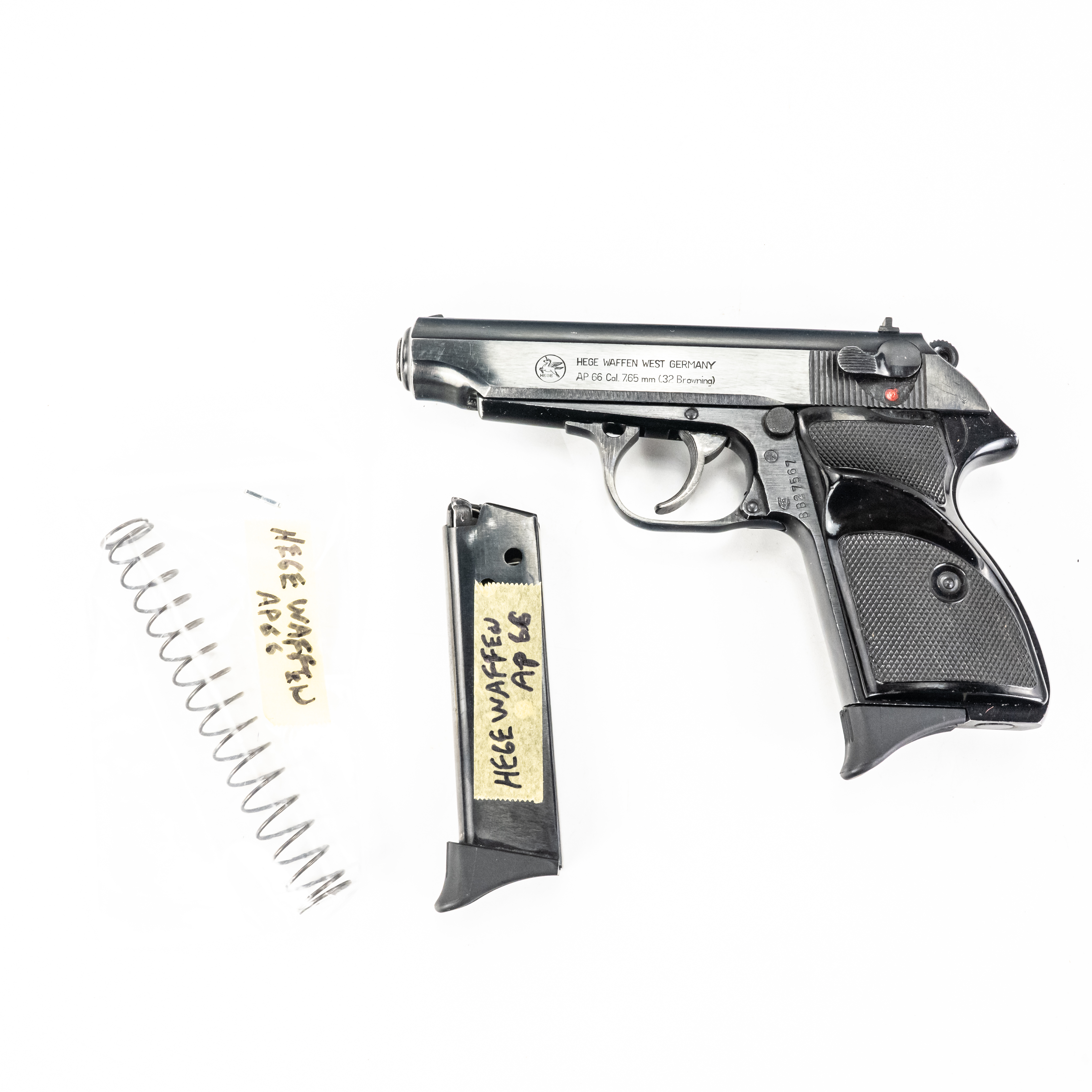 Hege Waffen model AP-66 Pistol. Caliber .32ACP/7.65mm. West German made copy of Walther PPK design. European police surplus pistol is in very good condition with only some finish wear and a few small rust spots. Pistol comes with extra magazine and mainspring. Nice, slim carry gun. See photos.
