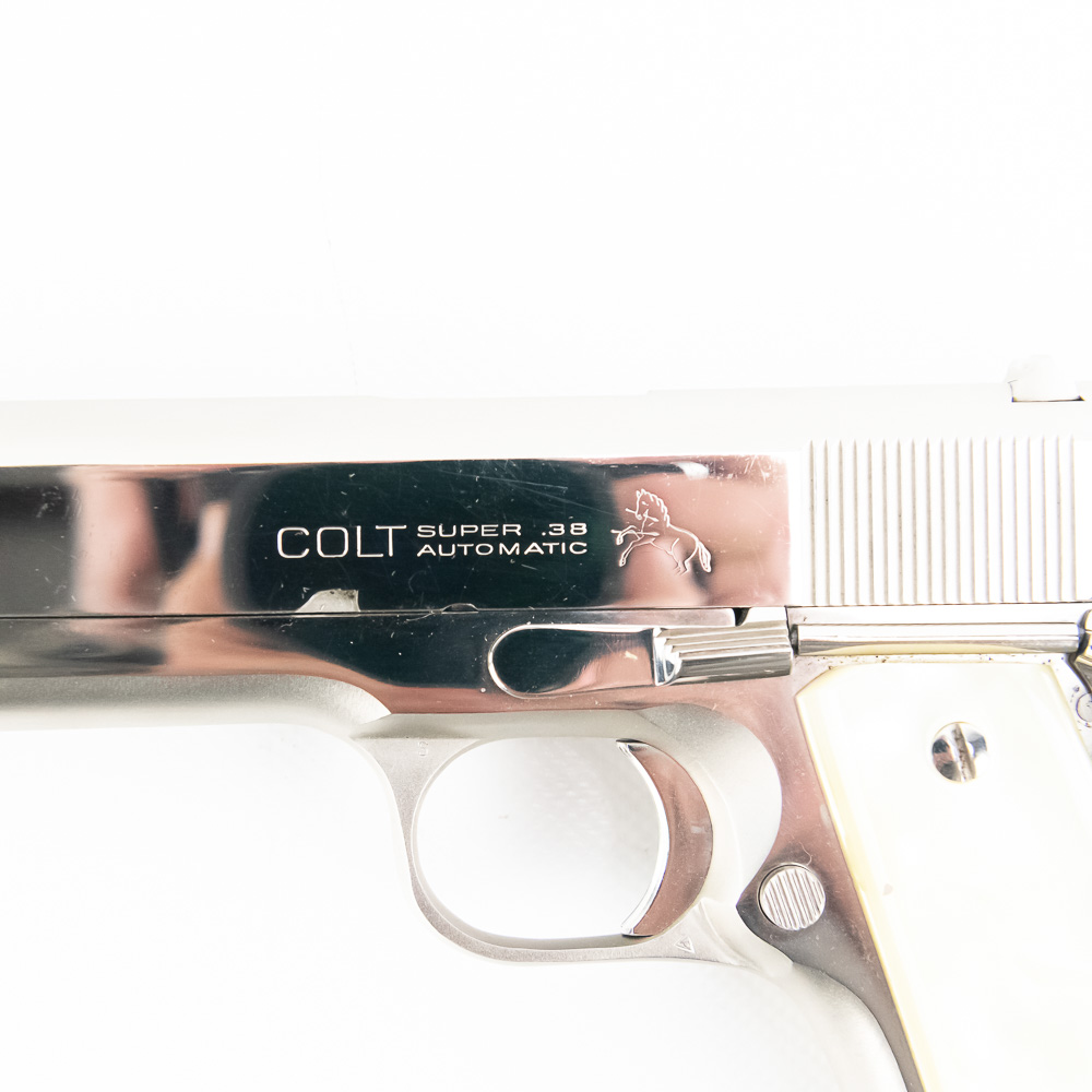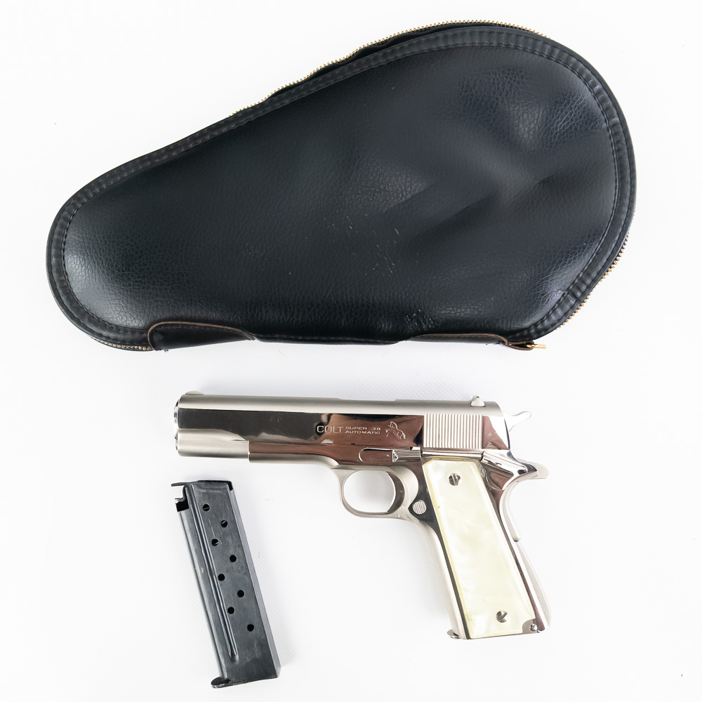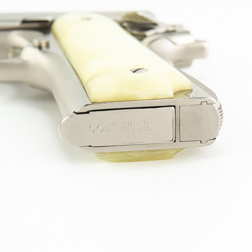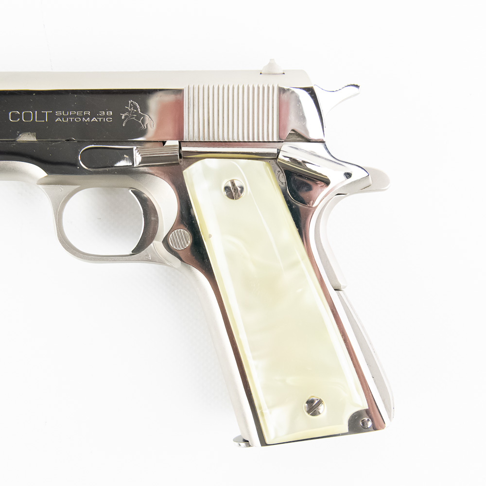 1966 Production Colt model 1911 pistol. Caliber .38 Super Auto. Factory Nickel Plated finish is in excellent condition with only minor scratches. Mother of Pearl Grips are similar condition and have past owners name ink-stamped on inside of right panel. Pistol comes with 1 extra magazine and zipper case. Extremely hard to find and desirable collector gun. See photos.
