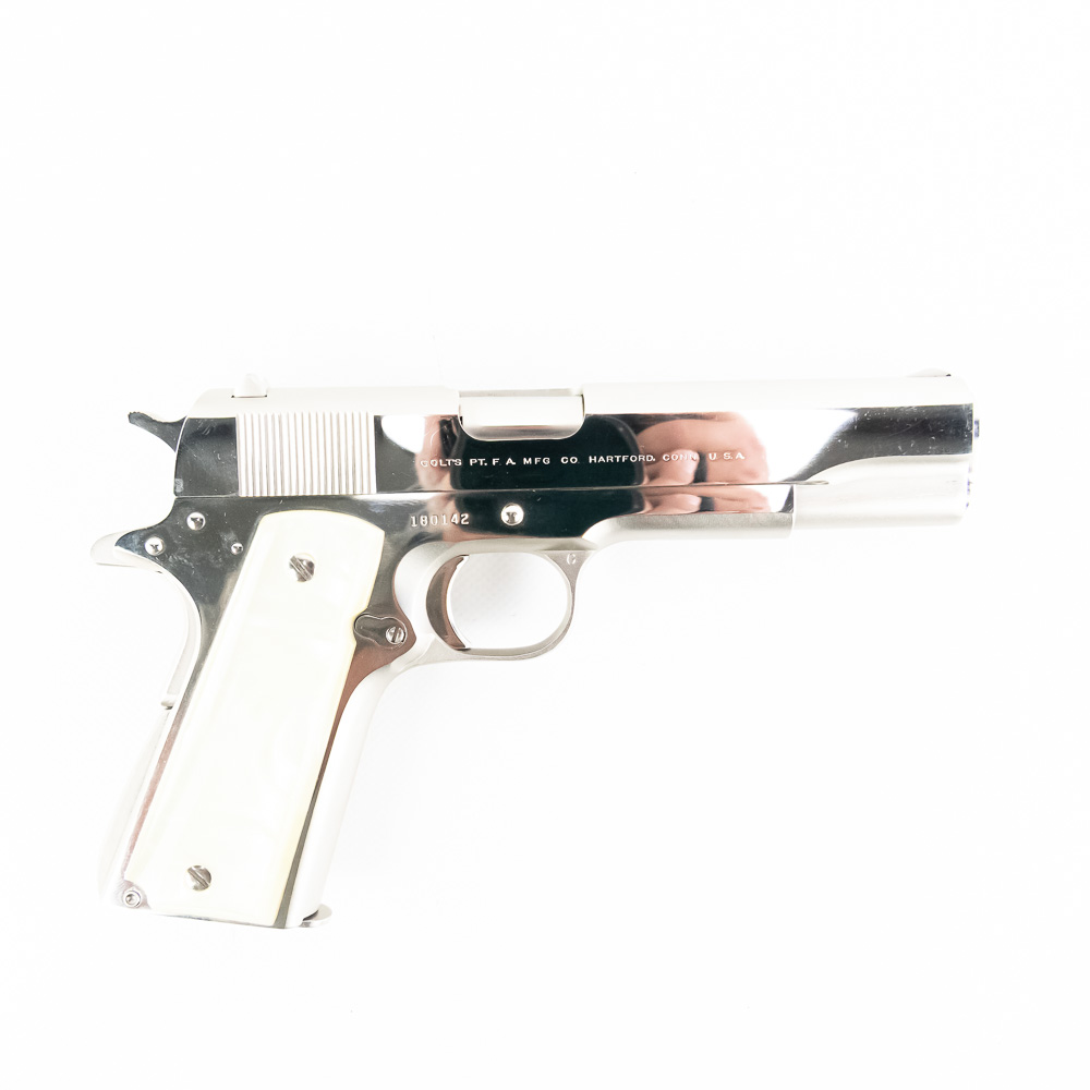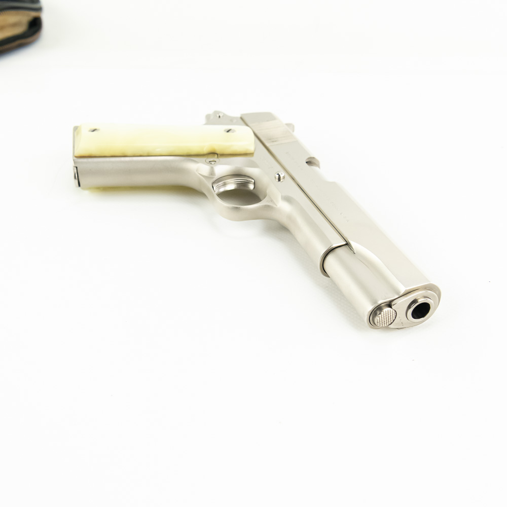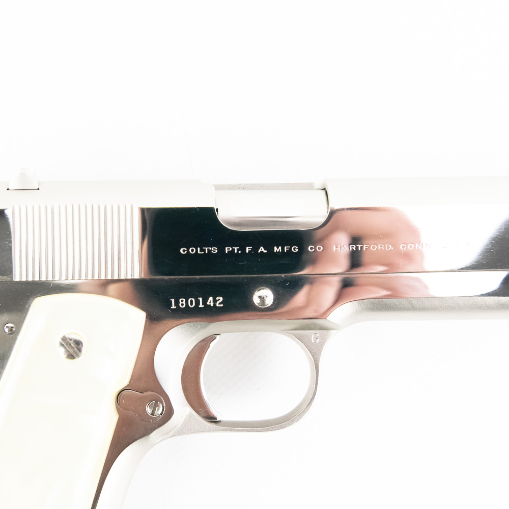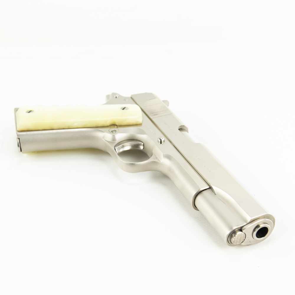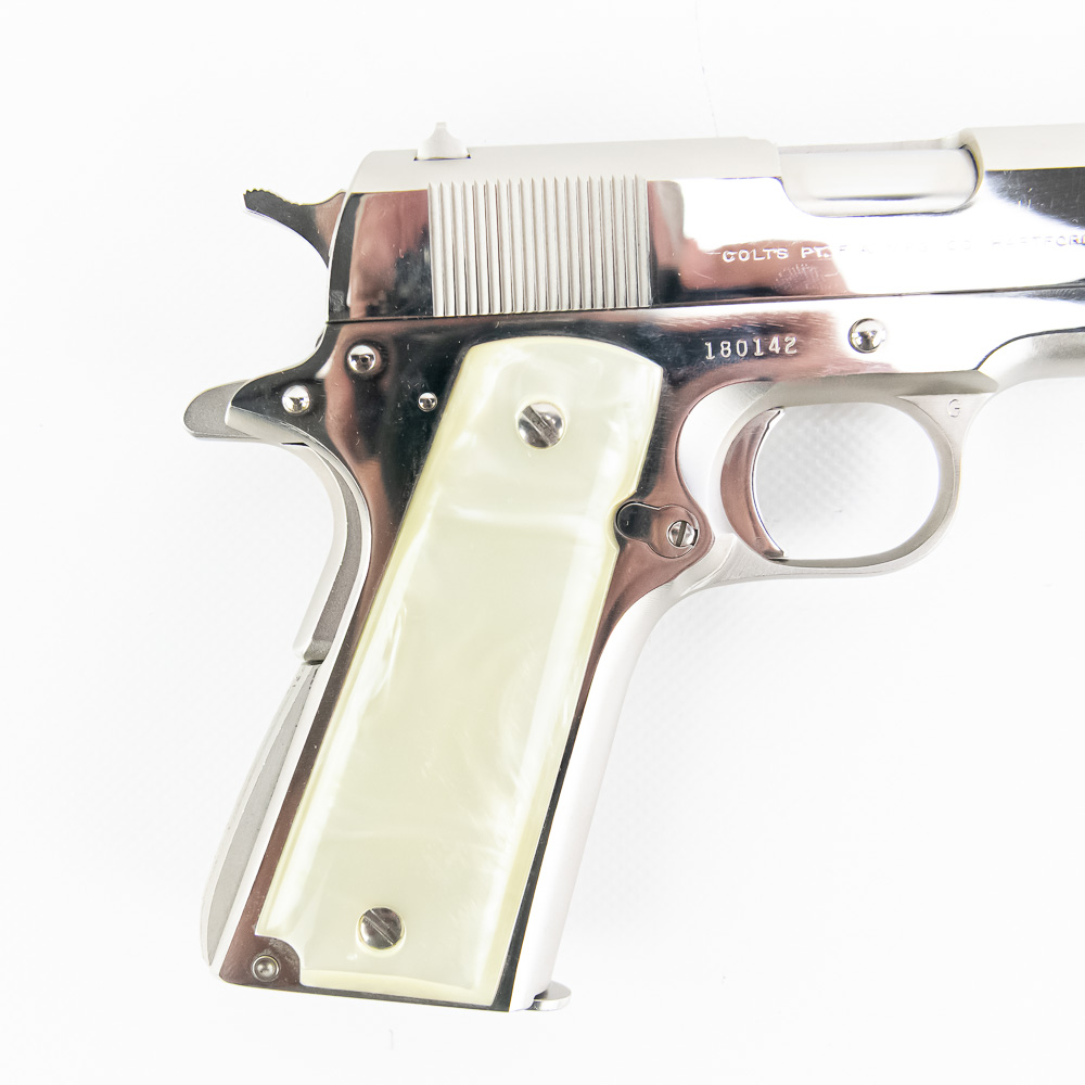 1966 Production Colt model 1911 pistol. Caliber .38 Super Auto. Factory Nickel Plated finish is in excellent condition with only minor scratches. Mother of Pearl Grips are similar condition and have past owners name ink-stamped on inside of right panel. Pistol comes with 1 extra magazine and zipper case. Extremely hard to find and desirable collector gun. See photos.