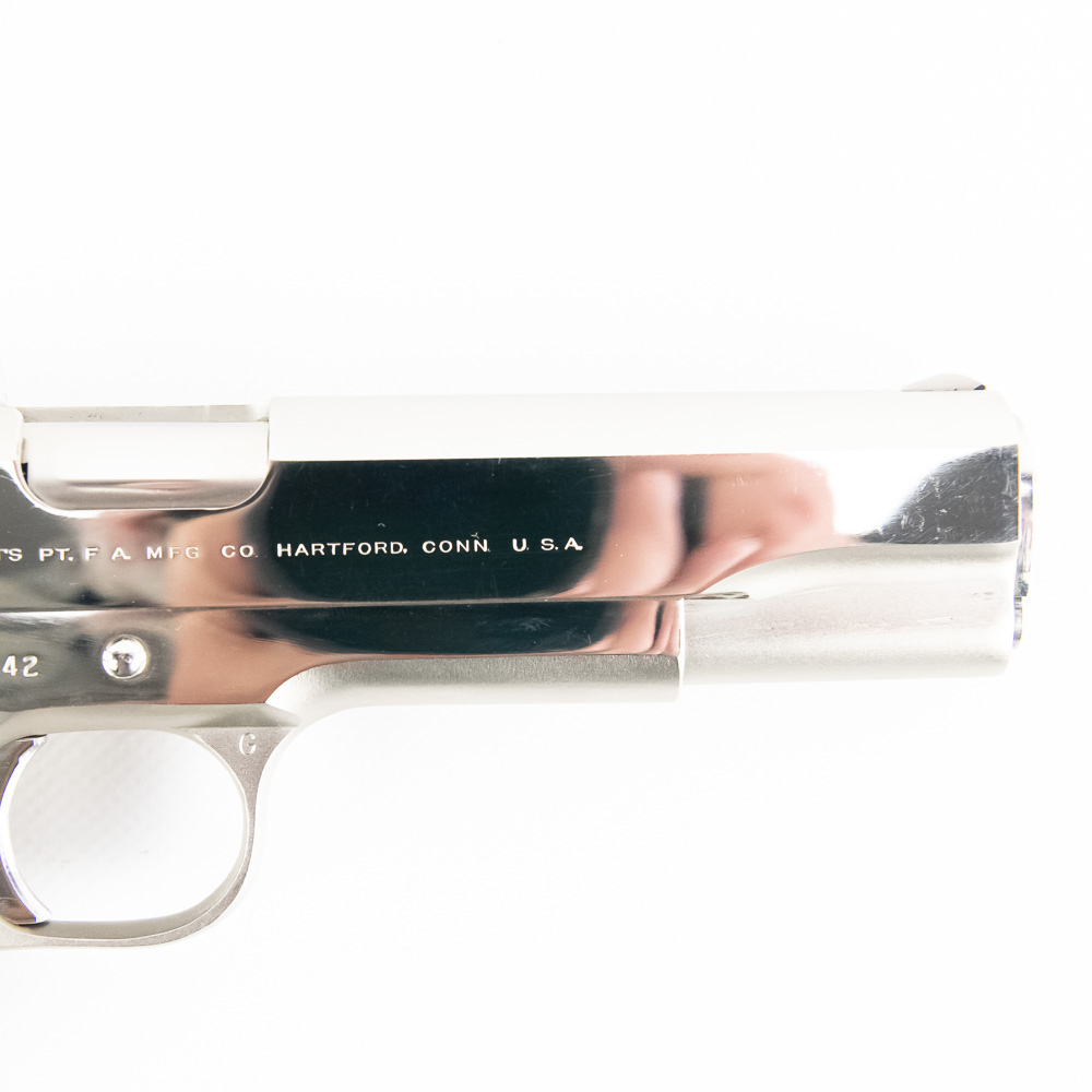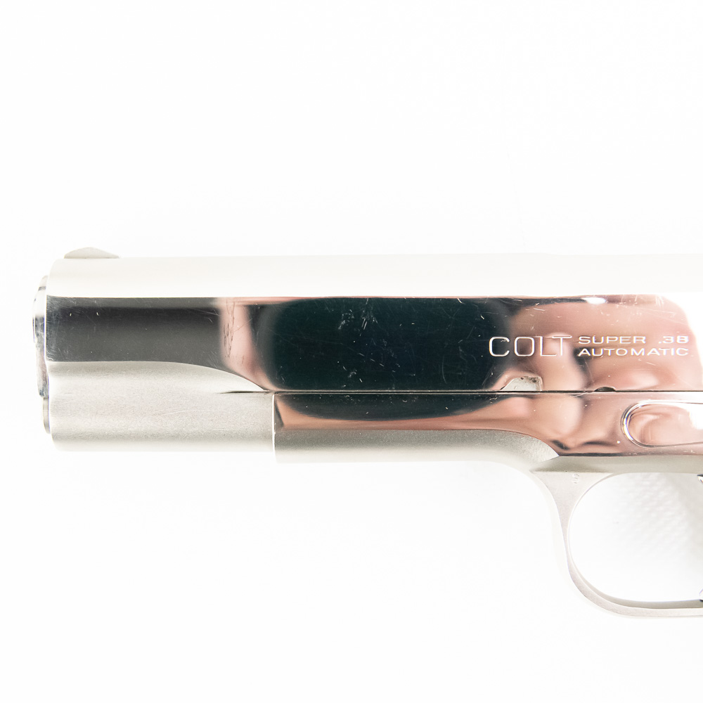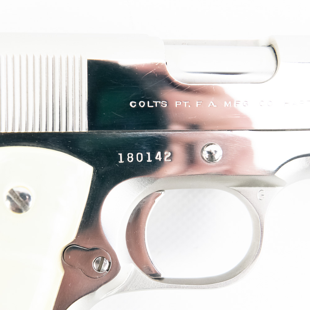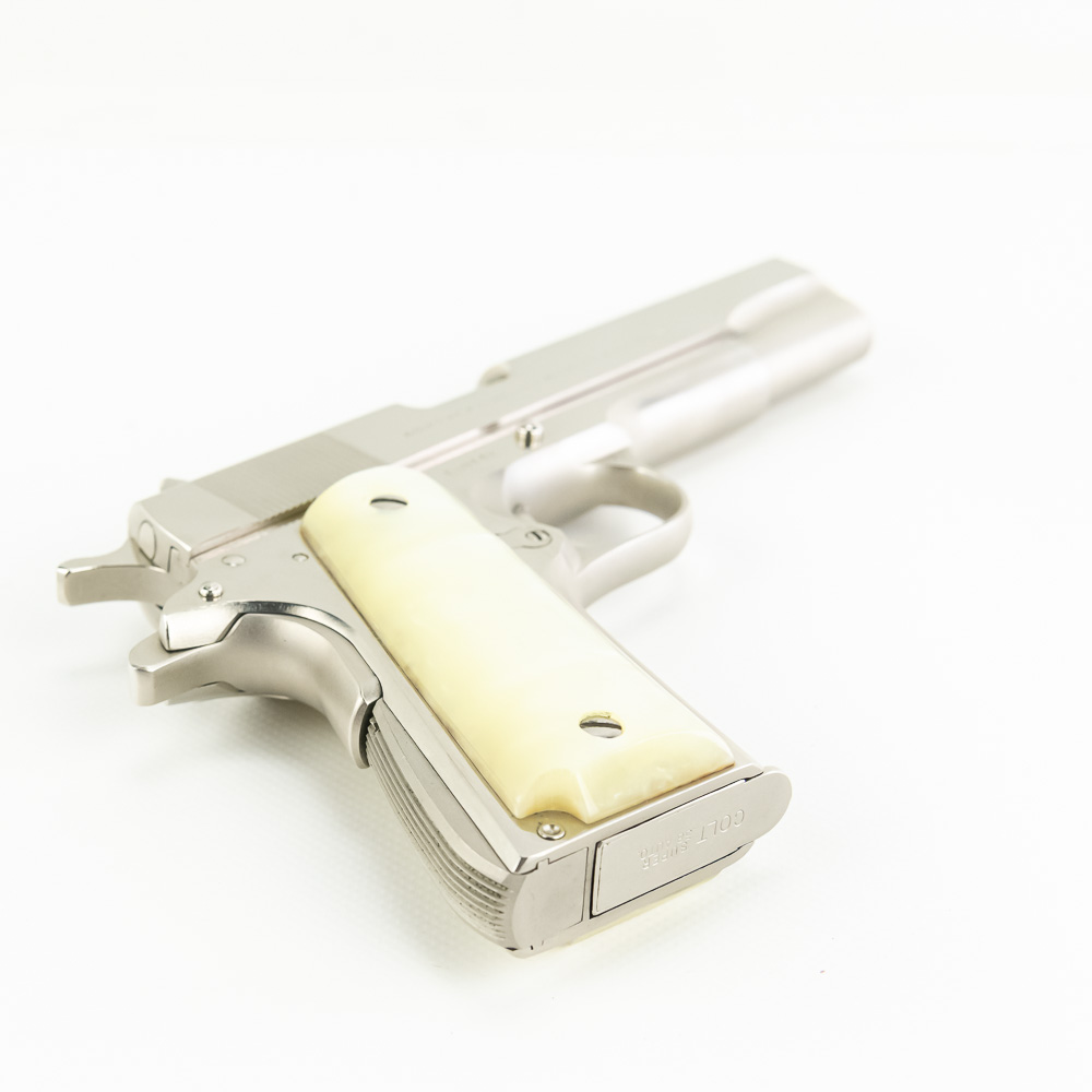 1966 Production Colt model 1911 pistol. Caliber .38 Super Auto. Factory Nickel Plated finish is in excellent condition with only minor scratches. Mother of Pearl Grips are similar condition and have past owners name ink-stamped on inside of right panel. Pistol comes with 1 extra magazine and zipper case. Extremely hard to find and desirable collector gun. See photos.