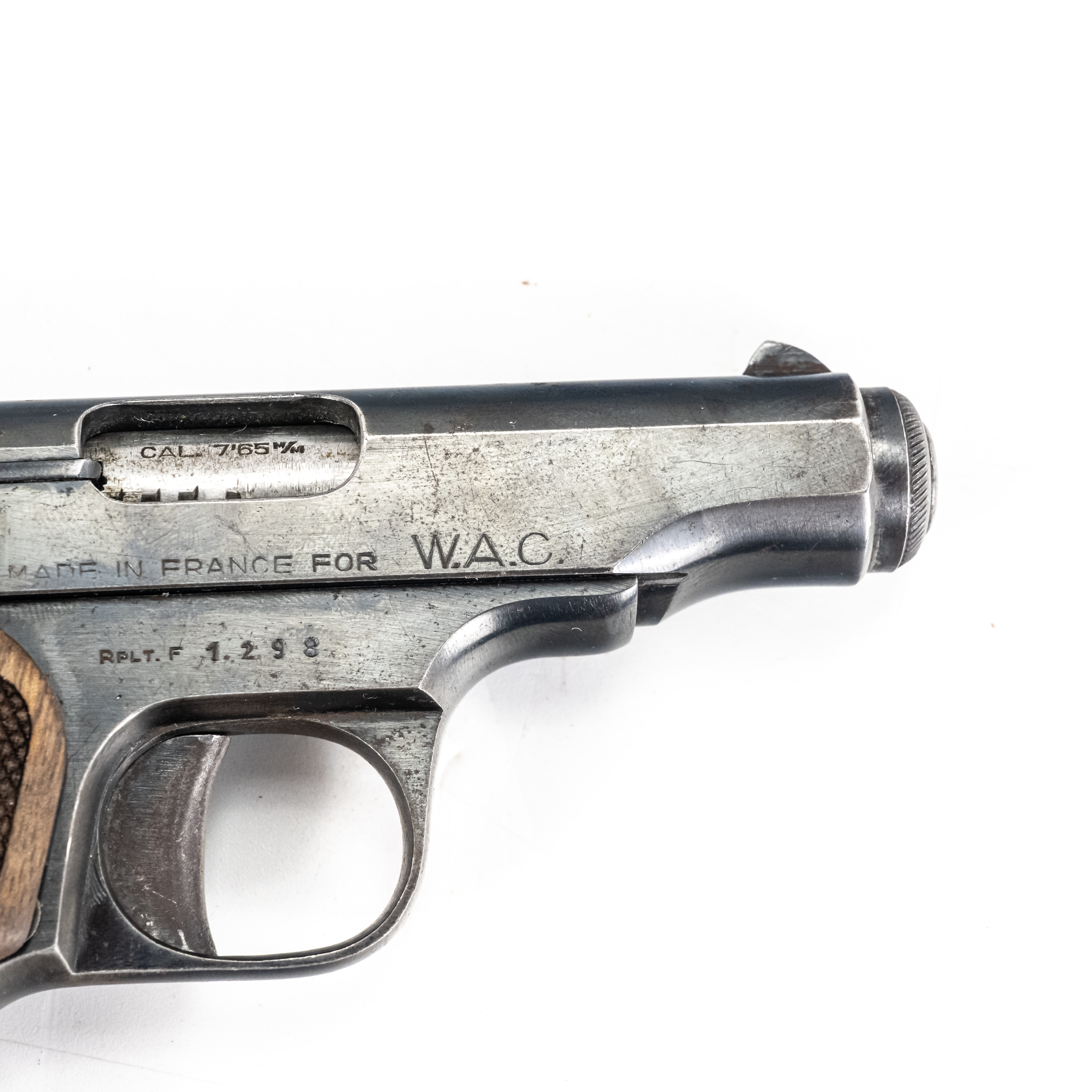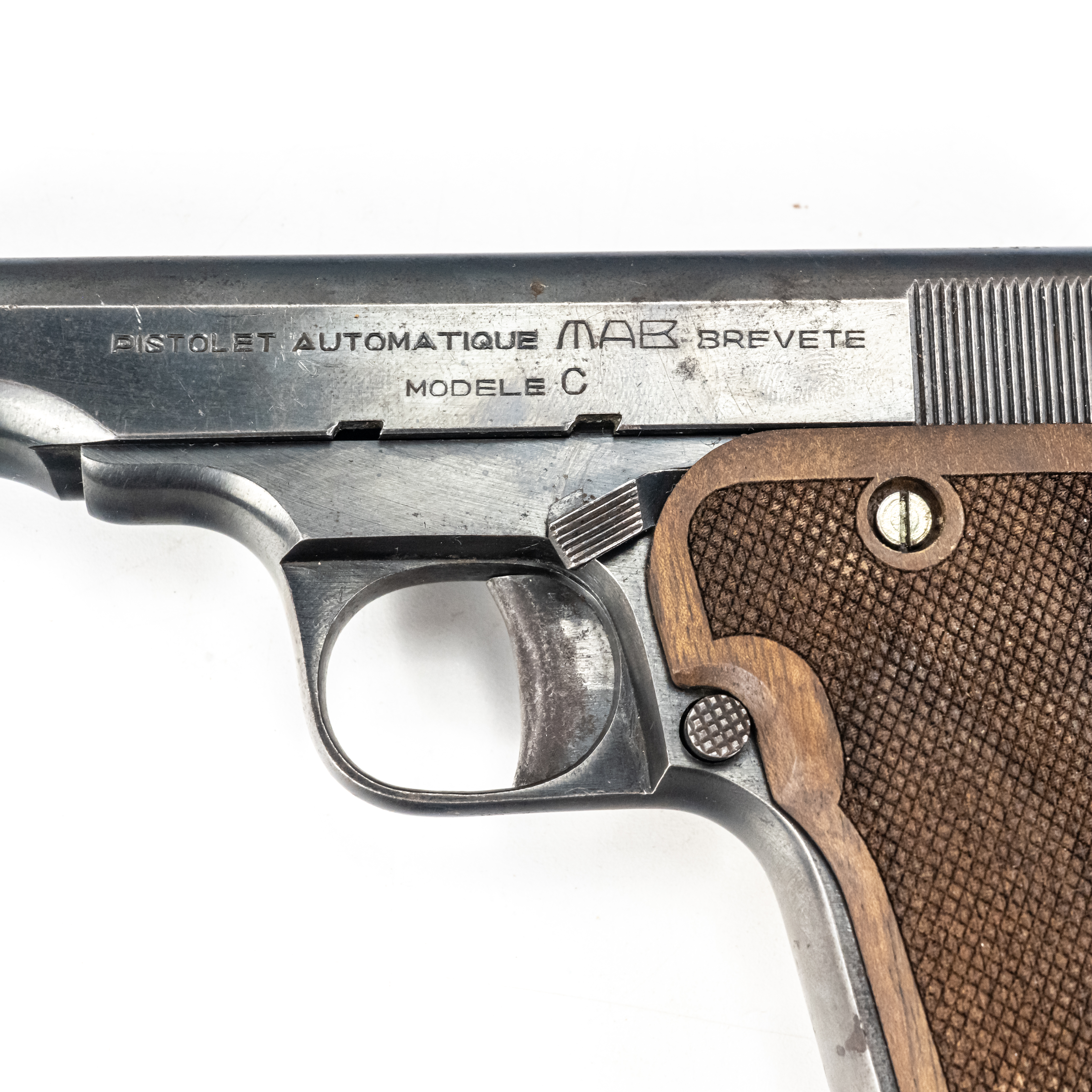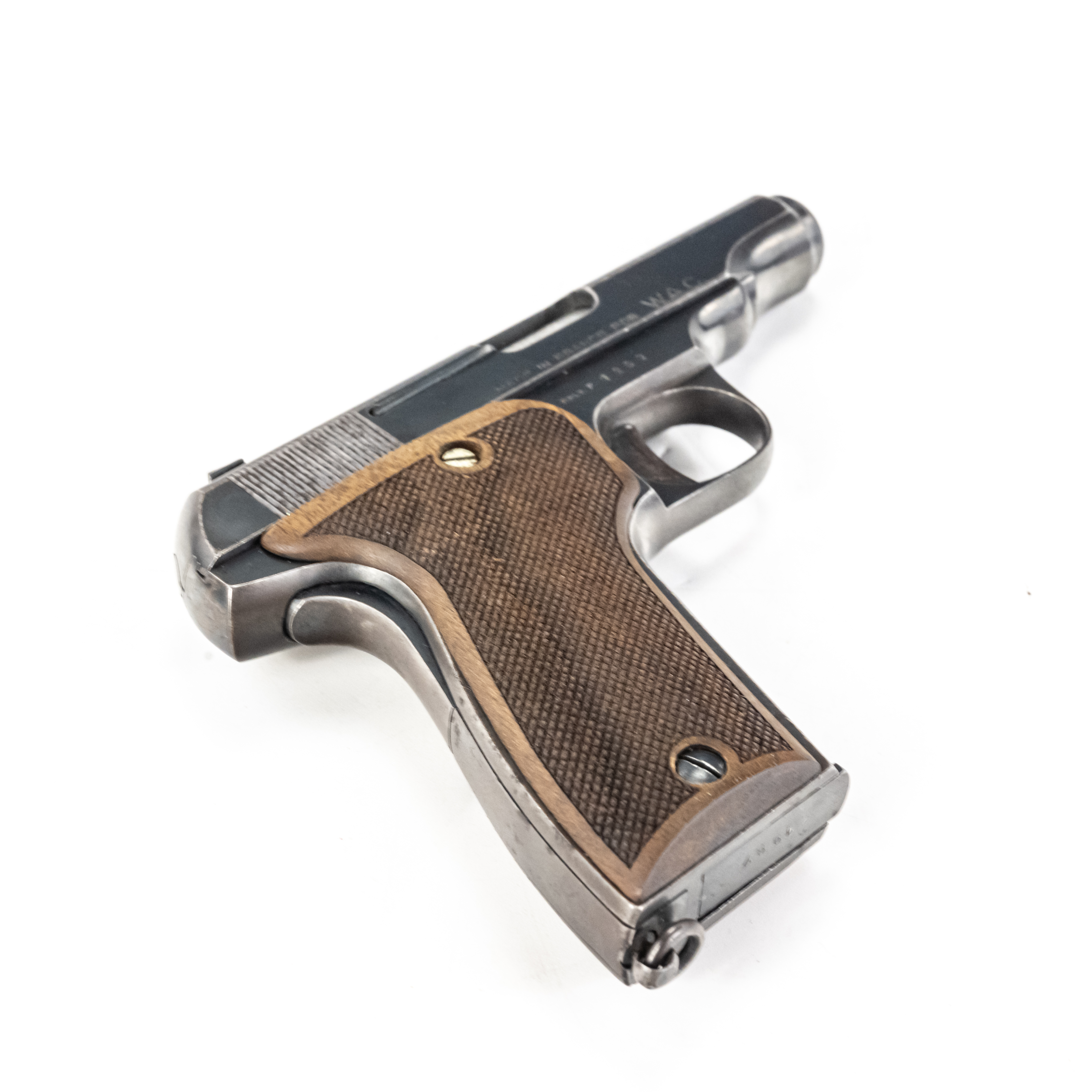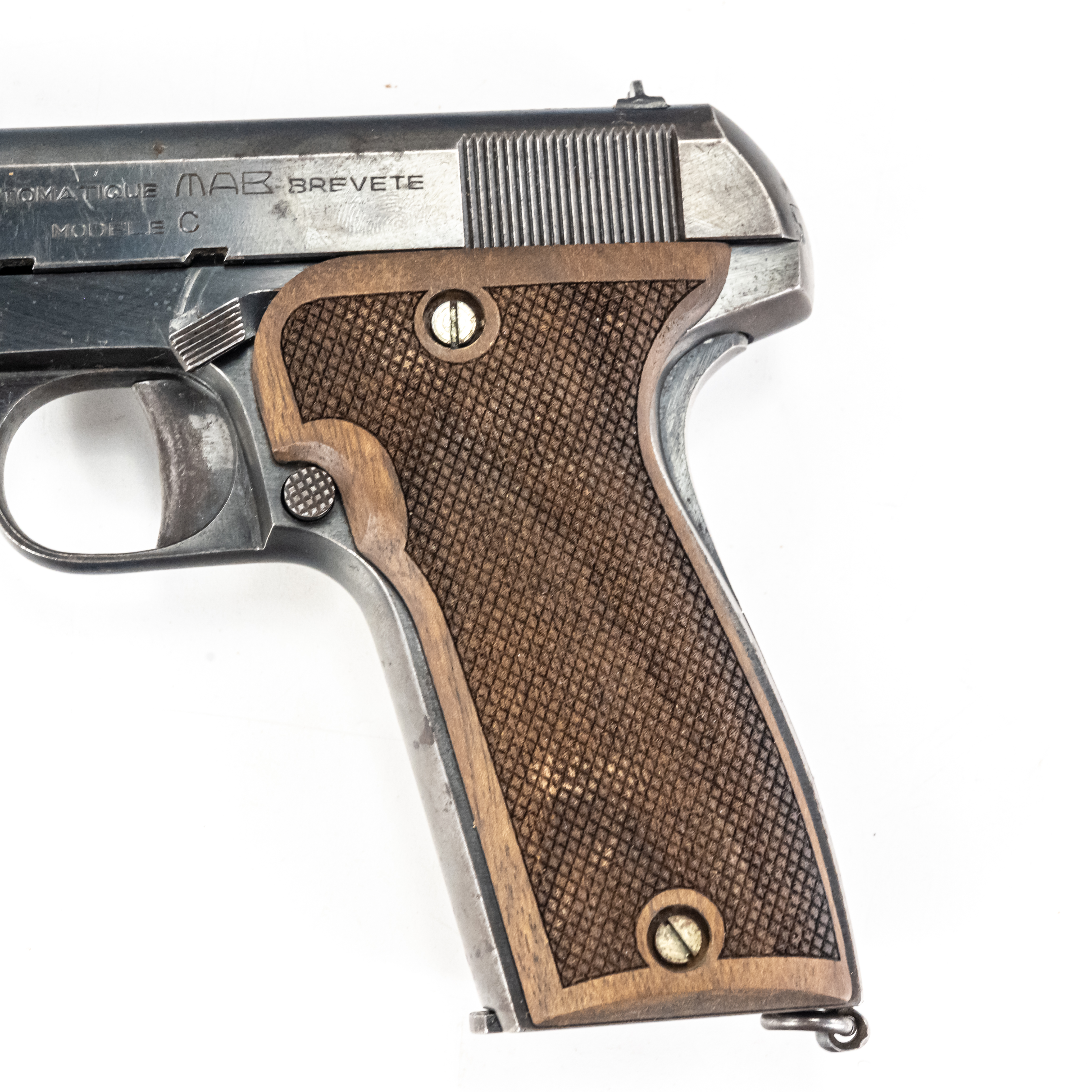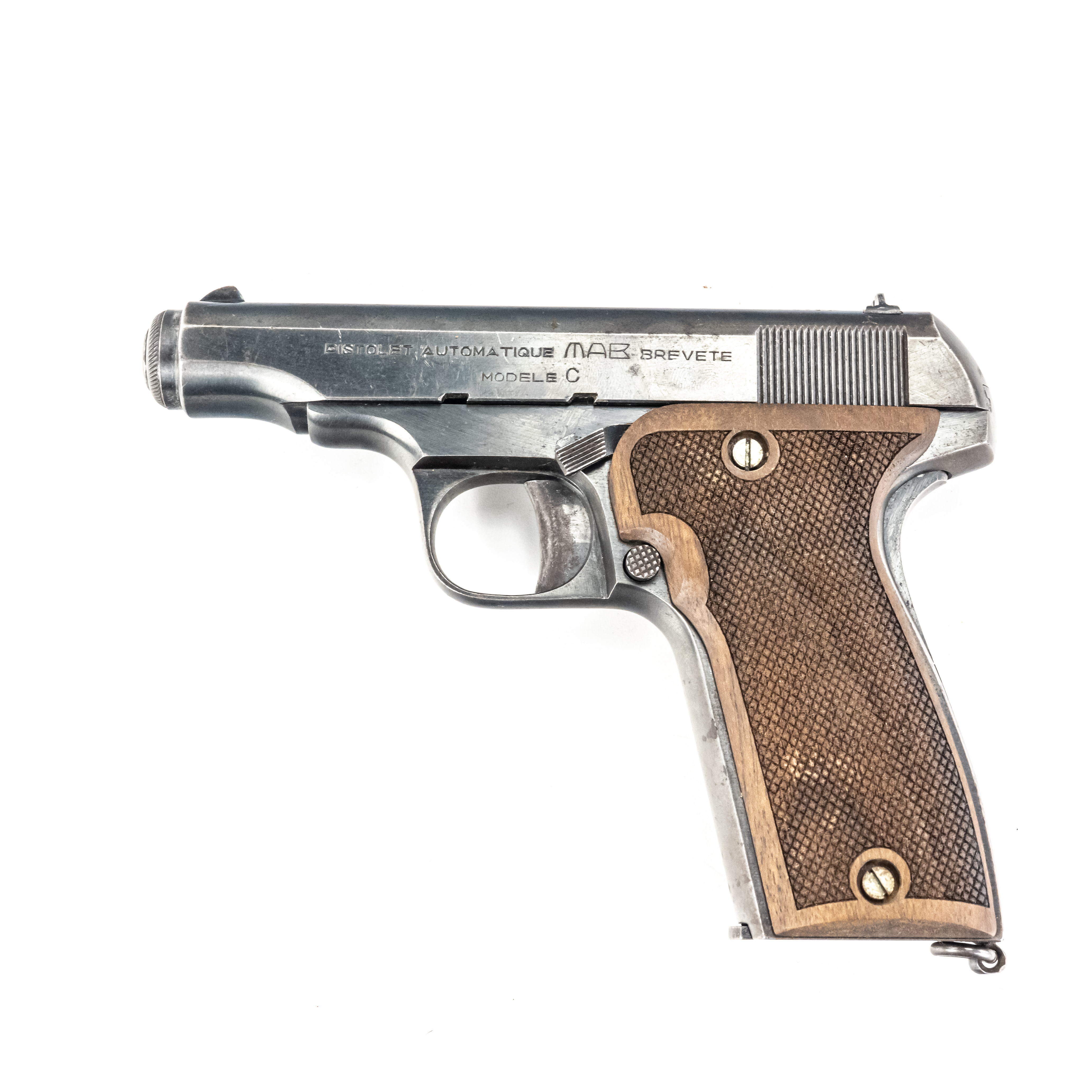 MAB model C Pistol. Caliber .32ACP/7.65mm. Western Arms Corporation imported French pocket pistol. Modeled on Browning model 1910. Very high quality gun is in excellent vintage condition with typical finish wear for age and use. Pistol has replacement wooden grips with some usage marks. Nice collector piece. See photos.