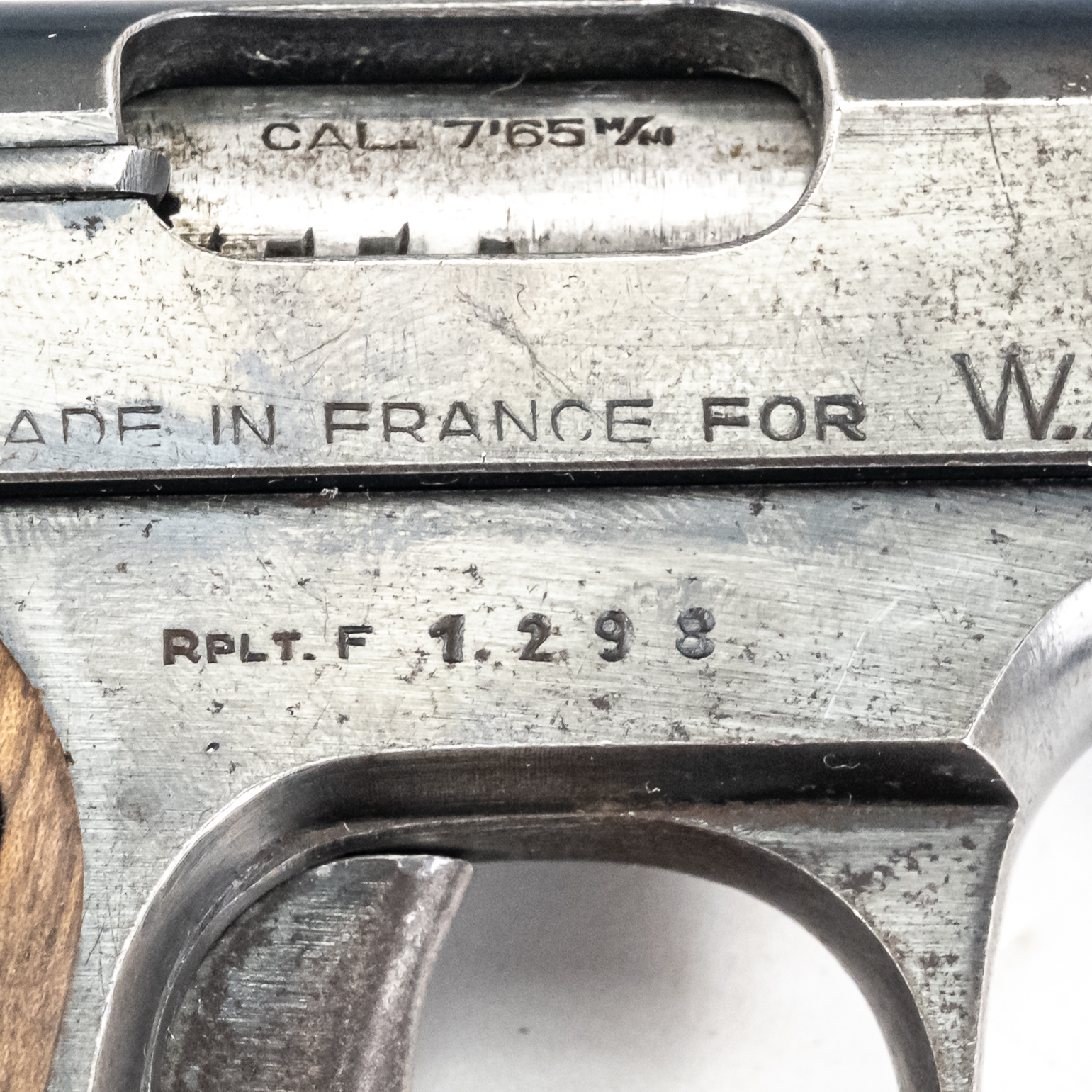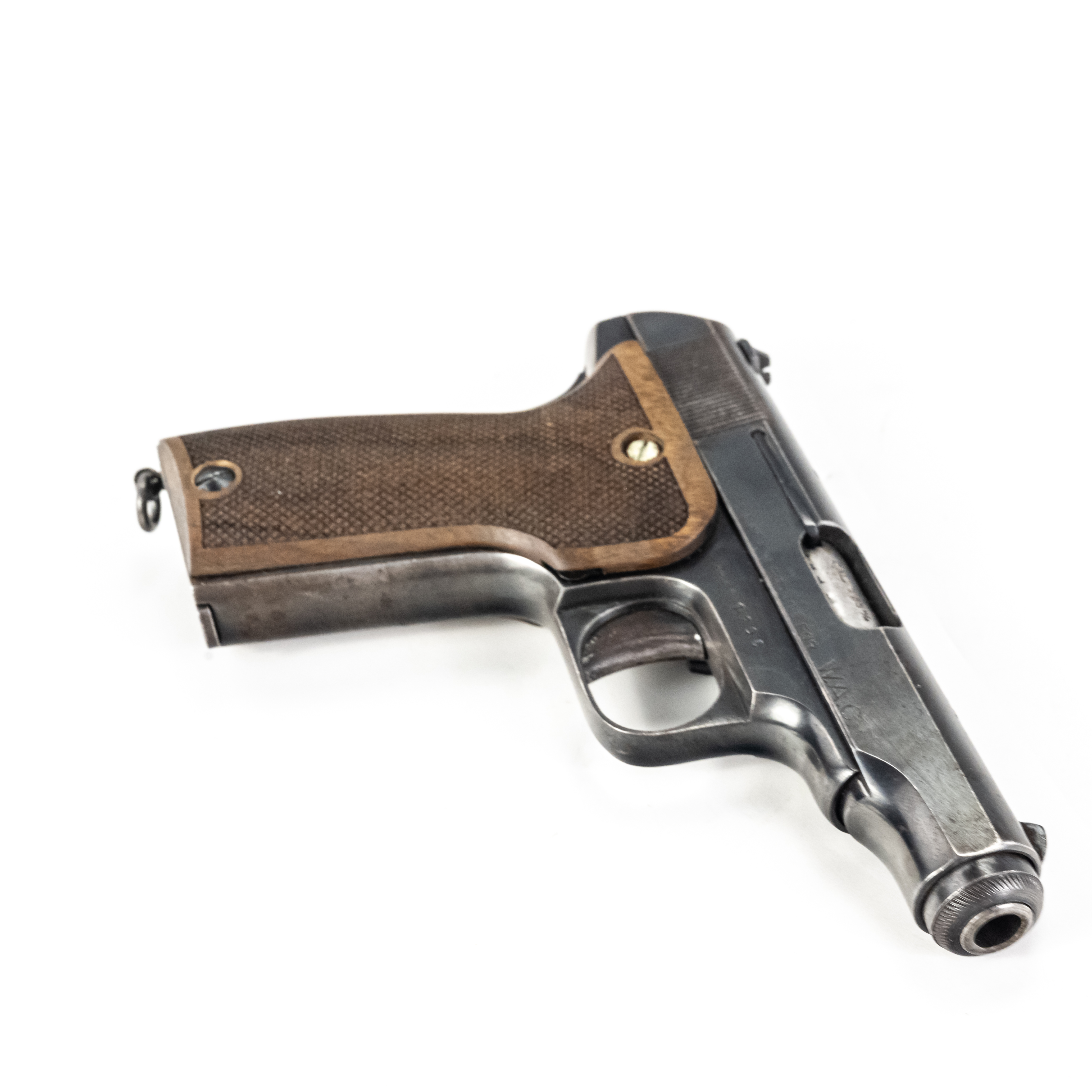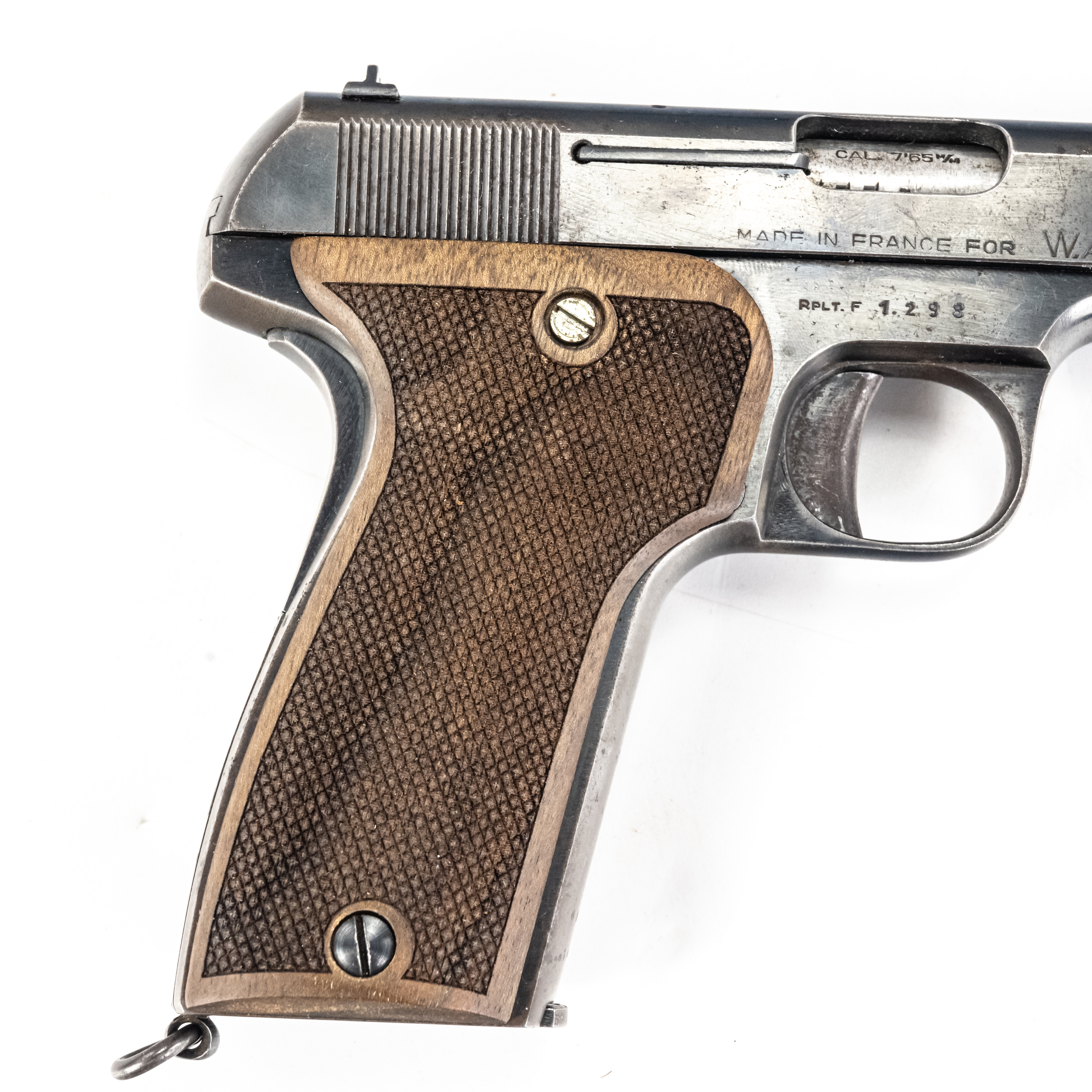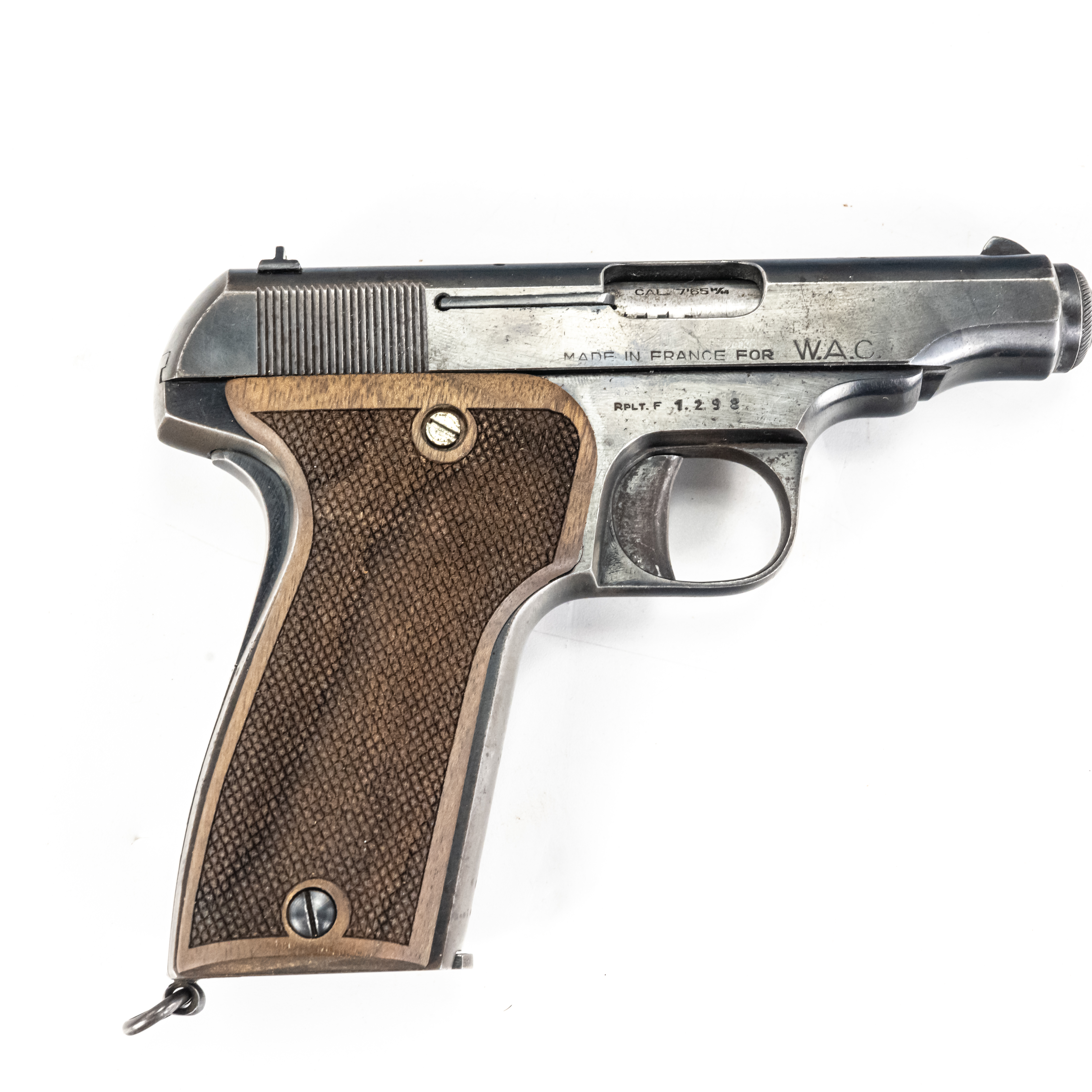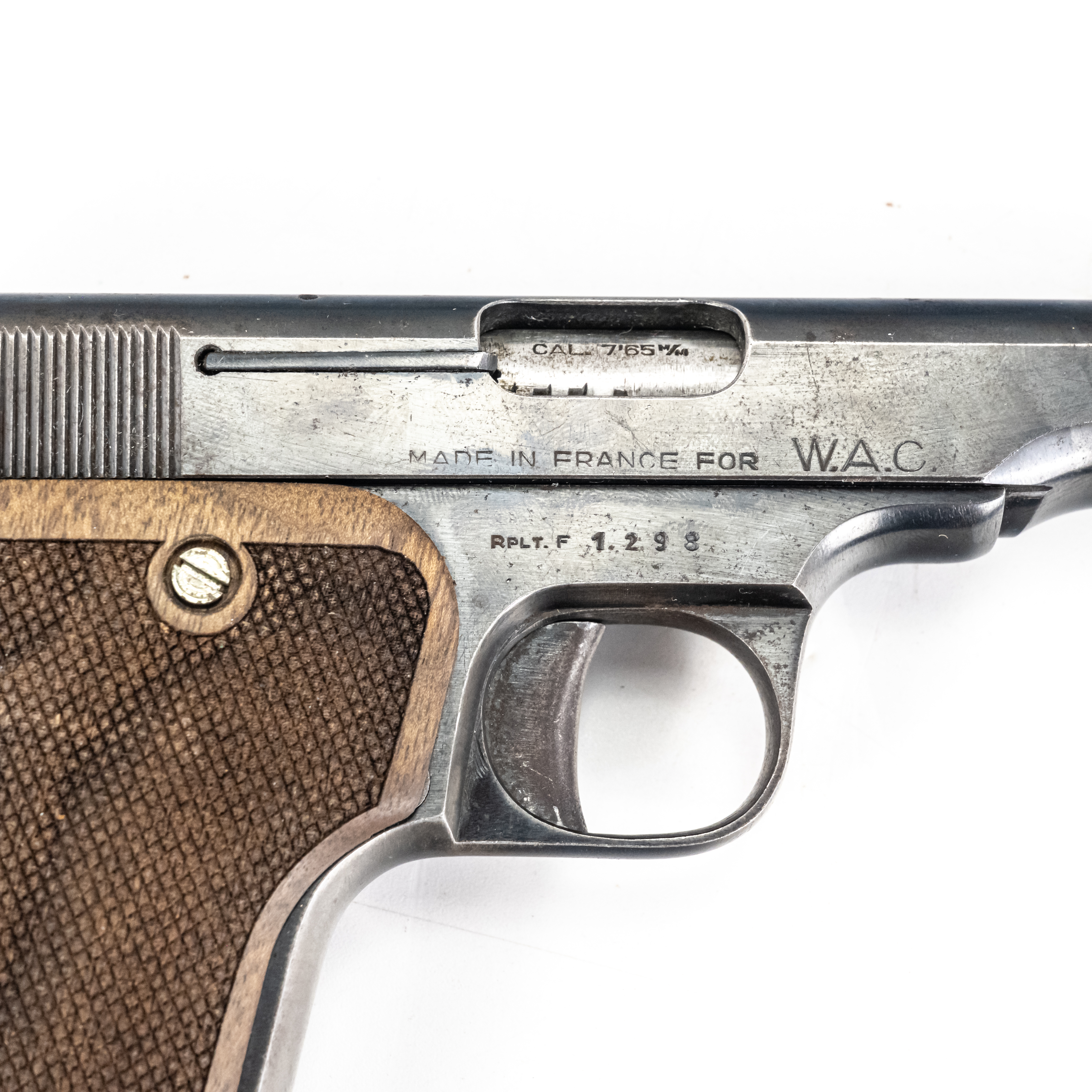 MAB model C Pistol. Caliber .32ACP/7.65mm. Western Arms Corporation imported French pocket pistol. Modeled on Browning model 1910. Very high quality gun is in excellent vintage condition with typical finish wear for age and use. Pistol has replacement wooden grips with some usage marks. Nice collector piece. See photos.