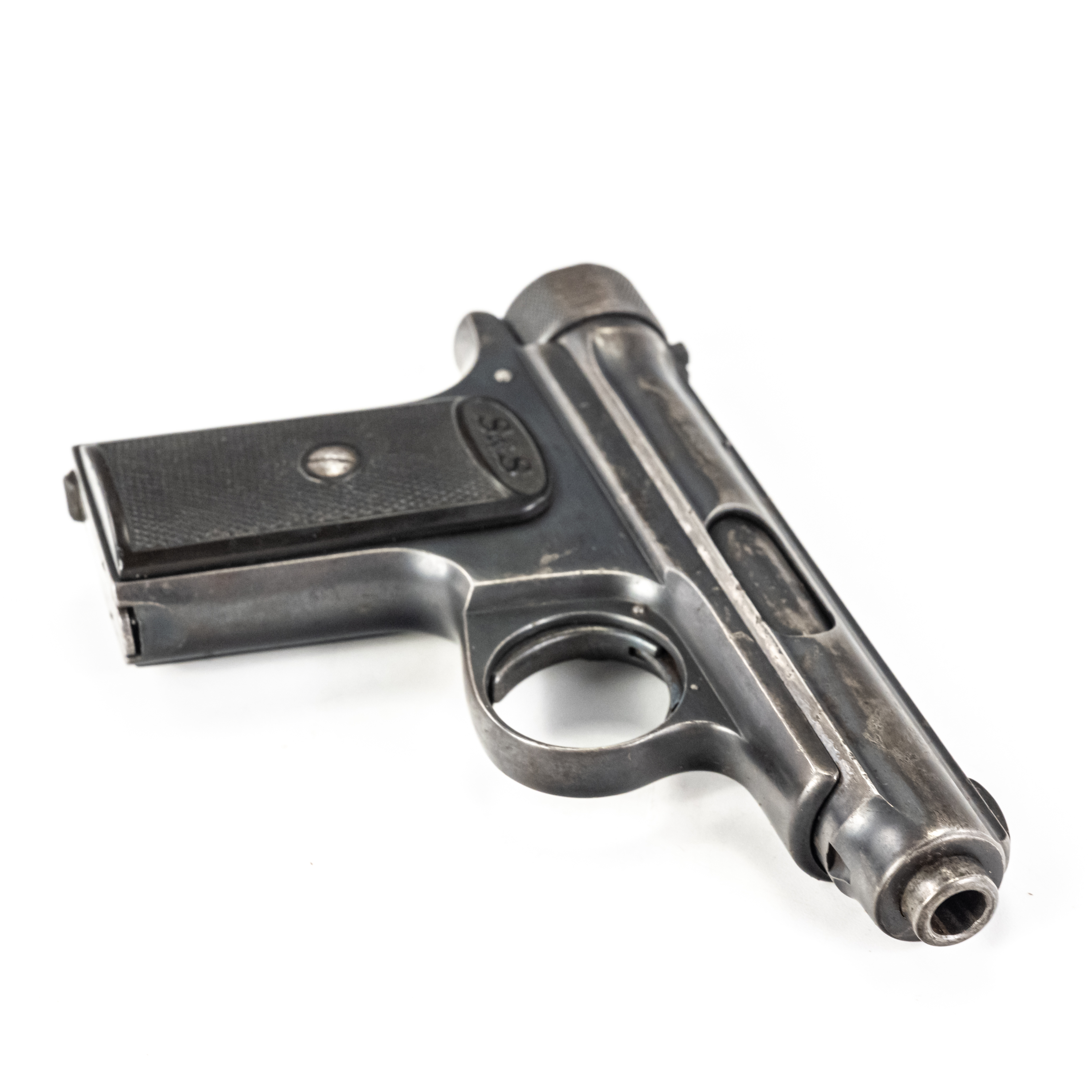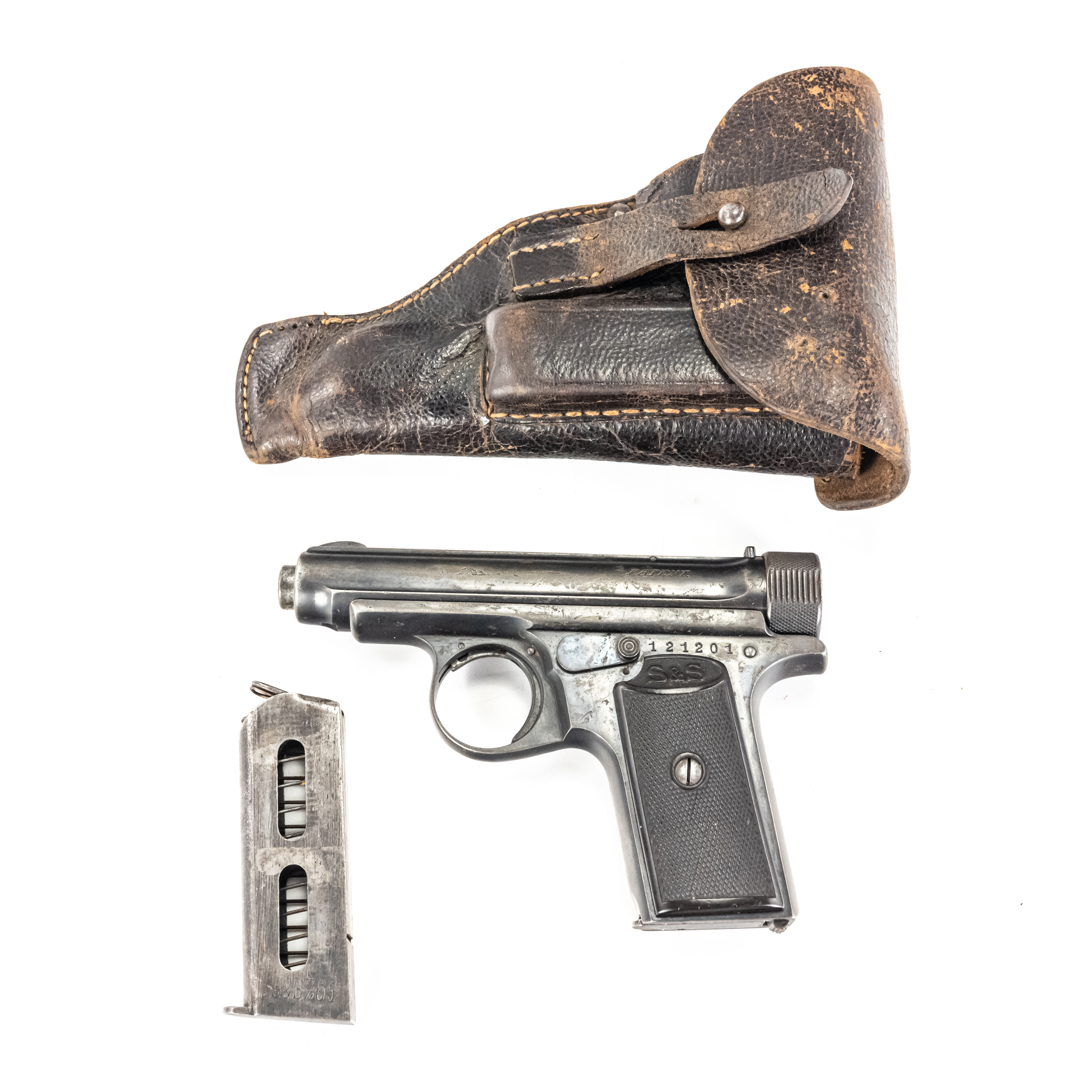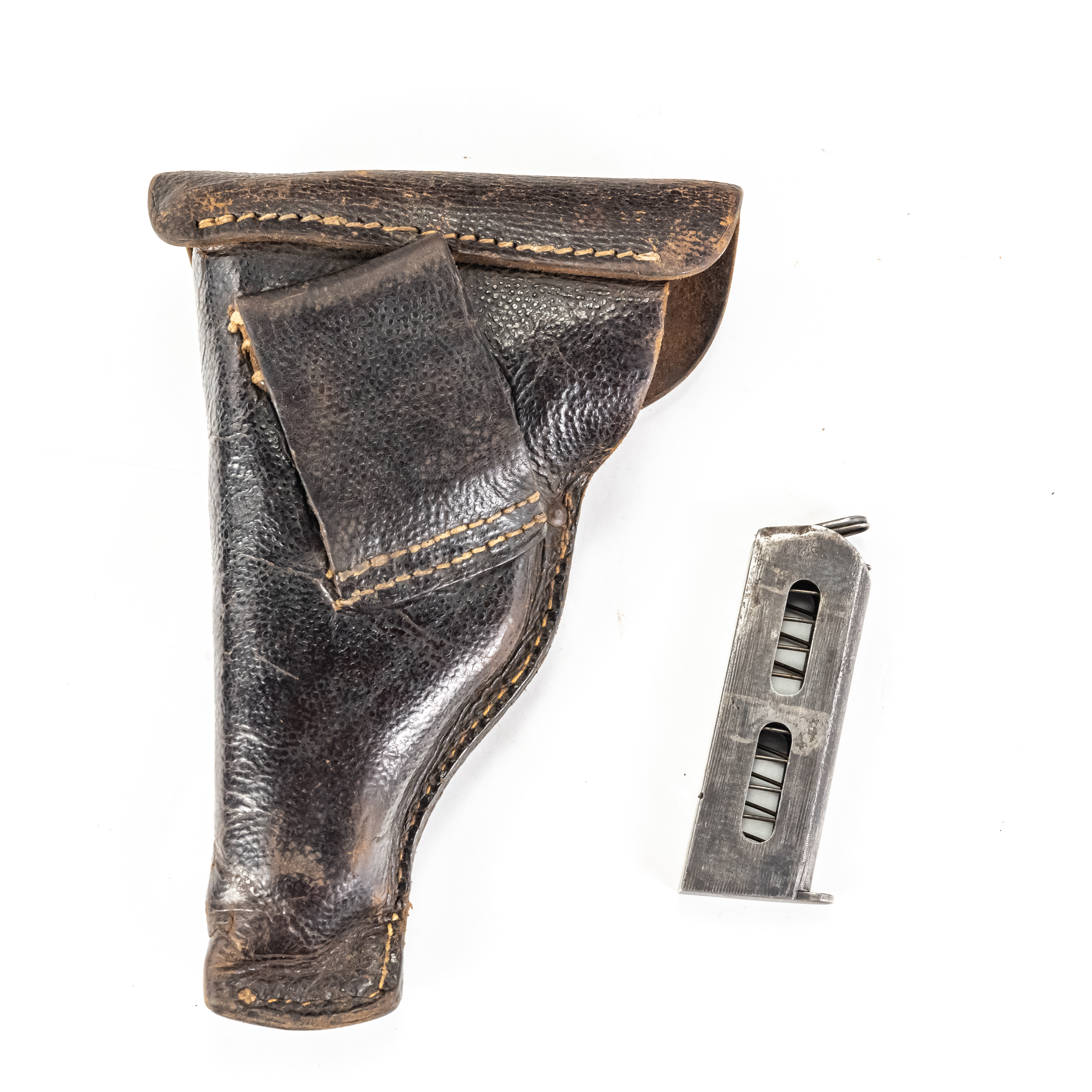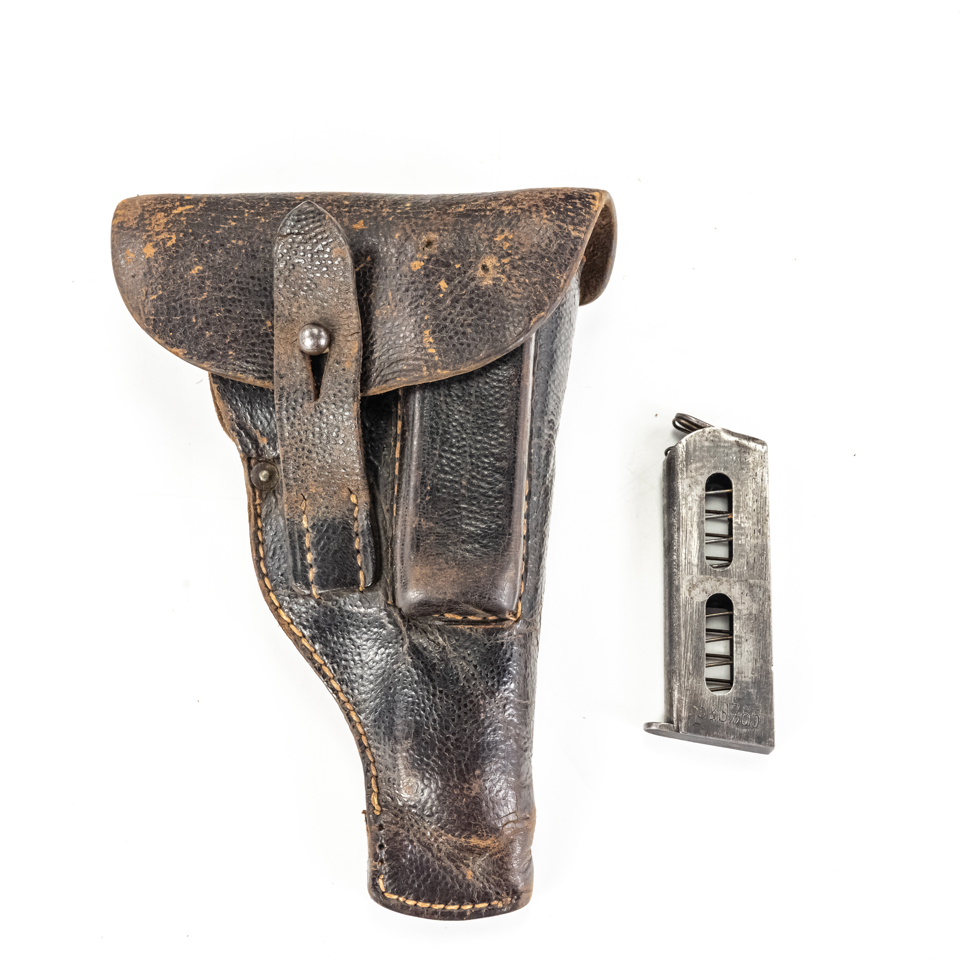 Sauer Model 1913 pistol. Caliber 7.65mm. German made pistol was very popular among military officers in WWII. This pistol appears to be a vet bring back pistol with German military holster and extra magazine. Holster has soldiers name and where it was mailed home written inside top flap. Pistol shows moderate signs of use and long years of storage in its holster. Very neat designed handgun with a story.