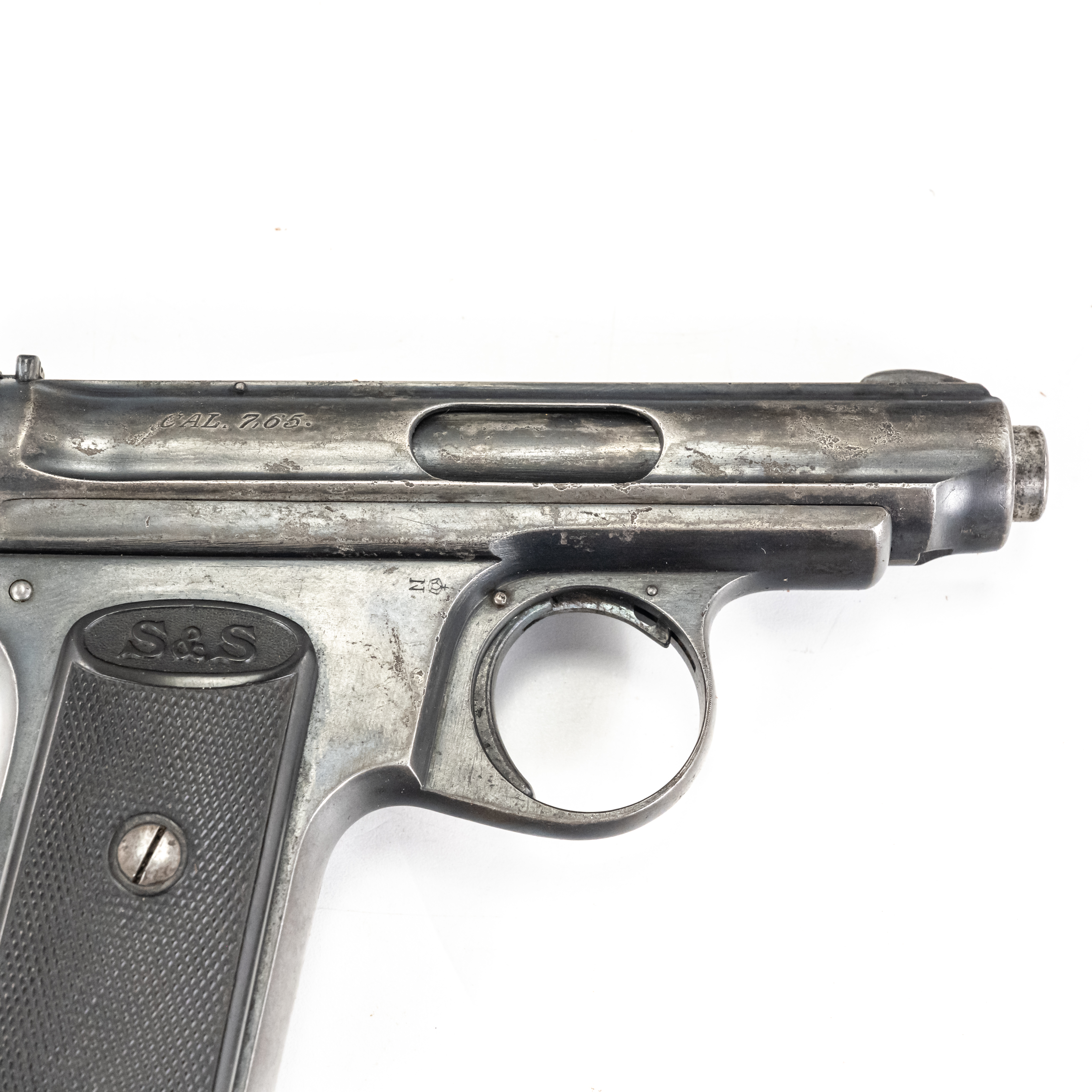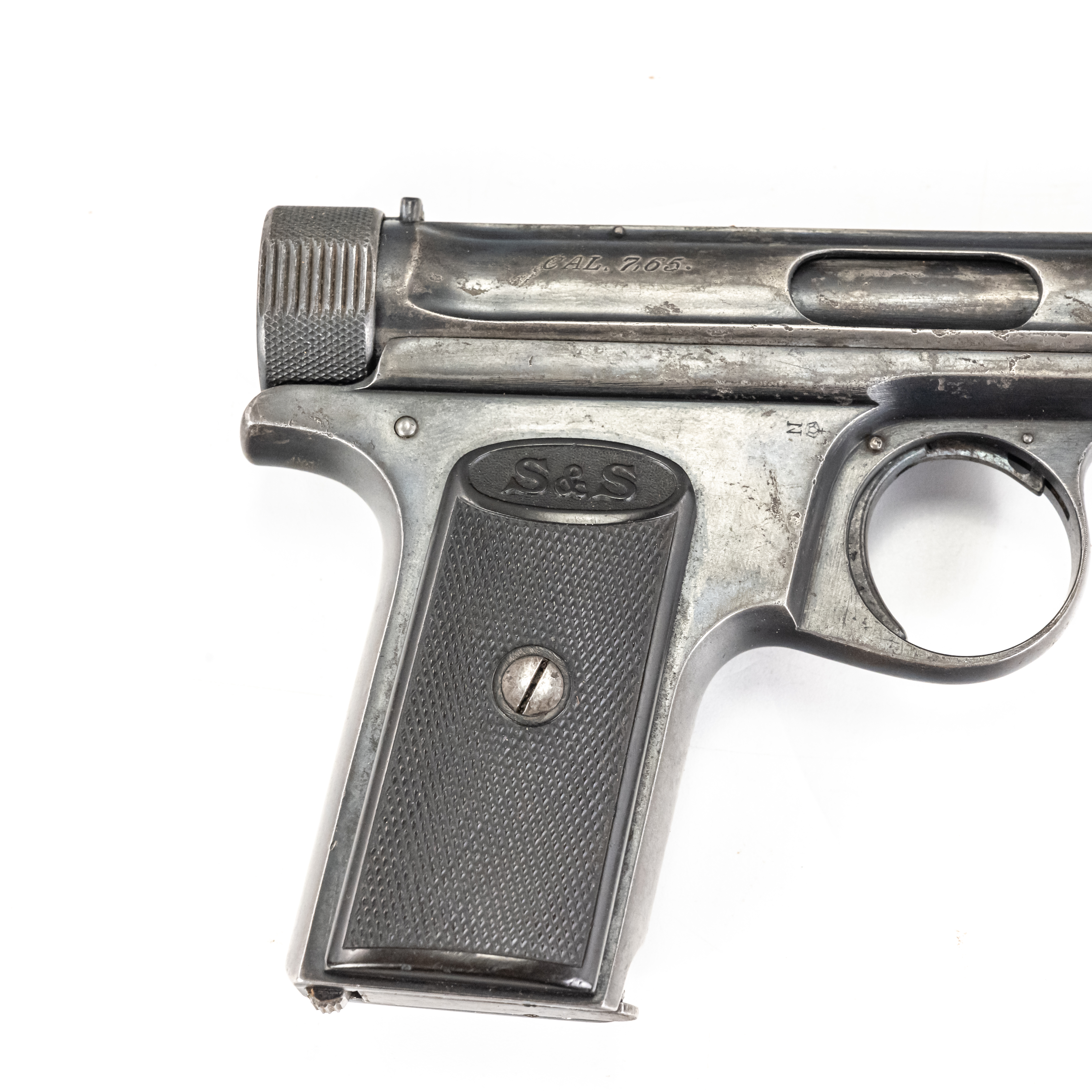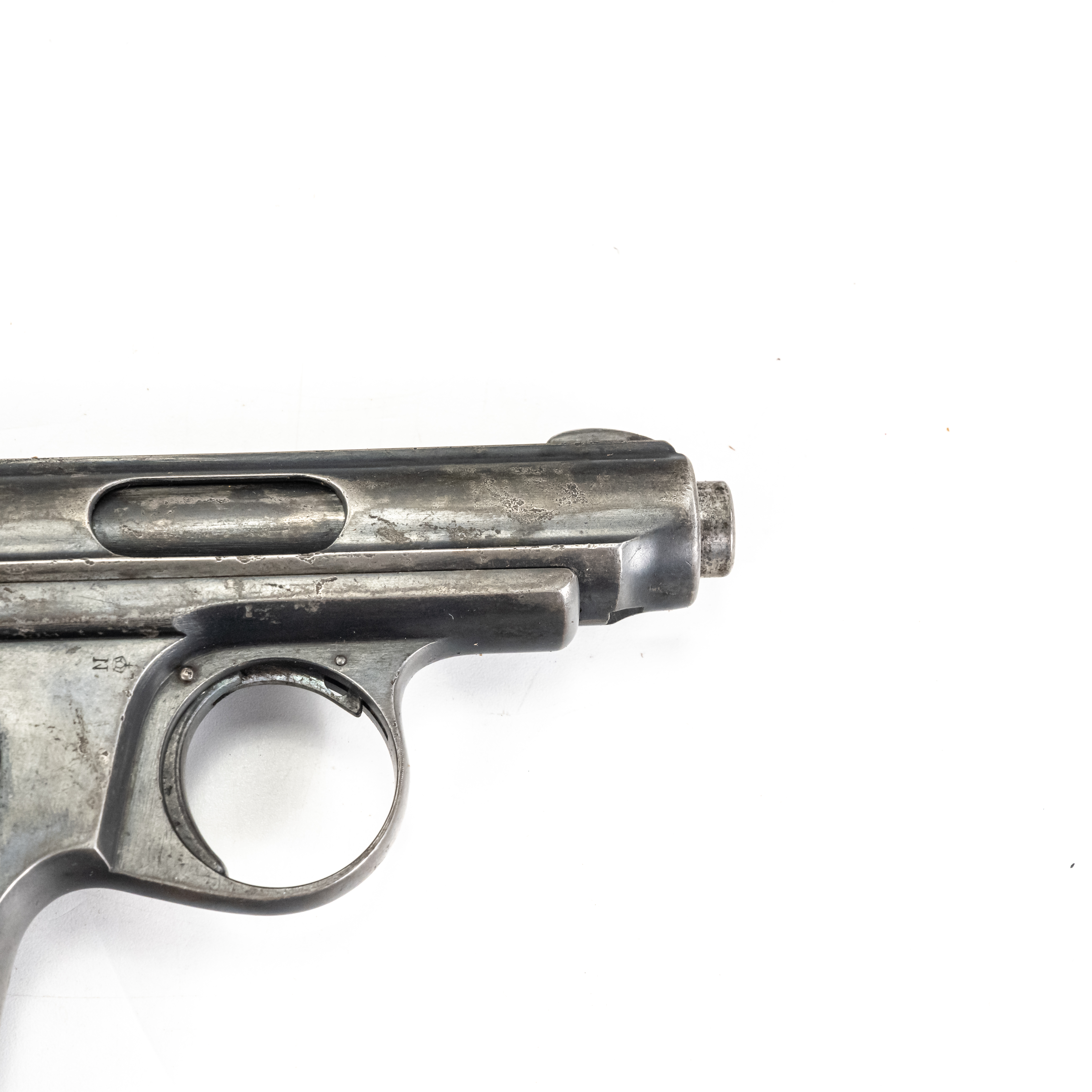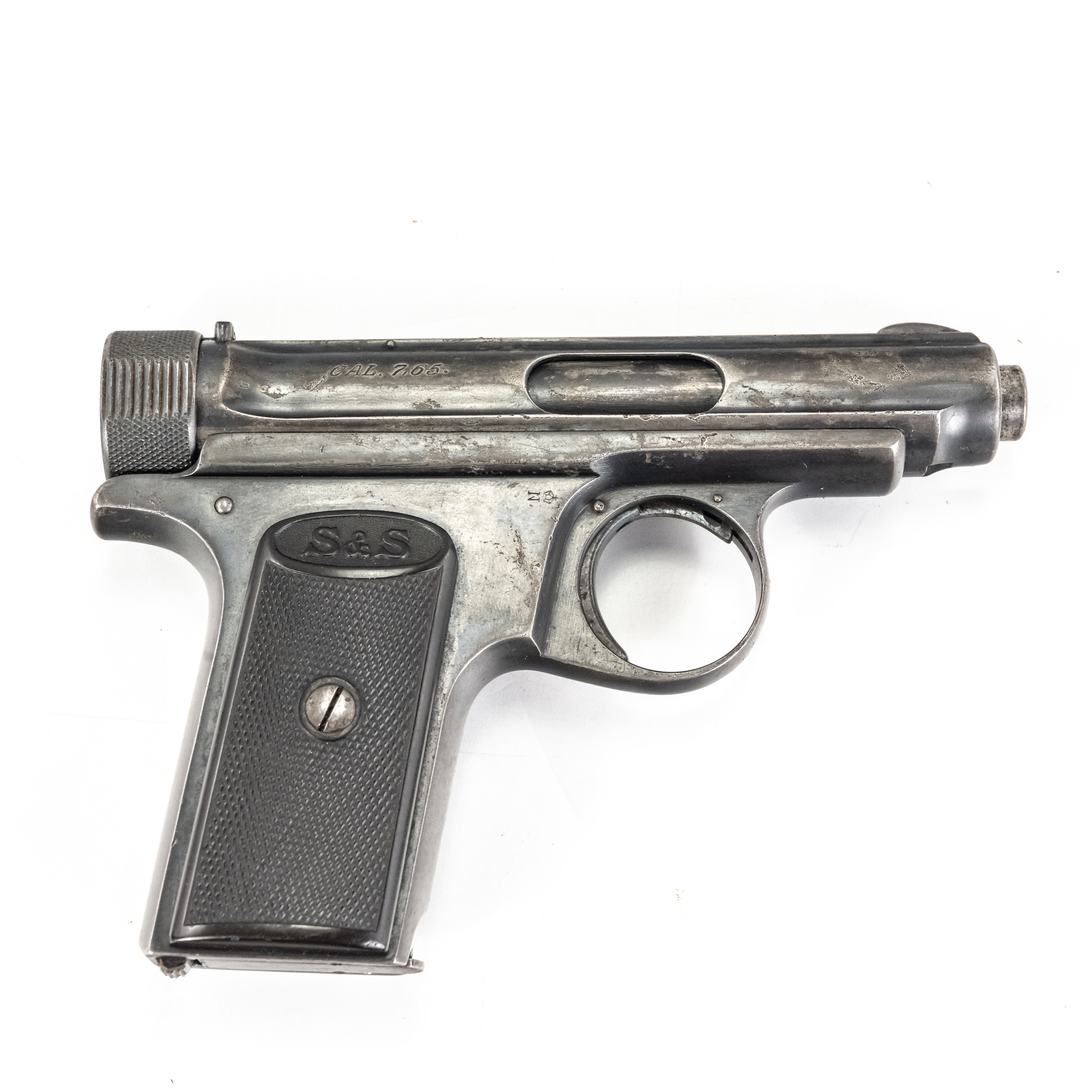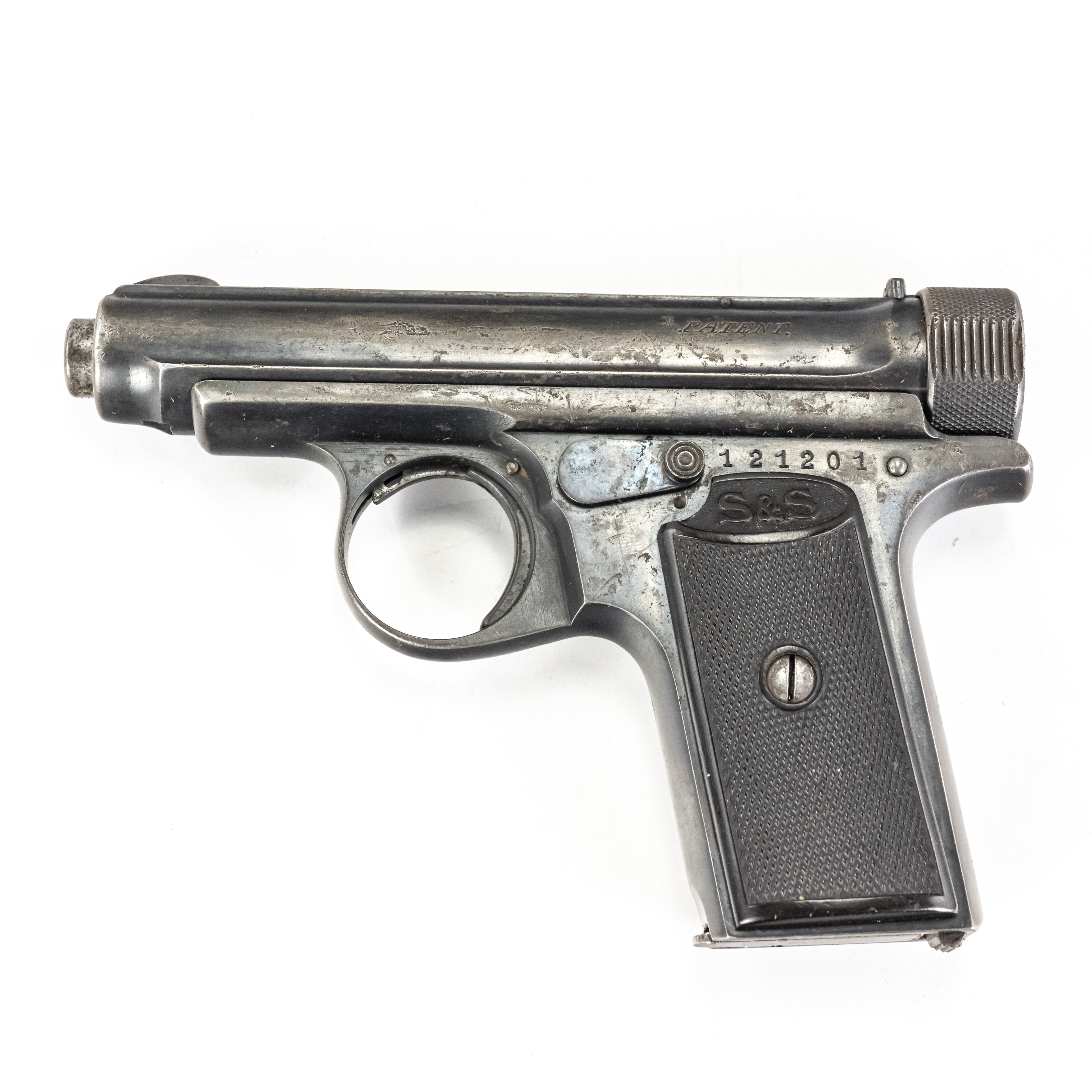 Sauer Model 1913 pistol. Caliber 7.65mm. German made pistol was very popular among military officers in WWII. This pistol appears to be a vet bring back pistol with German military holster and extra magazine. Holster has soldiers name and where it was mailed home written inside top flap. Pistol shows moderate signs of use and long years of storage in its holster. Very neat designed handgun with a story.