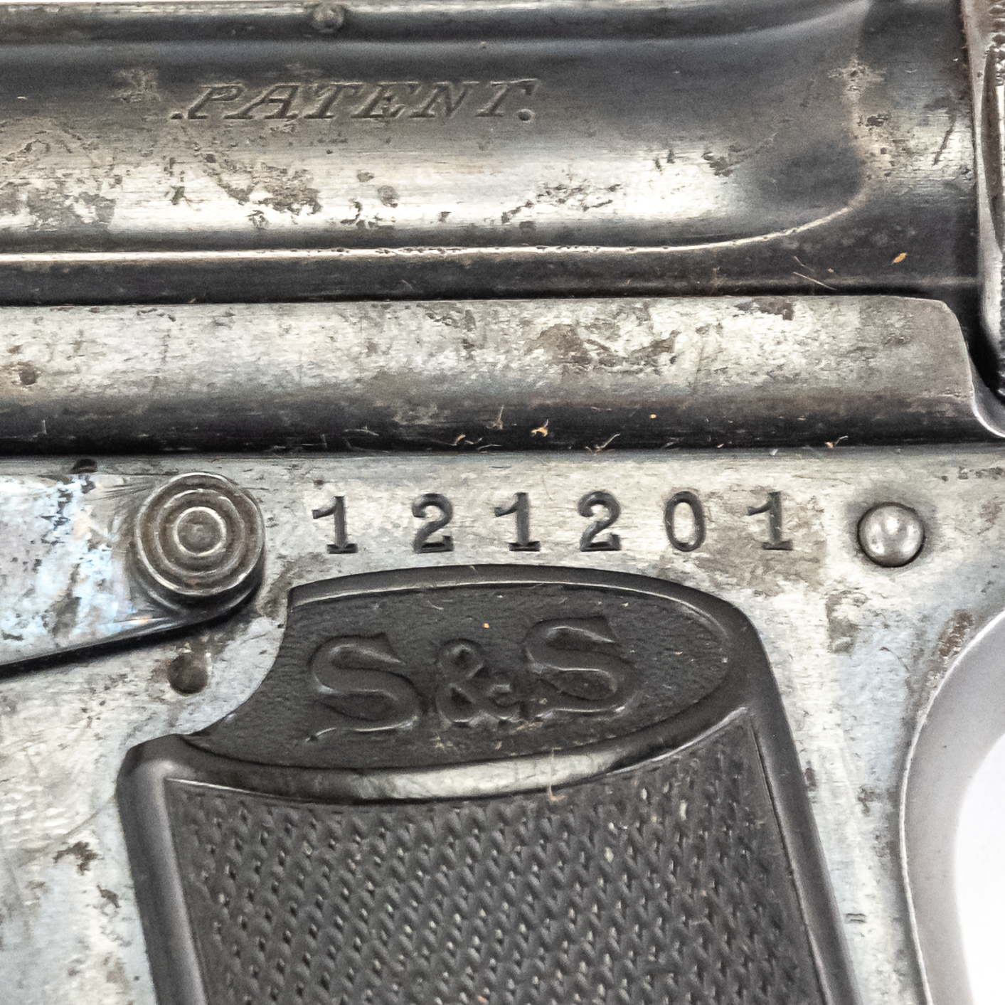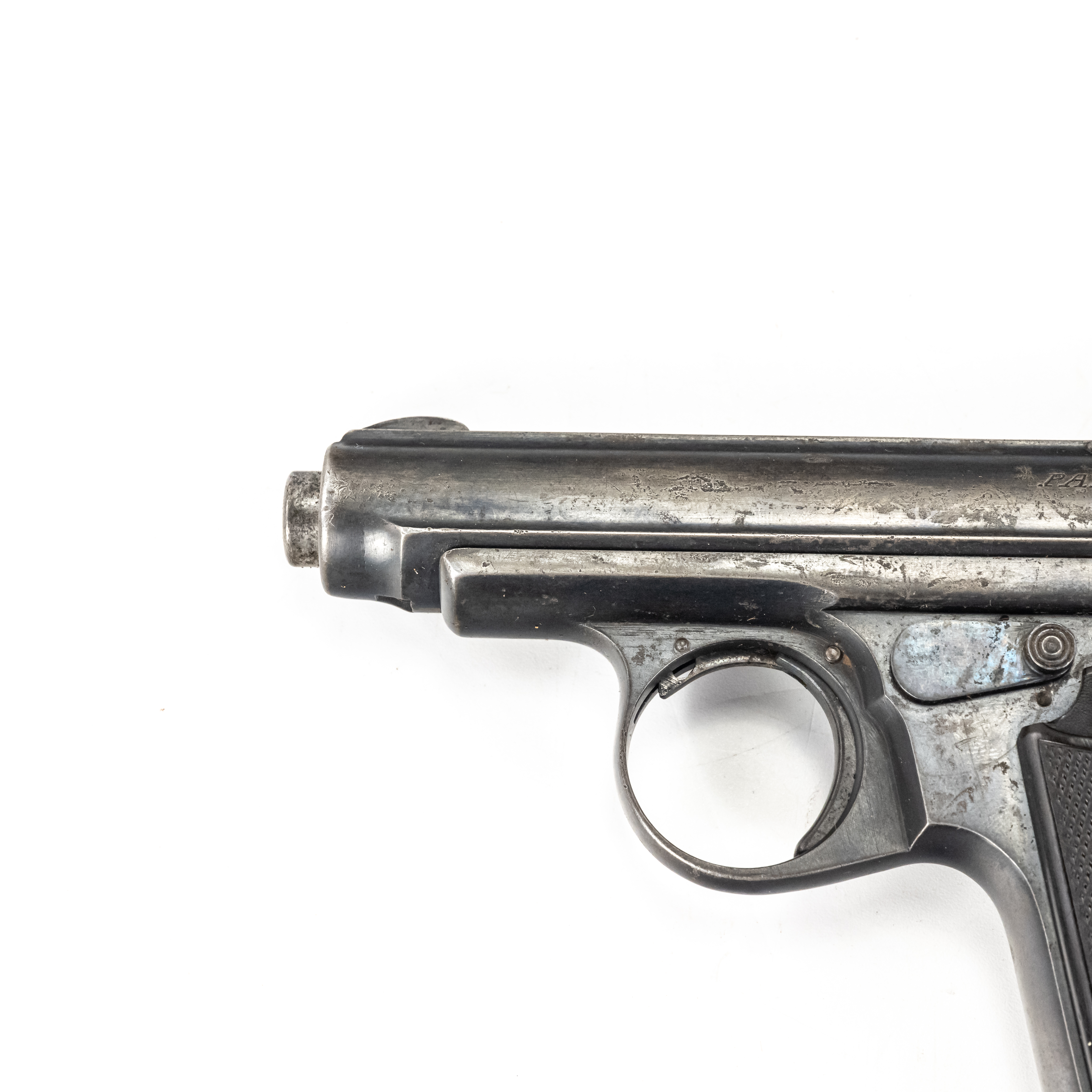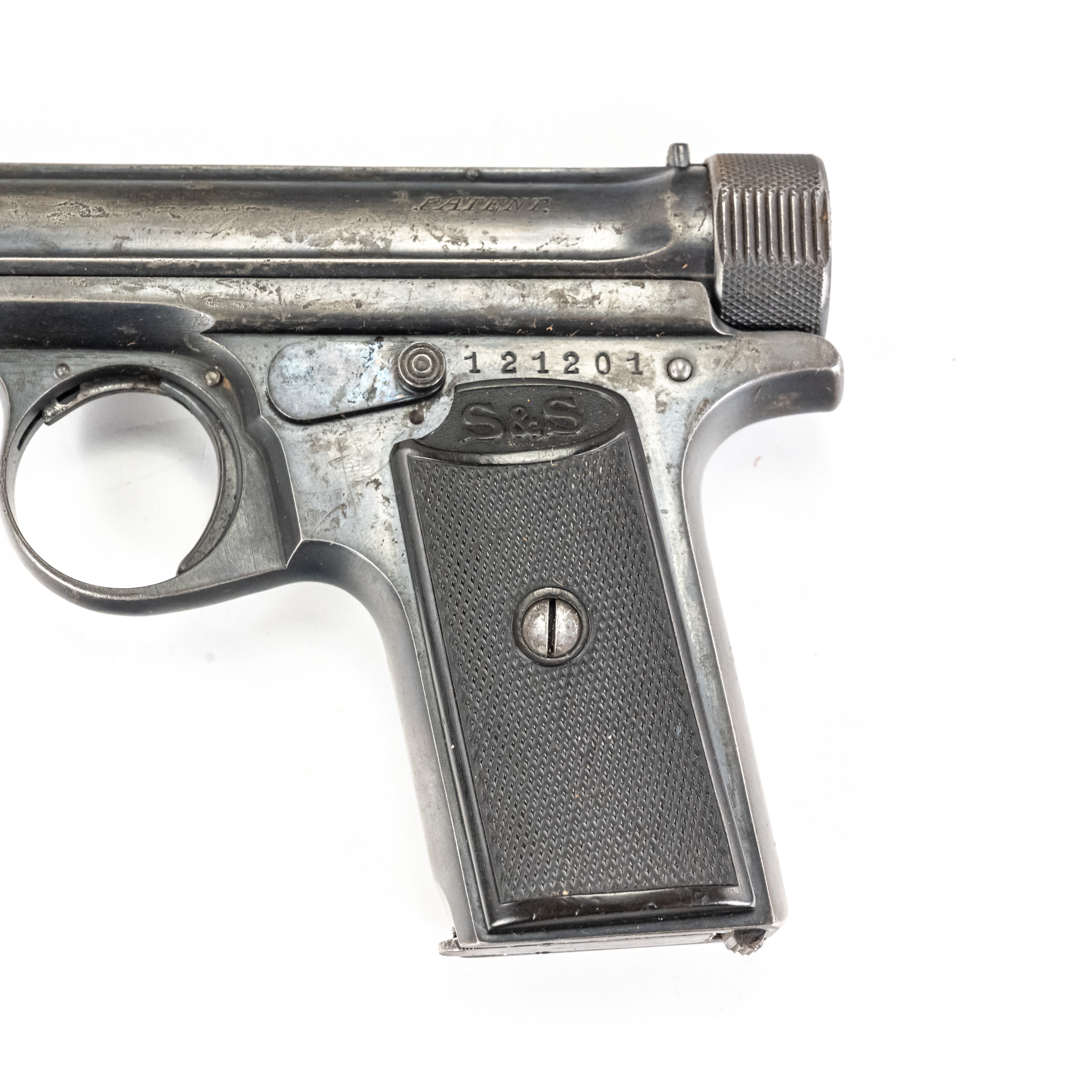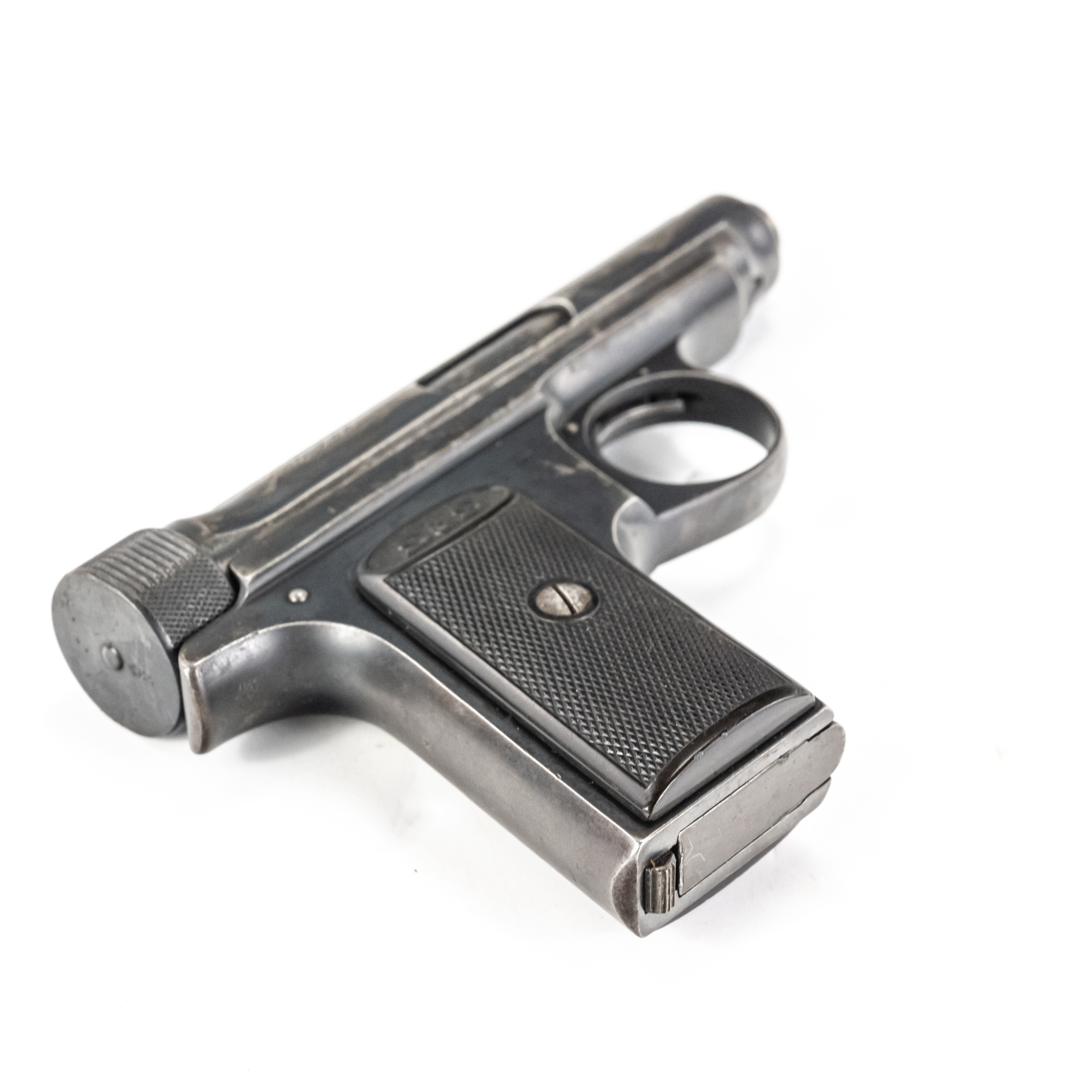 Sauer Model 1913 pistol. Caliber 7.65mm. German made pistol was very popular among military officers in WWII. This pistol appears to be a vet bring back pistol with German military holster and extra magazine. Holster has soldiers name and where it was mailed home written inside top flap. Pistol shows moderate signs of use and long years of storage in its holster. Very neat designed handgun with a story.