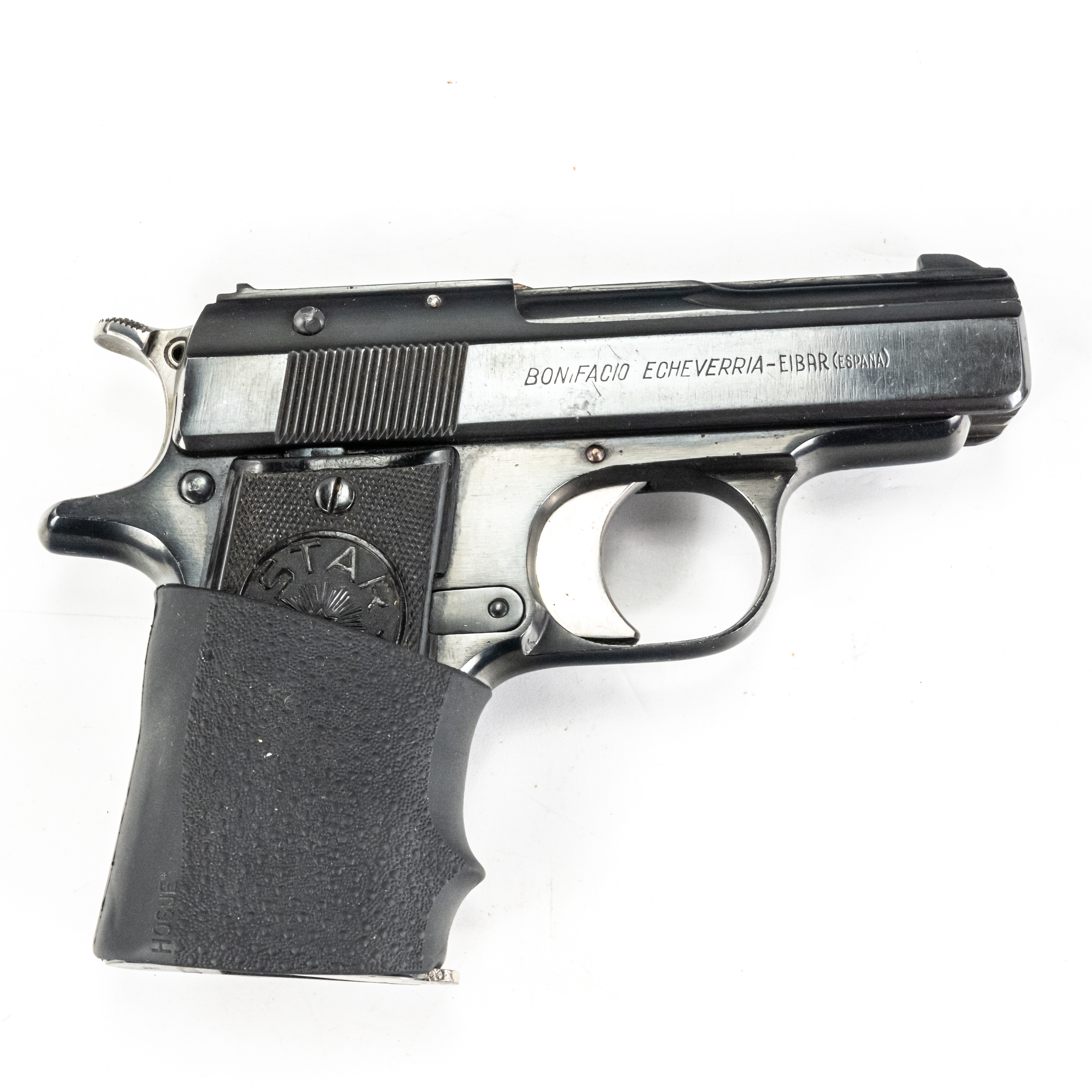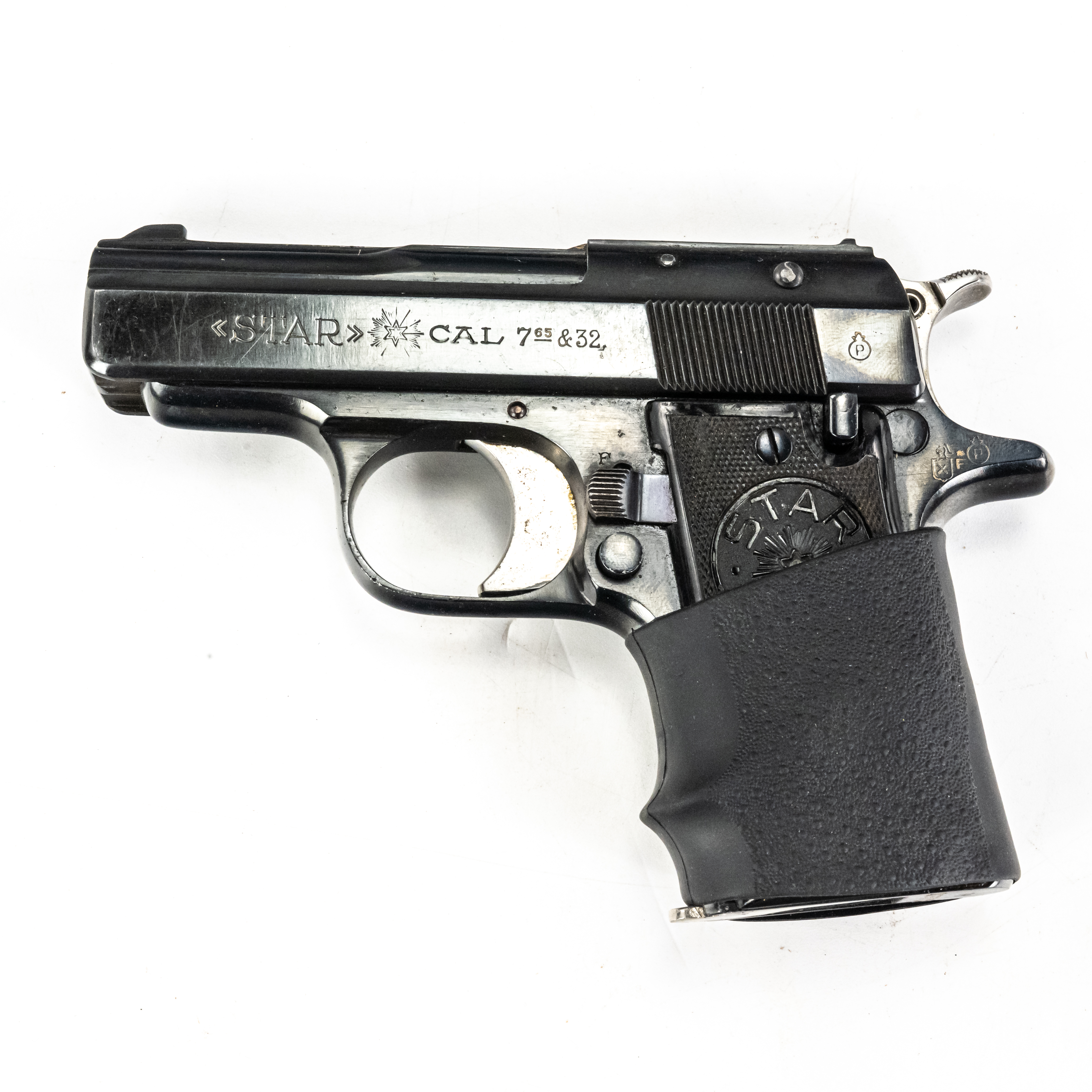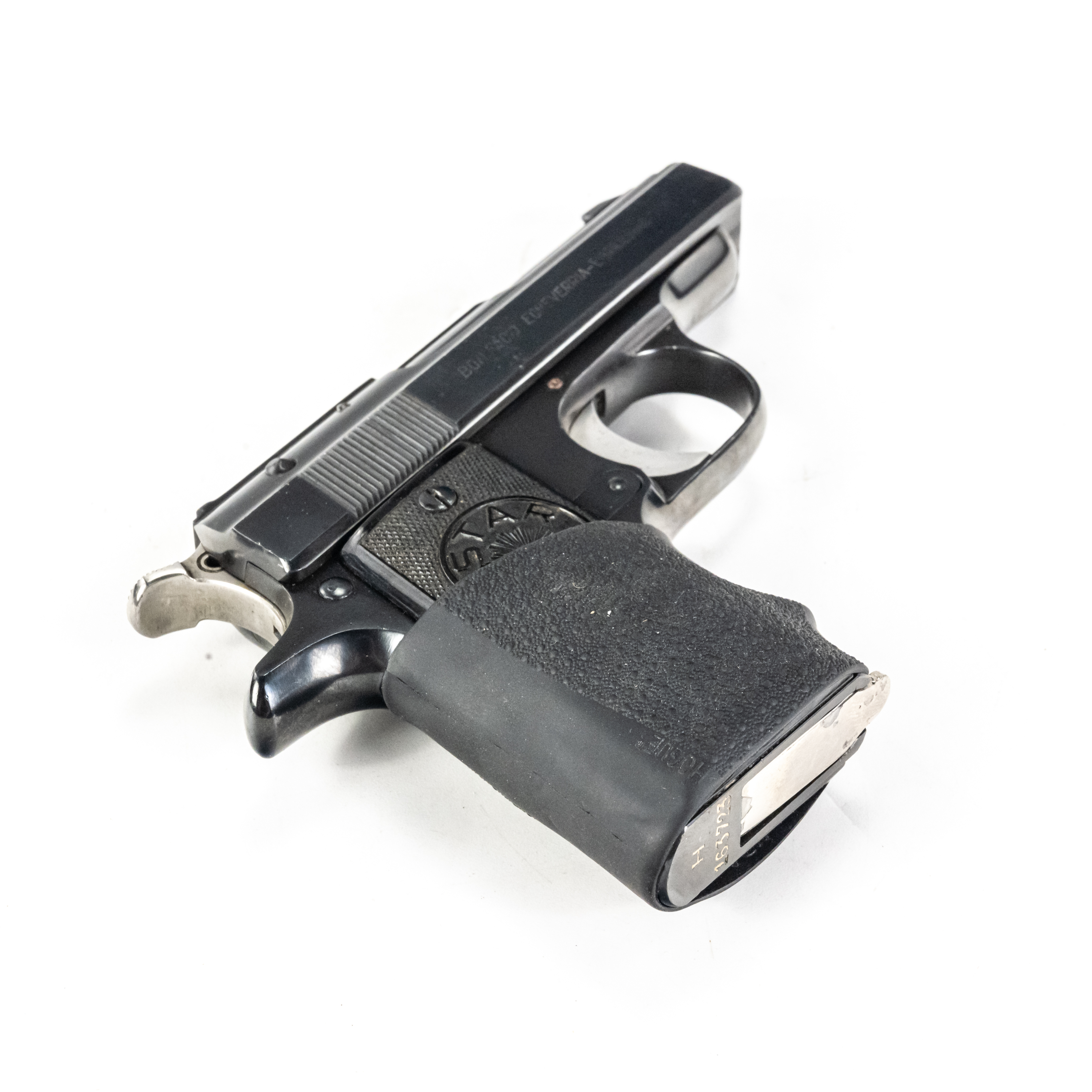 Star Model H Pistol. Caliber .32ACP/7.65mm. 1930s Spanish made pocket pistol. Very limited production fixed barrel handgun is in excellent condition for age. Some finish wear from carrying and use. Pistol has hogue slip on grip fitted. Nice all steel pocket gun. See photos.