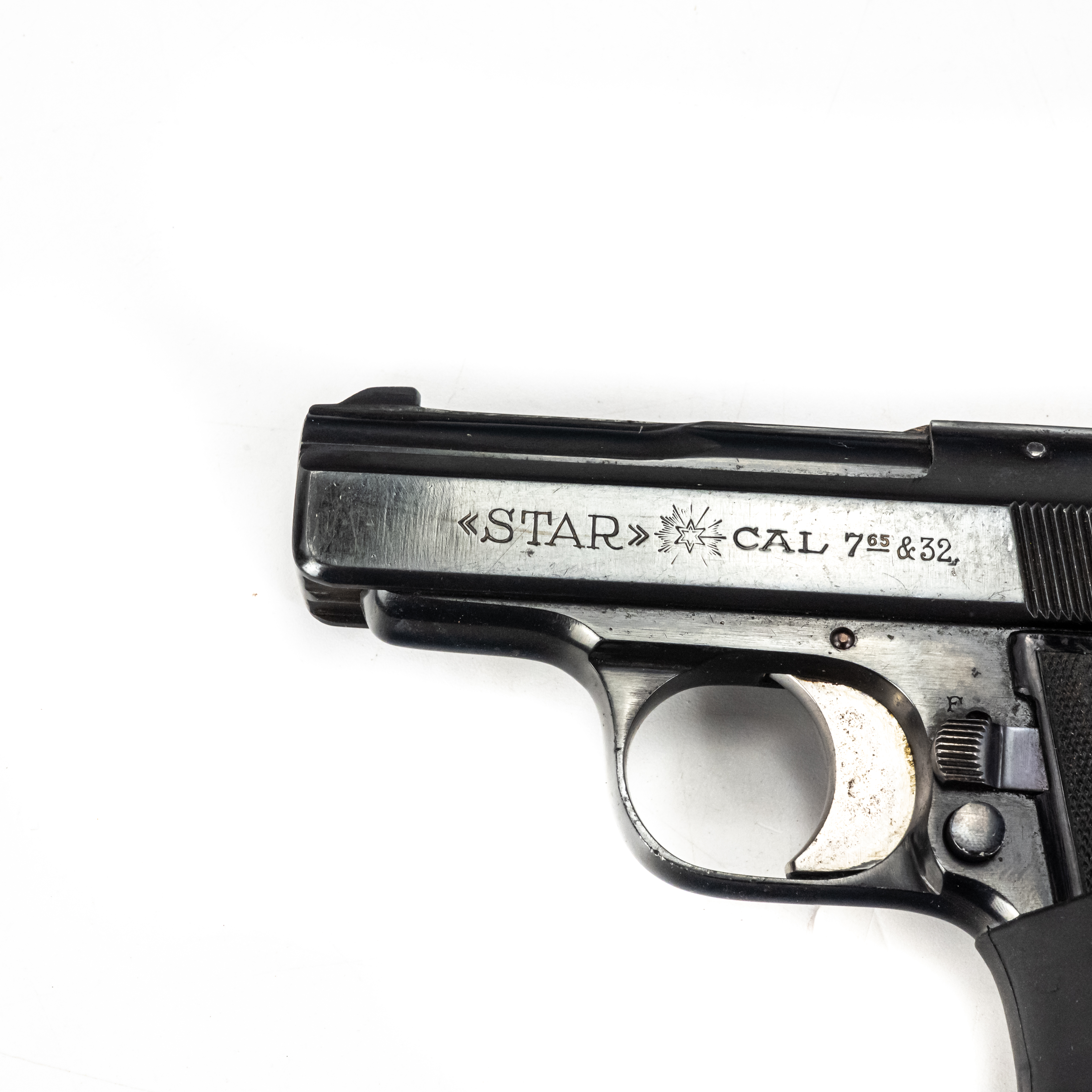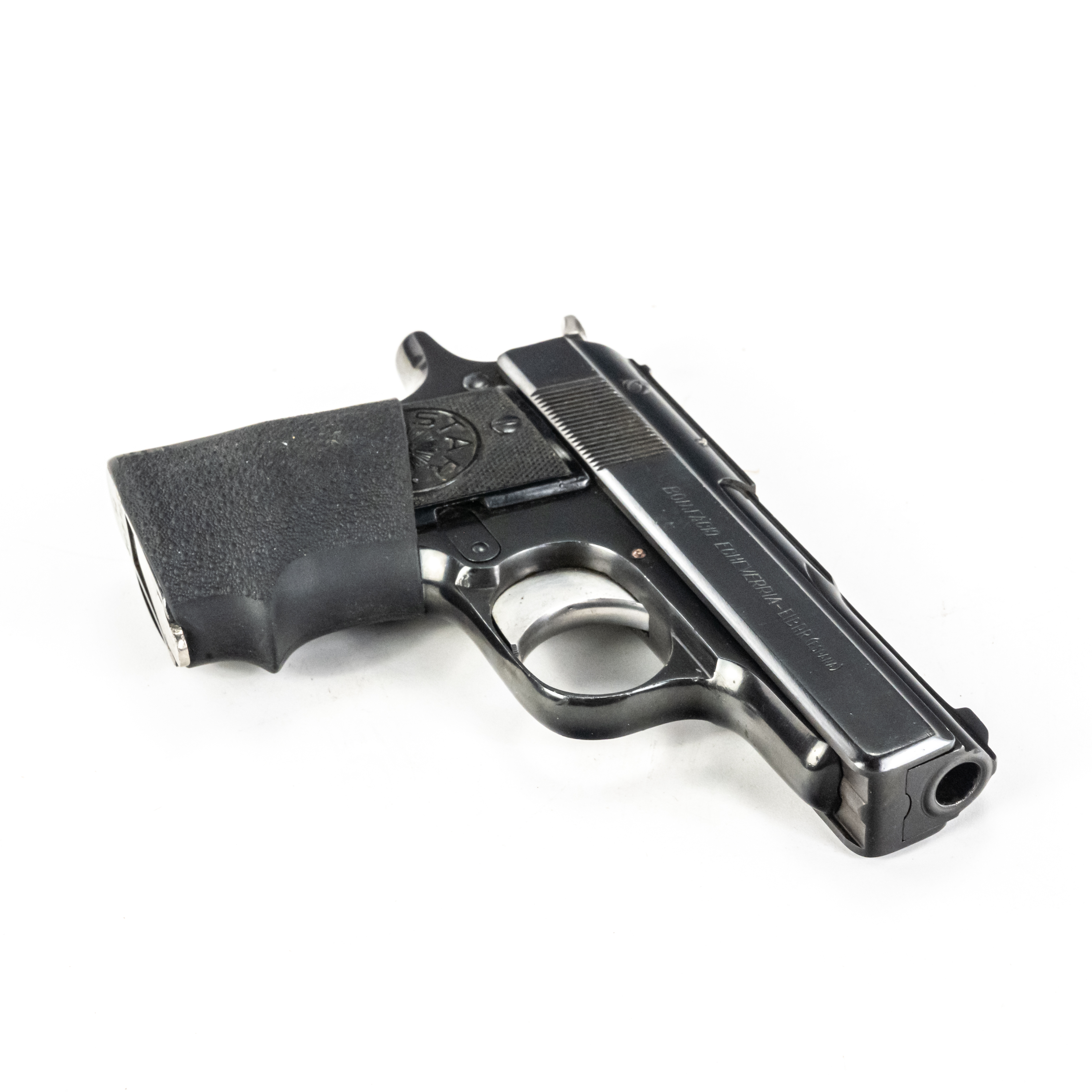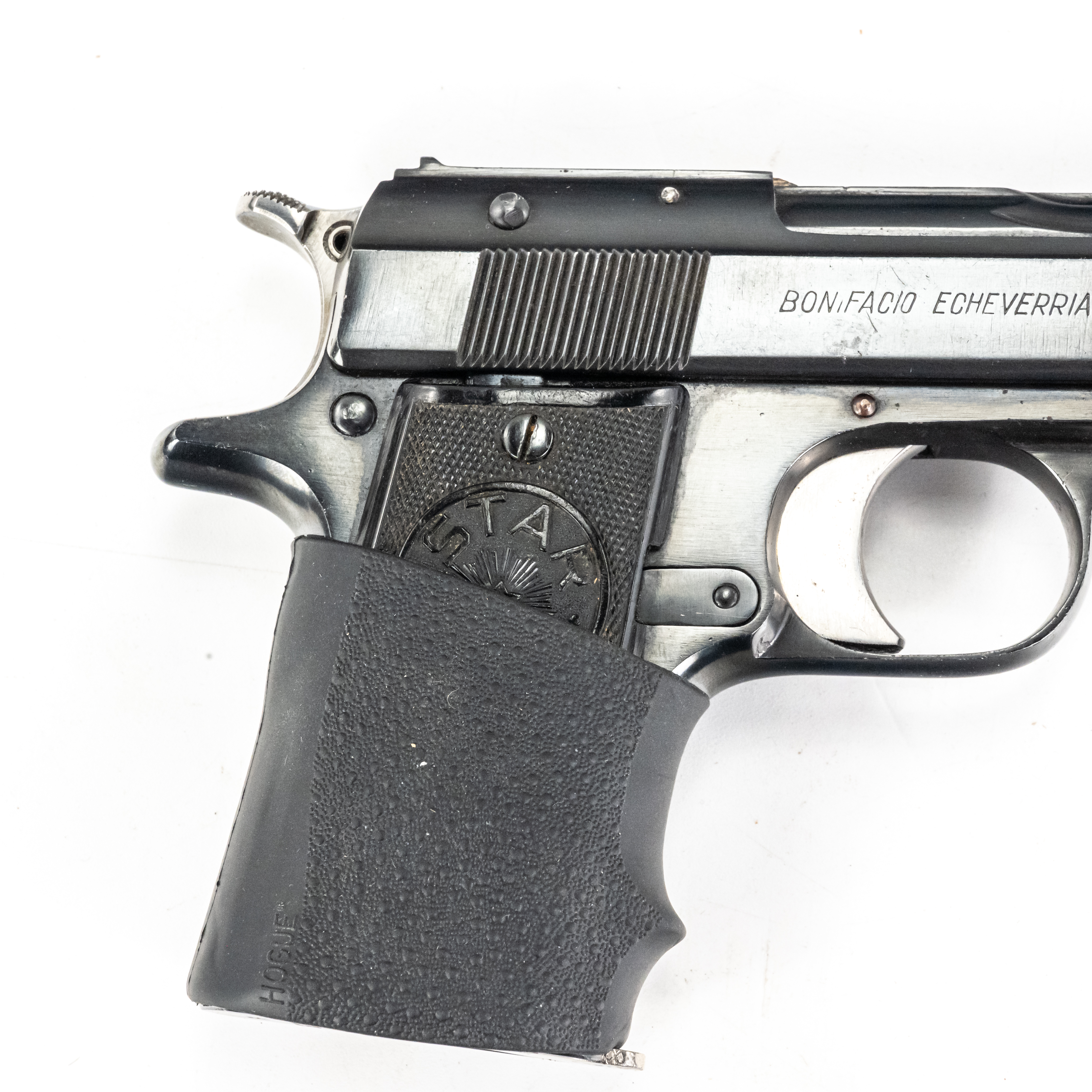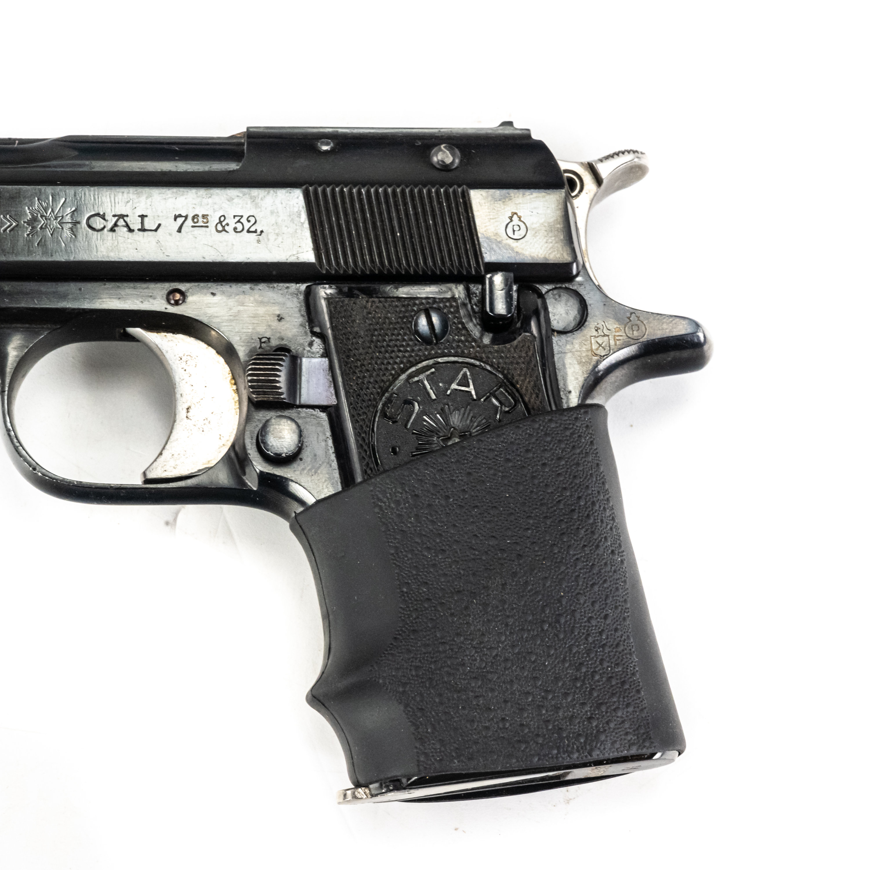 Star Model H Pistol. Caliber .32ACP/7.65mm. 1930s Spanish made pocket pistol. Very limited production fixed barrel handgun is in excellent condition for age. Some finish wear from carrying and use. Pistol has hogue slip on grip fitted. Nice all steel pocket gun. See photos.