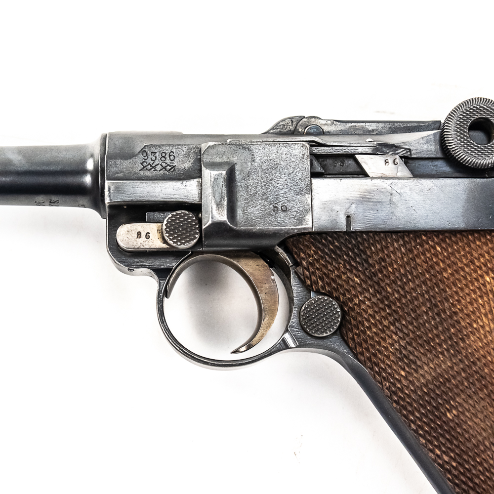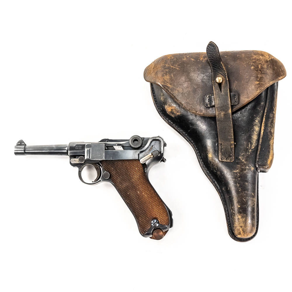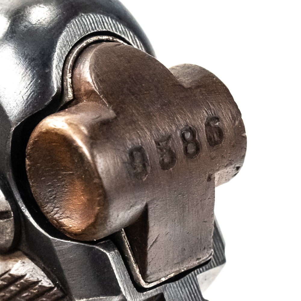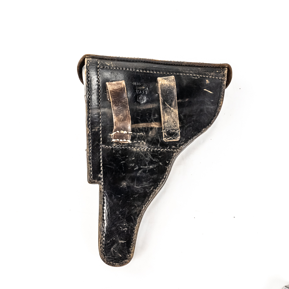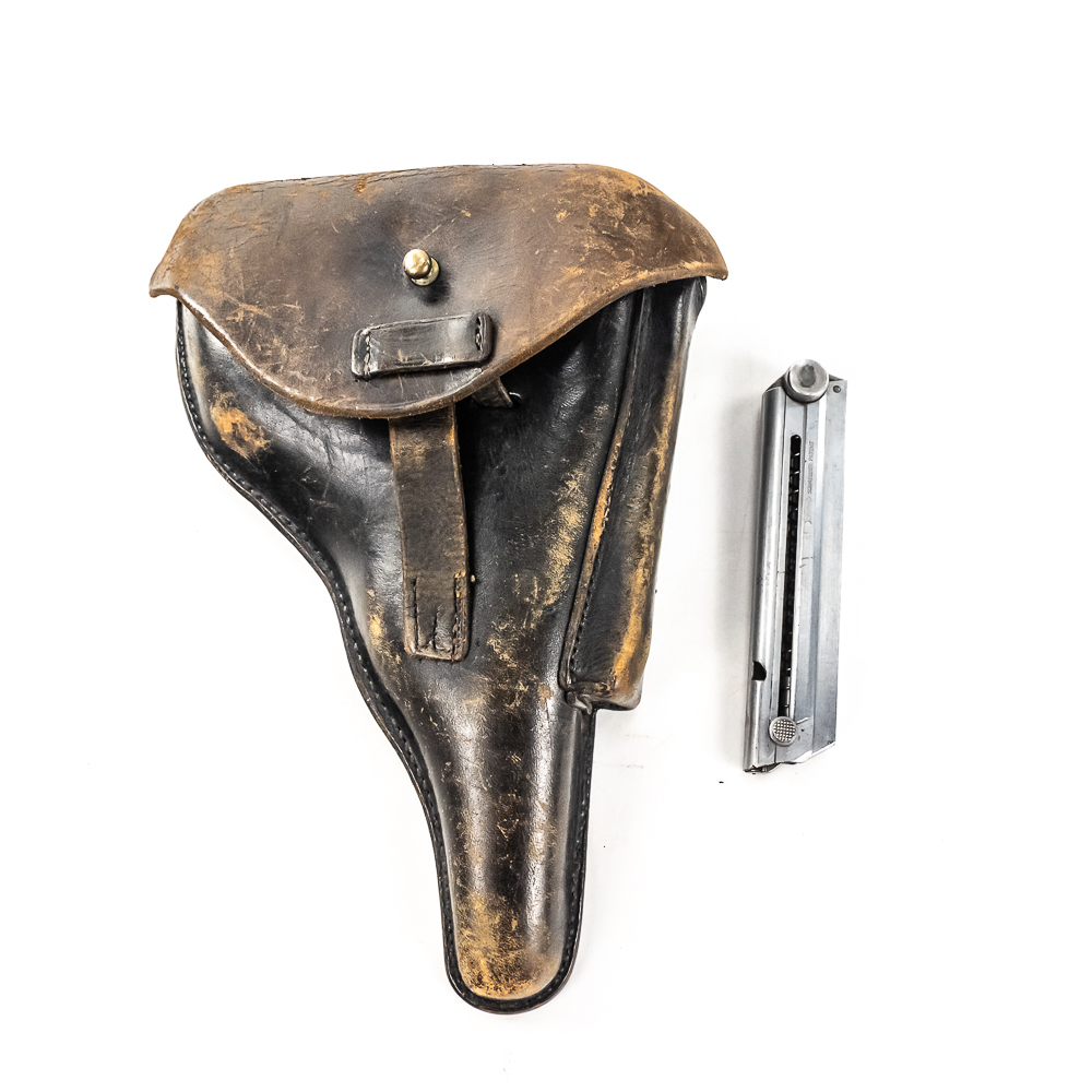 Russian Capture Dual Date DWM Luger 9mm Pistol in VERY good vintage condition. Slide serial number x’d out (Russian capture) the rest of the visible serial numbers match match to the re-stamp including the wooden base magazine. This is a dual date stamp (1918-1920). Comes with a police holster (Otto-Sindel Berlin 1934), tool second magazine (aluminum base). C&R Eligible S/N:9386