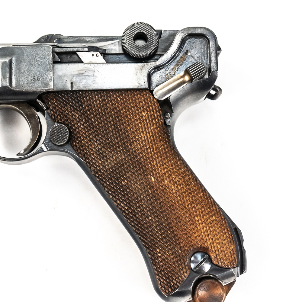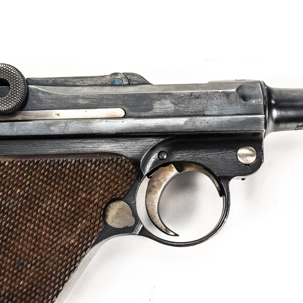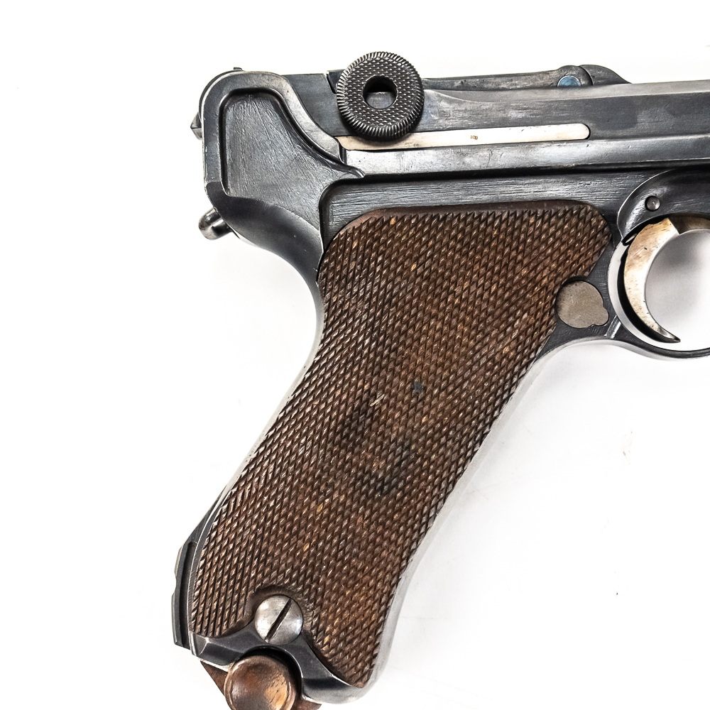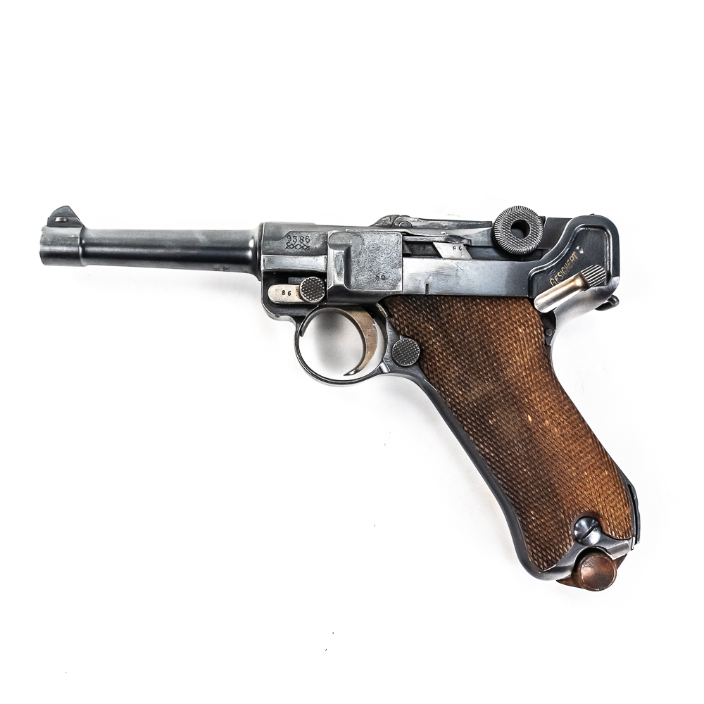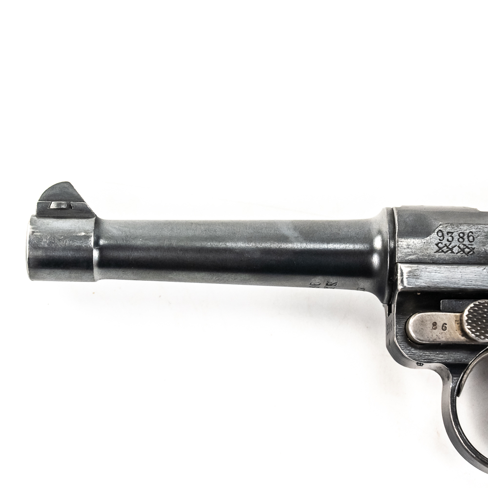 Russian Capture Dual Date DWM Luger 9mm Pistol in VERY good vintage condition. Slide serial number x’d out (Russian capture) the rest of the visible serial numbers match match to the re-stamp including the wooden base magazine. This is a dual date stamp (1918-1920). Comes with a police holster (Otto-Sindel Berlin 1934), tool second magazine (aluminum base). C&R Eligible S/N:9386