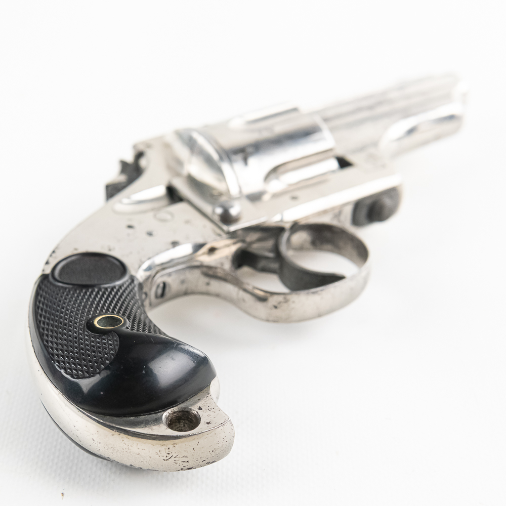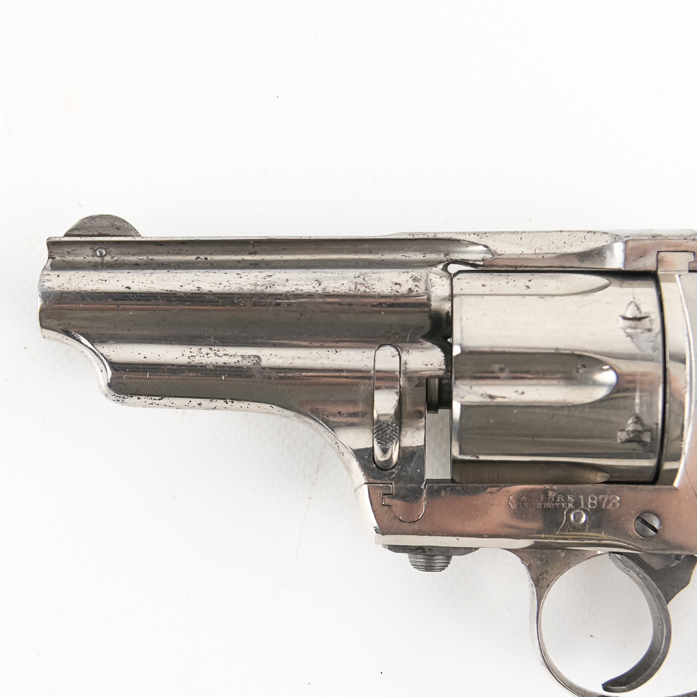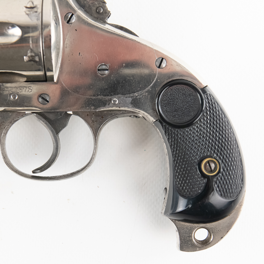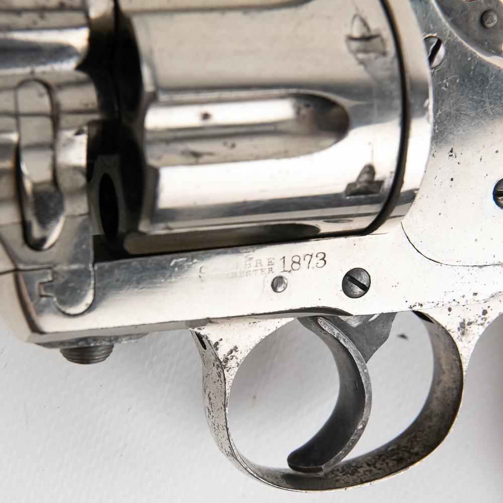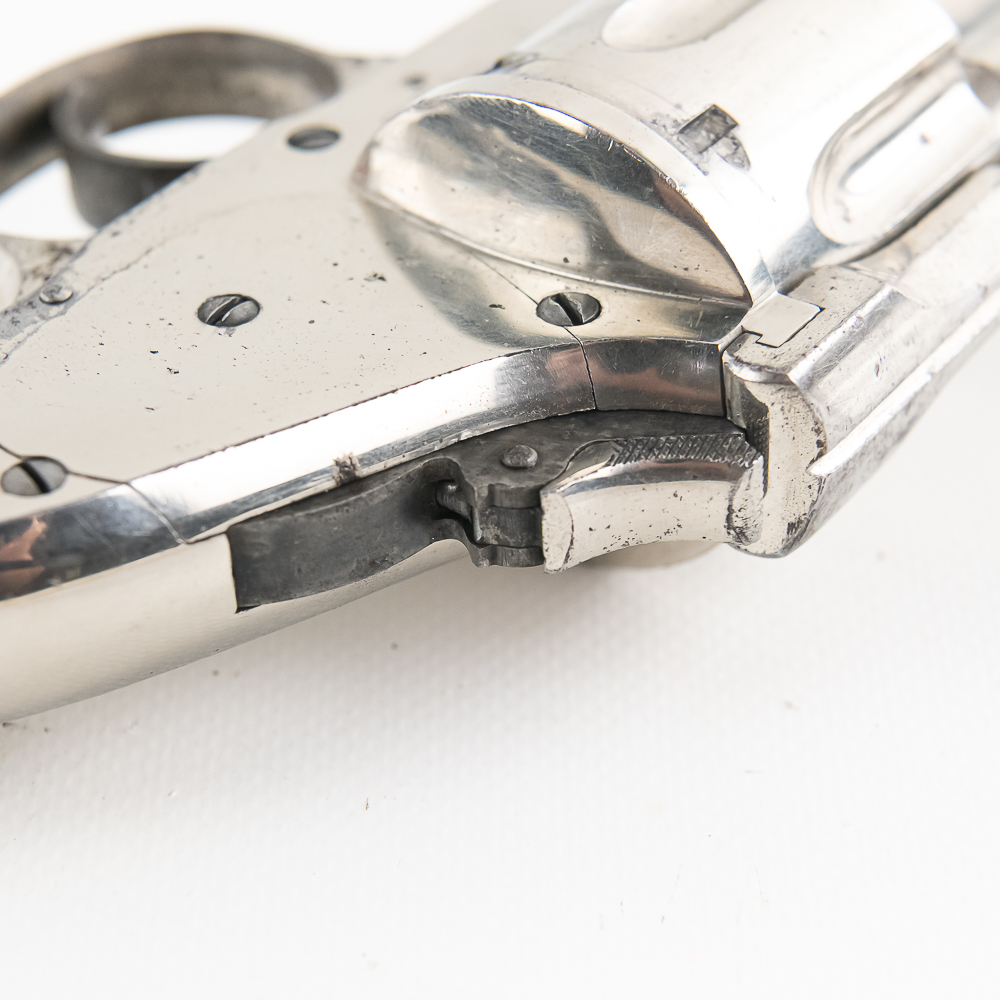 Merwin & Hulbert 1873 .44-40 Revolver in excellent vintage condition with an excellent bore. Folding hammer. Jesse James, Bass Reeves, Pat Garret, were all users of what was considered to be the best made and most innovative of the Large Frontier Revolvers, the products of Merwin, Hulbert Co., including the very well known example we have here a 3rd Model Pocket Army in the man killing .44-40 caliber. Known as the “Skull Crusher” due to the heavy extended birdshead grip. This is a great example with the factory original black grips and the company standard nickel finish. The gun has seen little actual use with a excellent bore and no evidence of corrosive black powder use and about 85% of the original nickel finish remaining. Mechanically the gun is tight. At the time of its widespread use on the Frontier of the Old West, the Merwin Hulbert Large Frame Revolvers were highly thought of. They could be unloaded and reloaded more quickly than any other revolver of the day and they were much stronger and were built like a Swiss Watch with tolerances that are the equal of anything made today, 150 years later. Indeed a serious attempt was made to reproduce them in 2014 and it came to naught because of the high cost that would be involved in re-creating such intricate perfection. C&R Eligible S/N:278