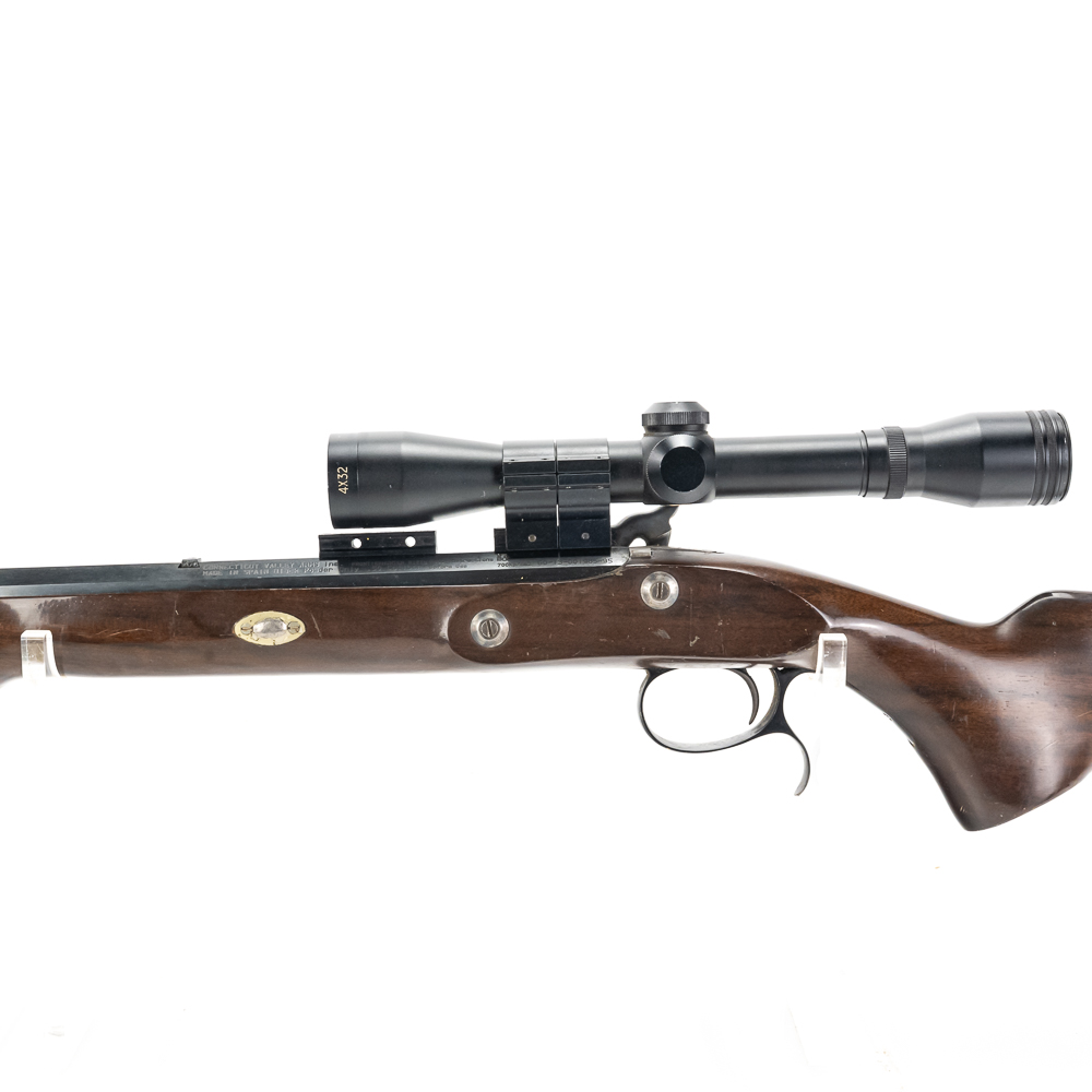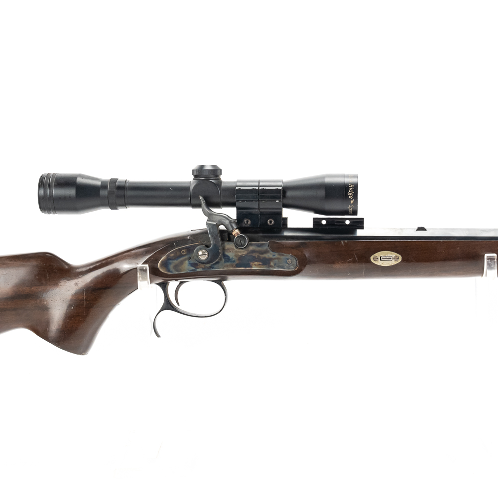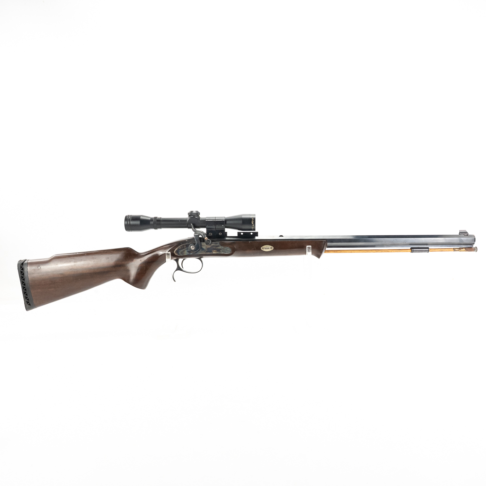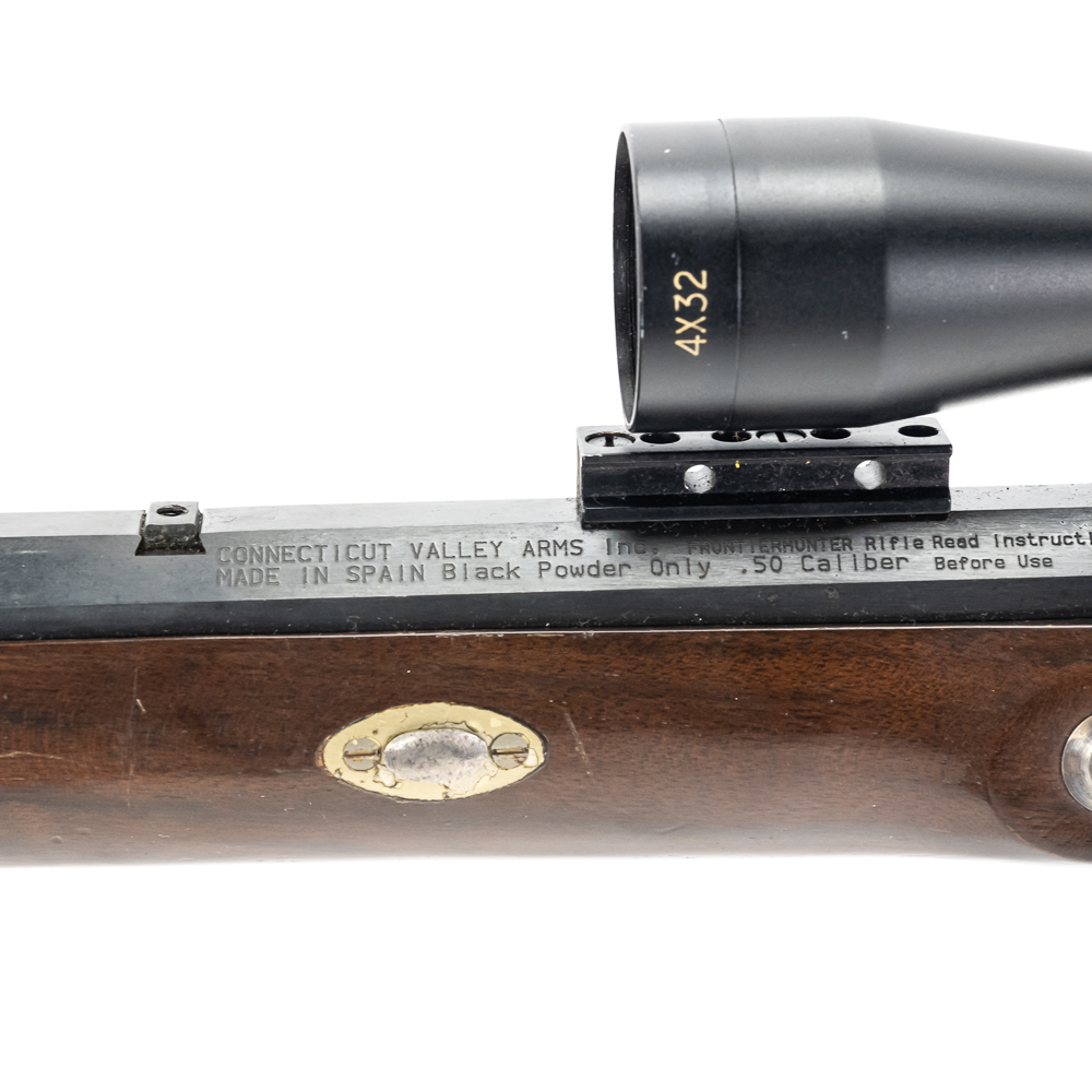 Connecticut Valley Arms Frontier Hunter Rifle. Spanish reproduction black powder rifle with modifications to make easier to use. 24″ octagonal barrel with 4×32 scope mounted and recoil pad on special longer length stock. Rifle is in good used condition with wear to metal and wood from being used. Barrel has some surface rust and bluing lost from use. Good muzzleloader for a beginner. See photos.