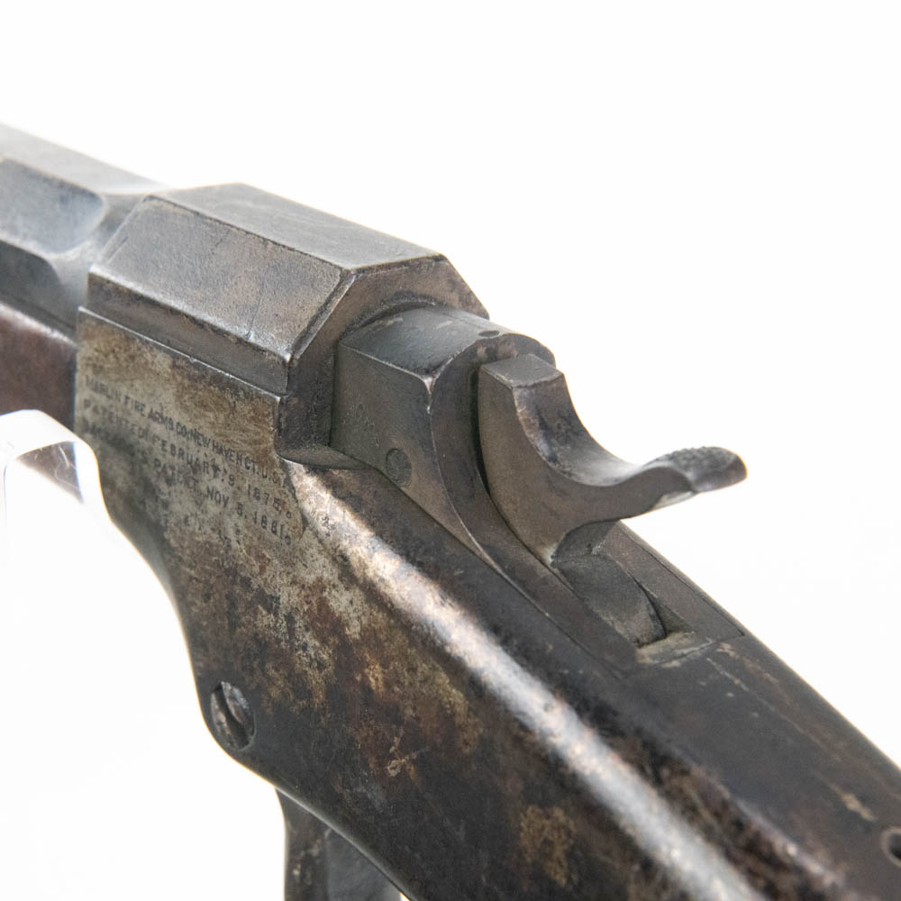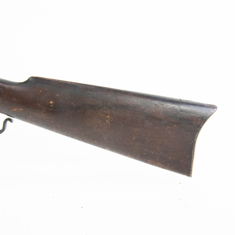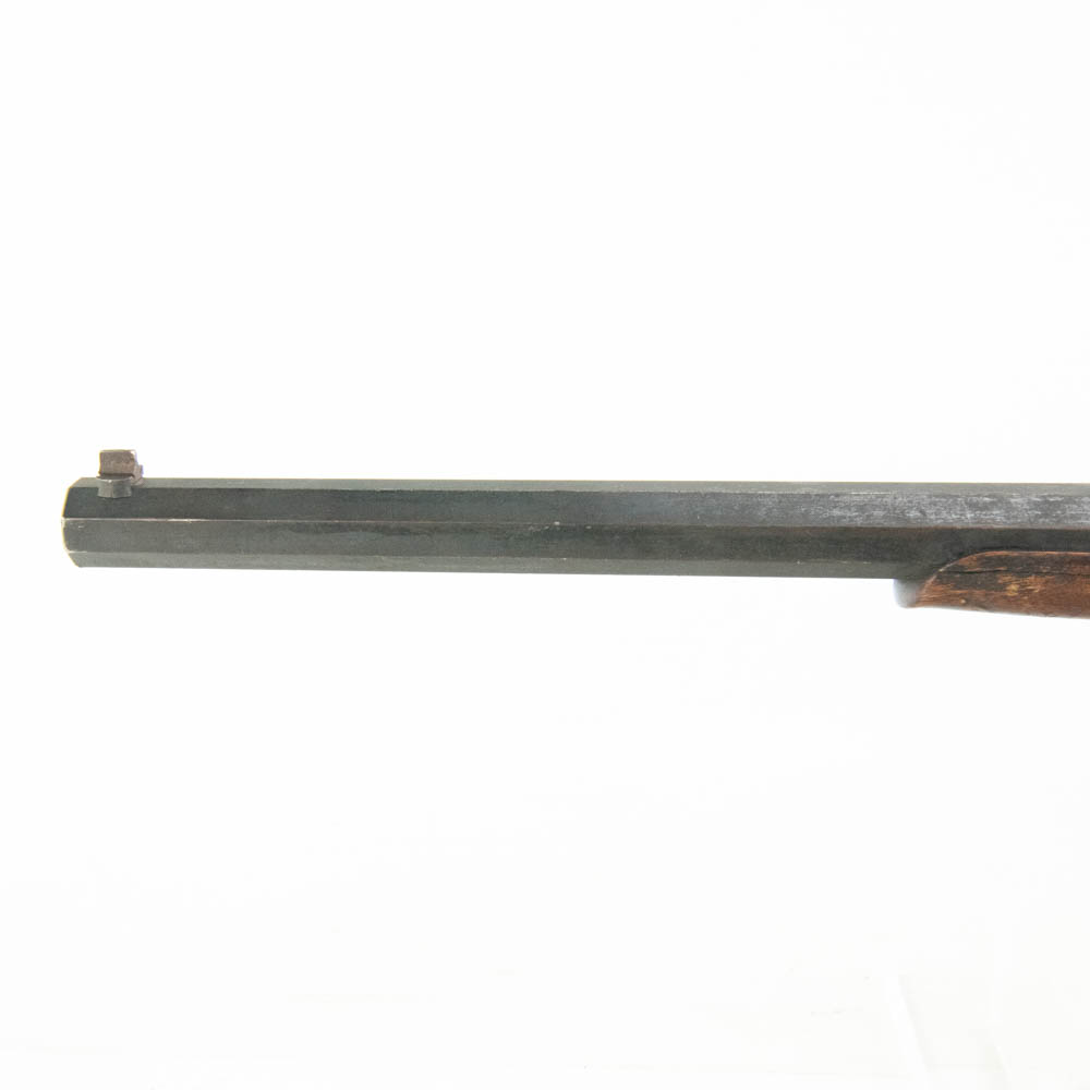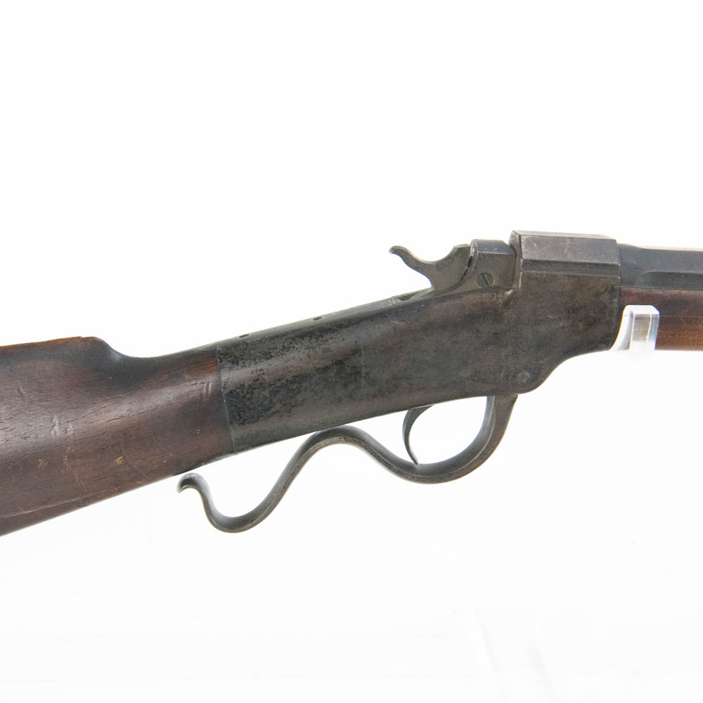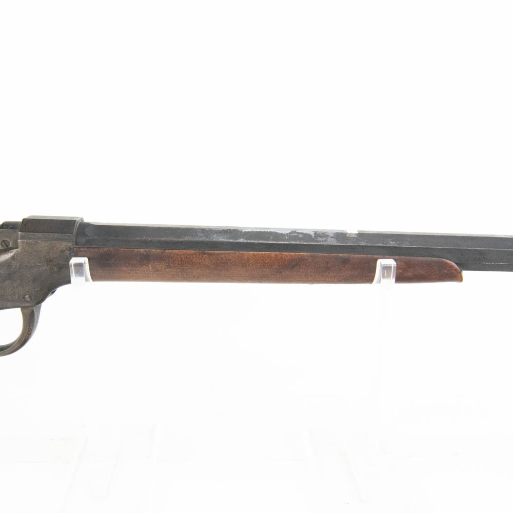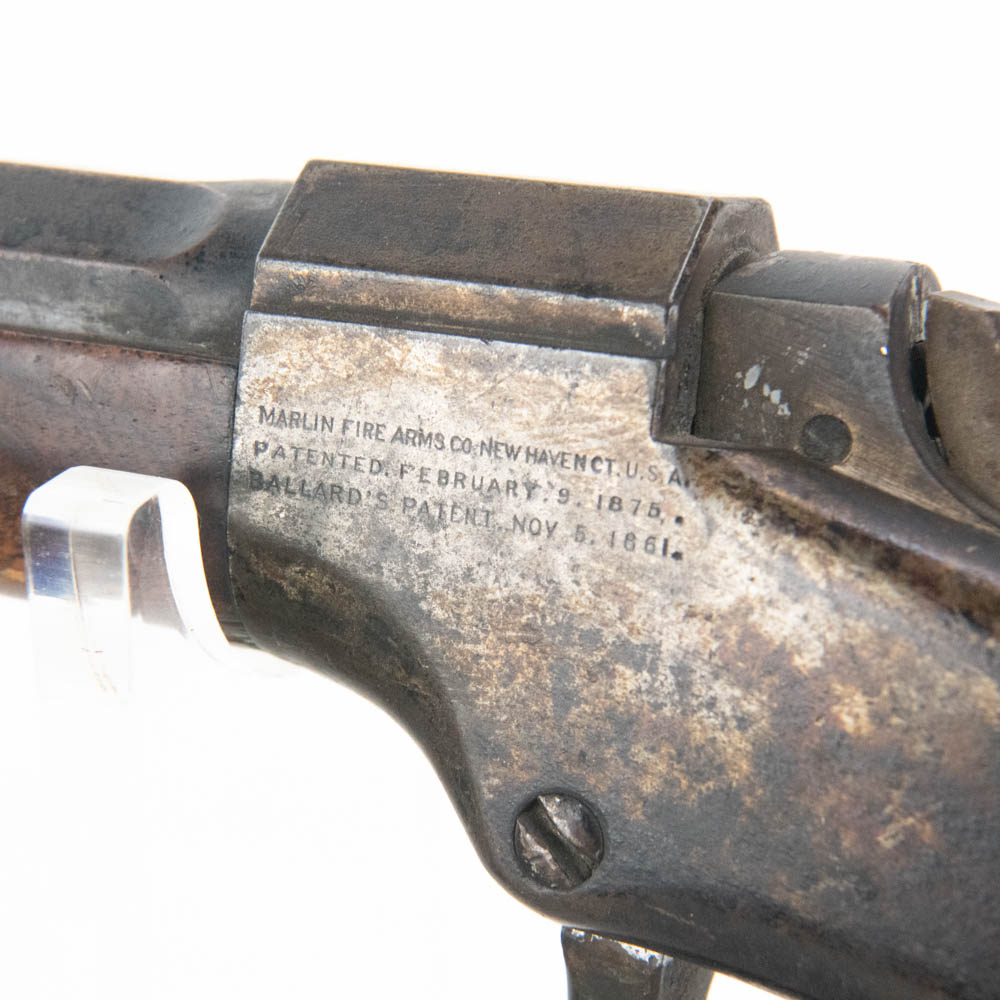 Ballard Patent dropping block rifle made by the Marlin Firearms company. Caliber appears to be 38-55, but no visible markings to confirm. Very interesting late 1800s sporting rifle with 20″ octagonal heavy barrel. Rifle is missing rear buckhorn sight on barrel as well as folding Vernier sight from wrist on stock. Gun is in very good condition for age with lots of original finish remaining on barrel and receiver. Stock and forend have dents, dings and gouges, as well as one crack on forend. Interesting turn of the century rifle. See photos.