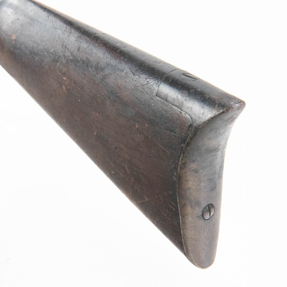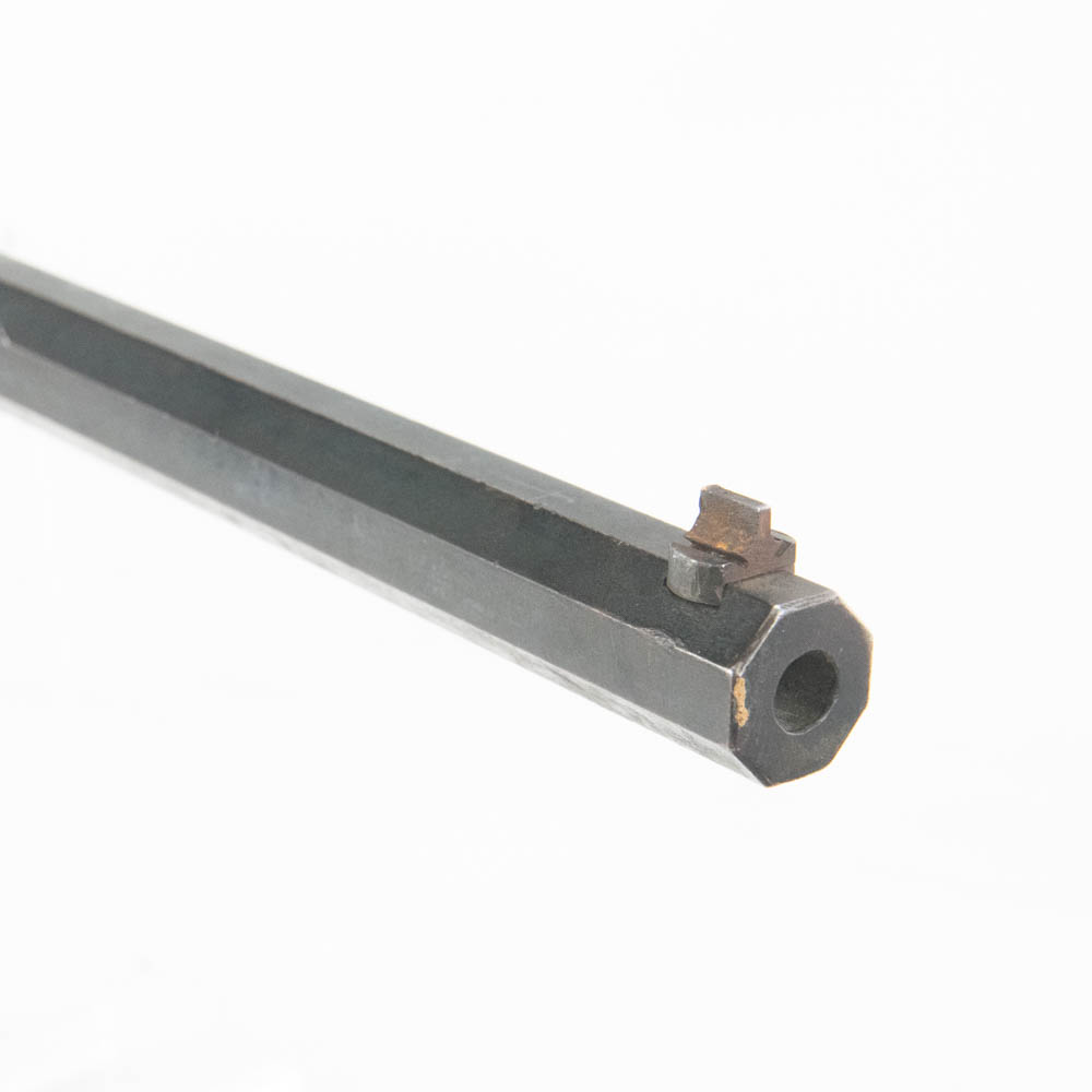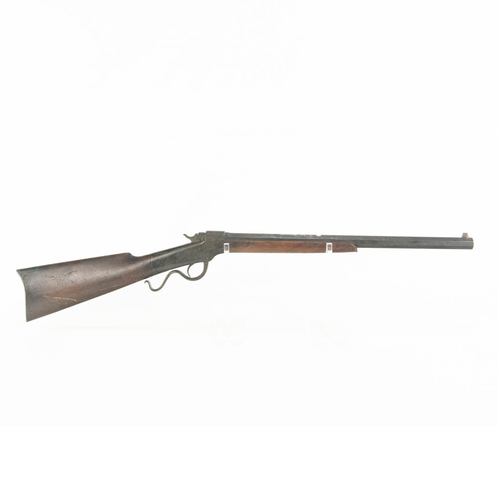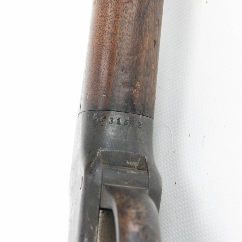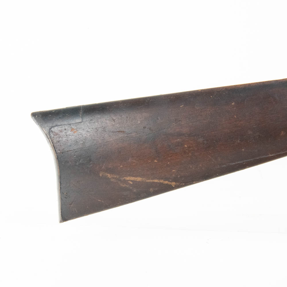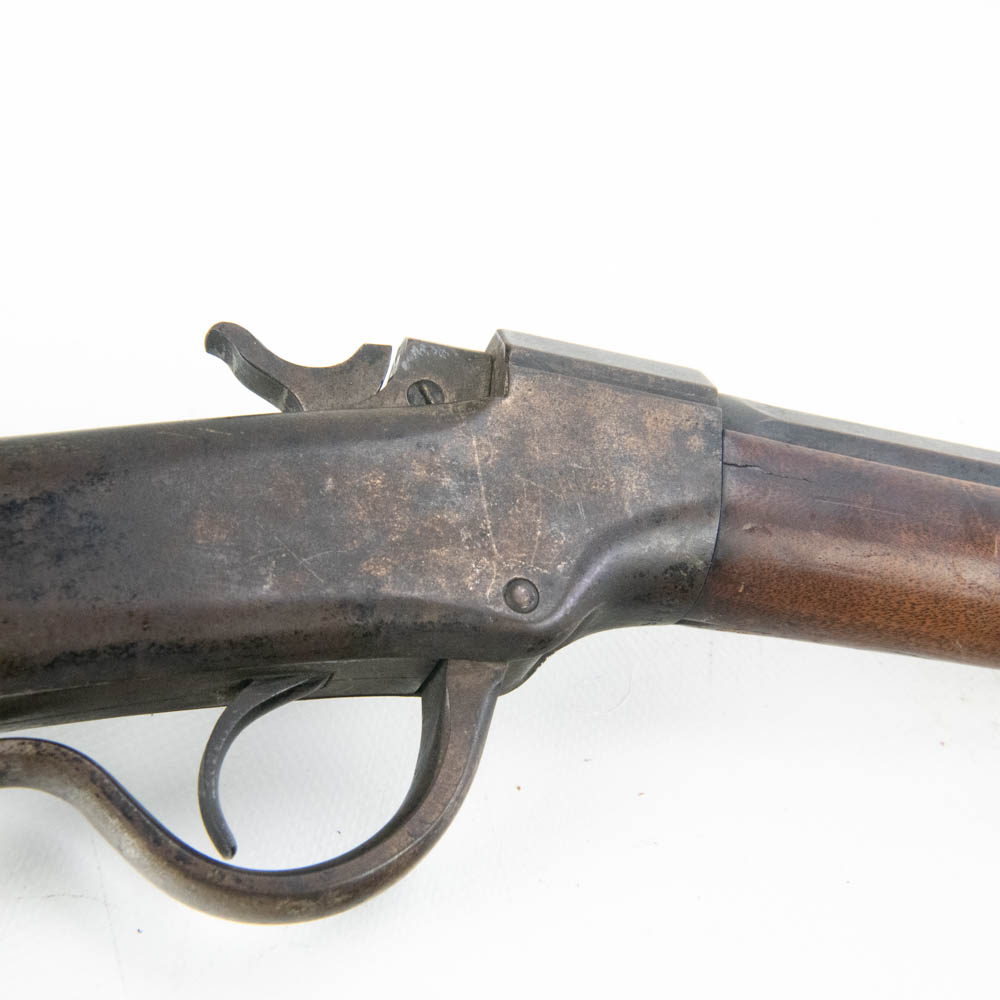 Ballard Patent dropping block rifle made by the Marlin Firearms company. Caliber appears to be 38-55, but no visible markings to confirm. Very interesting late 1800s sporting rifle with 20″ octagonal heavy barrel. Rifle is missing rear buckhorn sight on barrel as well as folding Vernier sight from wrist on stock. Gun is in very good condition for age with lots of original finish remaining on barrel and receiver. Stock and forend have dents, dings and gouges, as well as one crack on forend. Interesting turn of the century rifle. See photos.