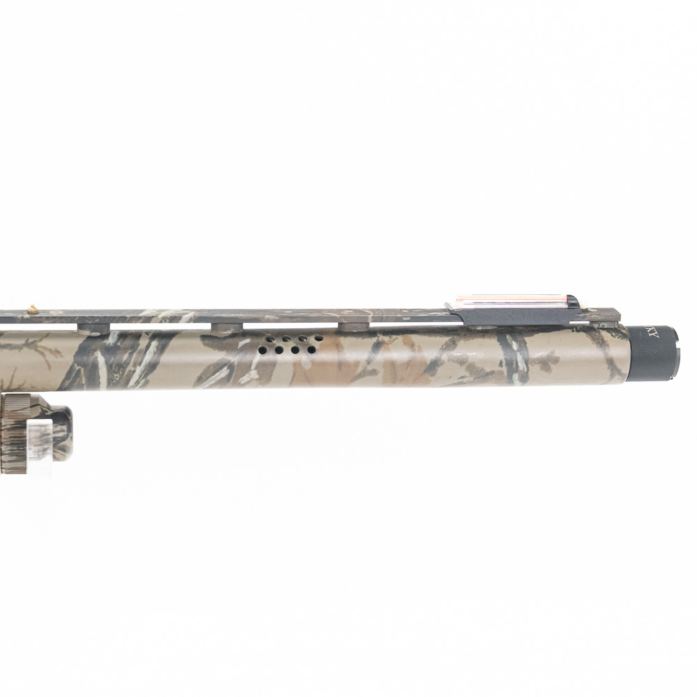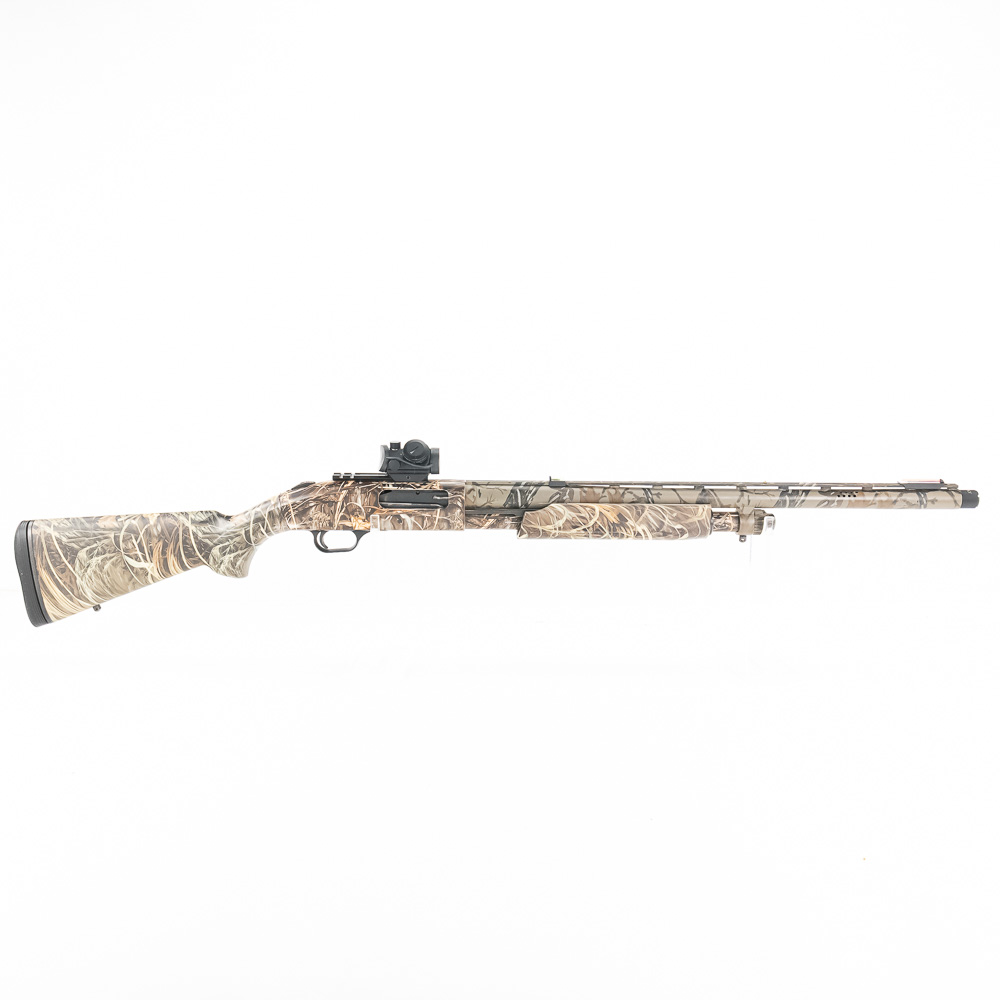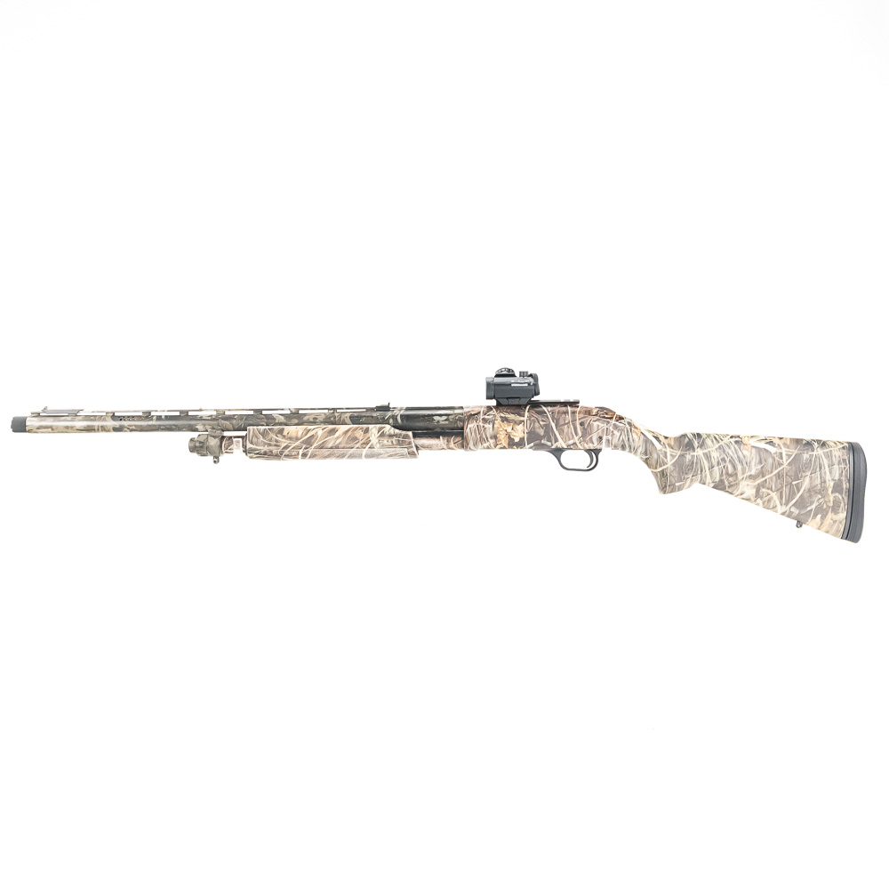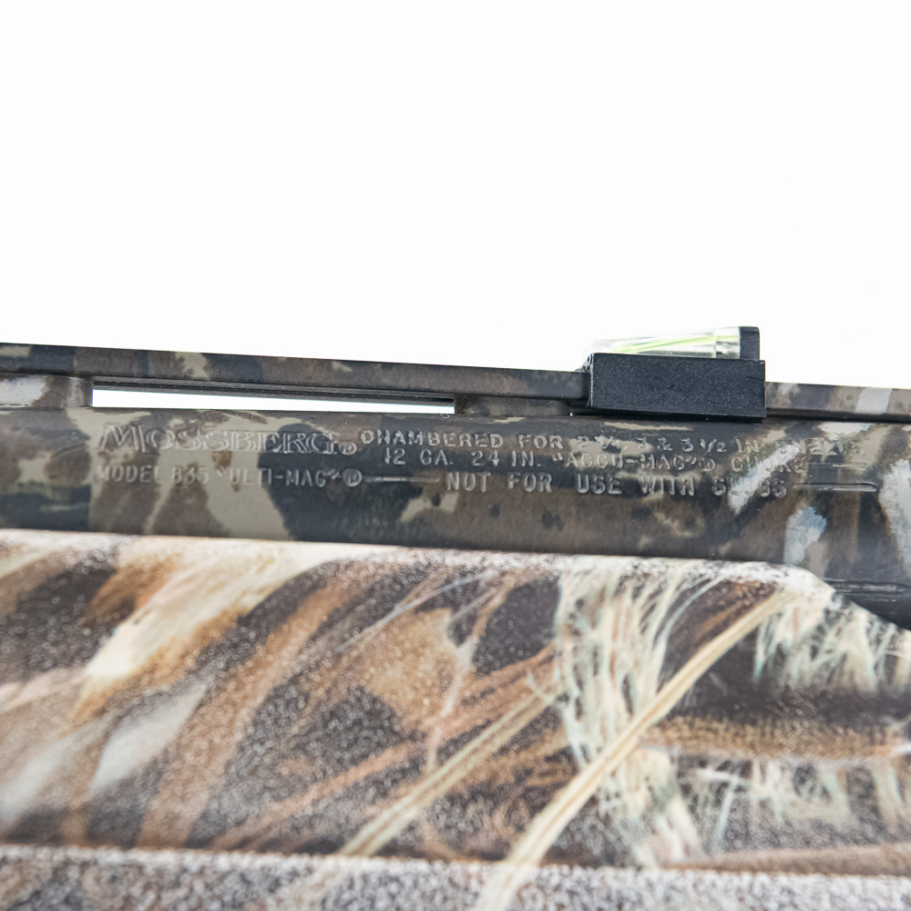 Mossberg 835 Ulti-Mag Turkey Shotgun. Caliber 12 Ga. Ulti-Mag shotgun fires up to a 3.5” magnum 12ga shell. Turkey hunter model shotgun has factory Mossy Oak Camouflage finish and ported 24″ barrel. Shotgun has Bushnell Red dot sight and fiber optic sights added to vent rib on barrel. Shotgun appears to be moderately shot but well taken care of. Synthetic furniture shows very little wear. Excellent turkey gun comes with zipper case. See photos.