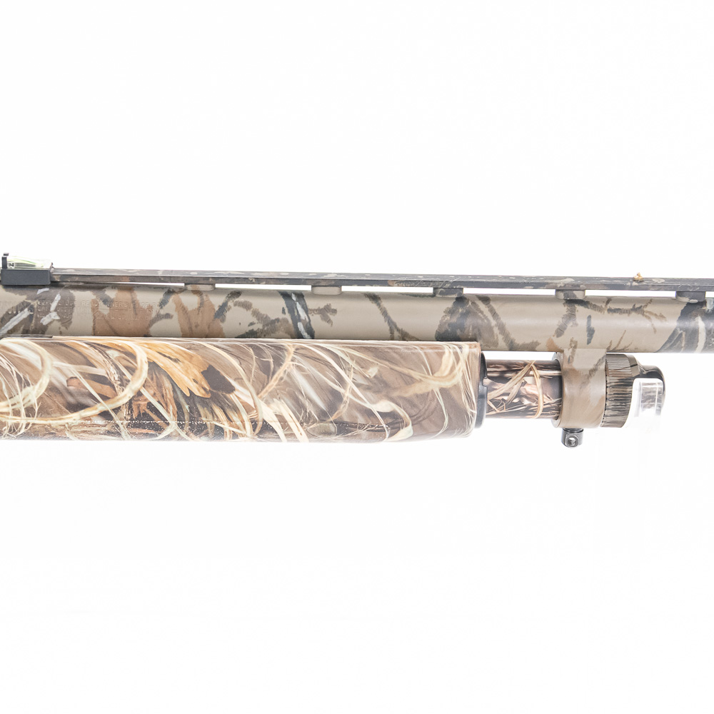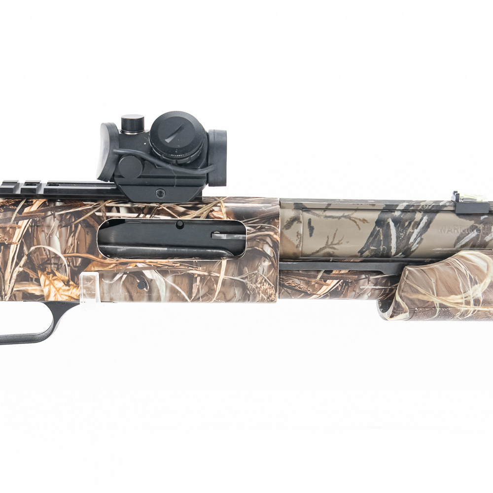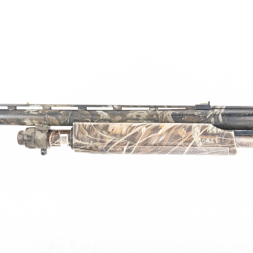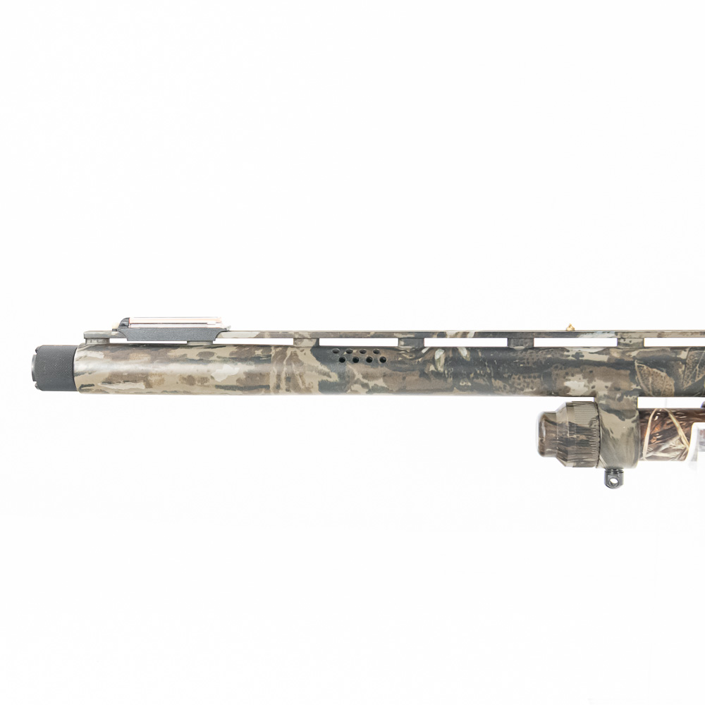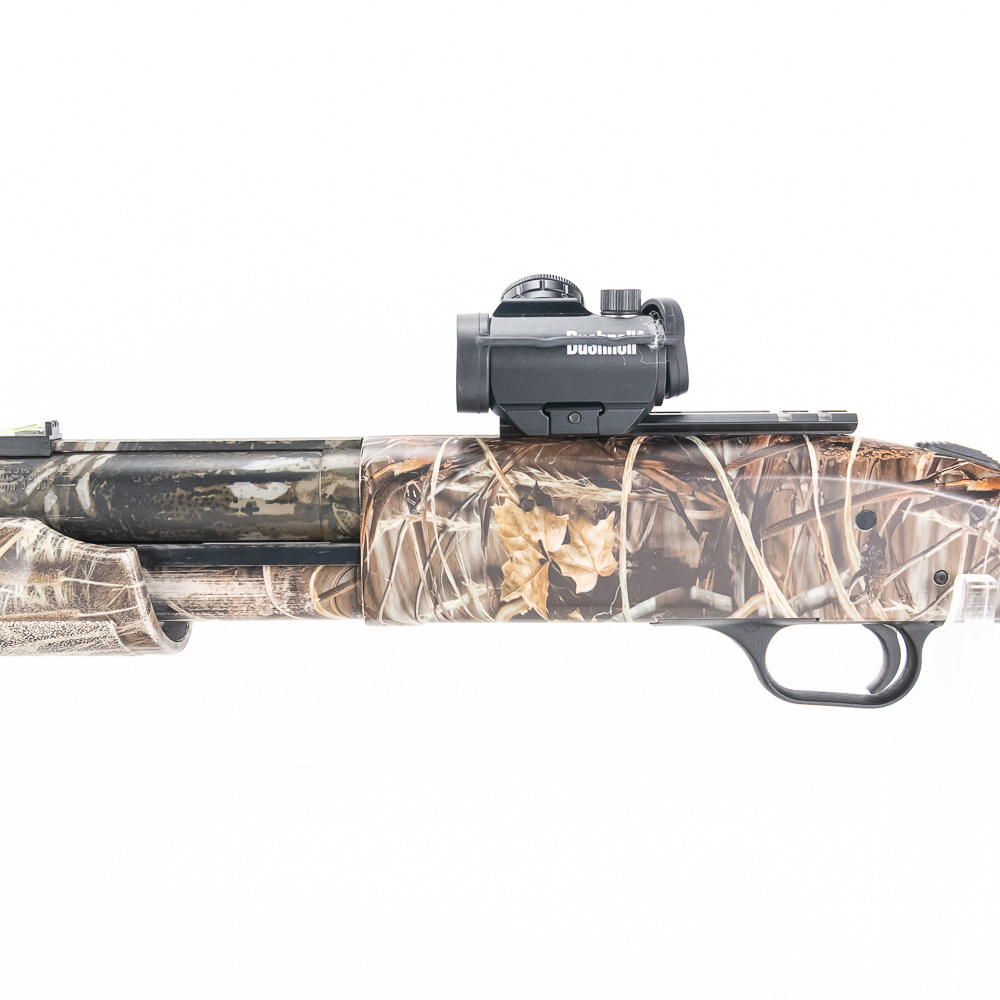 Mossberg 835 Ulti-Mag Turkey Shotgun. Caliber 12 Ga. Ulti-Mag shotgun fires up to a 3.5” magnum 12ga shell. Turkey hunter model shotgun has factory Mossy Oak Camouflage finish and ported 24″ barrel. Shotgun has Bushnell Red dot sight and fiber optic sights added to vent rib on barrel. Shotgun appears to be moderately shot but well taken care of. Synthetic furniture shows very little wear. Excellent turkey gun comes with zipper case. See photos.