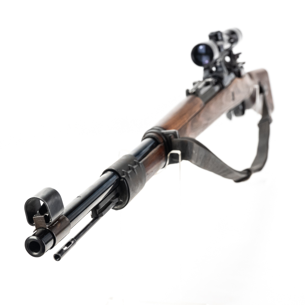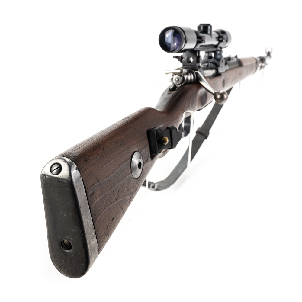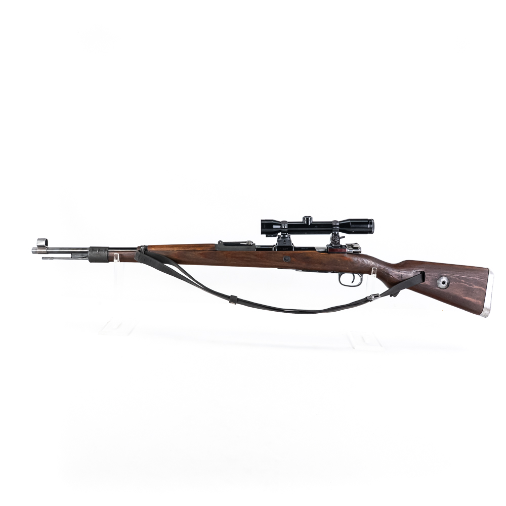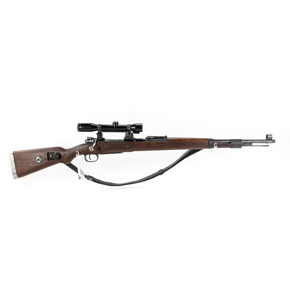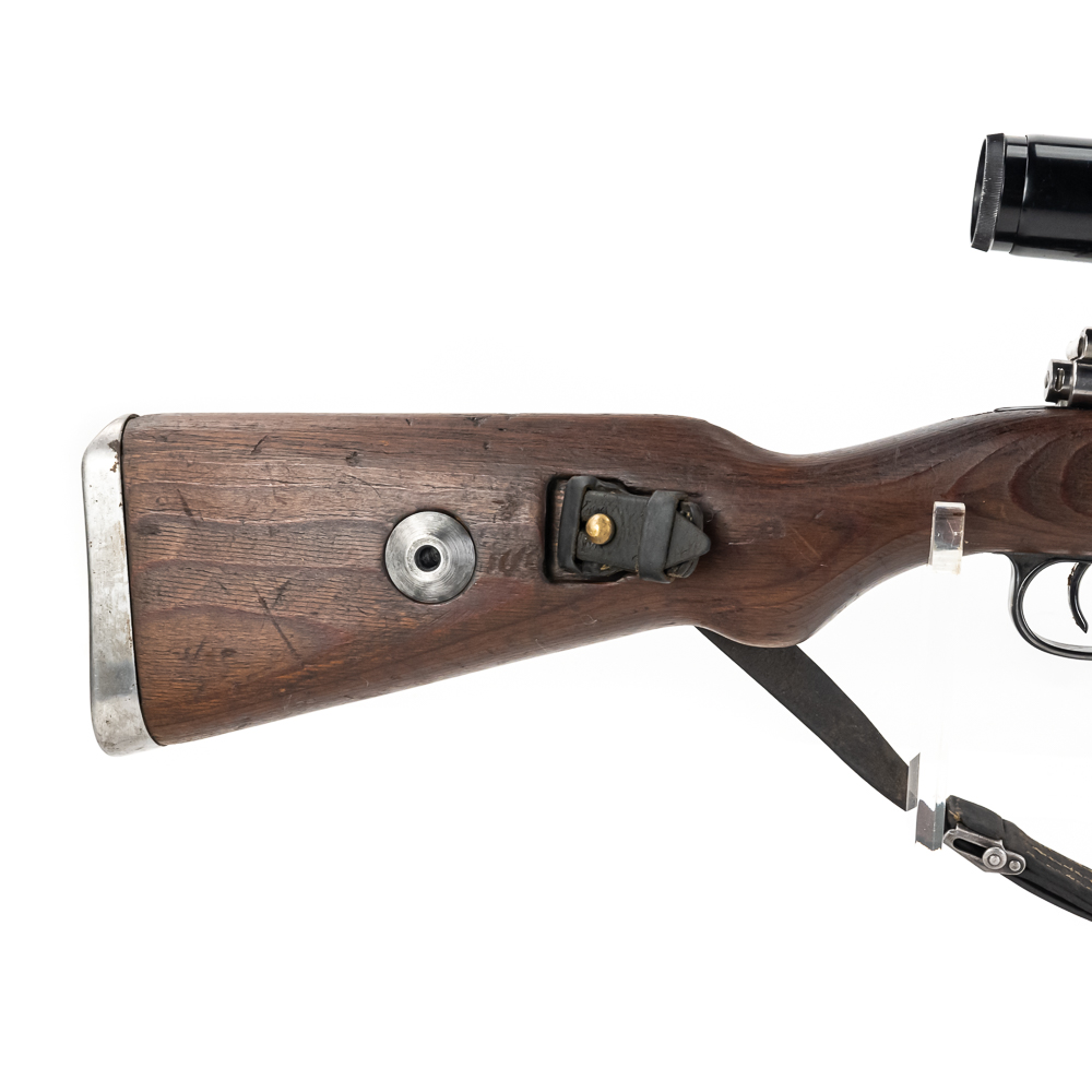 This is a World War II German Mauser K98 converted into a sniper rifle. Chambered in 8mm, this rifle displays serial number “6577” on the left side of the receiver ring and “dot 1944” on the top of the ring (covered by the scope mount). German proof markings are visible on the barrel, receiver, bolt and trigger guard assembly. The rifle is equipped with a post-war Hensoldt Wetzlar Diatal 4×32 scope, a similar design to the post-reticle World War II style. The optics are clear. The scope mounts are reproduction, however, they are the correct World War II style “see through” mounts. The rifle has been reblued and the original sling is supple and in good condition for its age. The bore and rifling are in good shape. The wood stock is in good condition, showing normal wear from use and storage. Action and trigger are smooth and tight. This is a very good quality conversion, excellent for a German reenactor. Please see photos for overall condition. Overall Length: 43.75