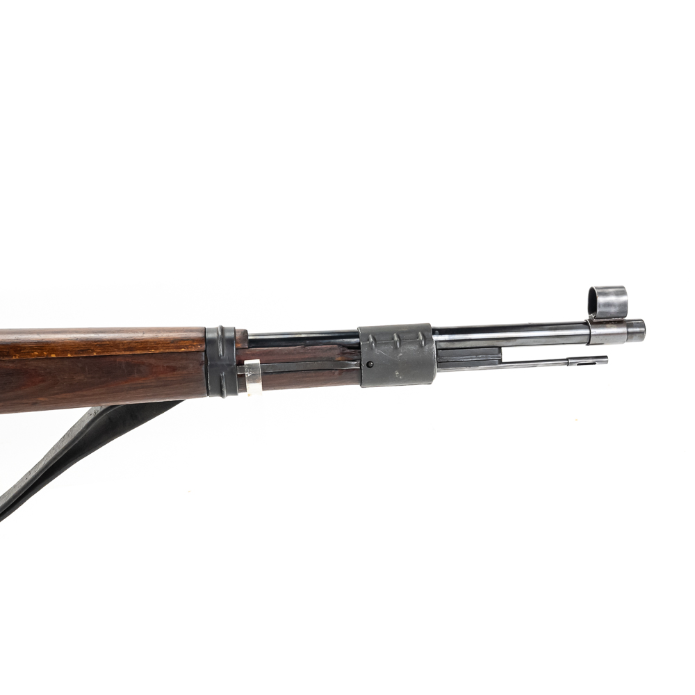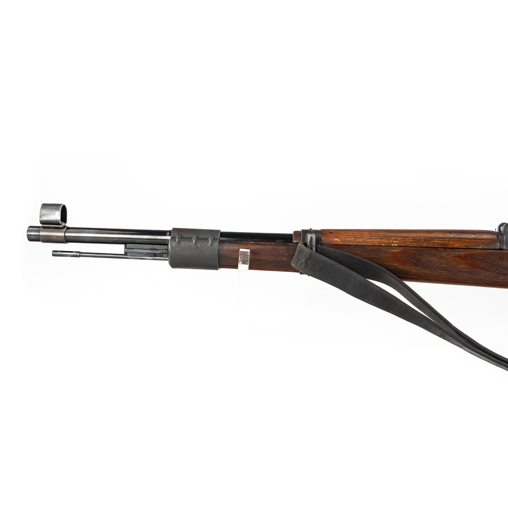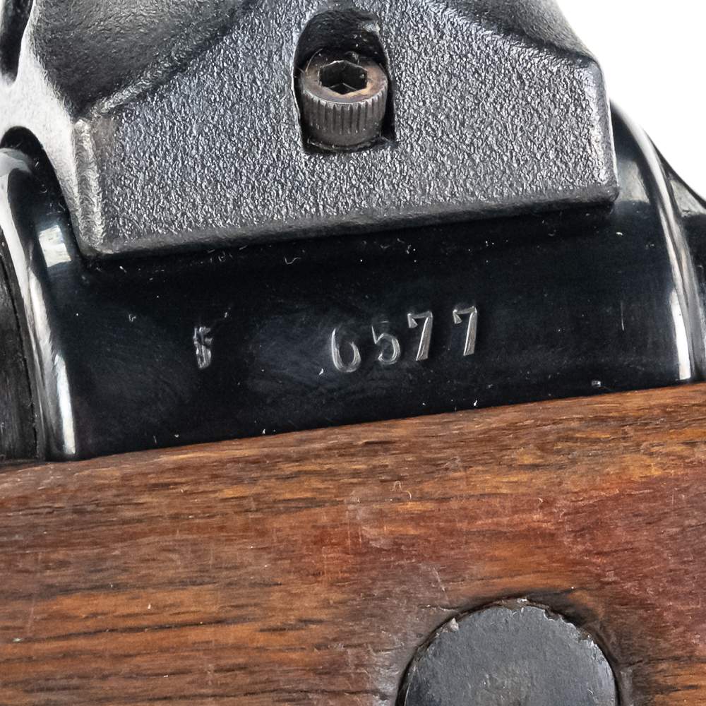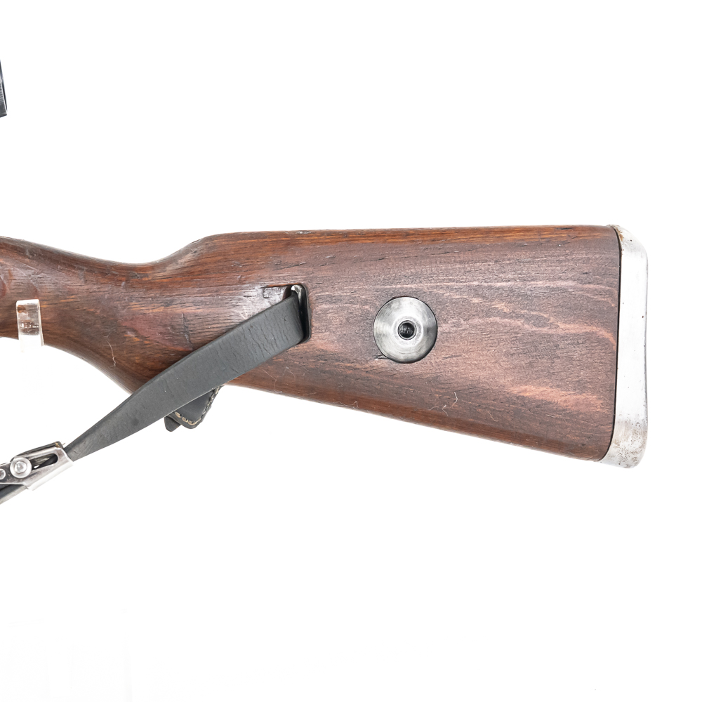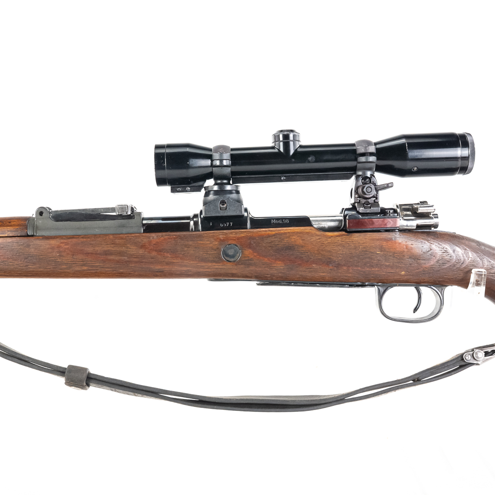 This is a World War II German Mauser K98 converted into a sniper rifle. Chambered in 8mm, this rifle displays serial number “6577” on the left side of the receiver ring and “dot 1944” on the top of the ring (covered by the scope mount). German proof markings are visible on the barrel, receiver, bolt and trigger guard assembly. The rifle is equipped with a post-war Hensoldt Wetzlar Diatal 4×32 scope, a similar design to the post-reticle World War II style. The optics are clear. The scope mounts are reproduction, however, they are the correct World War II style “see through” mounts. The rifle has been reblued and the original sling is supple and in good condition for its age. The bore and rifling are in good shape. The wood stock is in good condition, showing normal wear from use and storage. Action and trigger are smooth and tight. This is a very good quality conversion, excellent for a German reenactor. Please see photos for overall condition. Overall Length: 43.75
