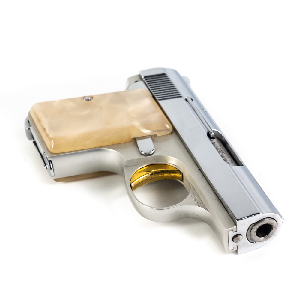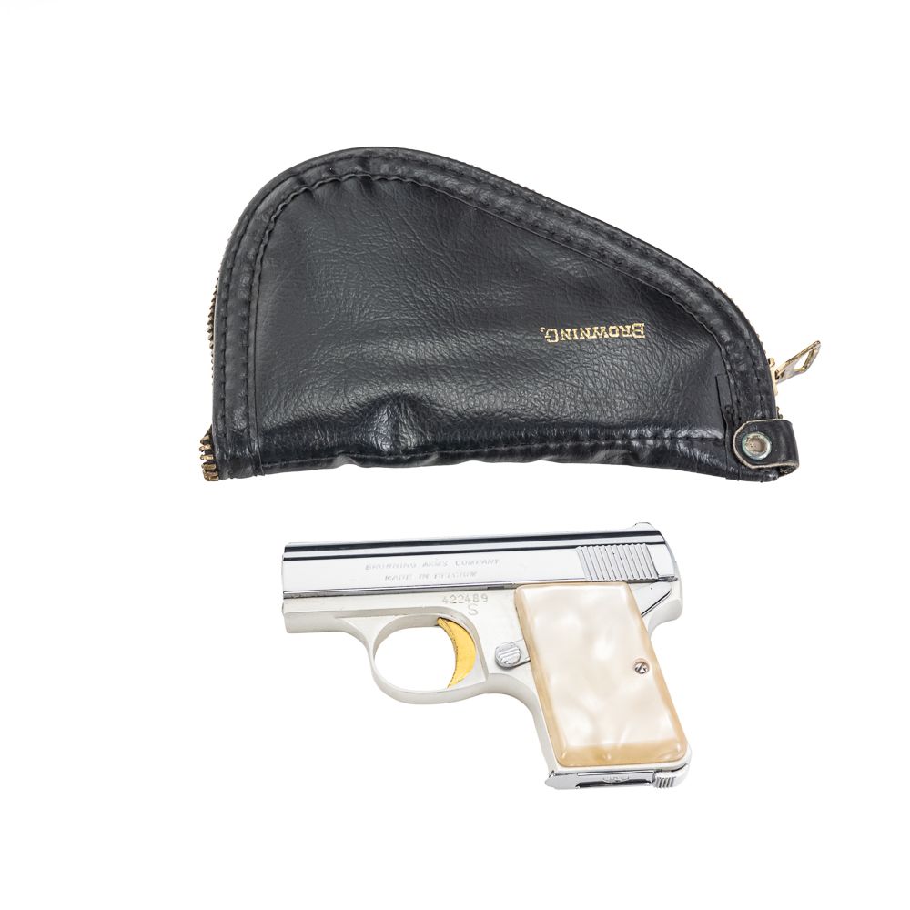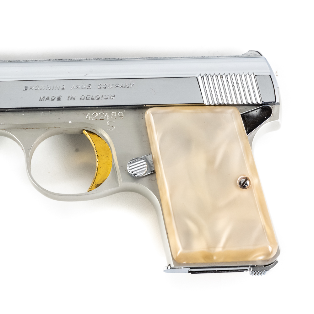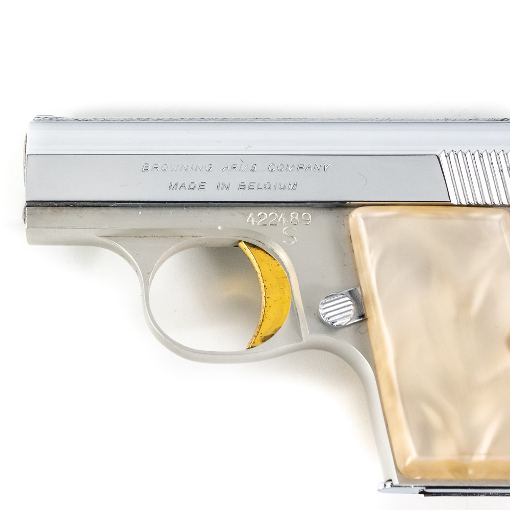 Belgian Browning Baby Automatic Pistol. Caliber .25ACP. Excellent vintage production pocket pistol with aluminum frame and chrome plated stainless steel slide. Factory Pearlite grips and finish are in like-new condition with minor scratches from handling. Nice flashy collector pocket pistol from the 1970s. See photos.