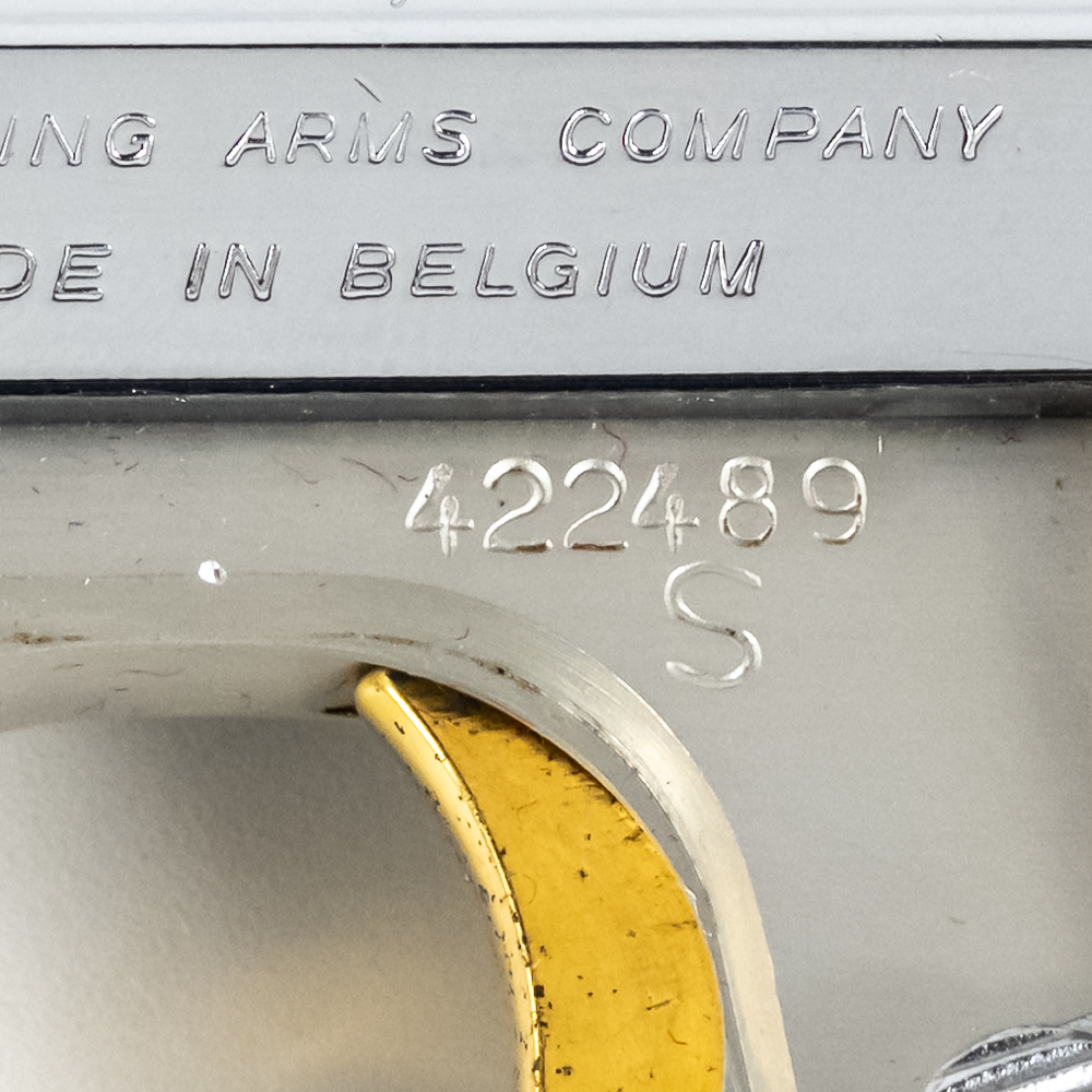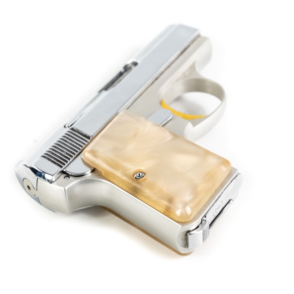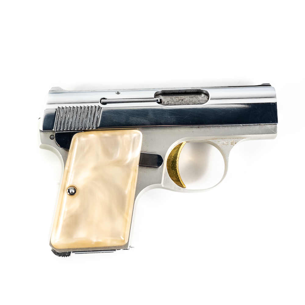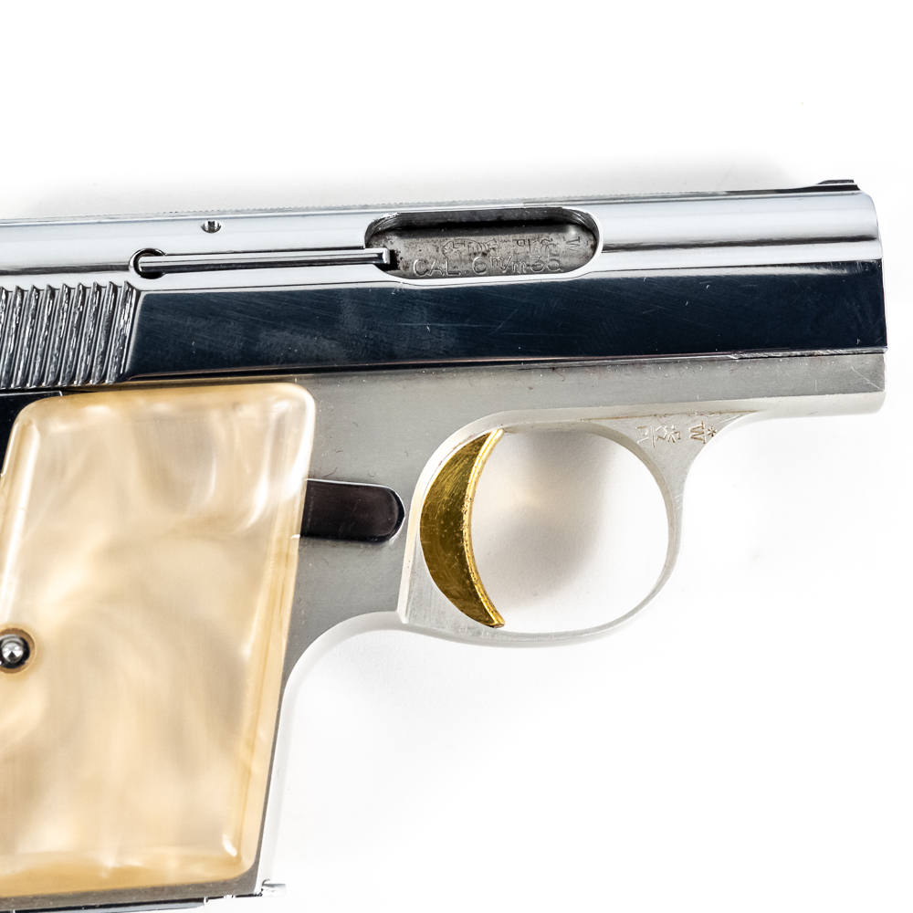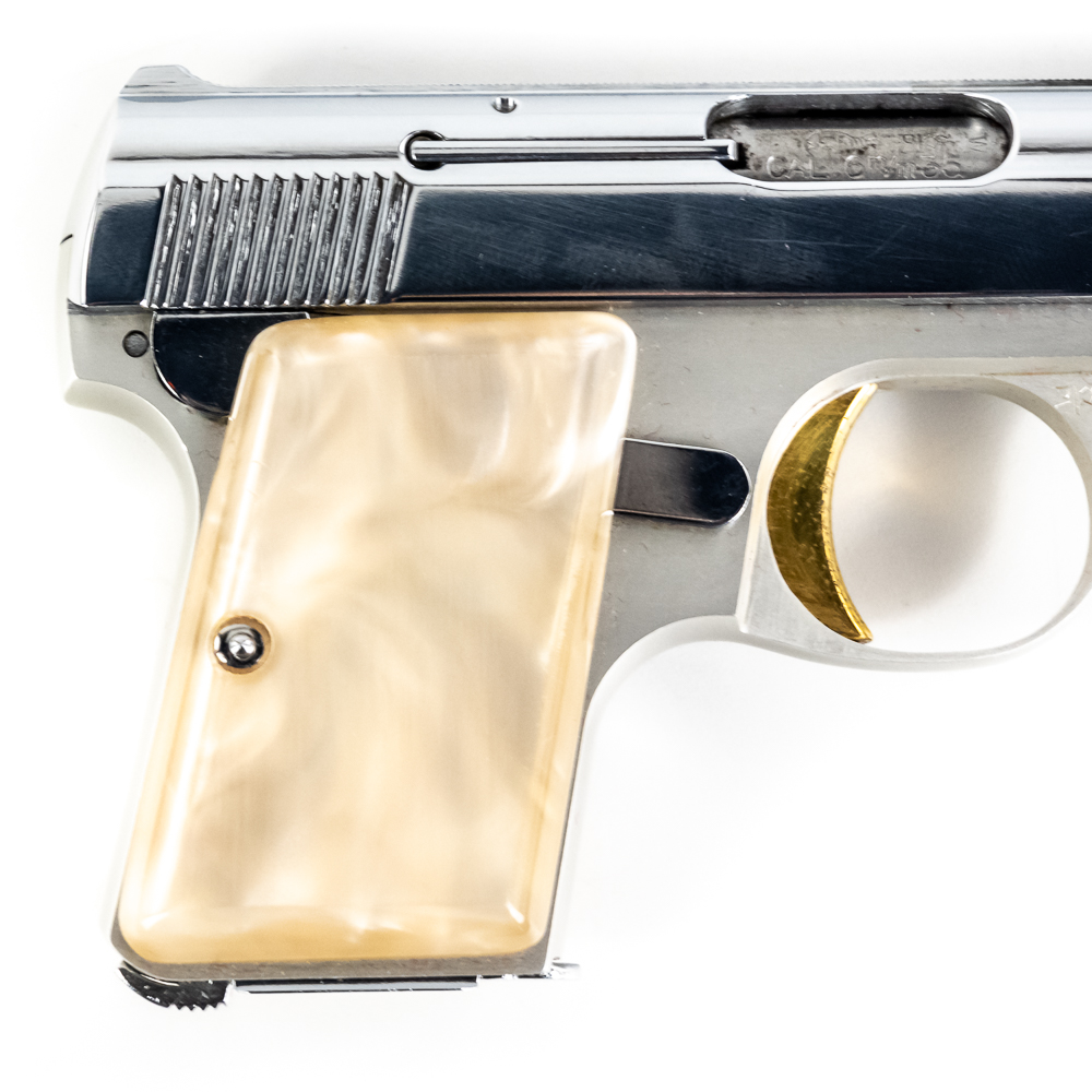 Belgian Browning Baby Automatic Pistol. Caliber .25ACP. Excellent vintage production pocket pistol with aluminum frame and chrome plated stainless steel slide. Factory Pearlite grips and finish are in like-new condition with minor scratches from handling. Nice flashy collector pocket pistol from the 1970s. See photos.