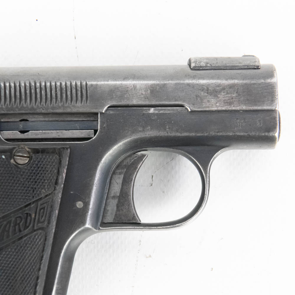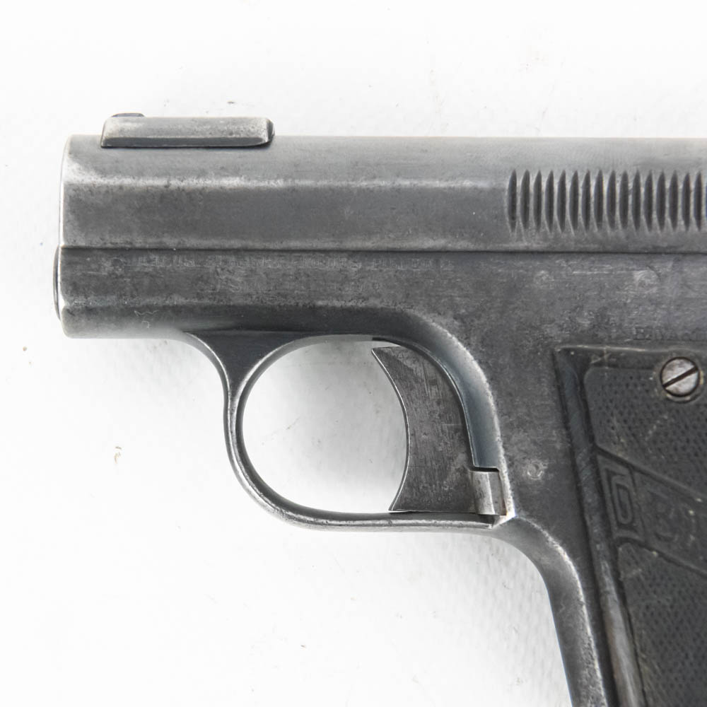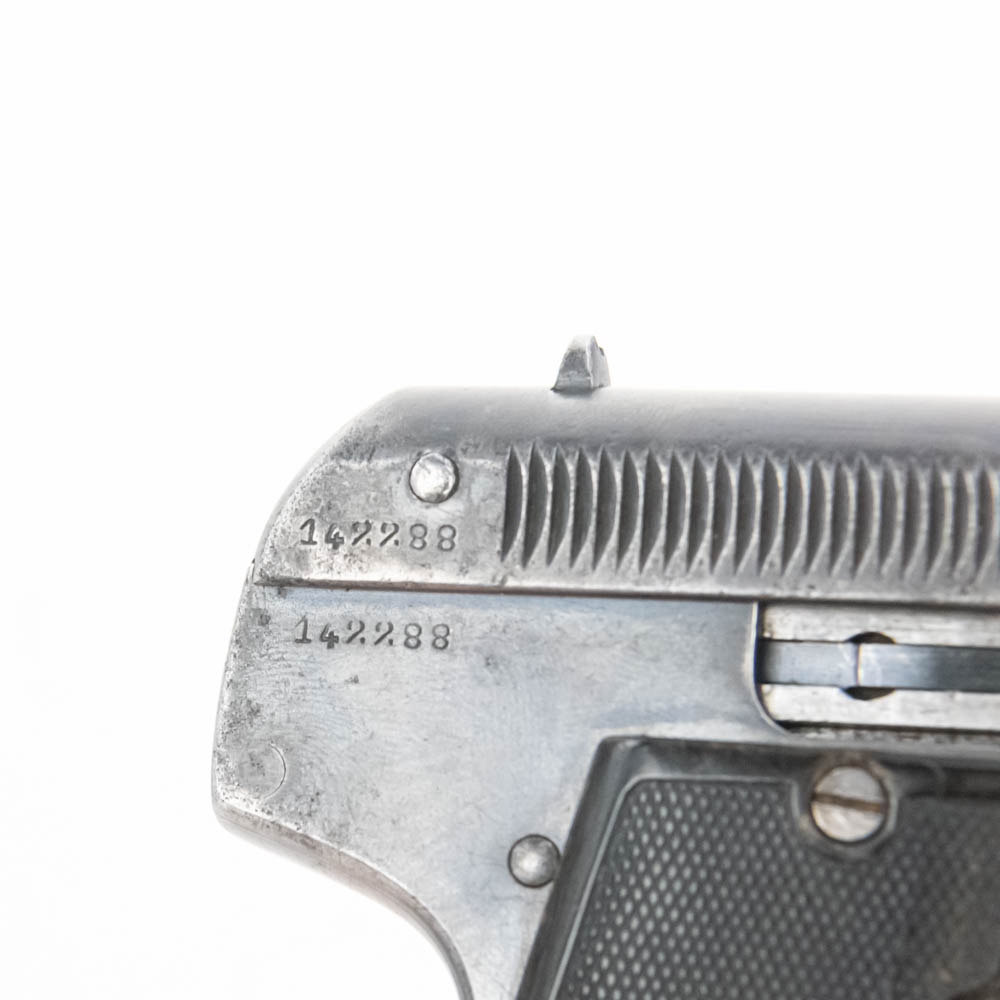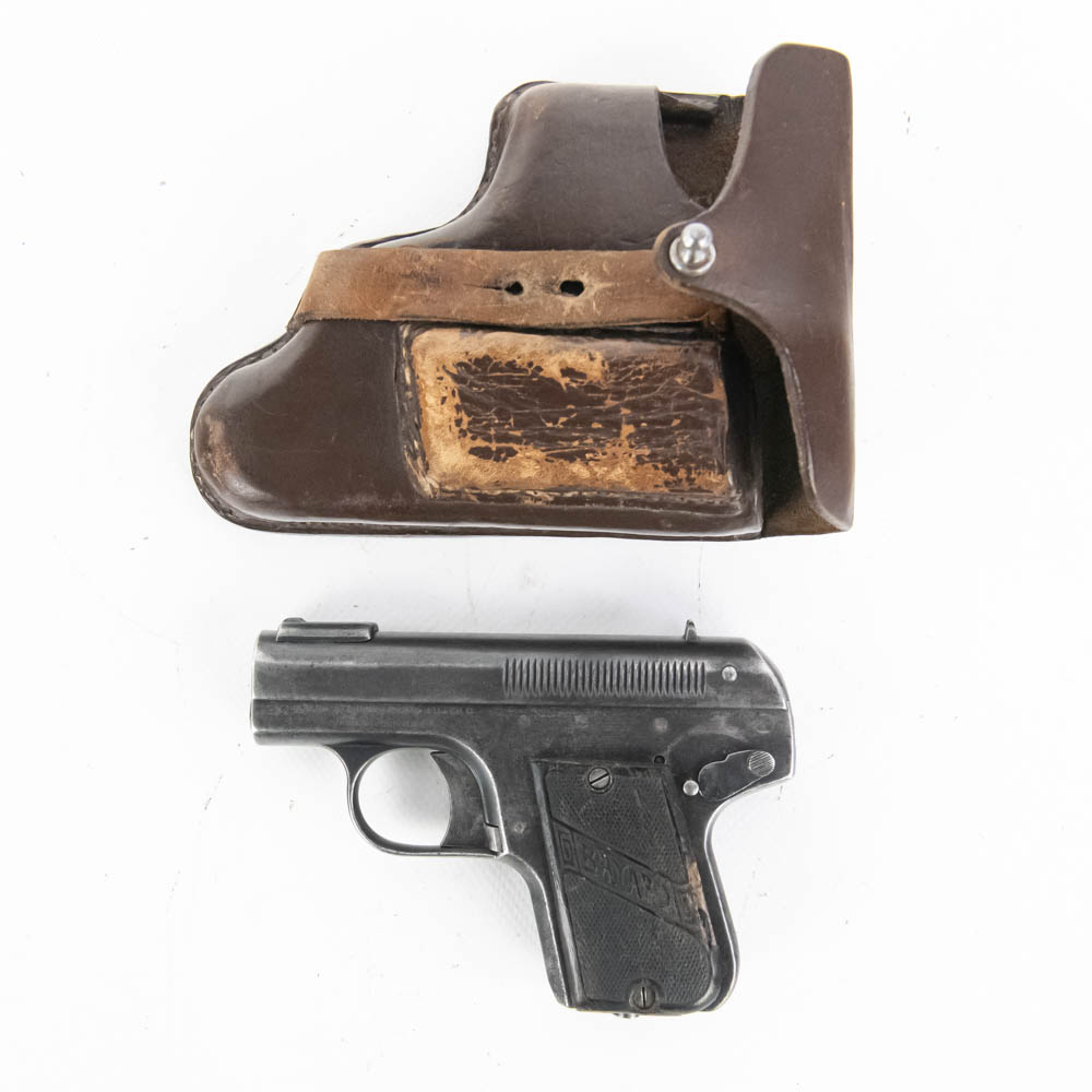 Bayard Pieper model 1908 pocket pistol. Caliber 7.65/32ACP. Interesting spring over barrel design similar to Browning 1900. Pistol is in good condition for age, but bears a lot of finish wear from being carried and used. Pistol features Imperial German proof marks and comes with leather German military holster in fair to rough shape. These guns were issued to soldiers in both World Wars, so this is likely a Bringback that the vet kept using. See photos. S/N 142288