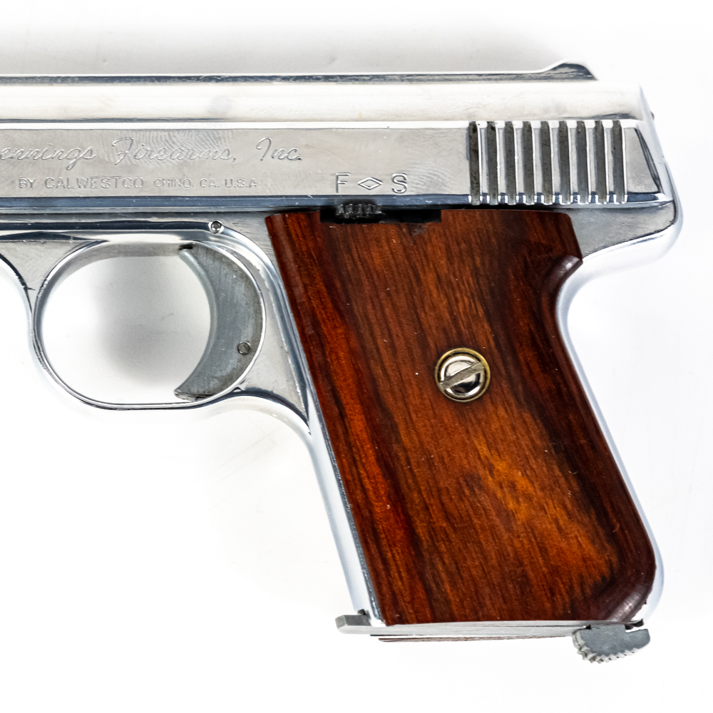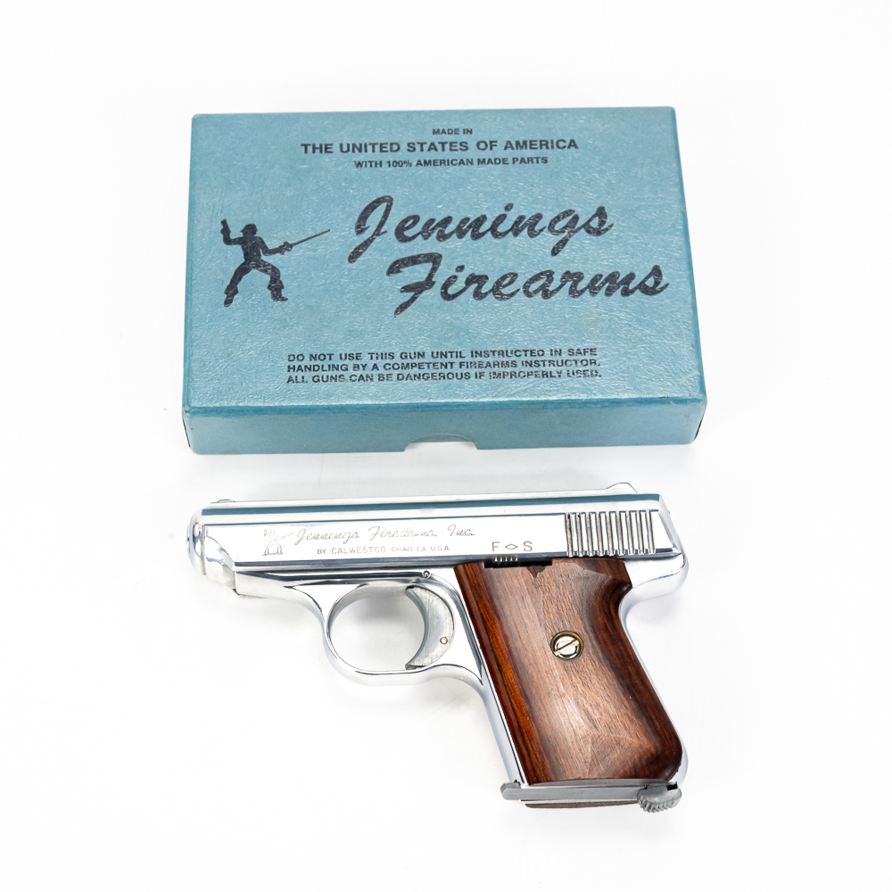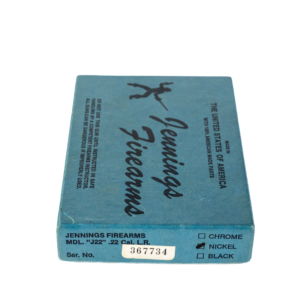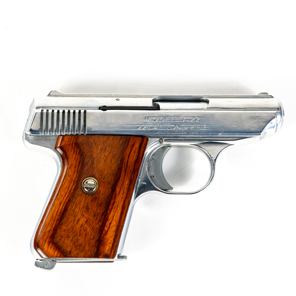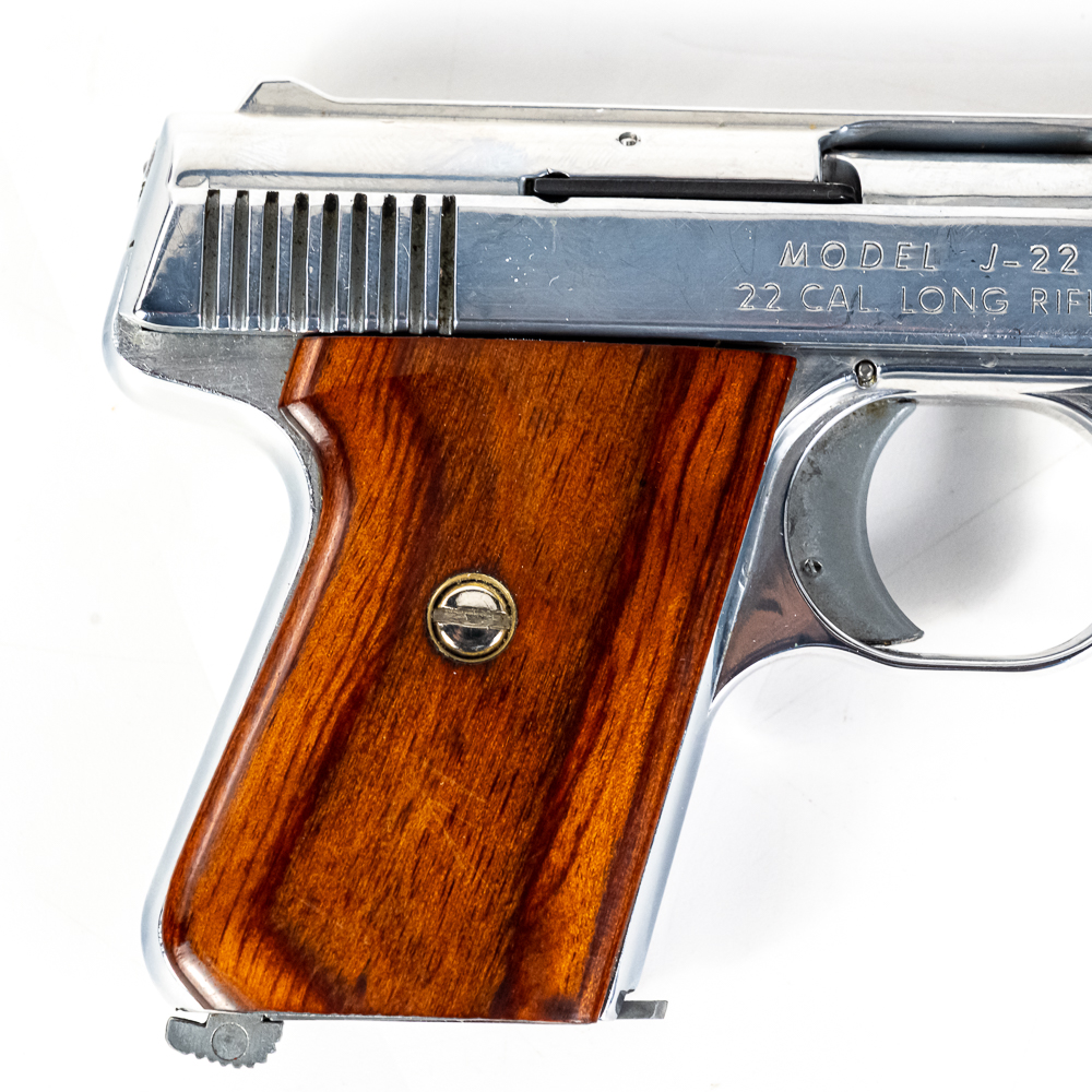Jennings J-22 Pistol. Caliber .22LR. Nice older production Chrome plated pocket pistol. Pistol appears to be unfired and comes in original box with papers. Good display item or range toy. See photos.